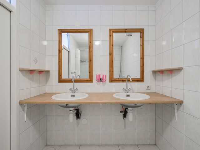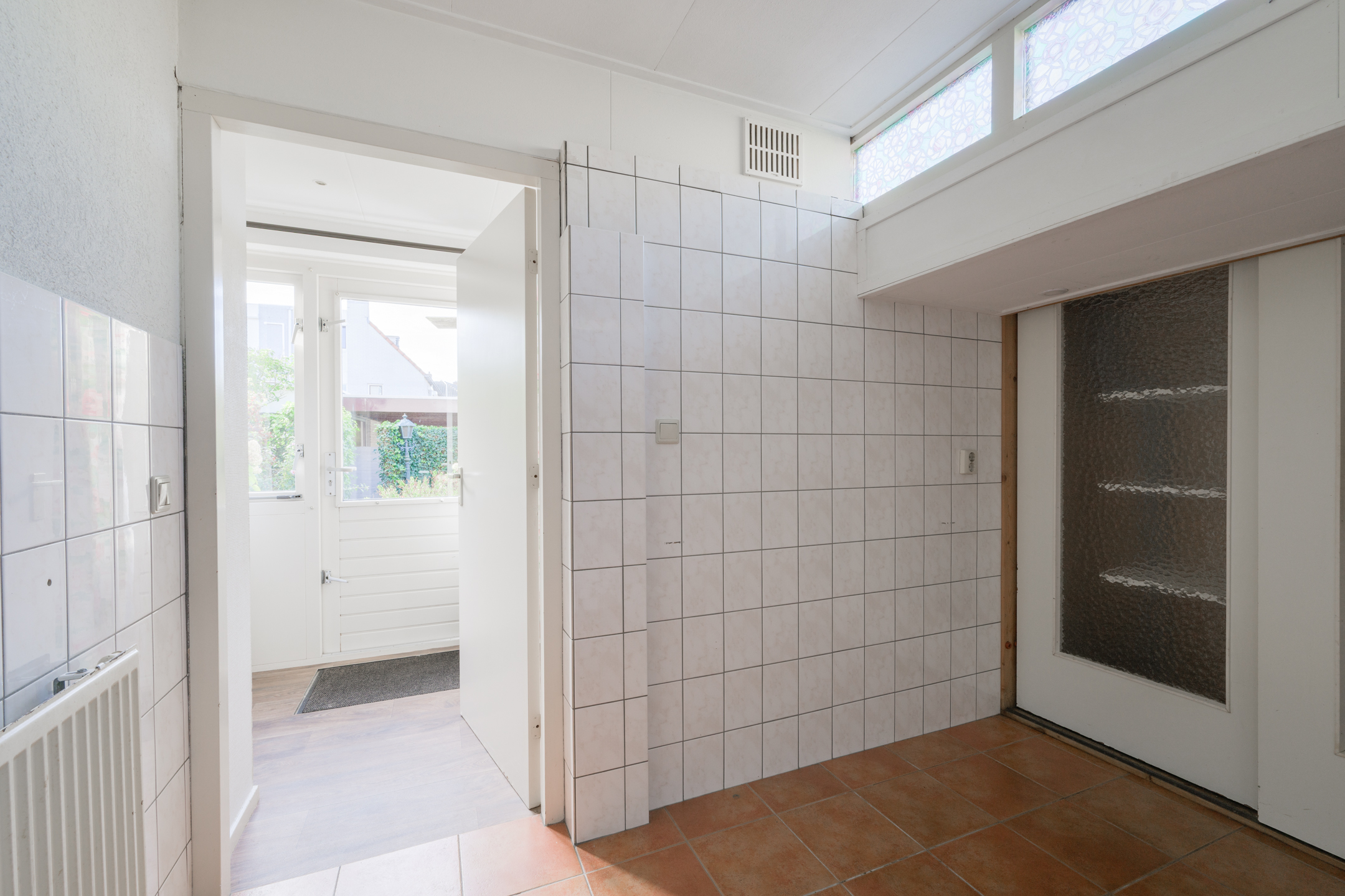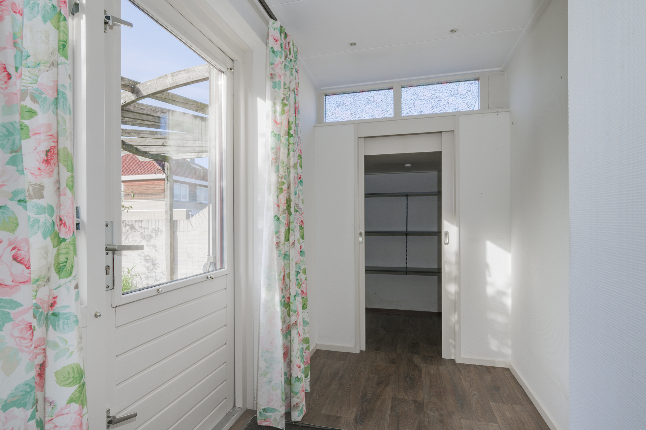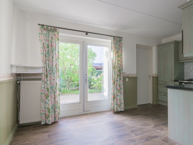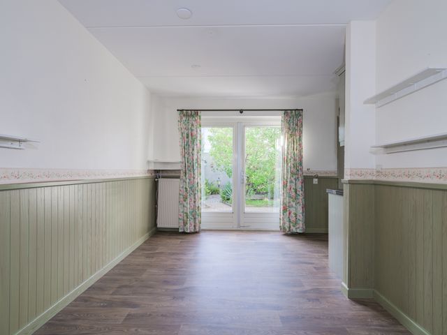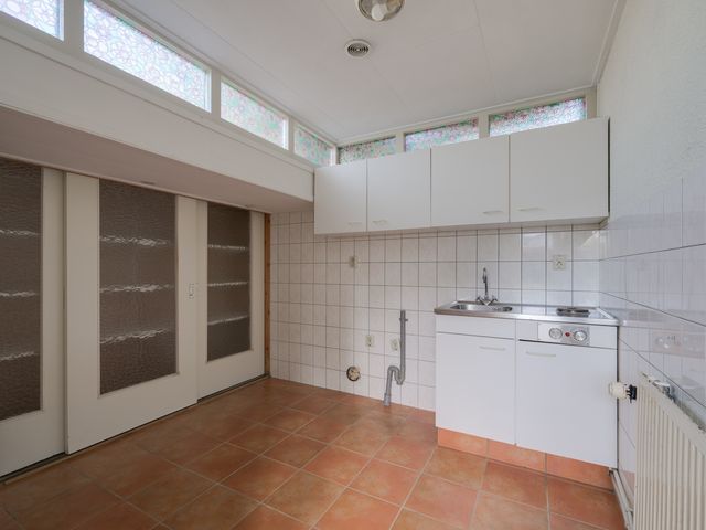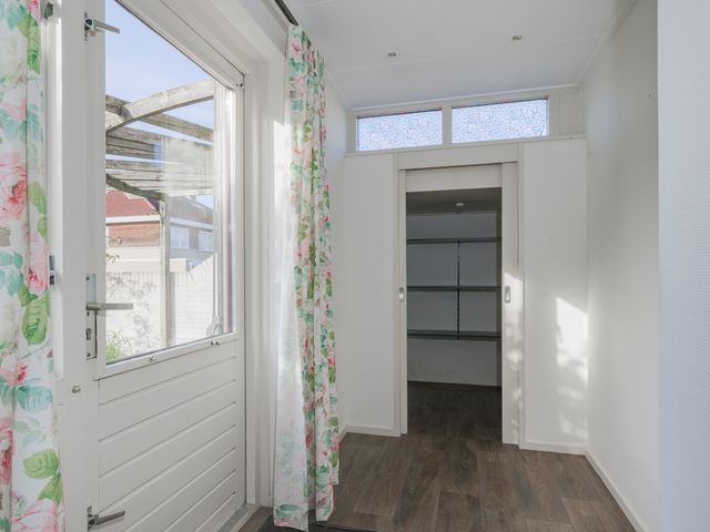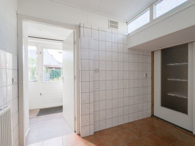 De keuken biedt toegang tot de aanbouw aan de zij-/achterkant van de woning. In dit gedeelte bevinden zich een hal/achteringang en bijkeuken. Beide ruimtes beschikken over vaste kastruimte en in de bijkeuken staat een klein keukenblok met bovenkasten opgesteld en is er eveneens aansluiting voor een wasmachine en -droger.