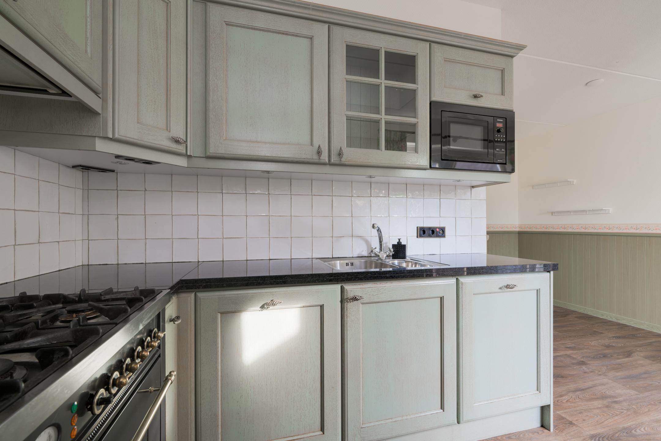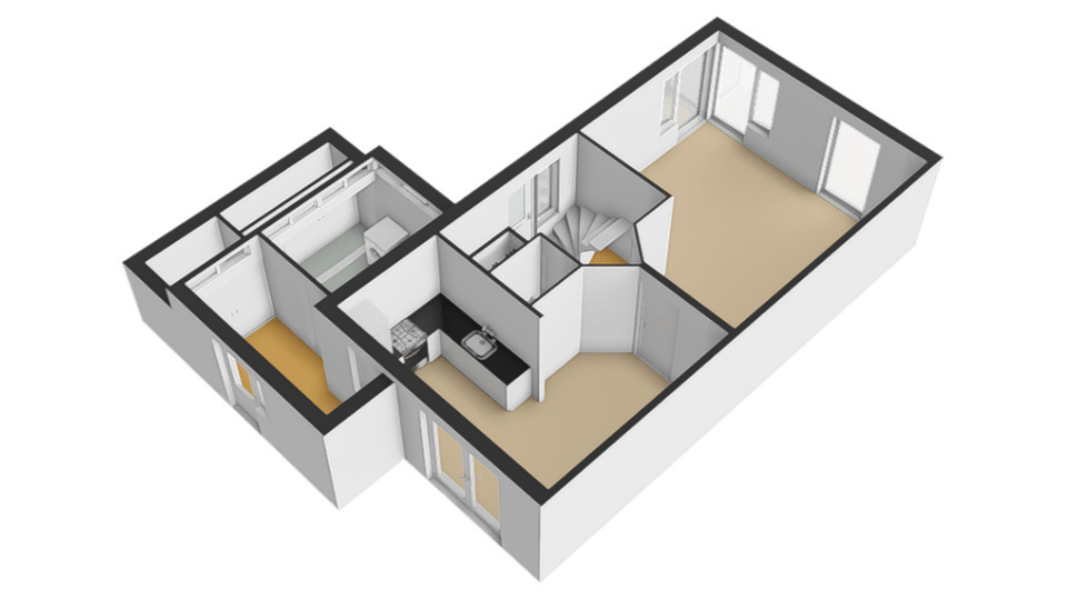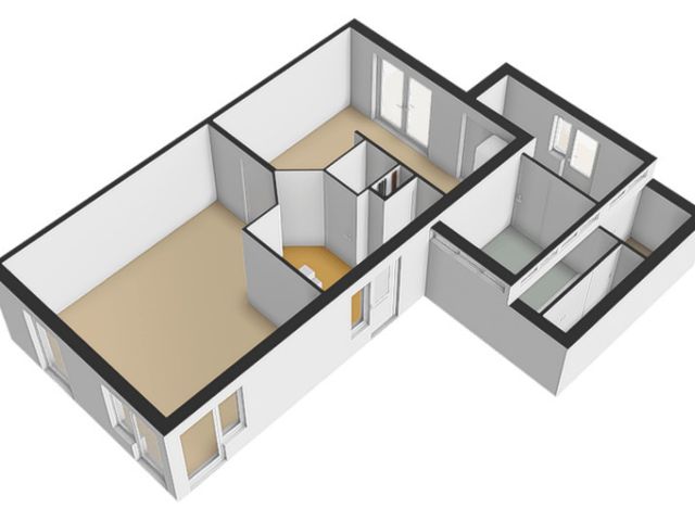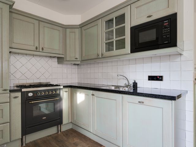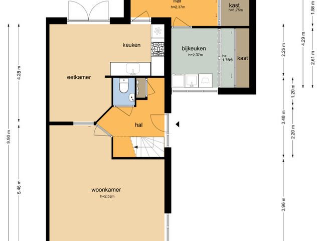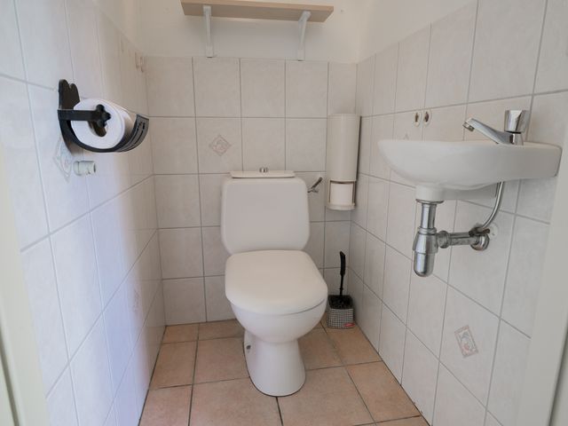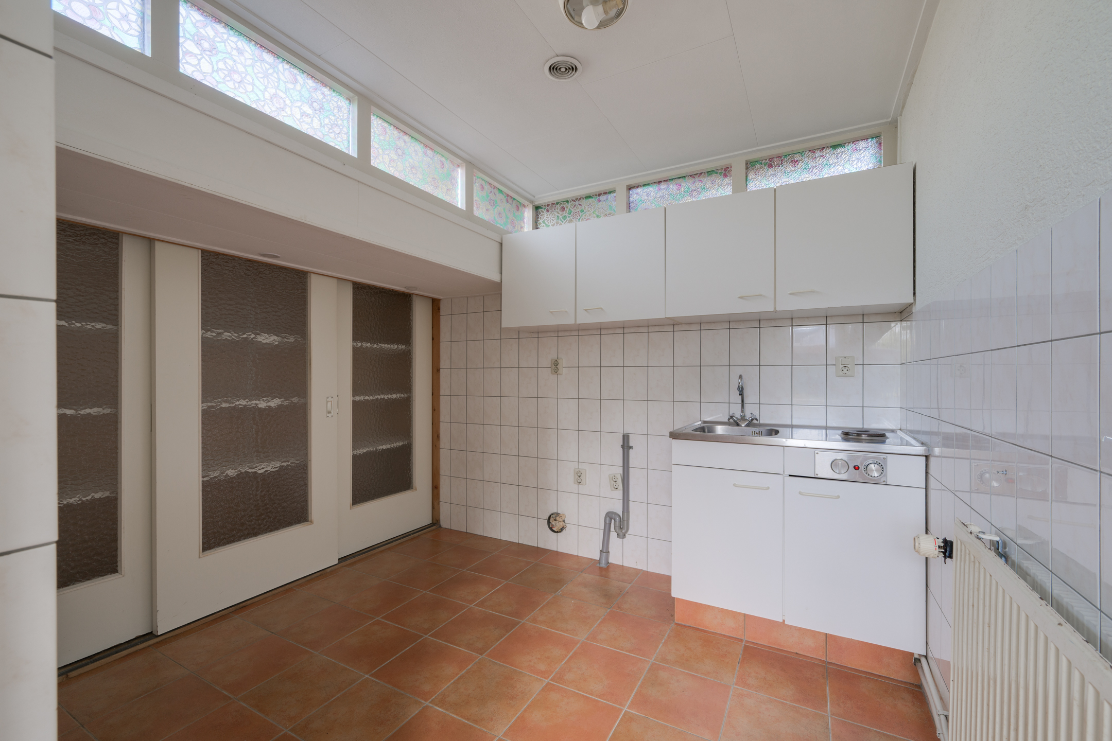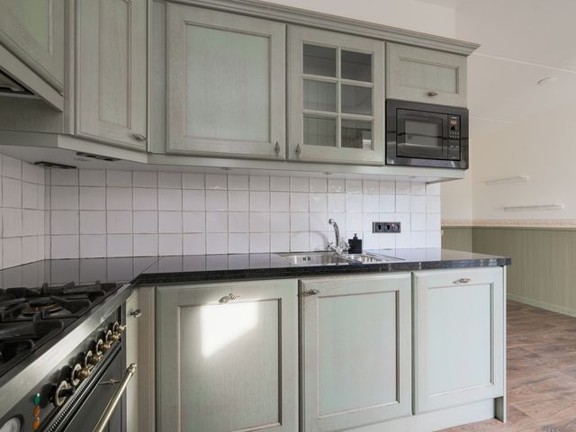 De keuken biedt toegang tot de aanbouw aan de zij-/achterkant van de woning. In dit gedeelte bevinden zich een hal/achteringang en bijkeuken. Beide ruimtes beschikken over vaste kastruimte en in de bijkeuken staat een klein keukenblok met bovenkasten opgesteld en is er eveneens aansluiting voor een wasmachine en -droger.