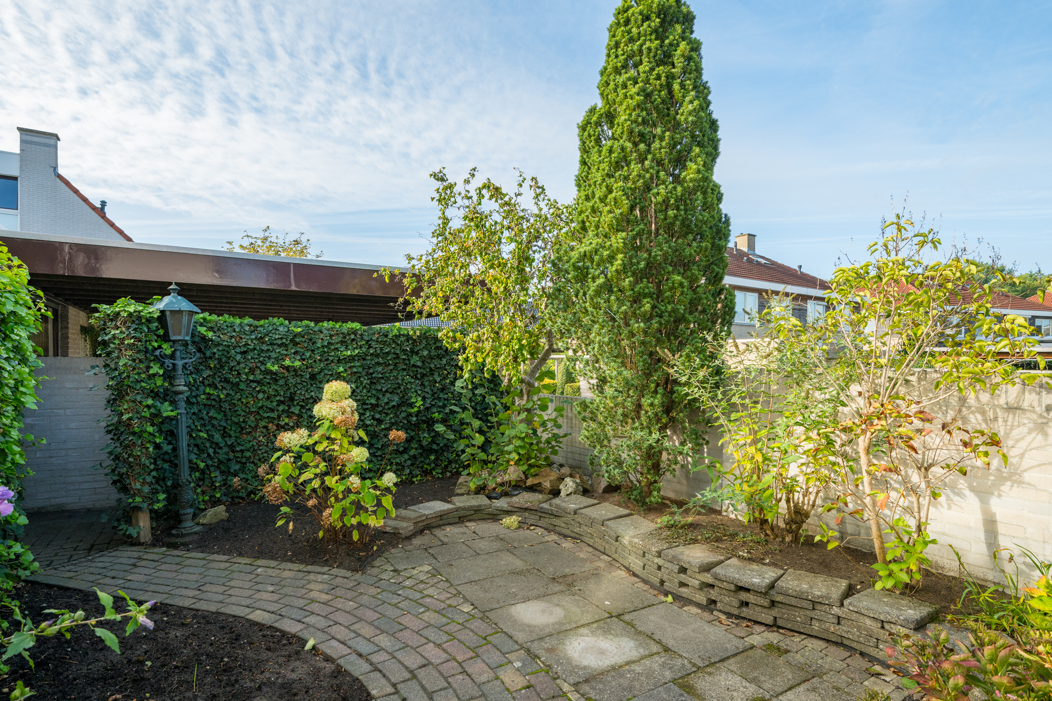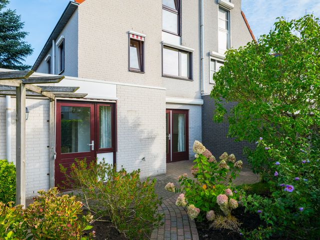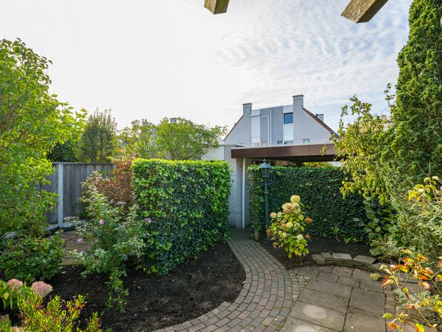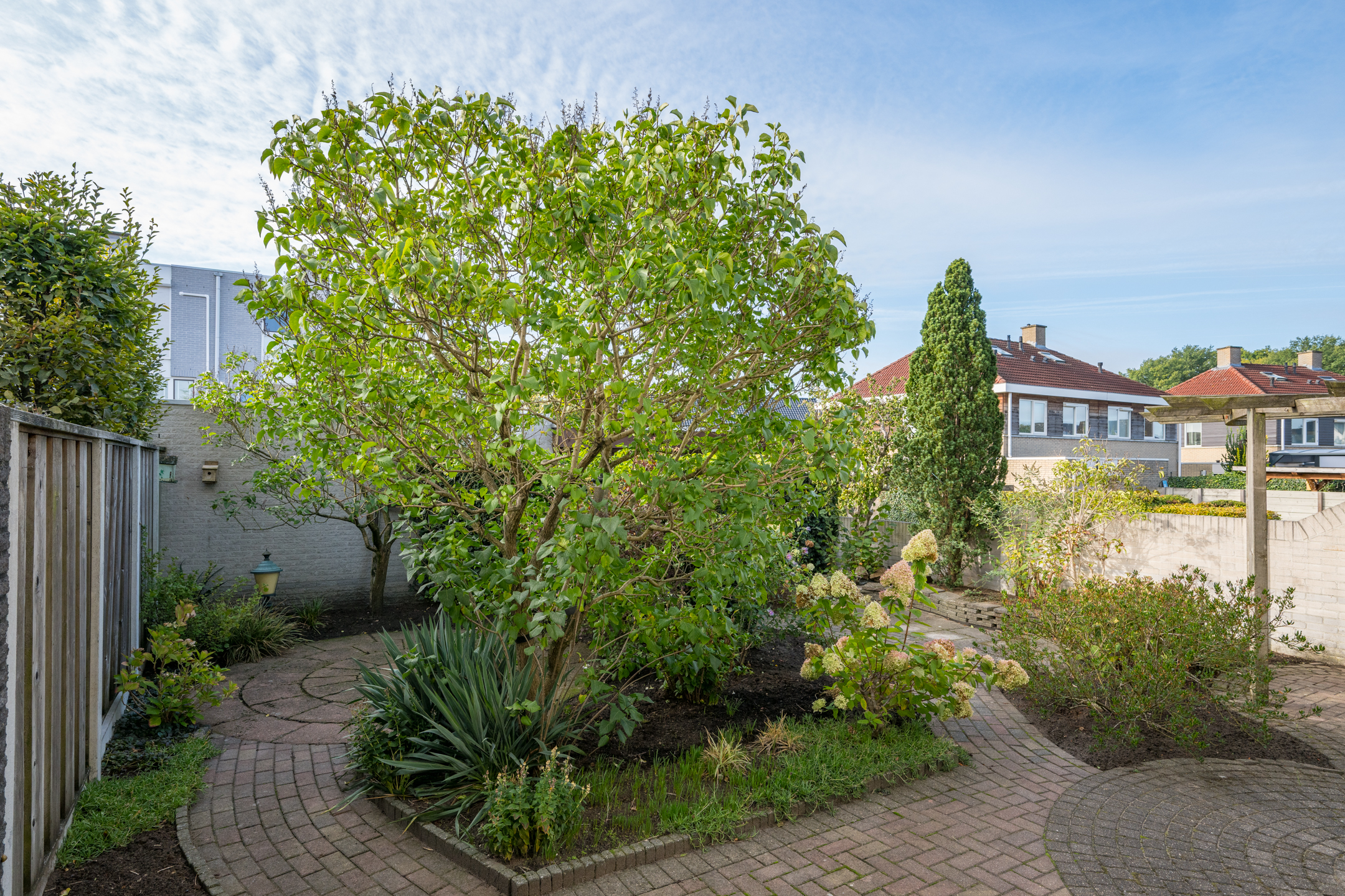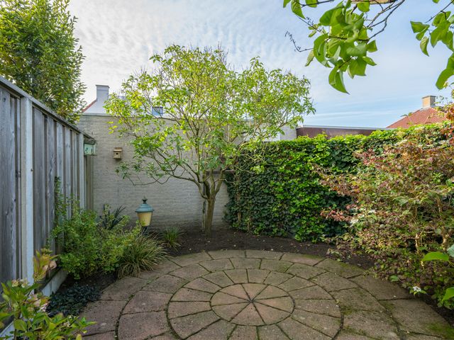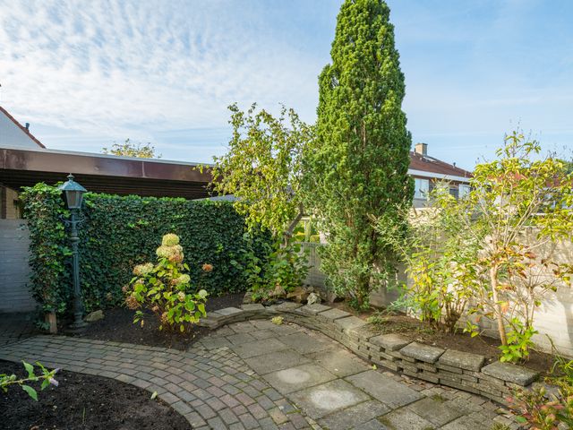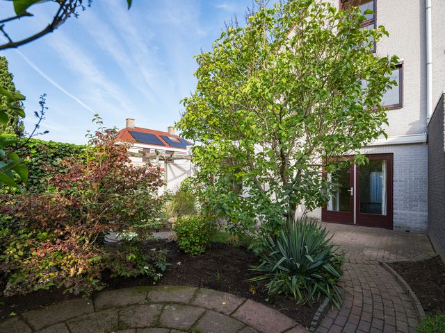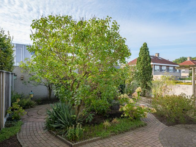 Zowel vanuit het poortje in de tuinmuur als vanuit de garage is de achtertuin bereikbaar; deze is gelegen op het zonnige zuiden en netjes aangelegd met sierbestrating, borders en een pergola.