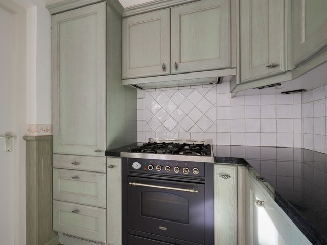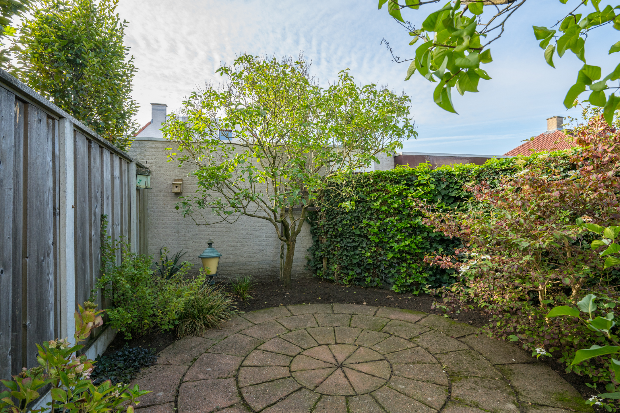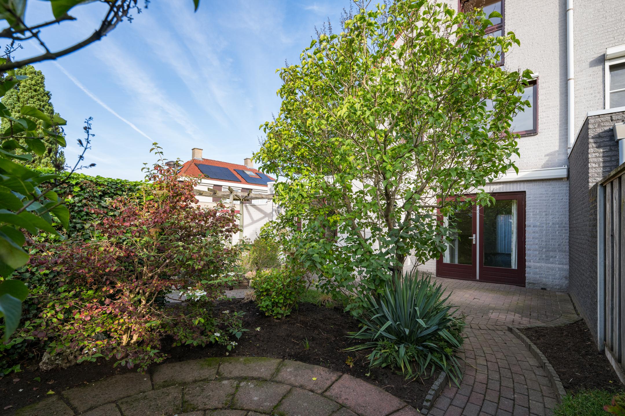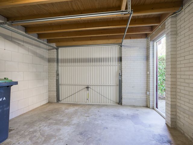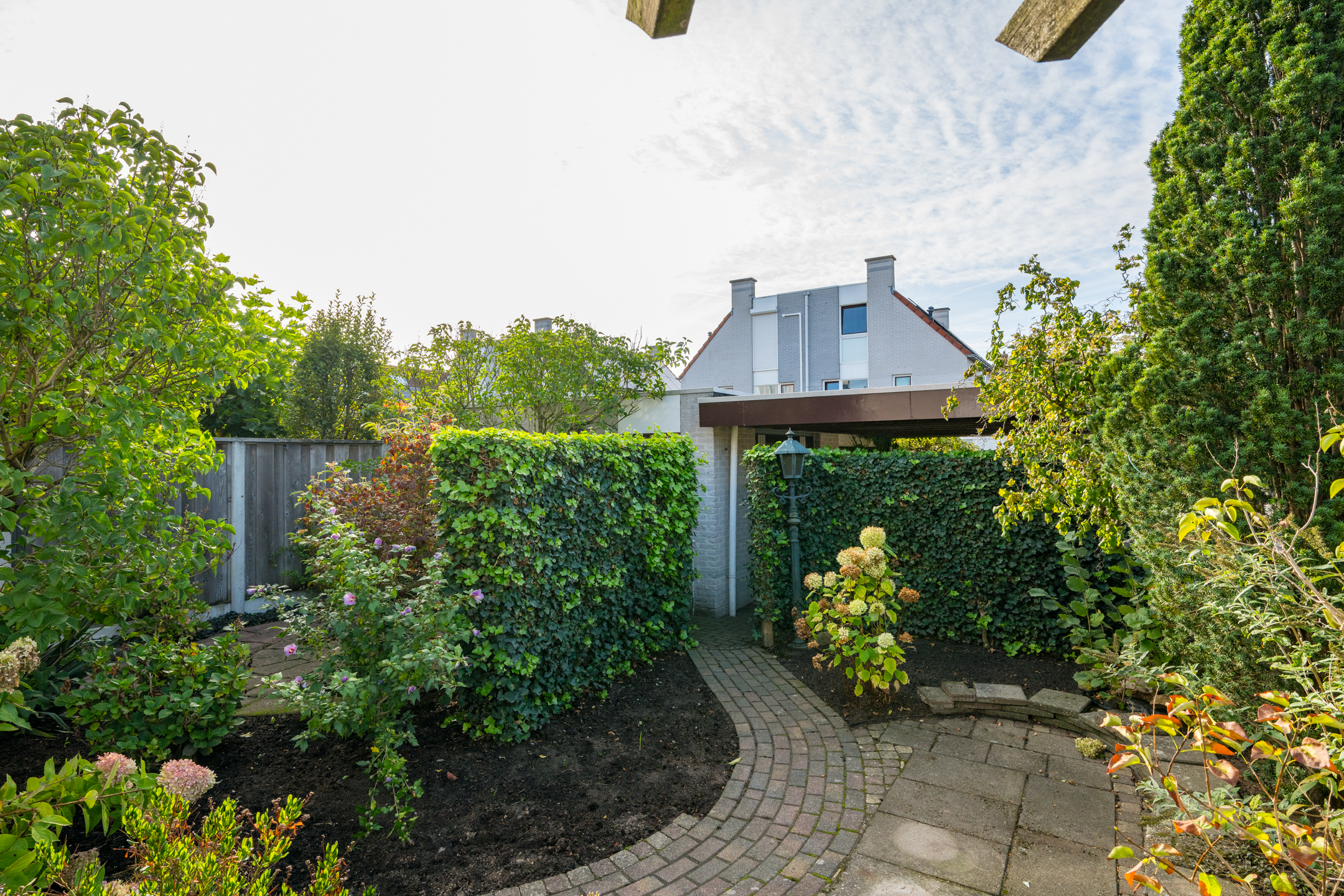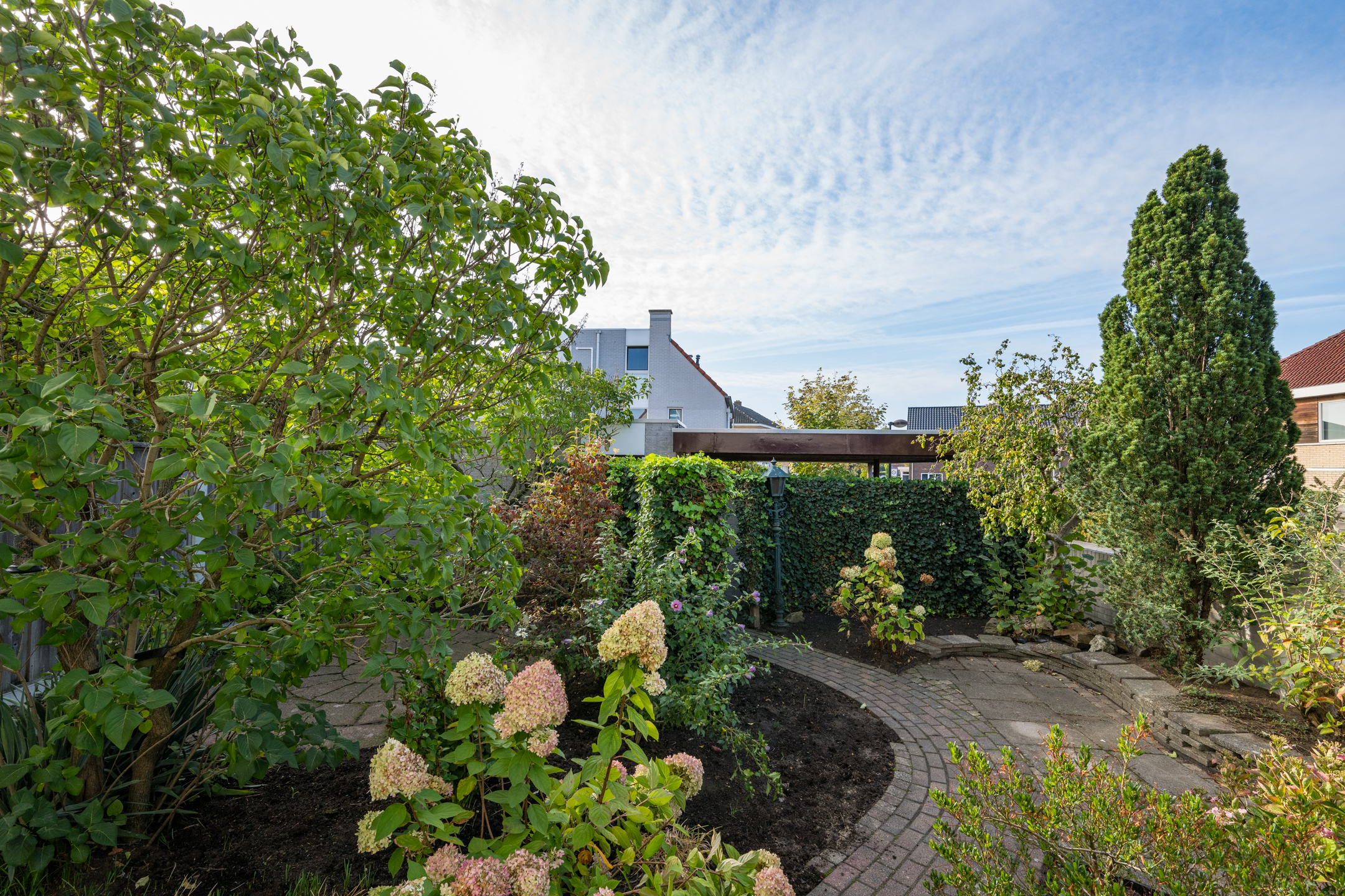 Zowel vanuit het poortje in de tuinmuur als vanuit de garage is de achtertuin bereikbaar; deze is gelegen op het zonnige zuiden en netjes aangelegd met sierbestrating, borders en een pergola.