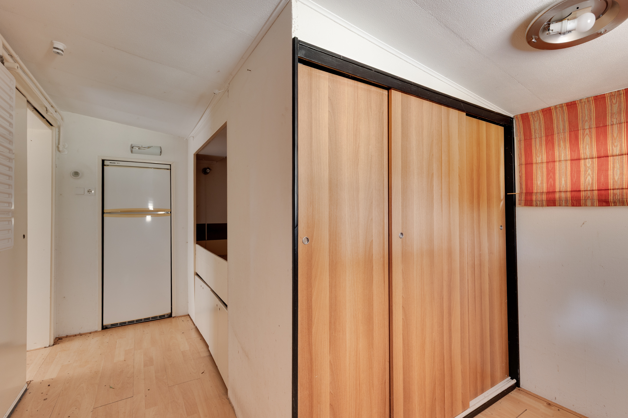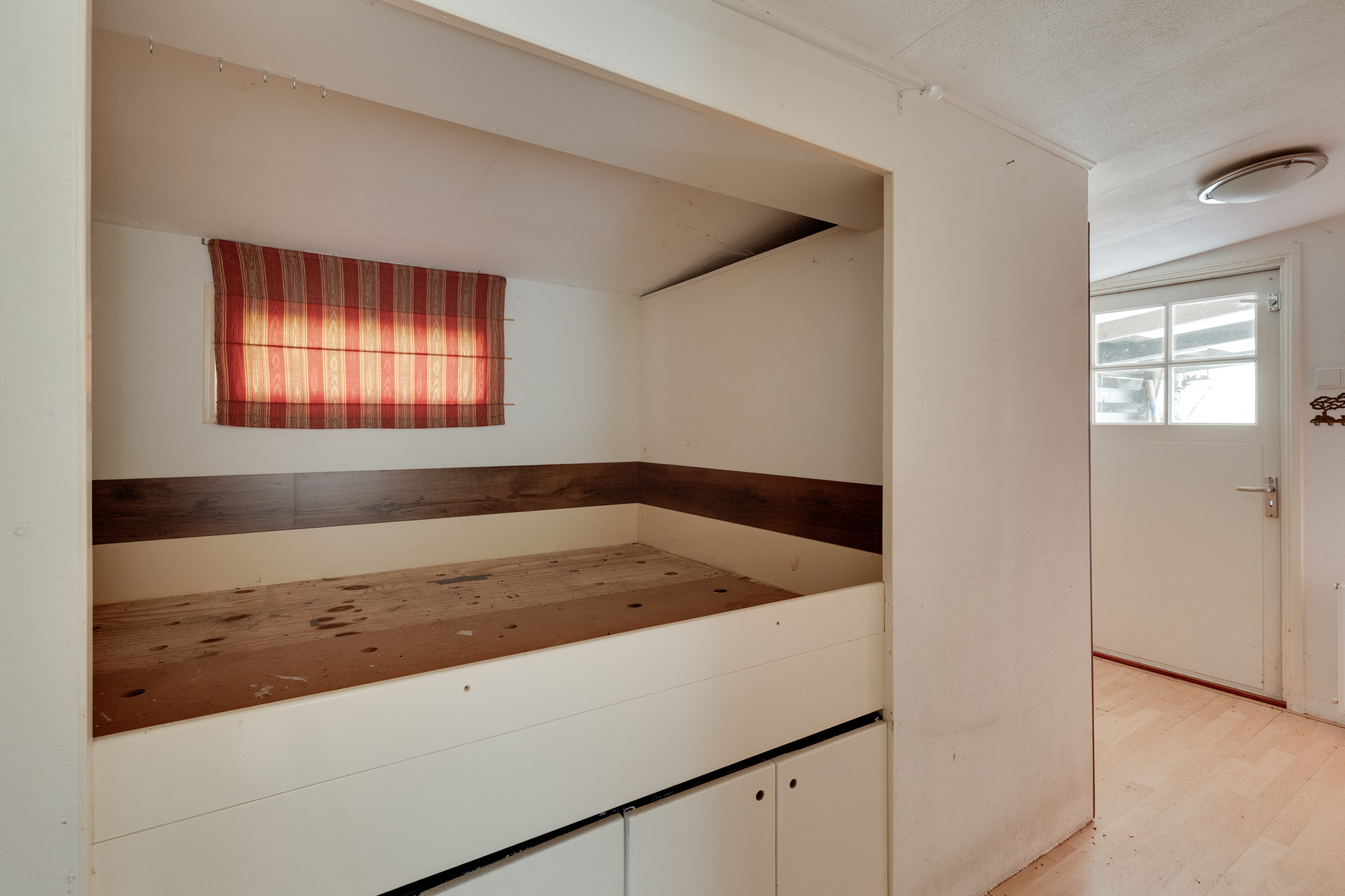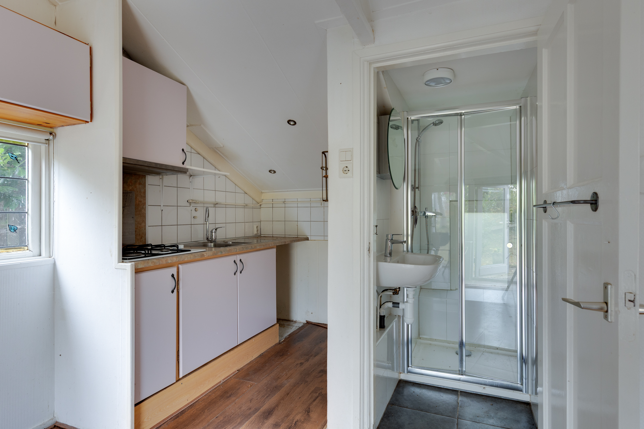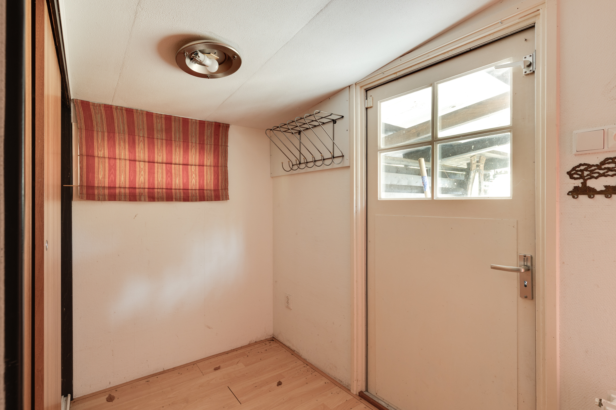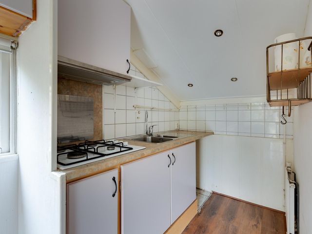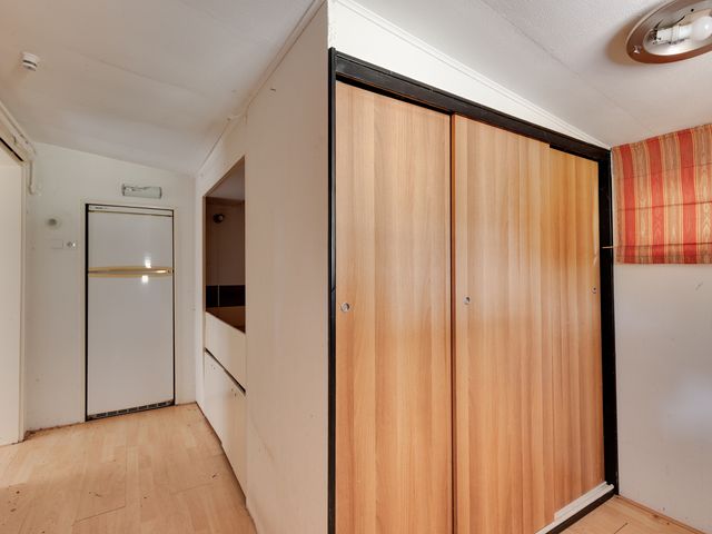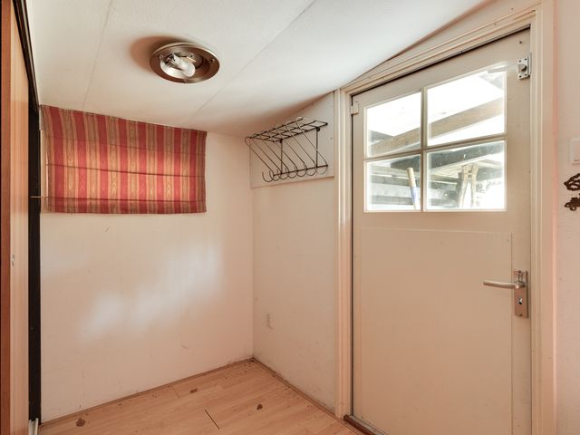 Entree aan de tuinzijde via de aangebouwde overkapping; dit zijportaal is voorzien van een vaste kastenwand en vervolgens treft u aan de rechterzijde een bedstee. Aan de linkerzijde is er toegang tot een portaaltje met een grote schuifkast. In dit portaaltje bevindt zich ook de toiletruimte en is er een doorgang naar de woonkamer met aansluitend open keuken. In de keuken staat een eenvoudig keukenblok opgesteld. De badkamer met douchecabine en wastafel is gelegen naast de keuken en via de woonkamer toegankelijk.