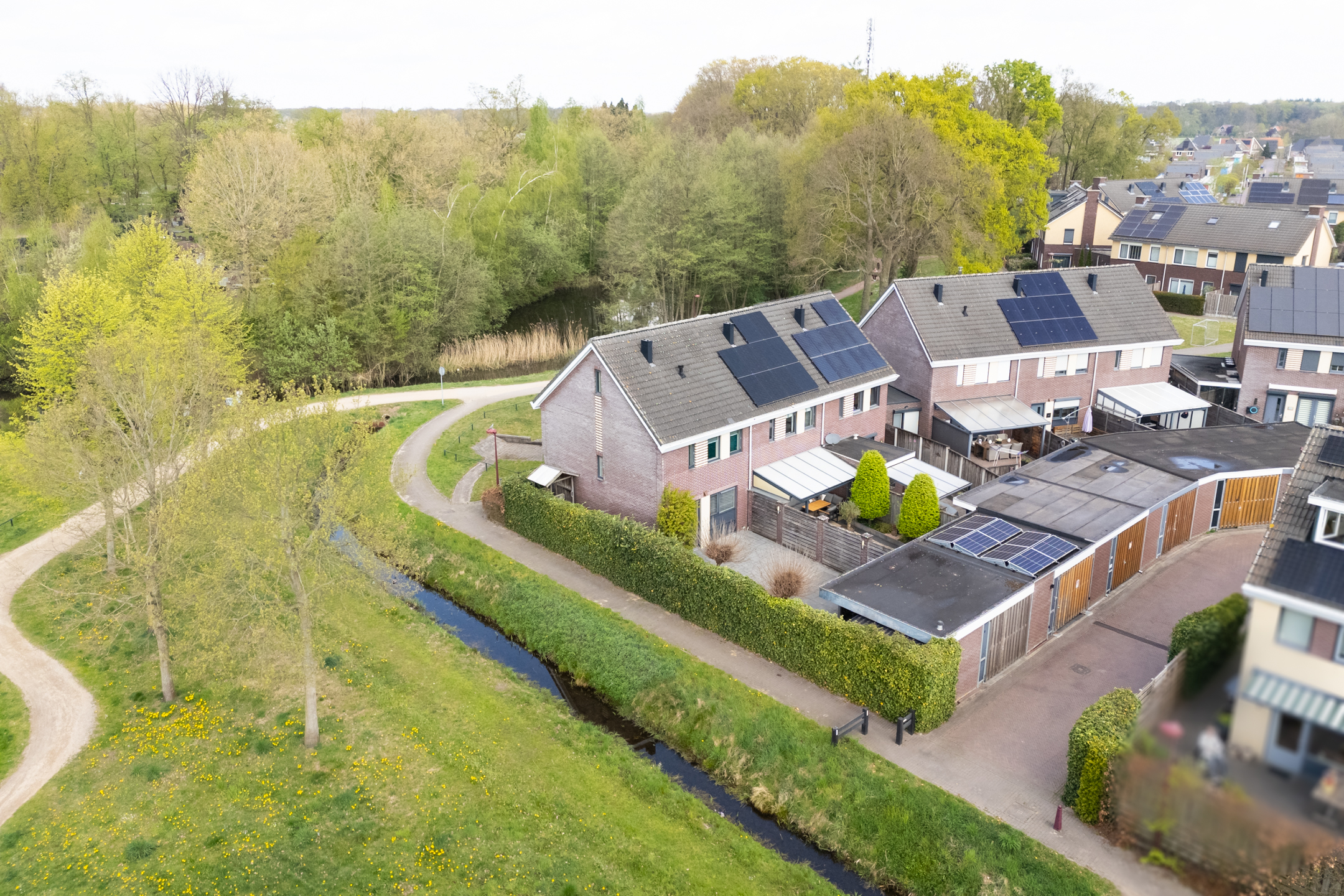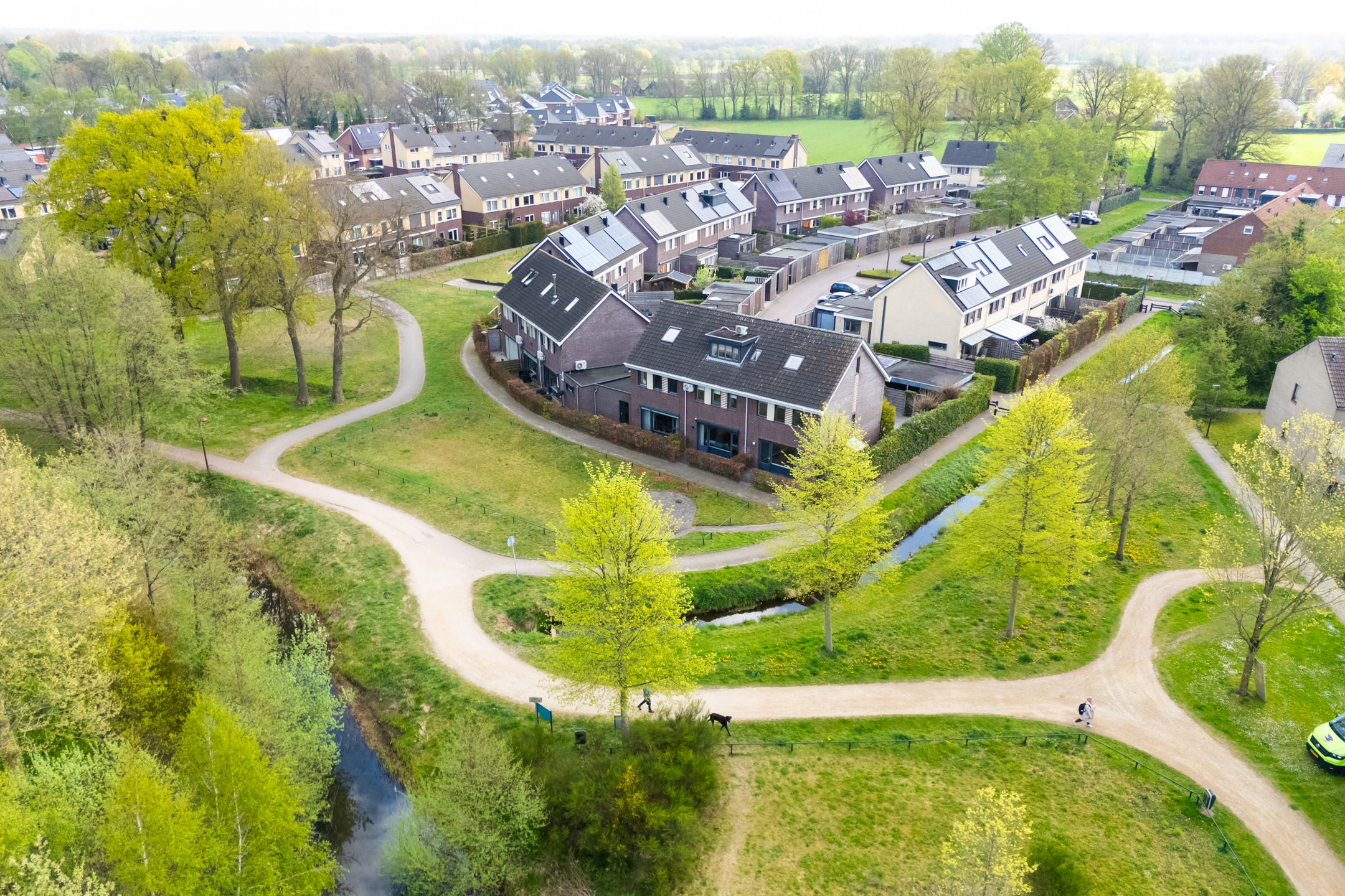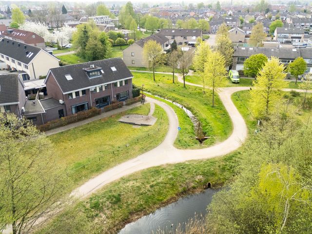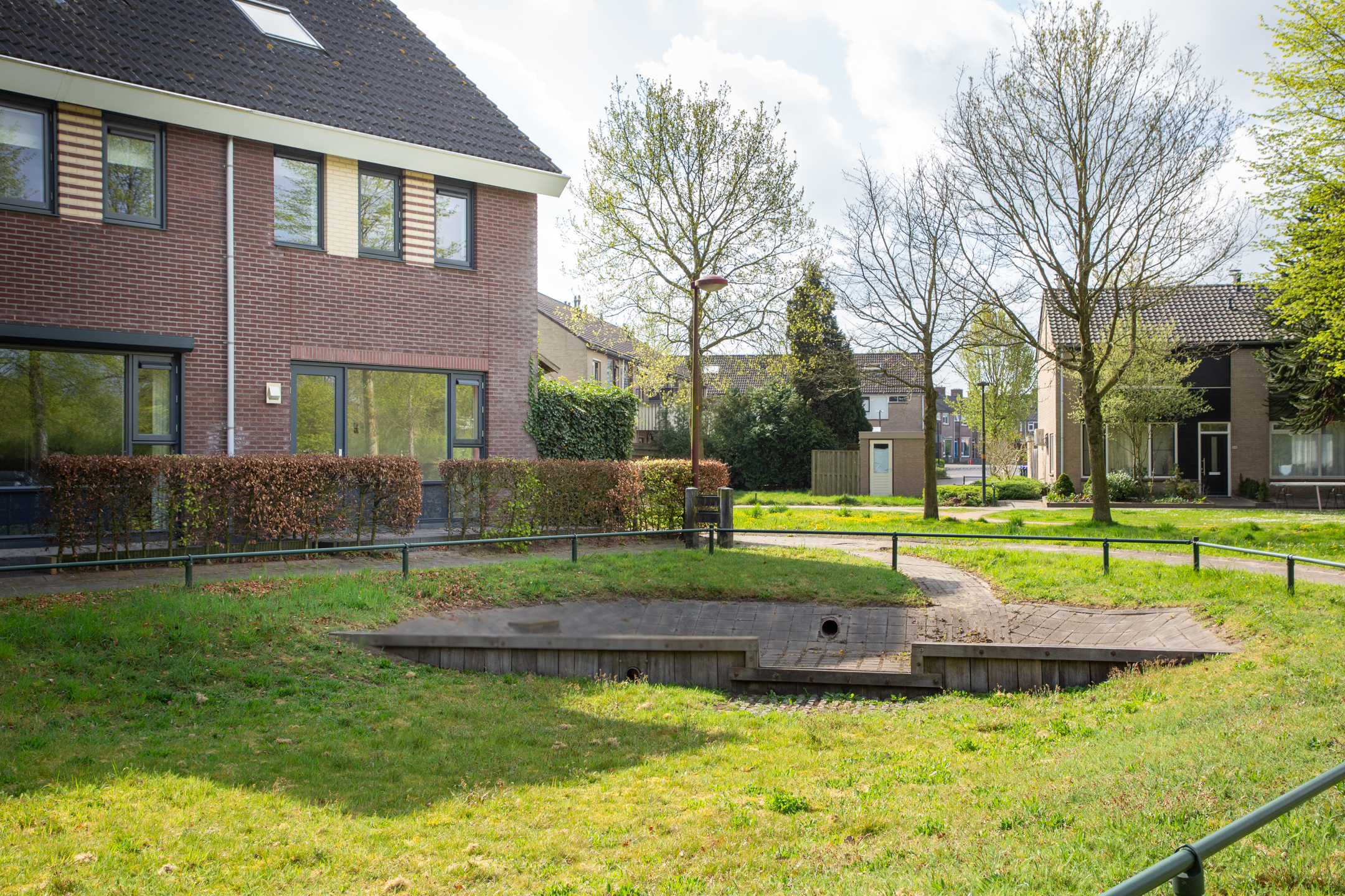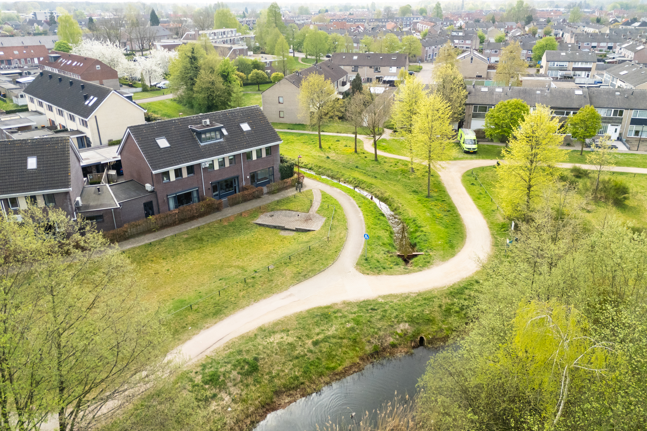 Aan de voorzijde ligt de woning heel fraai aan een voetpad met uitzicht op gemeentegroen met wadi en nabijgelegen fietspad dat om deze wijk is aangelegd.