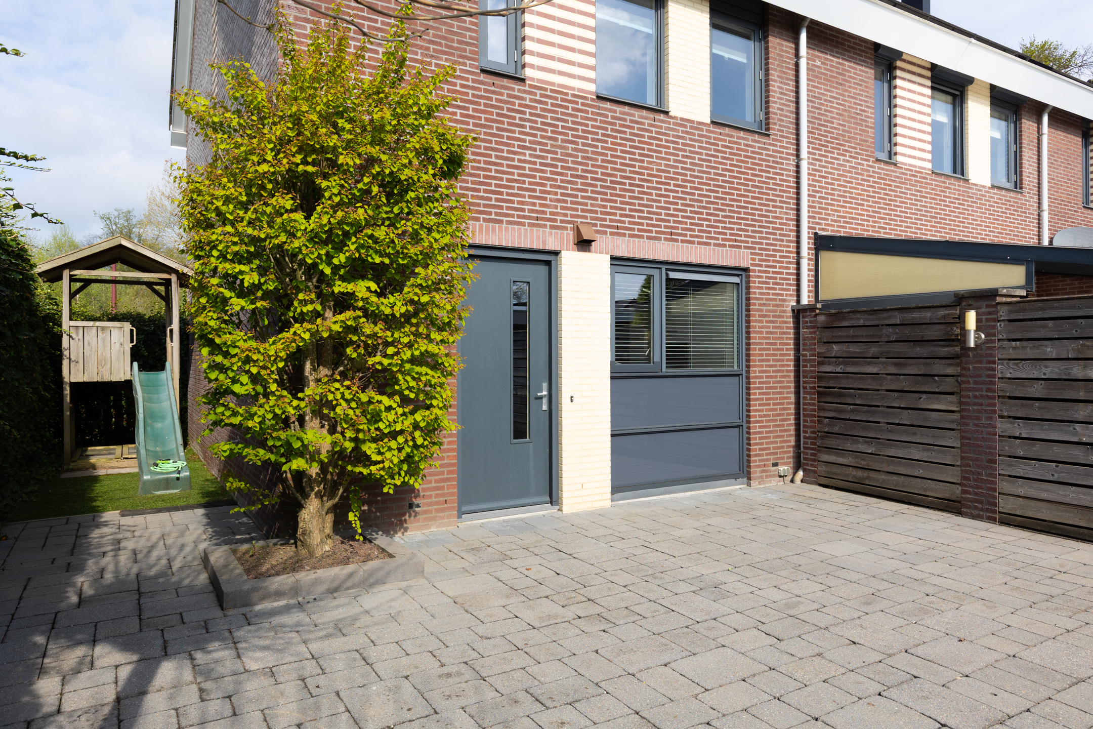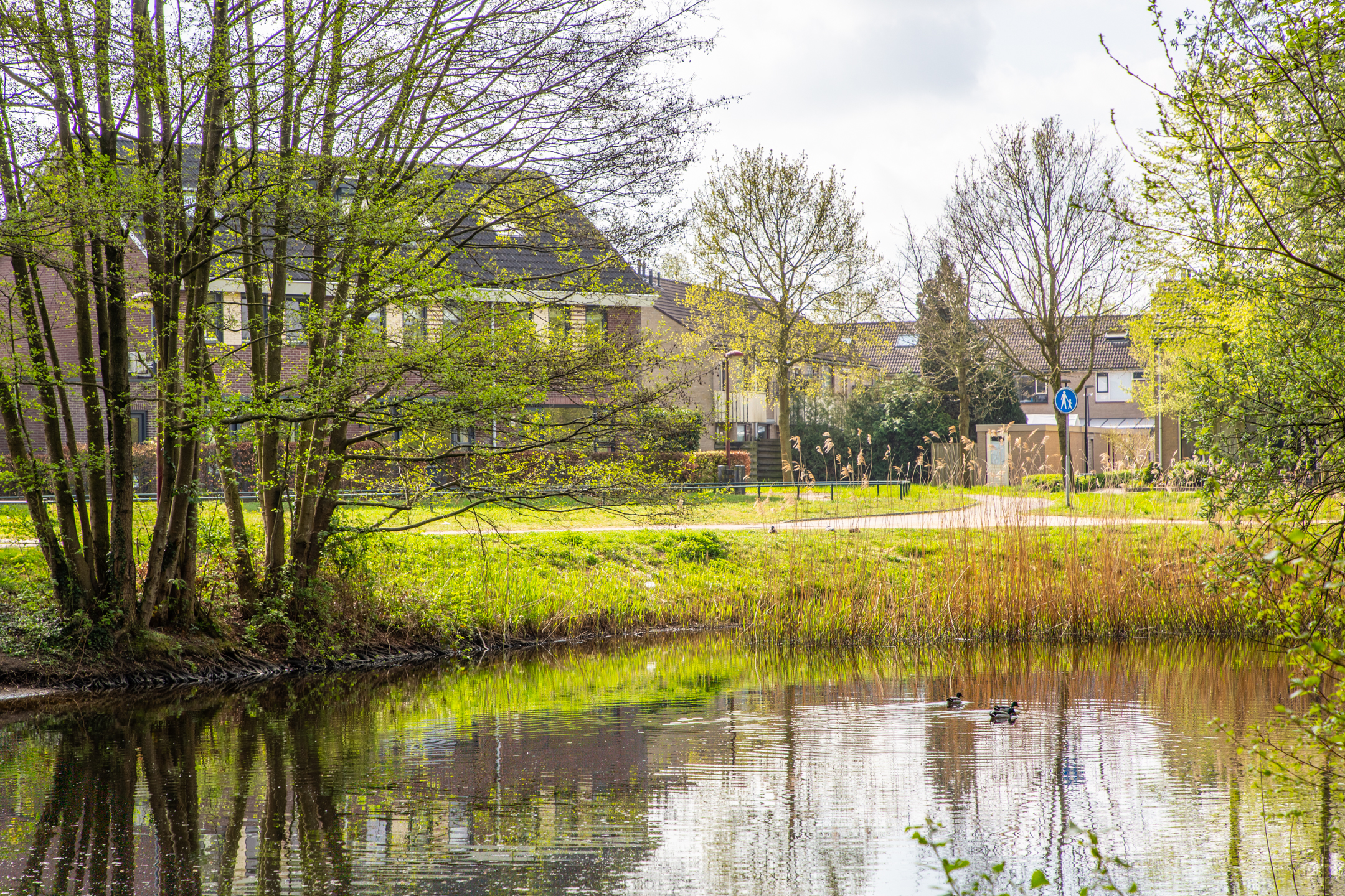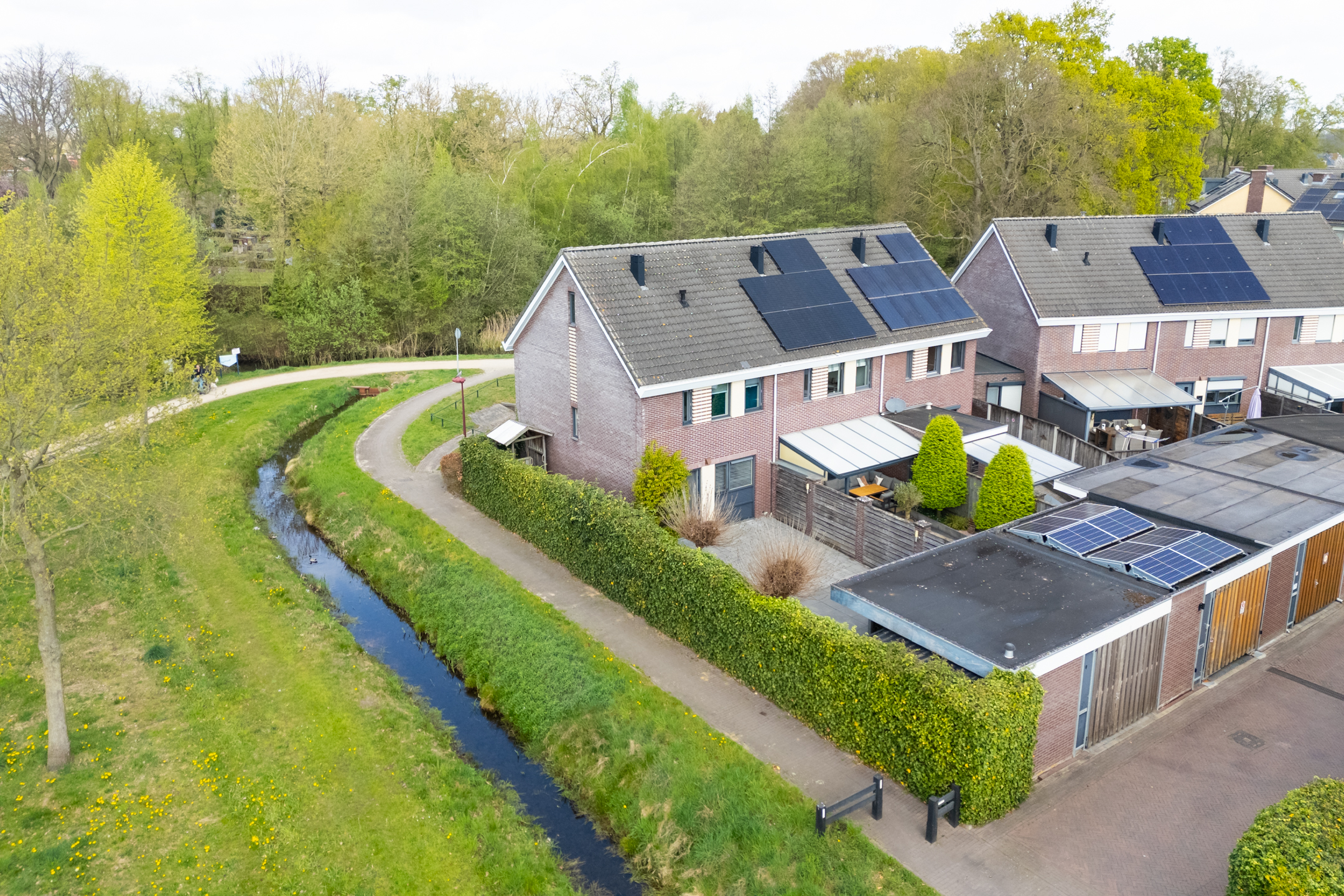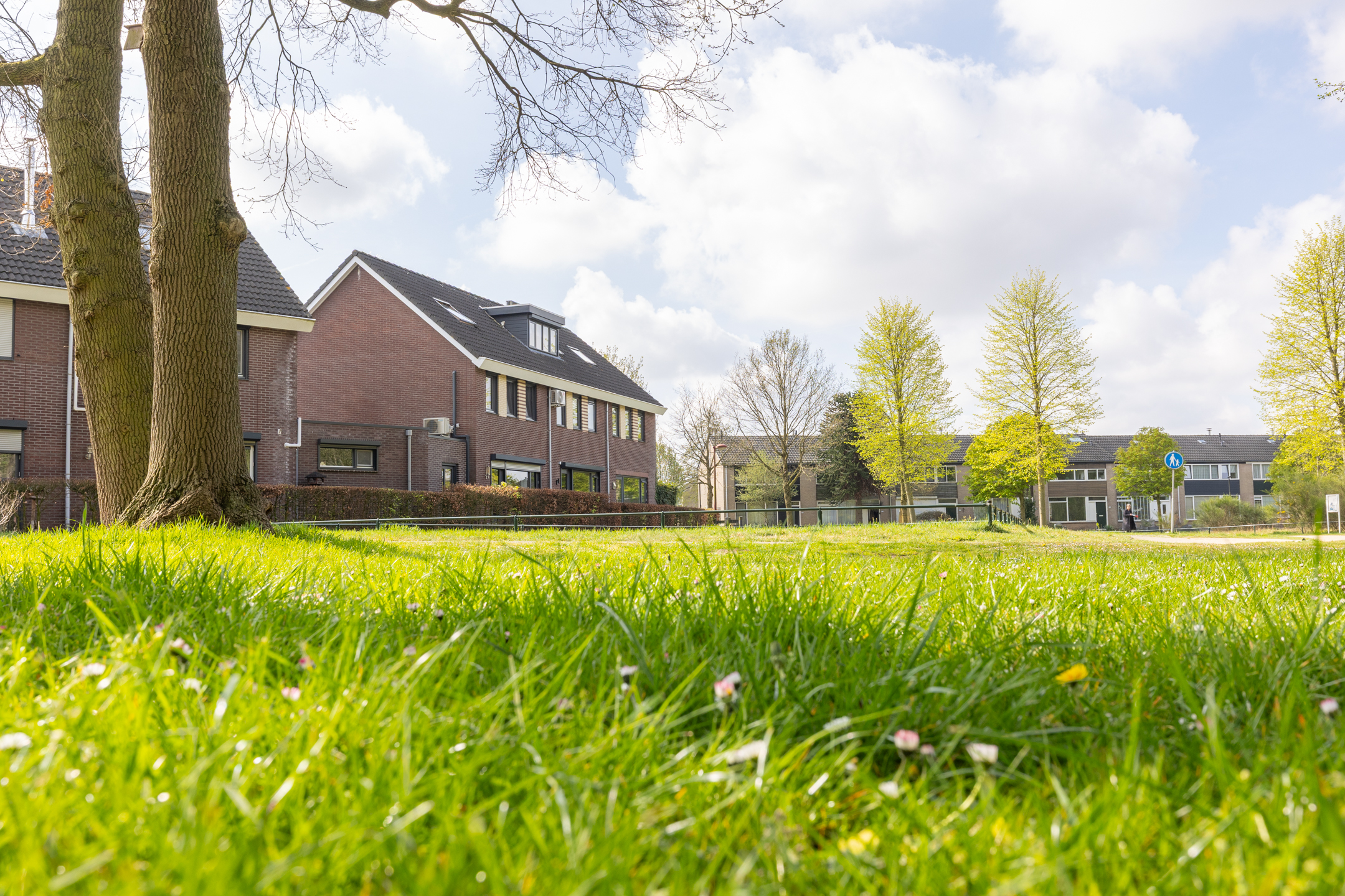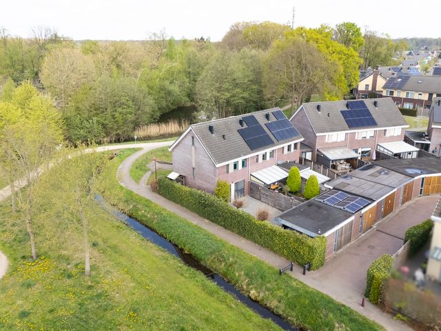Aan de voorzijde ligt de woning heel fraai aan een voetpad met uitzicht op gemeentegroen met wadi en nabijgelegen fietspad dat om deze wijk is aangelegd.
