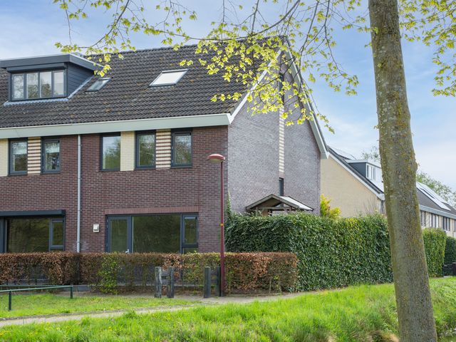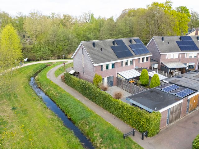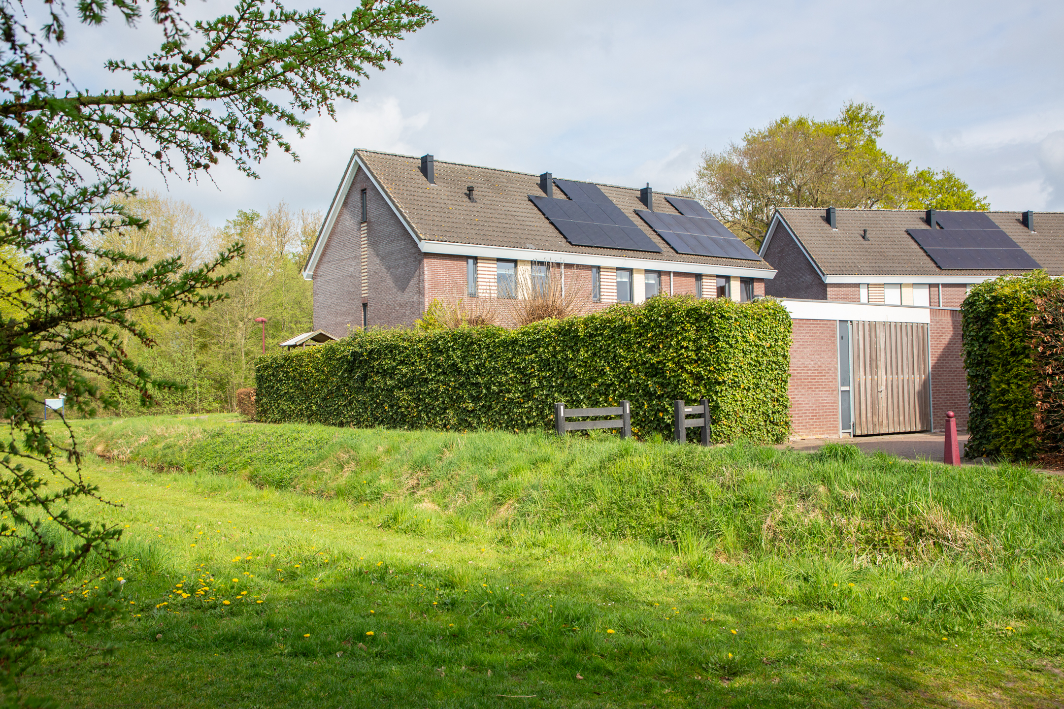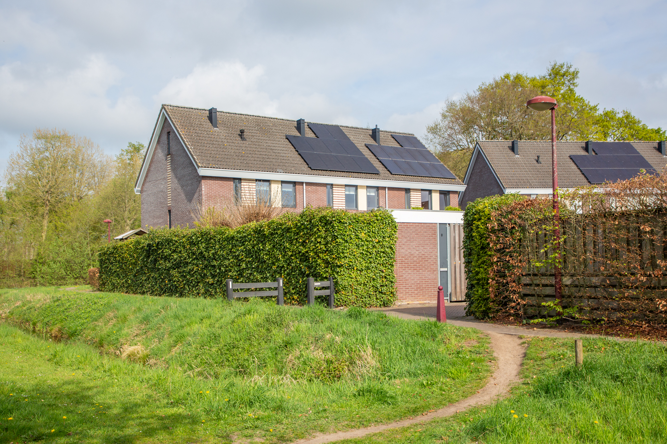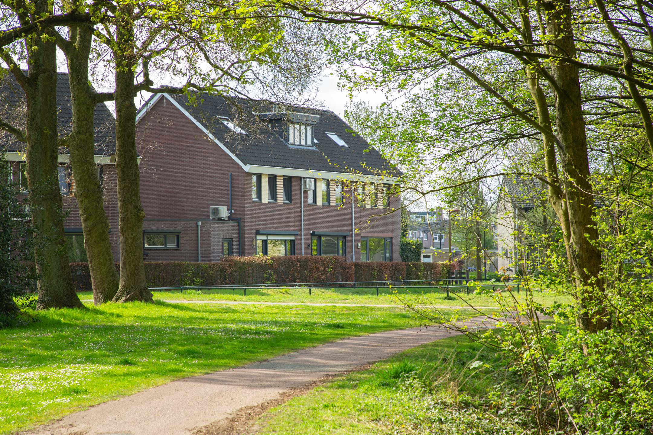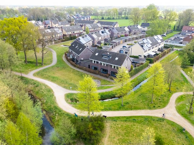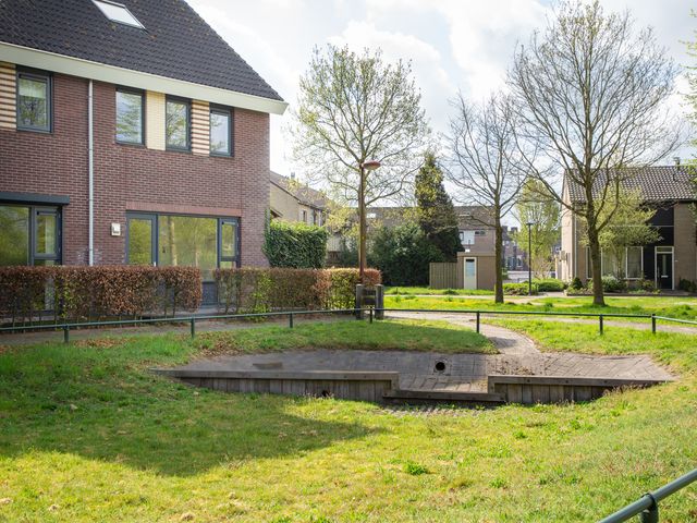 Aan de voorzijde ligt de woning heel fraai aan een voetpad met uitzicht op gemeentegroen met wadi en nabijgelegen fietspad dat om deze wijk is aangelegd.