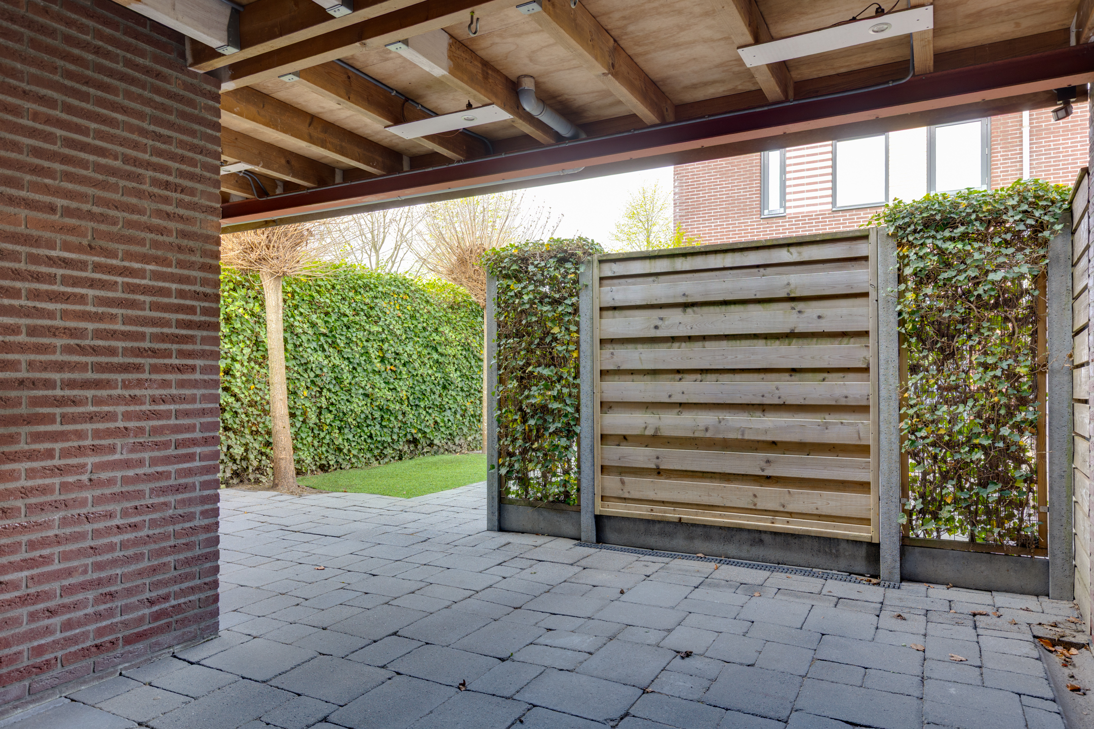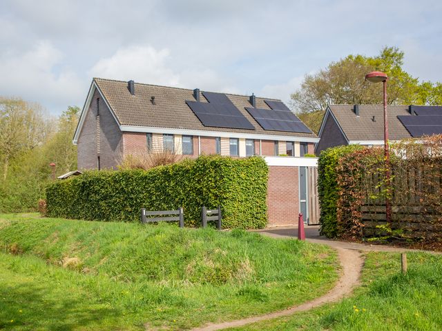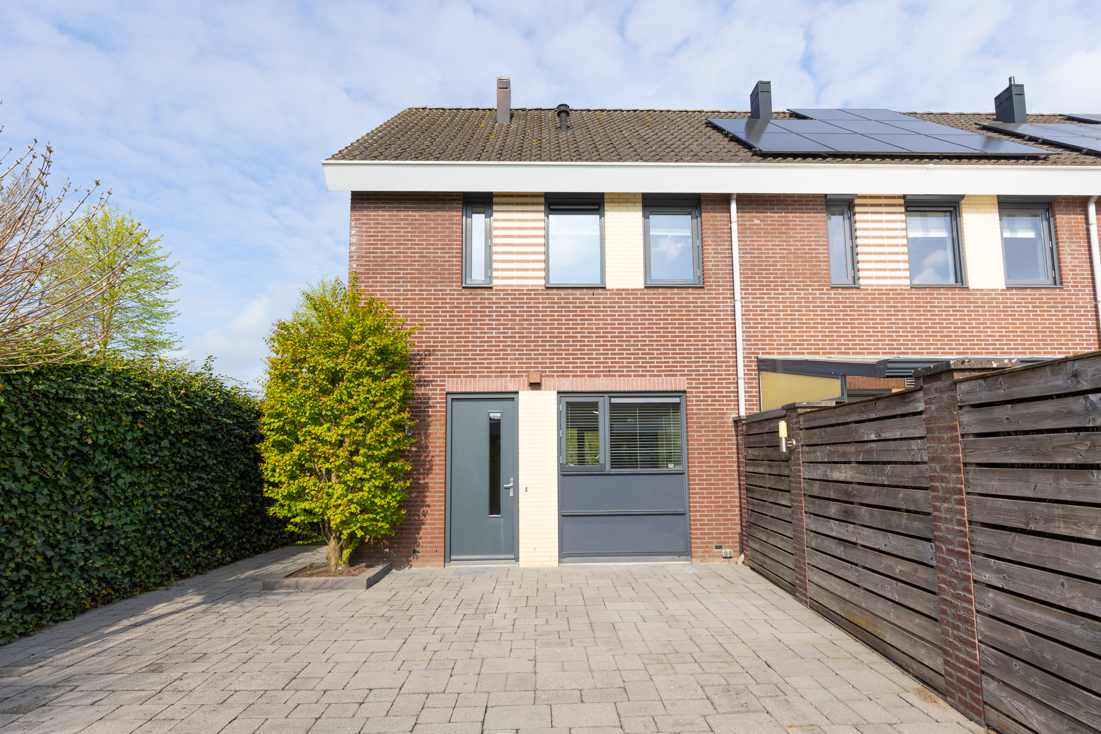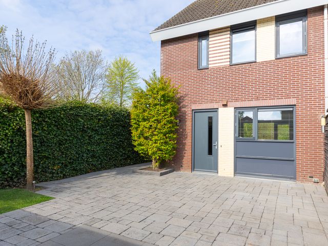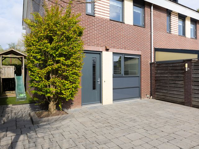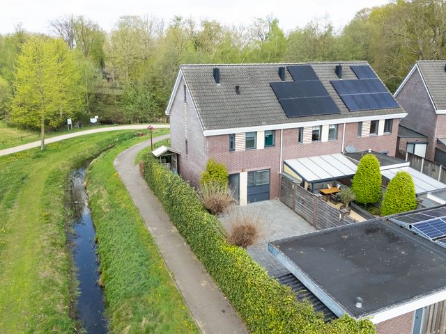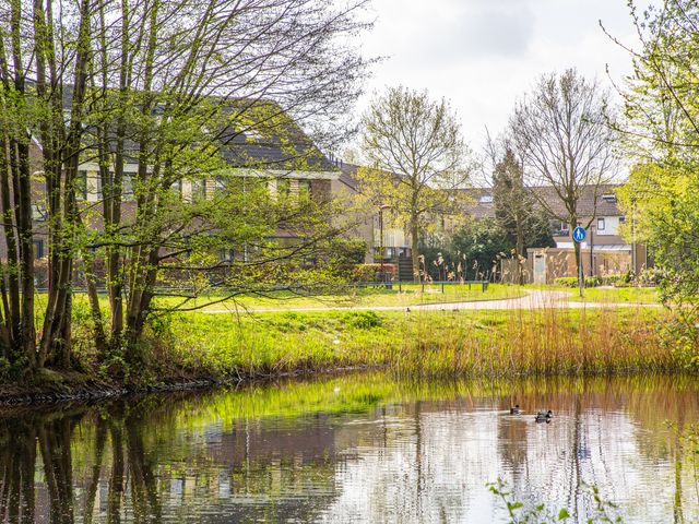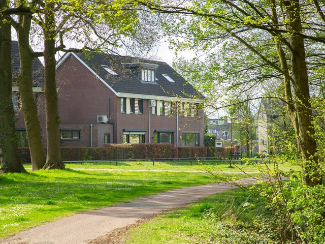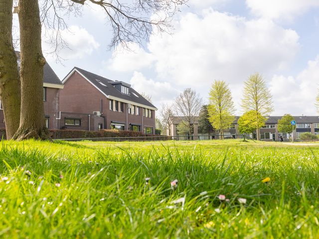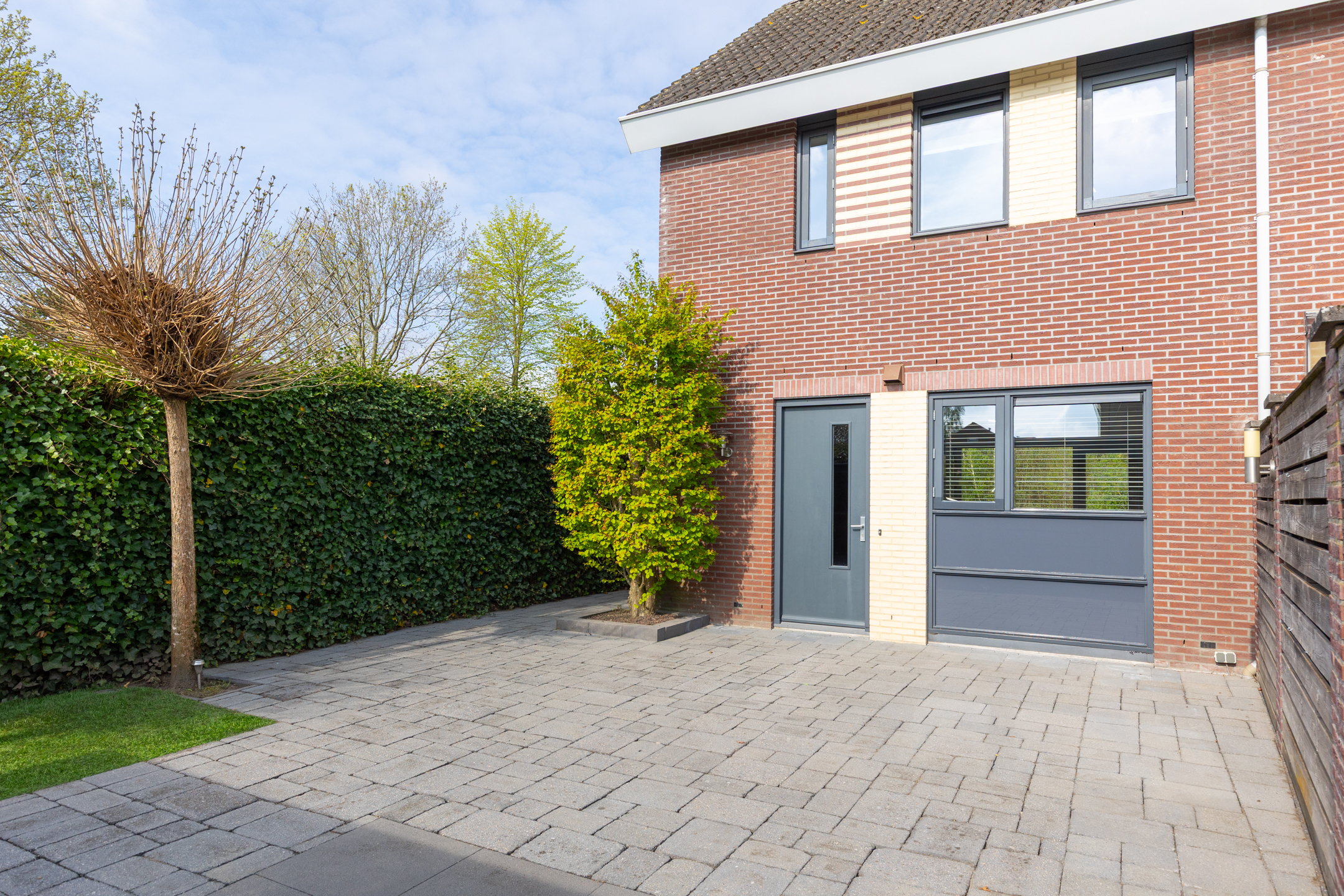Aan de voorzijde ligt de woning heel fraai aan een voetpad met uitzicht op gemeentegroen met wadi en nabijgelegen fietspad dat om deze wijk is aangelegd.