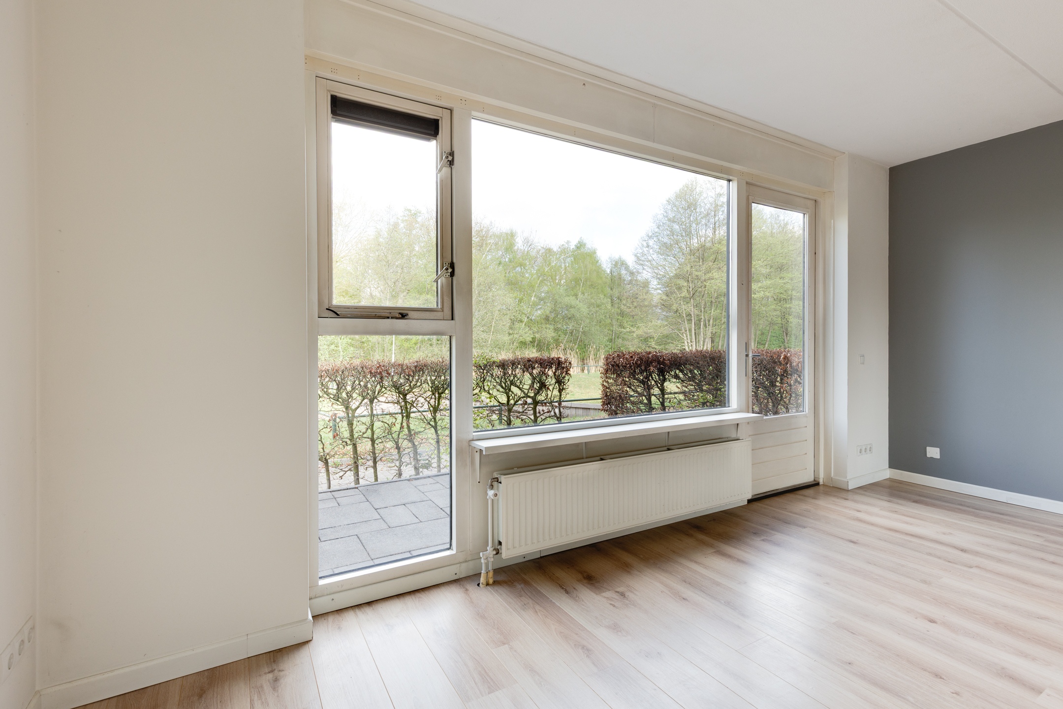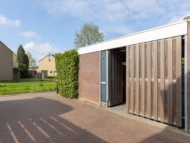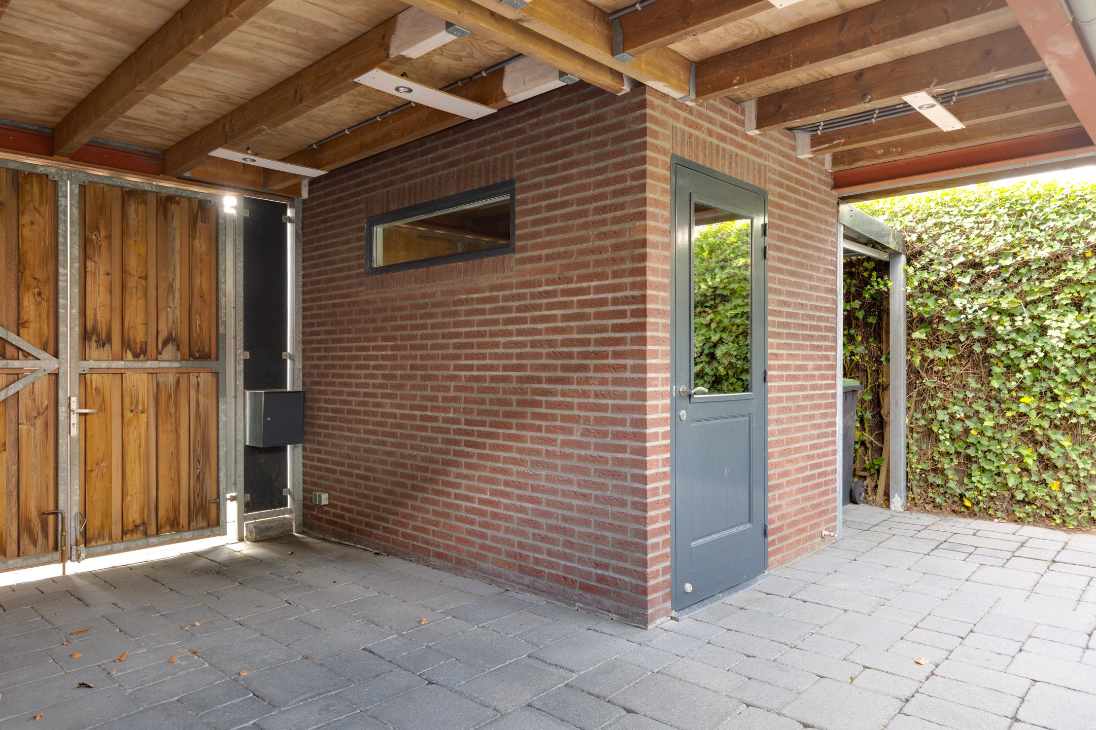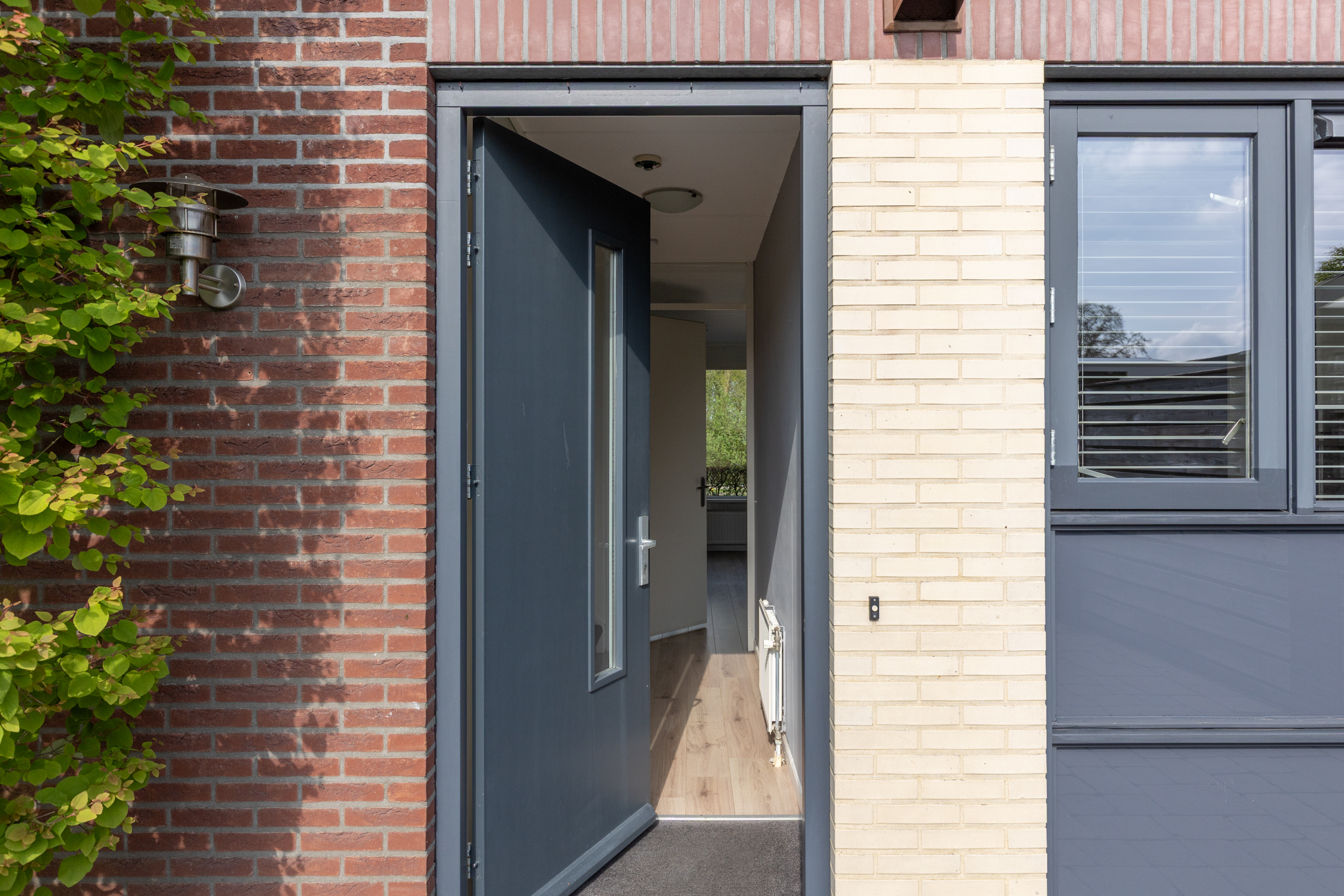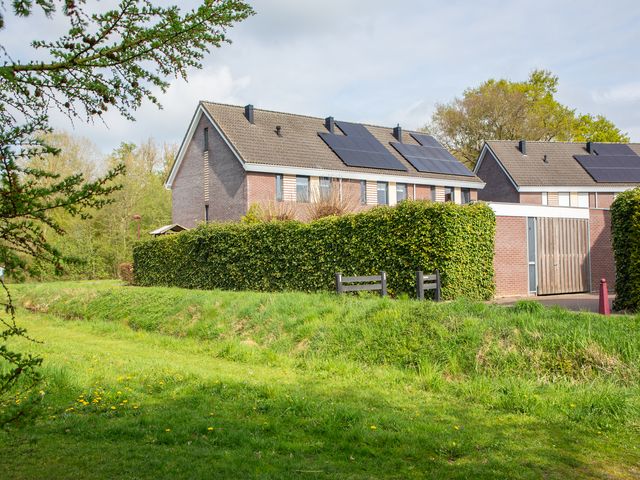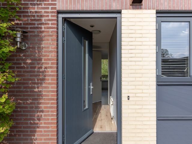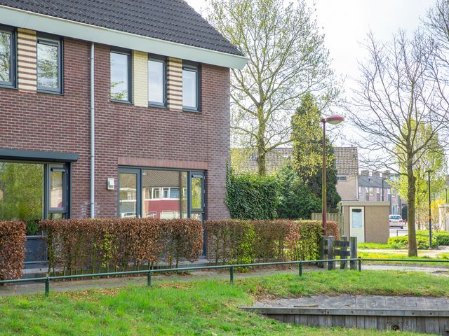 Aan de voorzijde ligt de woning heel fraai aan een voetpad met uitzicht op gemeentegroen met wadi en nabijgelegen fietspad dat om deze wijk is aangelegd.