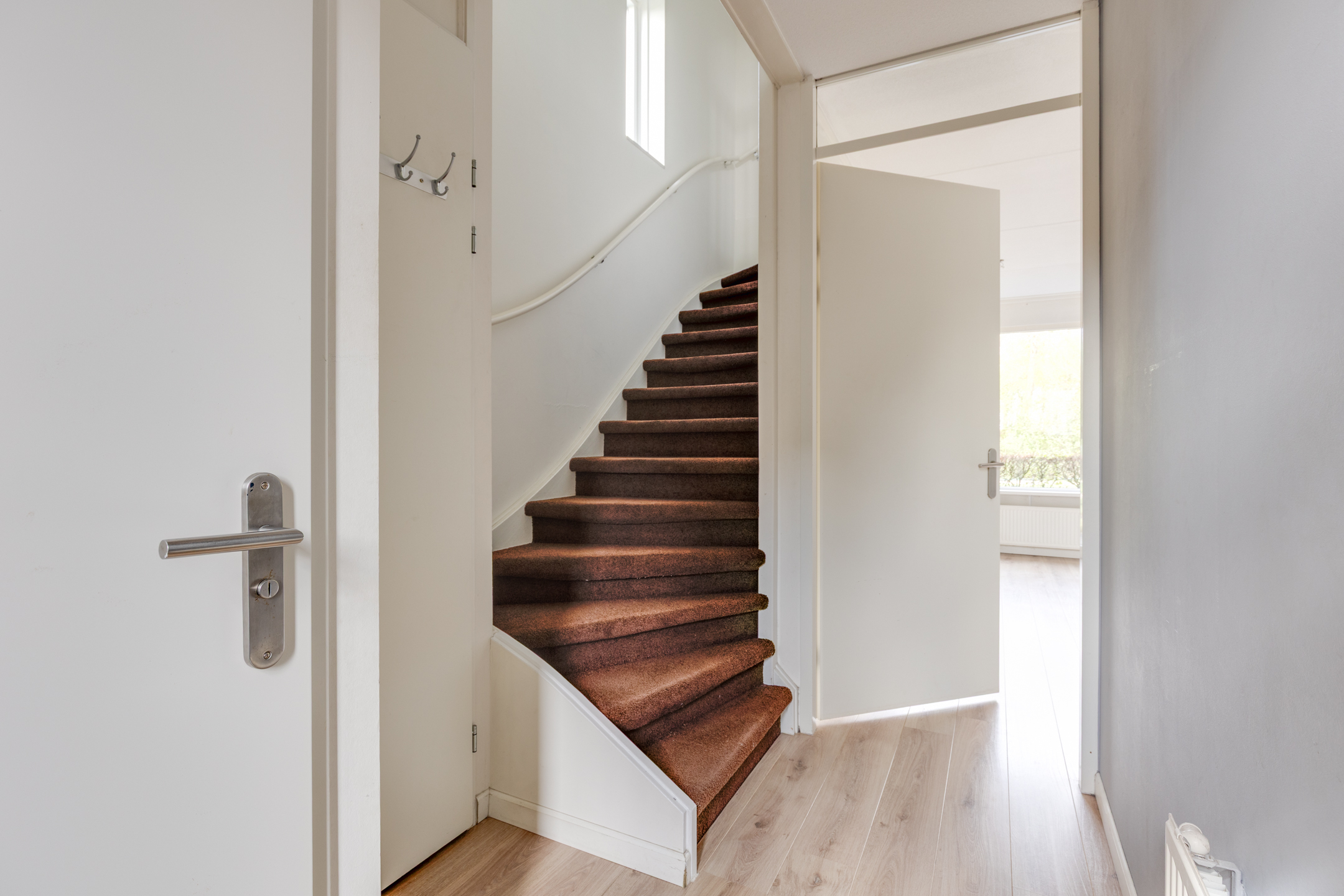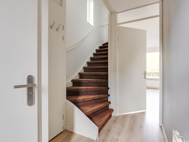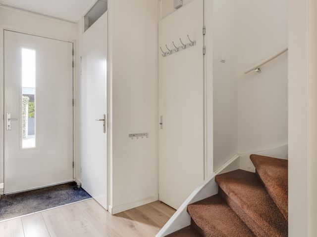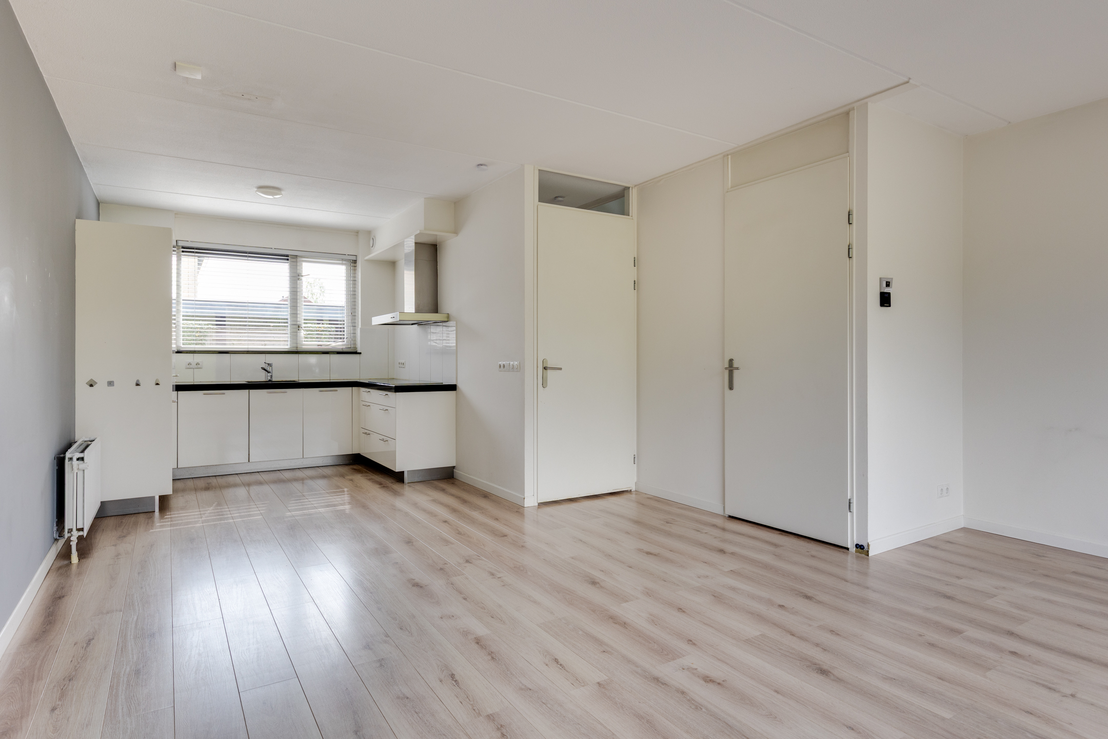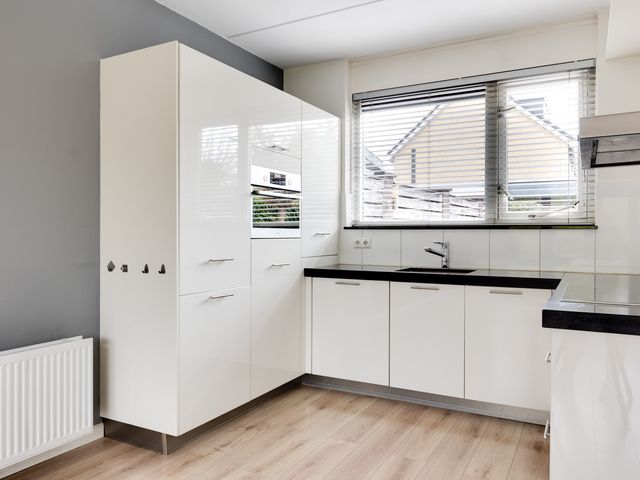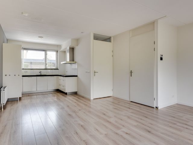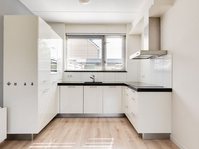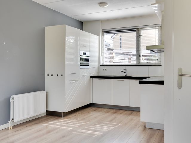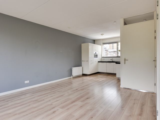 Begane grond: De voordeur waardoor u de entree/hal bereikt is gelegen aan de achterzijde van de woning. Via deze hal is er toegang tot de toiletruimte, de meterkast, trapopgang en woonkamer. De toiletruimte beschikt over een wandcloset met fonteintje en is betegeld tot aan het plafond. De lichte woonkamer met aansluitend open keuken is voorzien van een laminaatvloer, trap-/provisiekast en buitendeur. De inbouwkeuken staat opgesteld in een U-vorm en beschikt over diverse apparatuur.