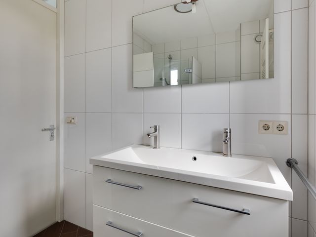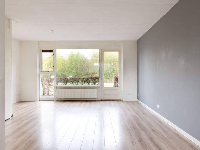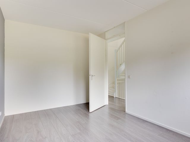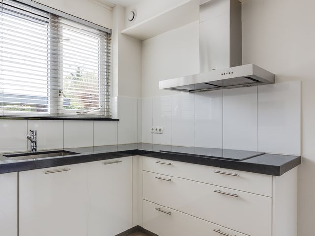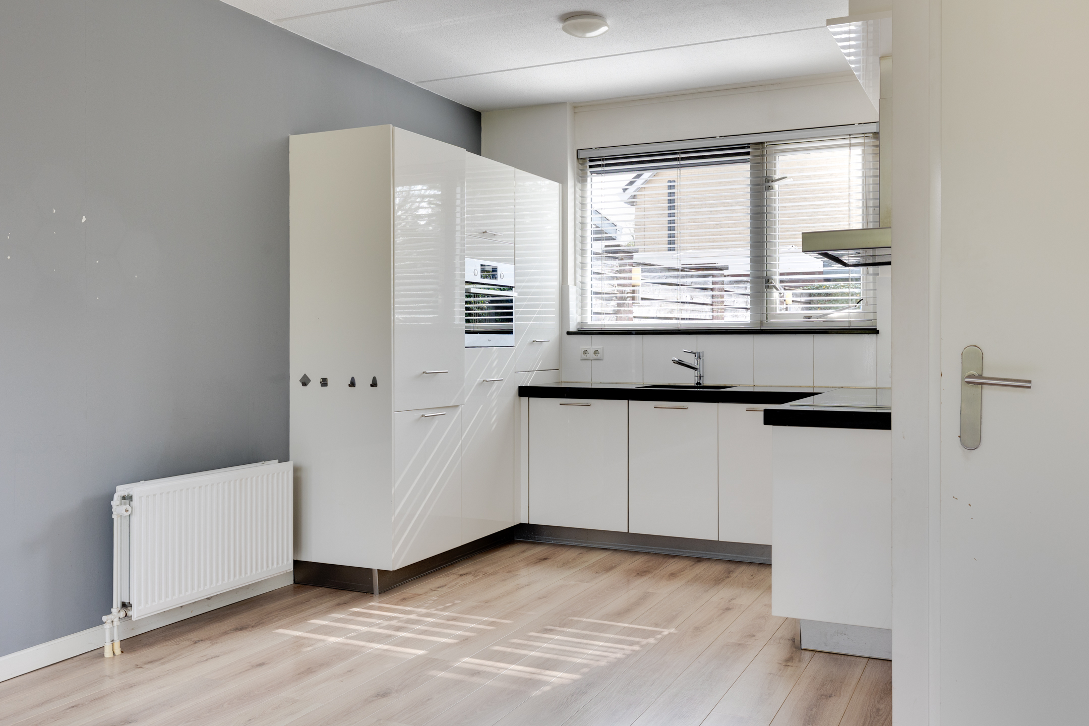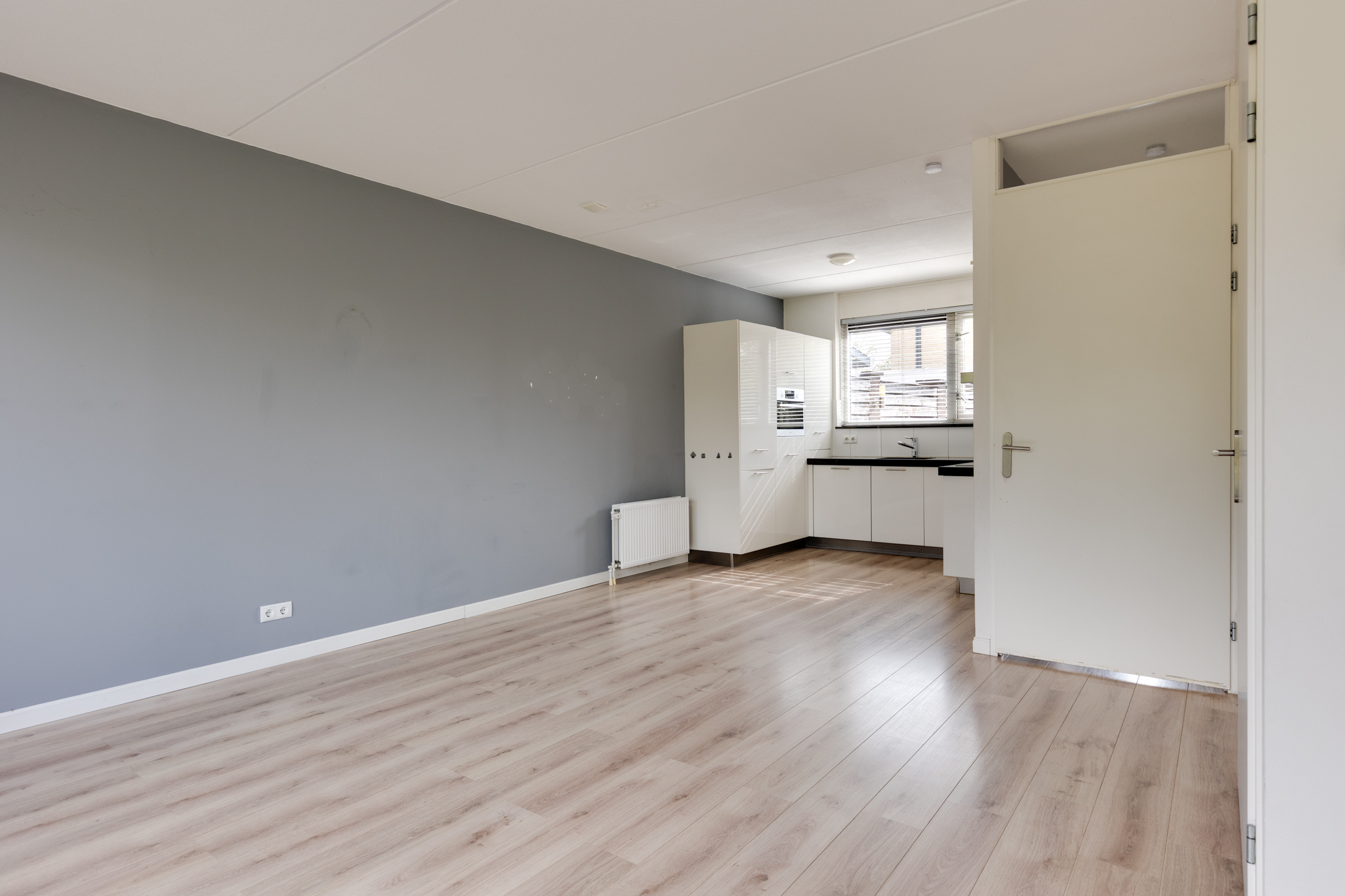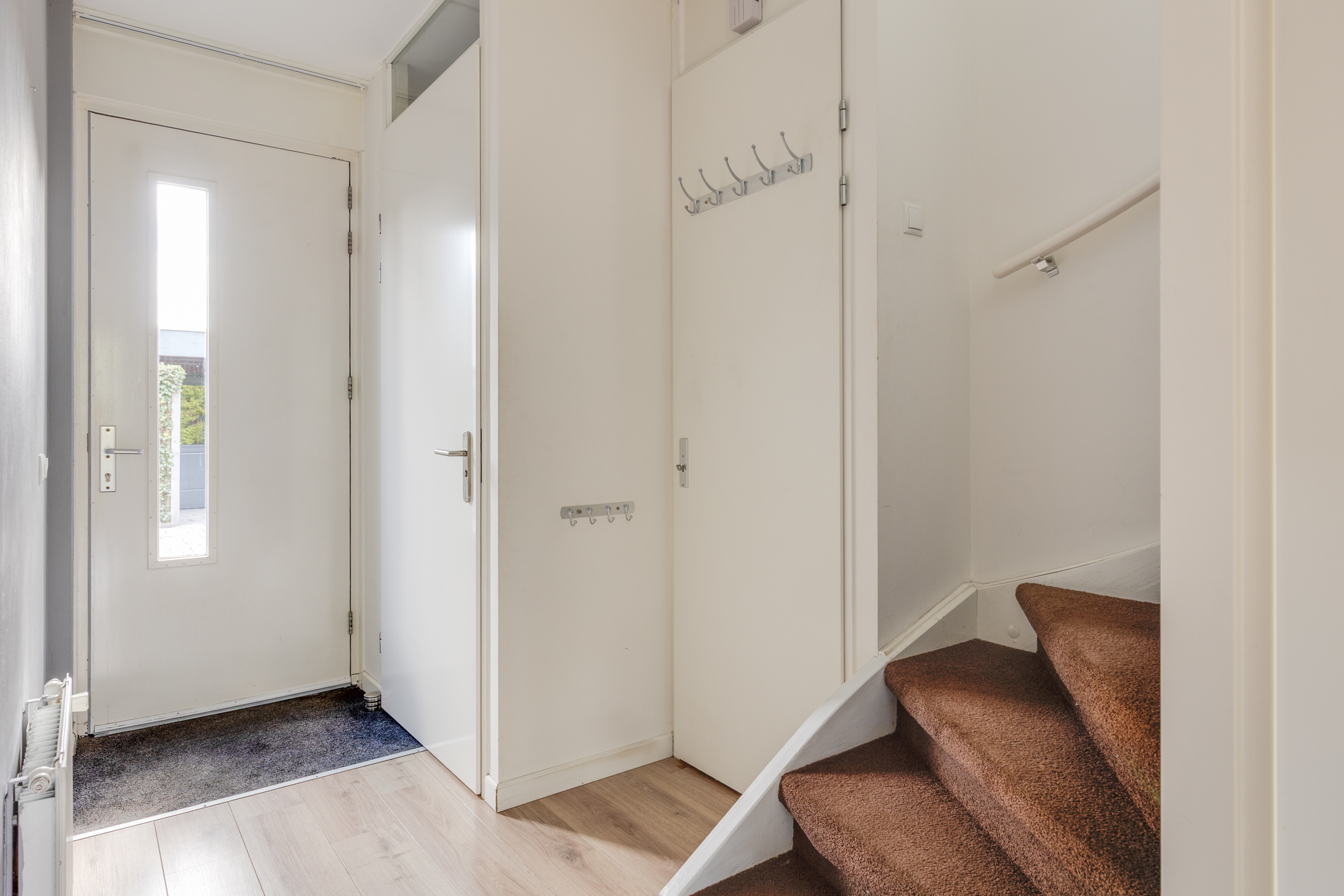 Begane grond: De voordeur waardoor u de entree/hal bereikt is gelegen aan de achterzijde van de woning. Via deze hal is er toegang tot de toiletruimte, de meterkast, trapopgang en woonkamer. De toiletruimte beschikt over een wandcloset met fonteintje en is betegeld tot aan het plafond. De lichte woonkamer met aansluitend open keuken is voorzien van een laminaatvloer, trap-/provisiekast en buitendeur. De inbouwkeuken staat opgesteld in een U-vorm en beschikt over diverse apparatuur.