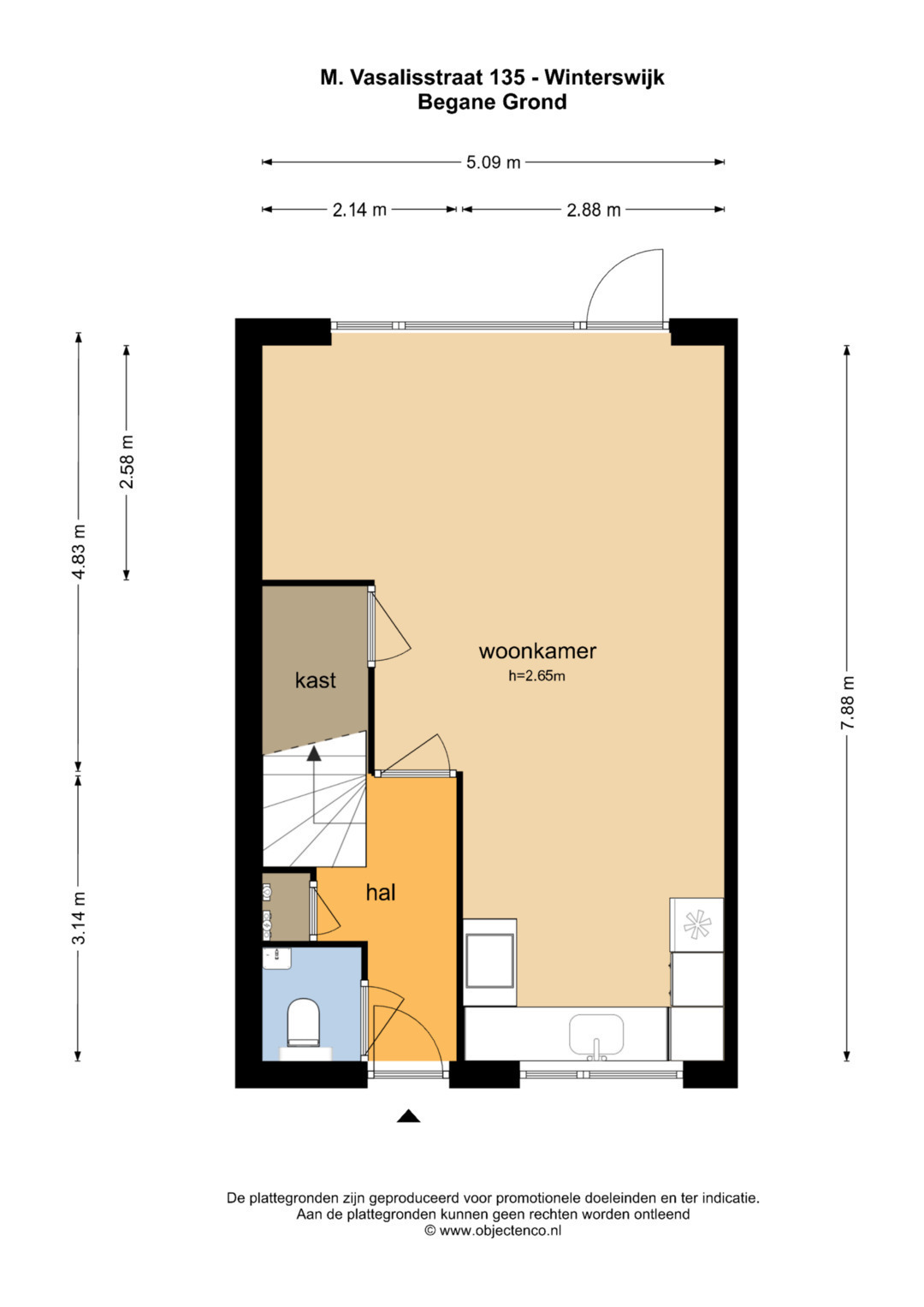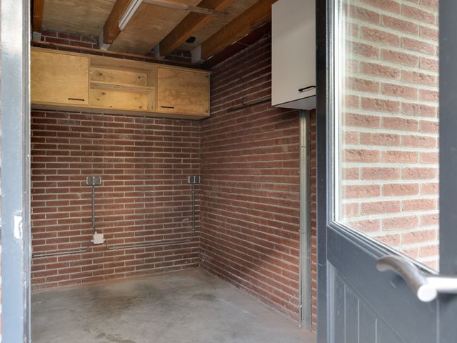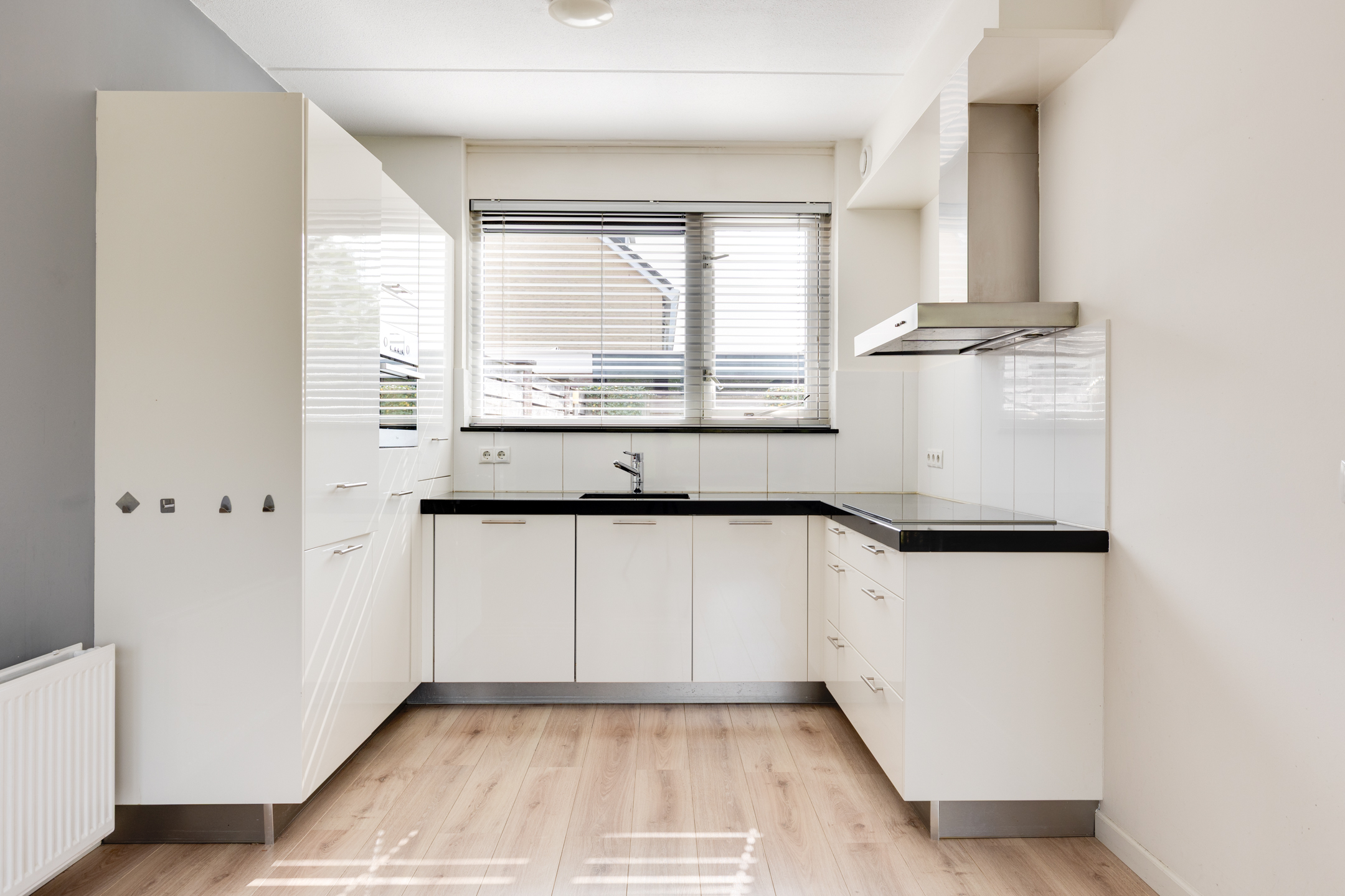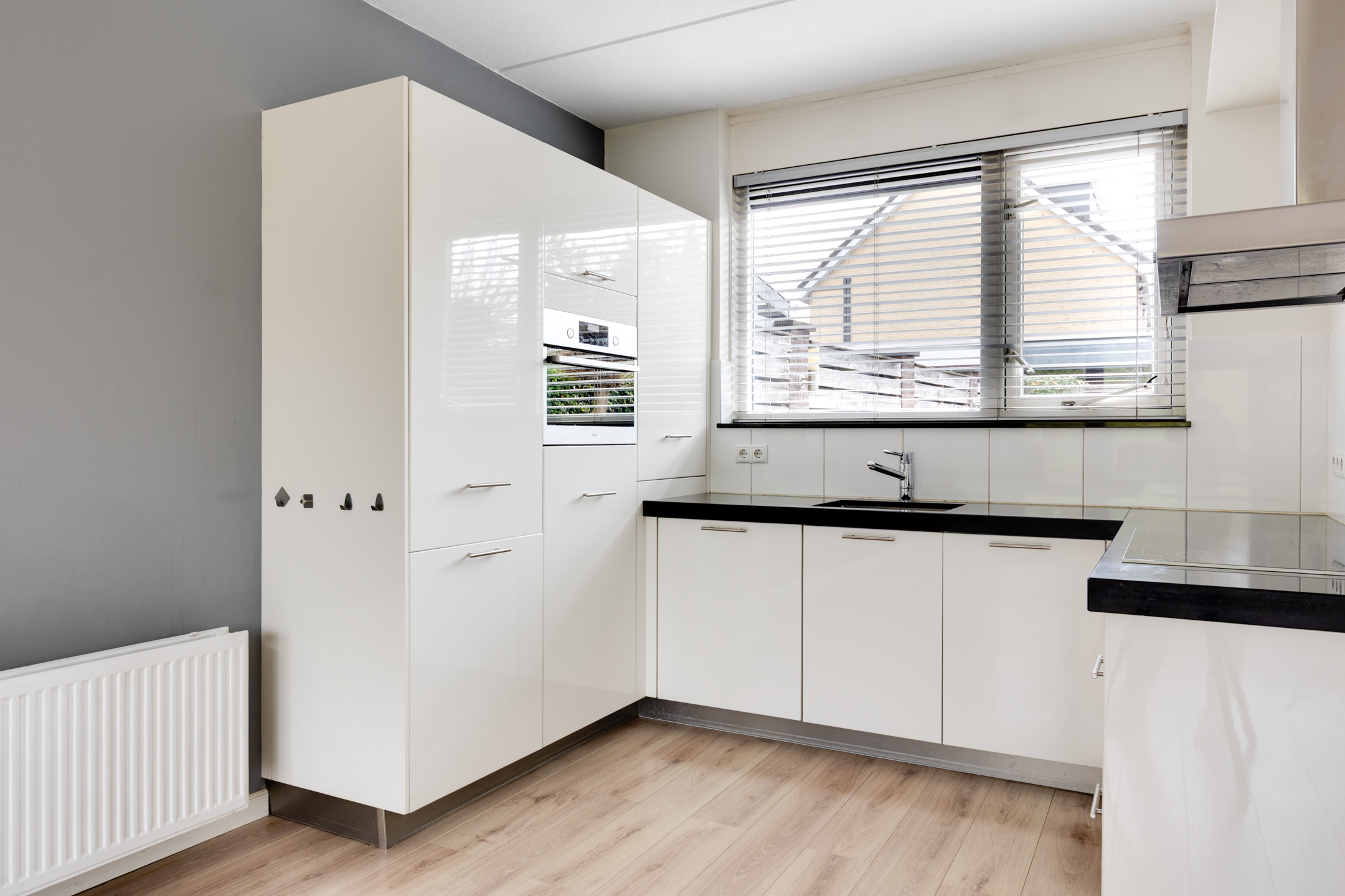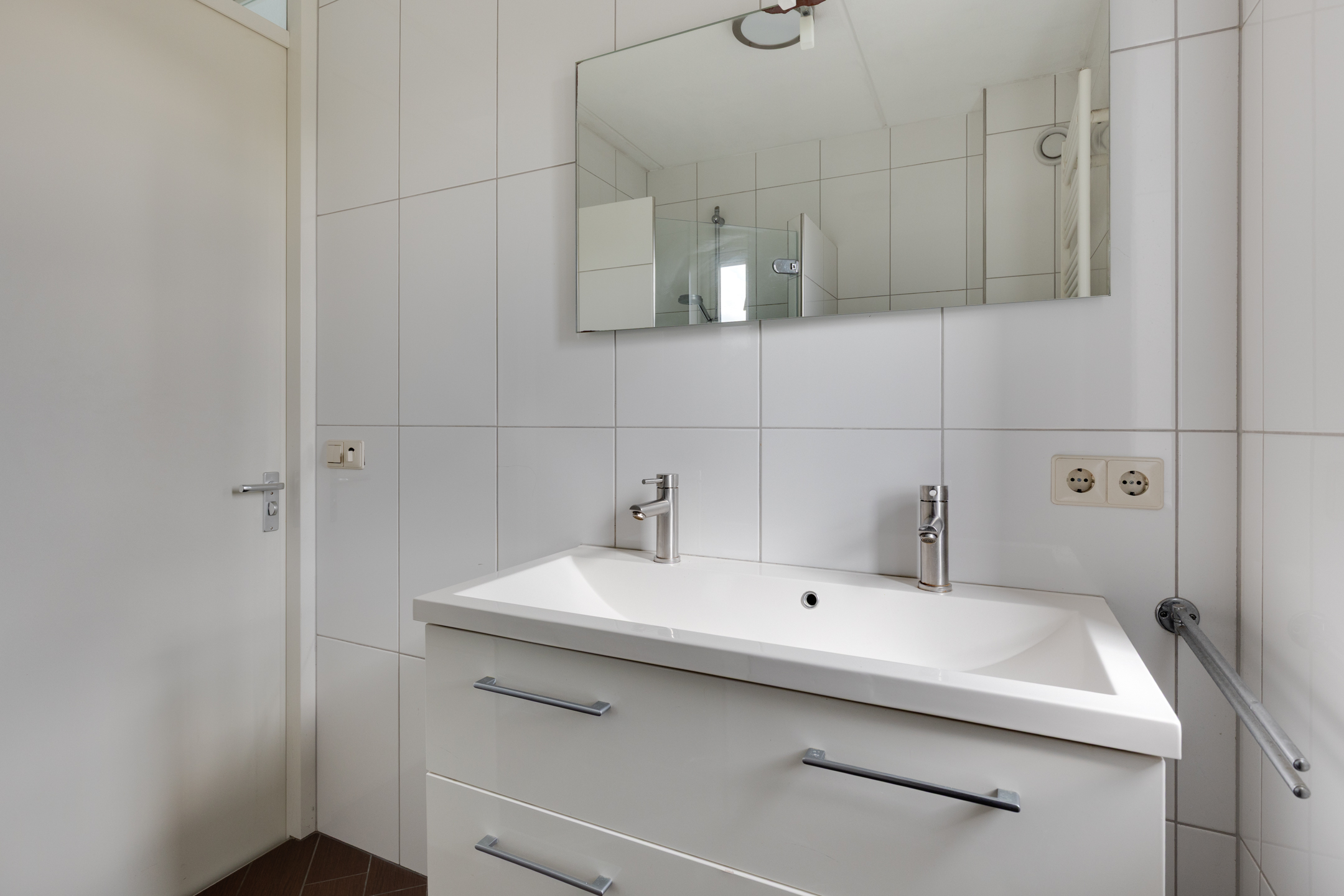 Begane grond: De voordeur waardoor u de entree/hal bereikt is gelegen aan de achterzijde van de woning. Via deze hal is er toegang tot de toiletruimte, de meterkast, trapopgang en woonkamer. De toiletruimte beschikt over een wandcloset met fonteintje en is betegeld tot aan het plafond. De lichte woonkamer met aansluitend open keuken is voorzien van een laminaatvloer, trap-/provisiekast en buitendeur. De inbouwkeuken staat opgesteld in een U-vorm en beschikt over diverse apparatuur.