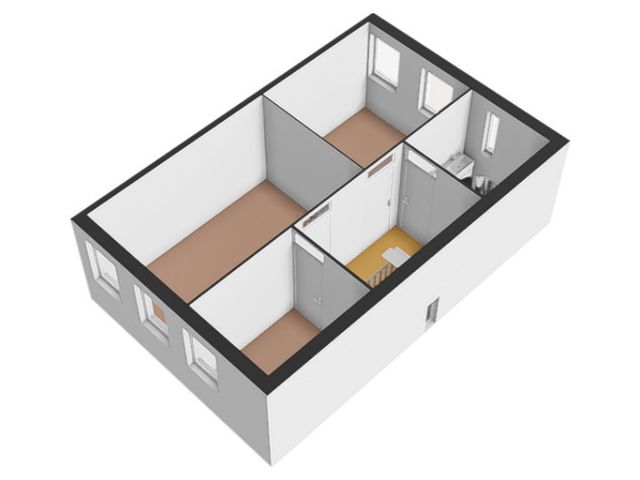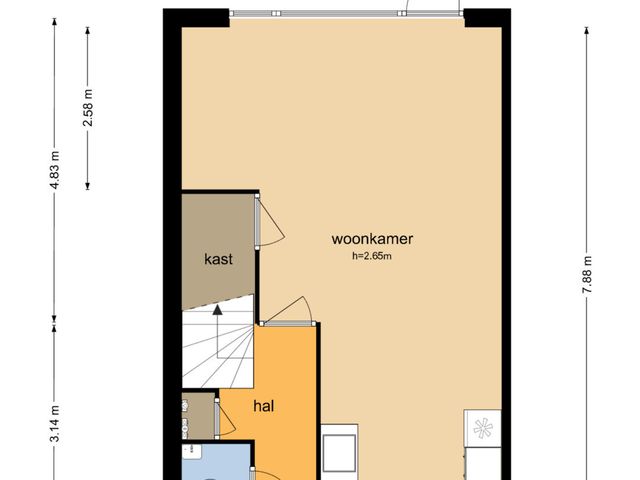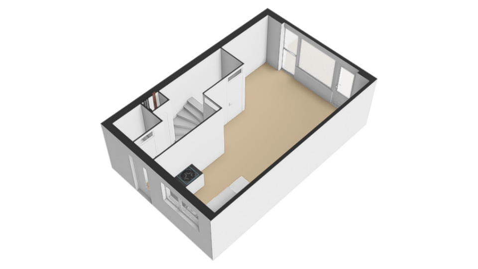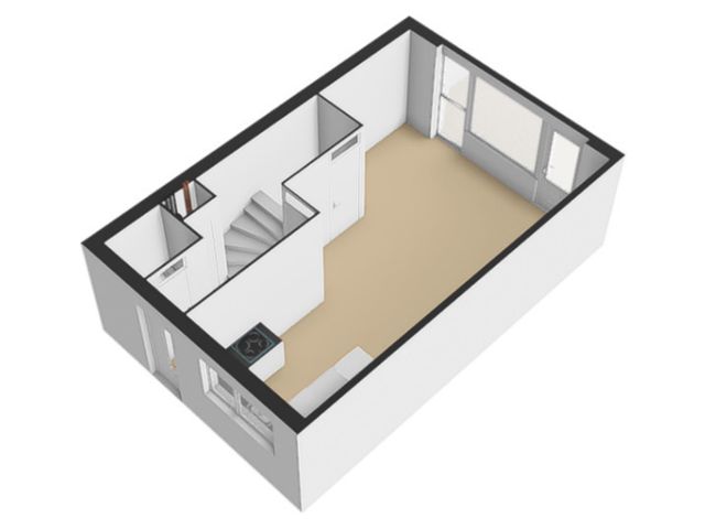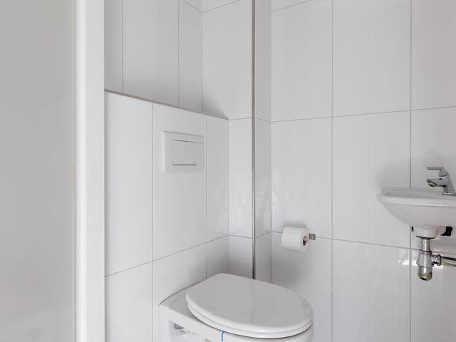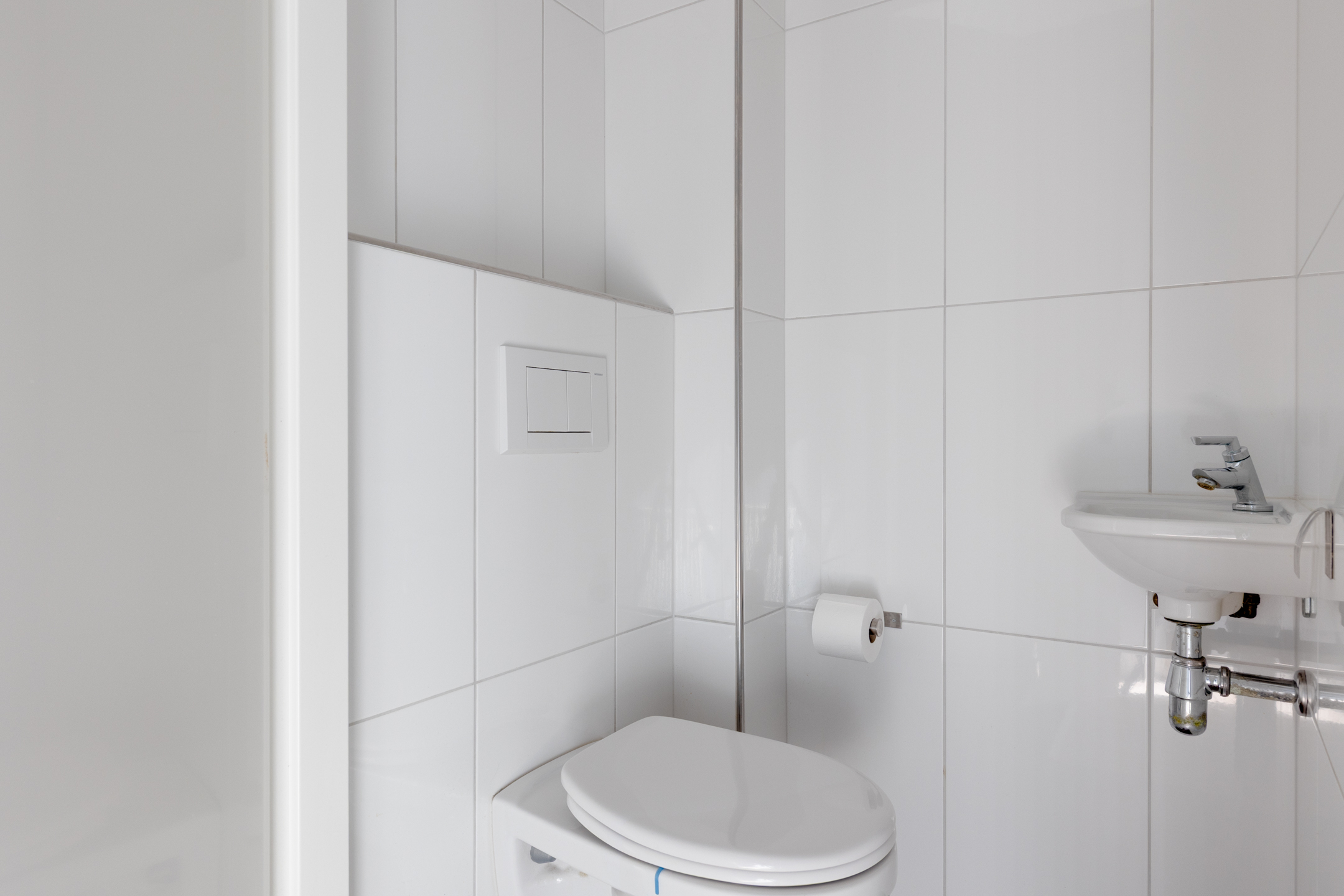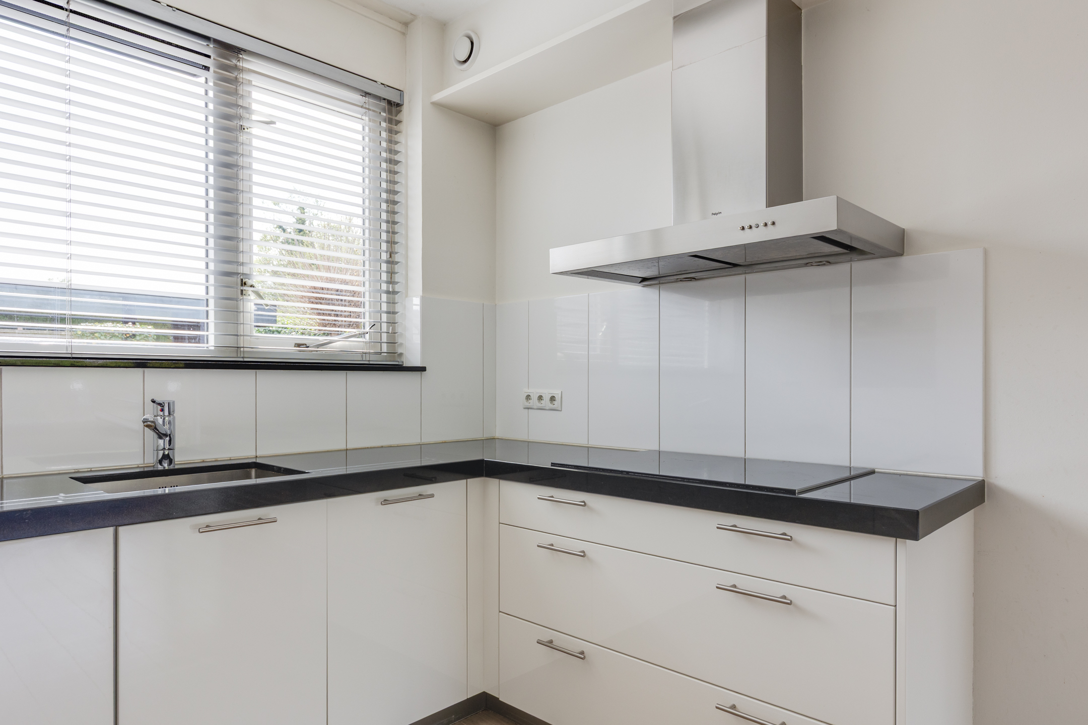 Begane grond: De voordeur waardoor u de entree/hal bereikt is gelegen aan de achterzijde van de woning. Via deze hal is er toegang tot de toiletruimte, de meterkast, trapopgang en woonkamer. De toiletruimte beschikt over een wandcloset met fonteintje en is betegeld tot aan het plafond. De lichte woonkamer met aansluitend open keuken is voorzien van een laminaatvloer, trap-/provisiekast en buitendeur. De inbouwkeuken staat opgesteld in een U-vorm en beschikt over diverse apparatuur.