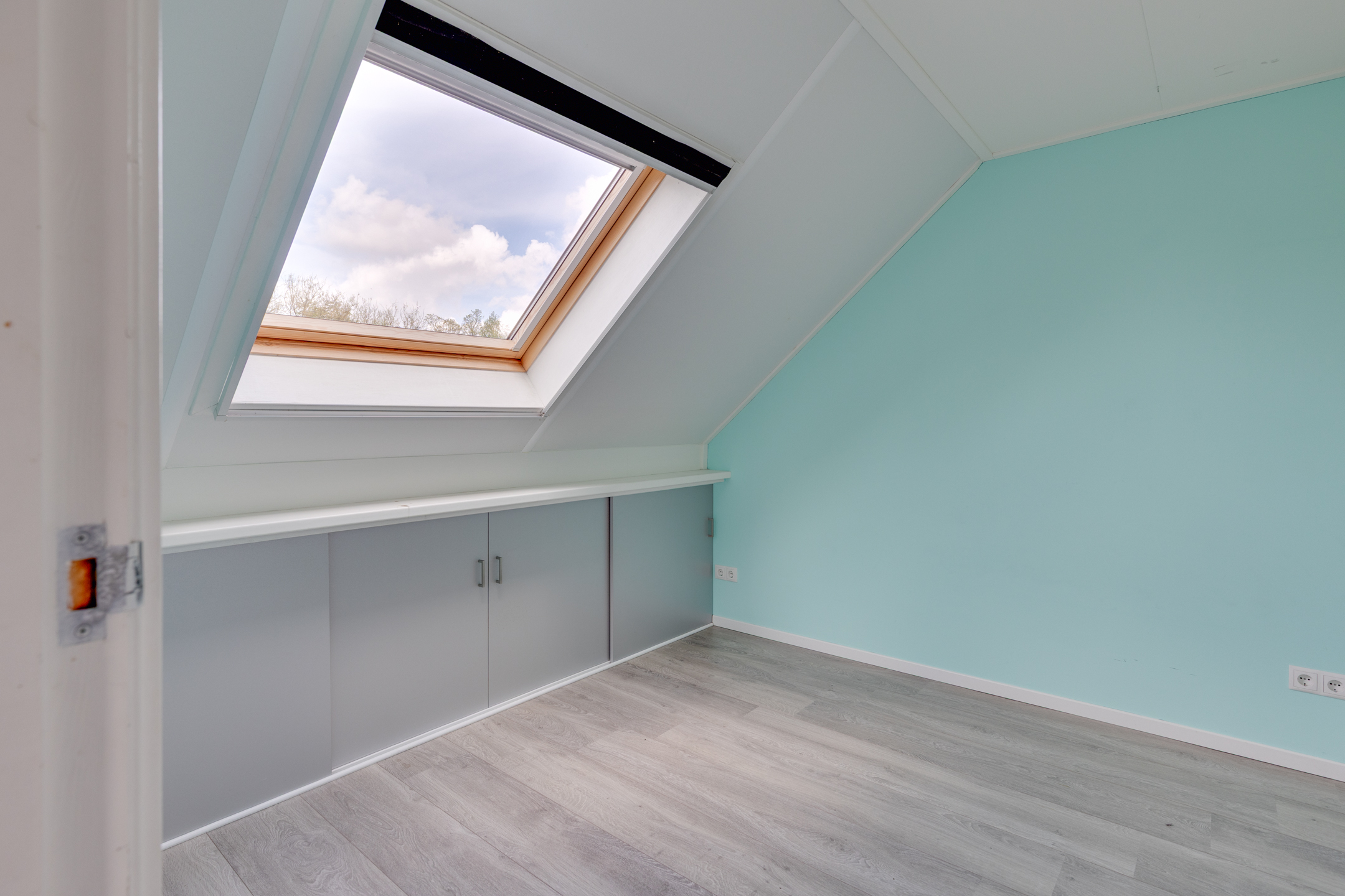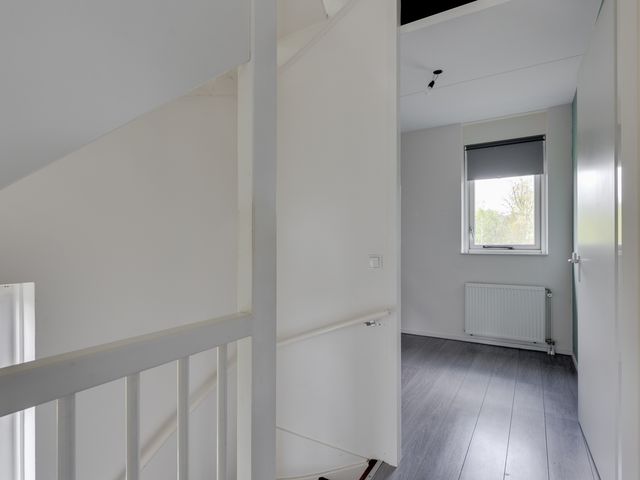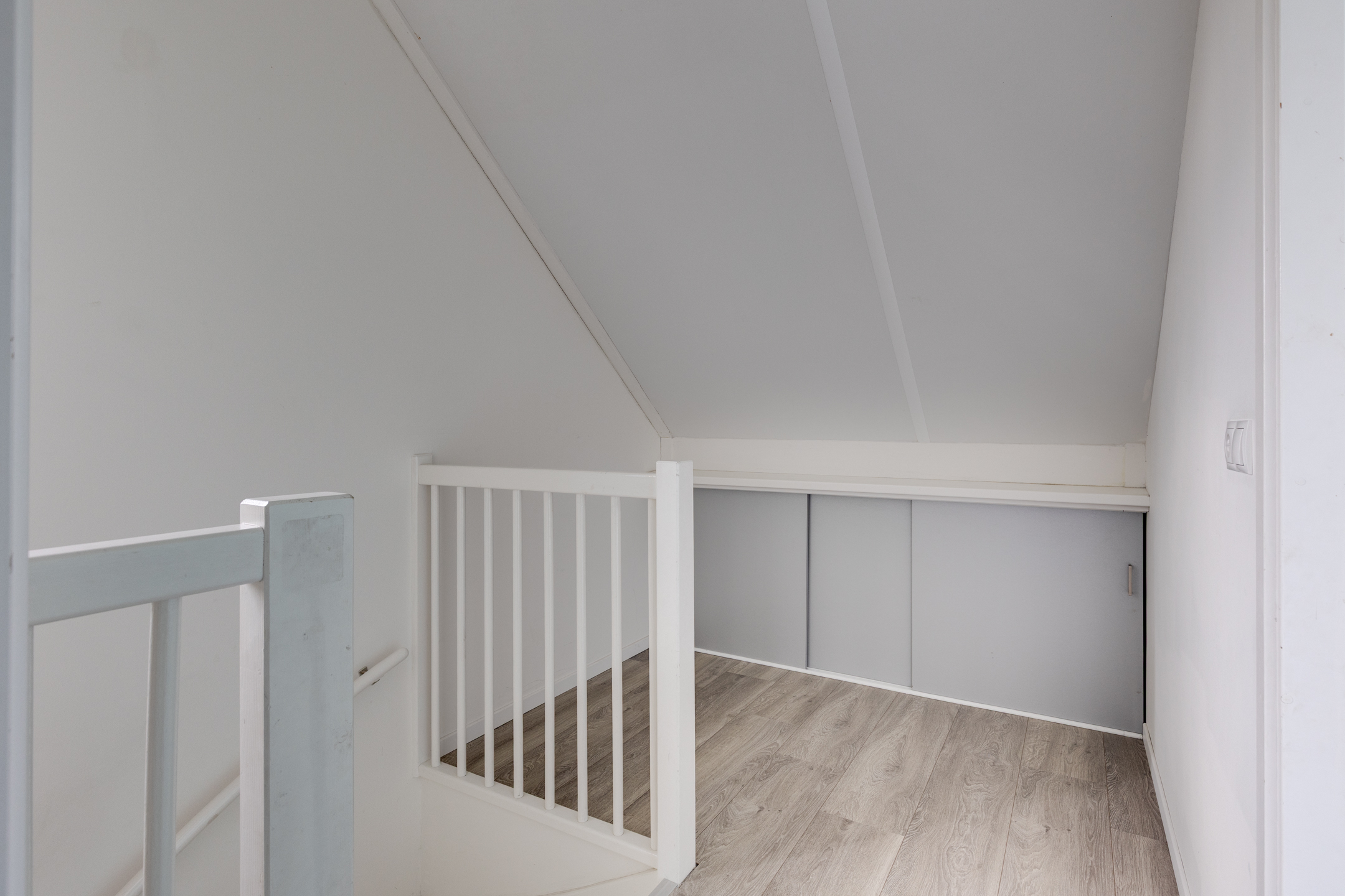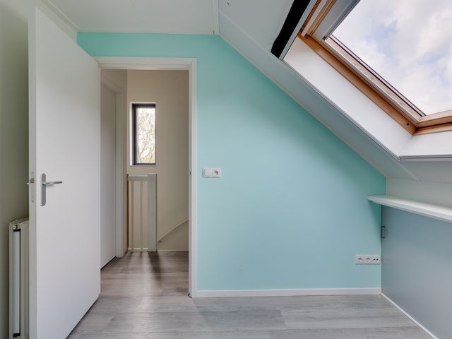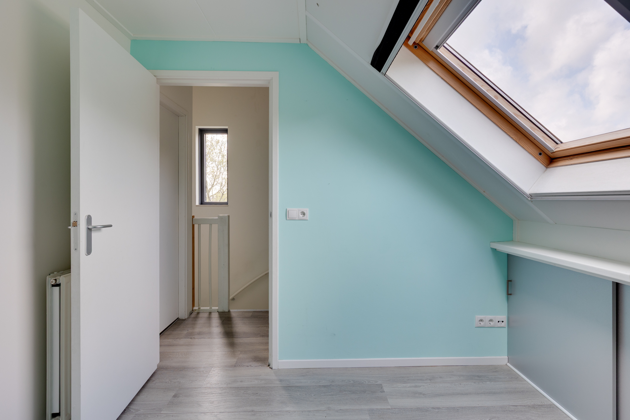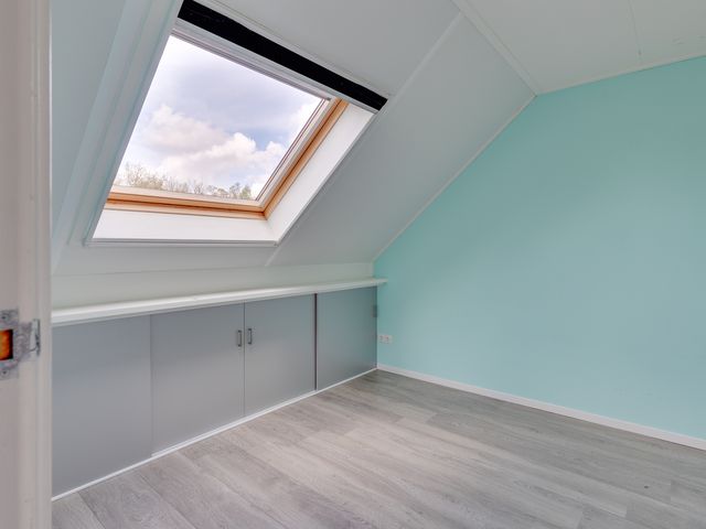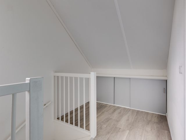 Tweede verdieping: Via vaste trap bereikbare overloop met toegang tot 4e slaapkamer en zolder-/bergruimte. De 4e slaapkamer is voorzien van een dakraam en beschikt net als de overloop over een schuifkast achter de knieschotten. Op de zolder-/bergruimte bevindt zich een vaste kast met daarin de cv-ketel.
