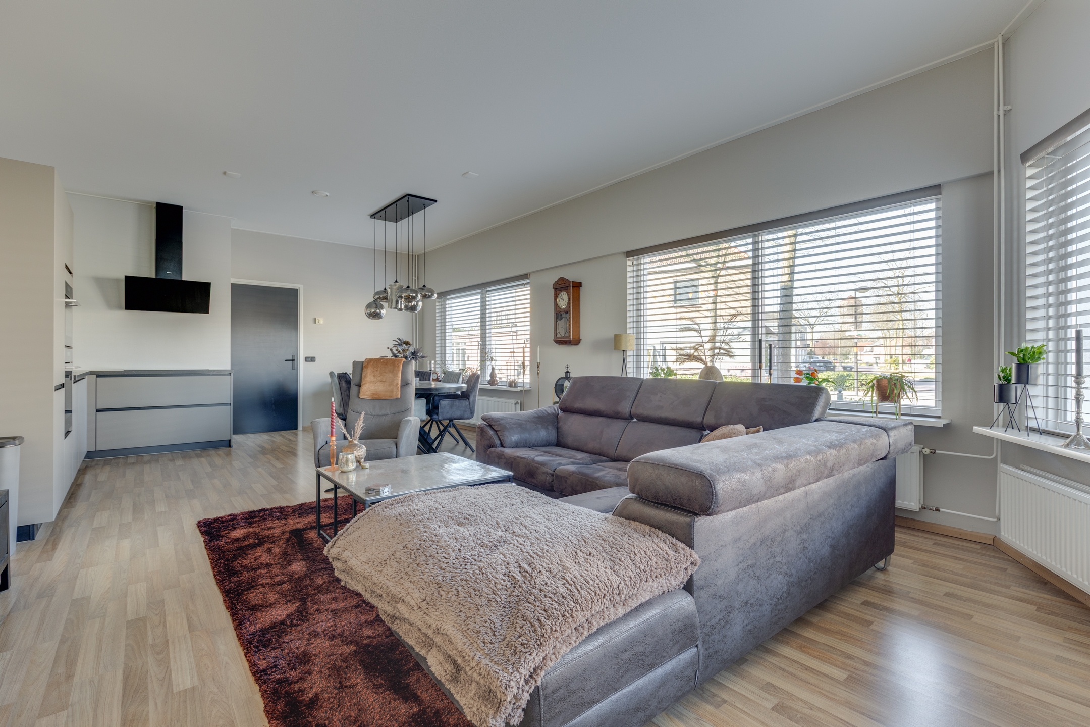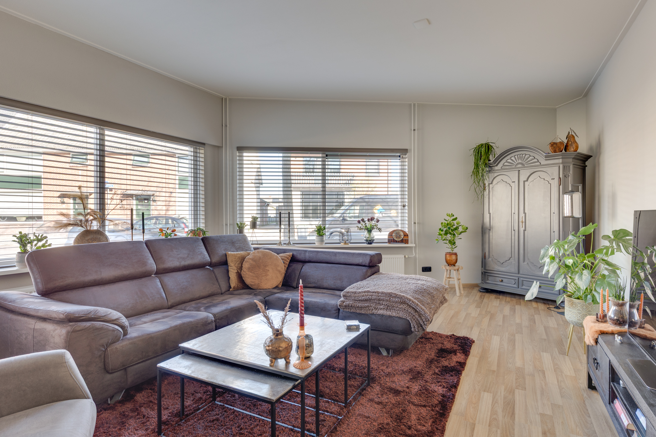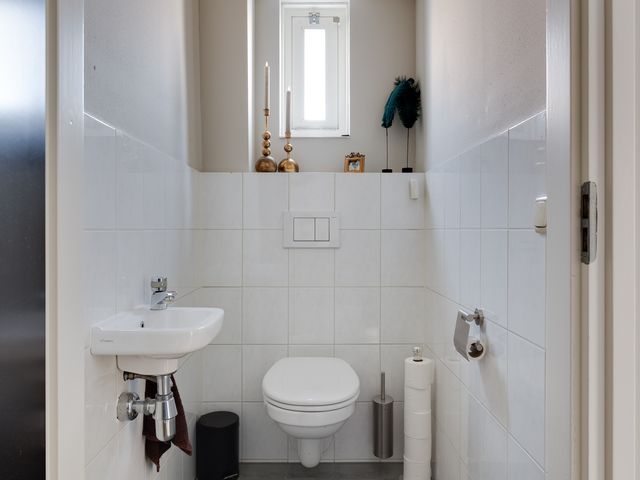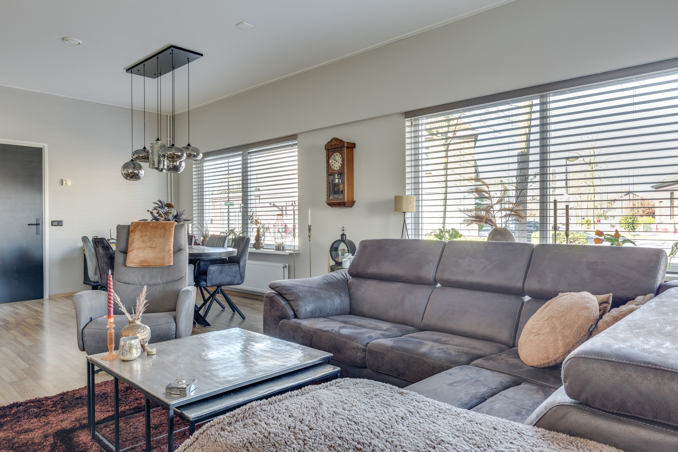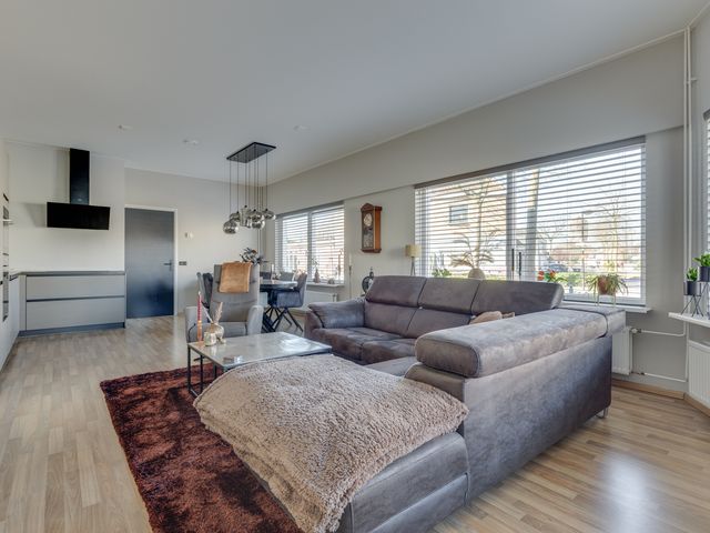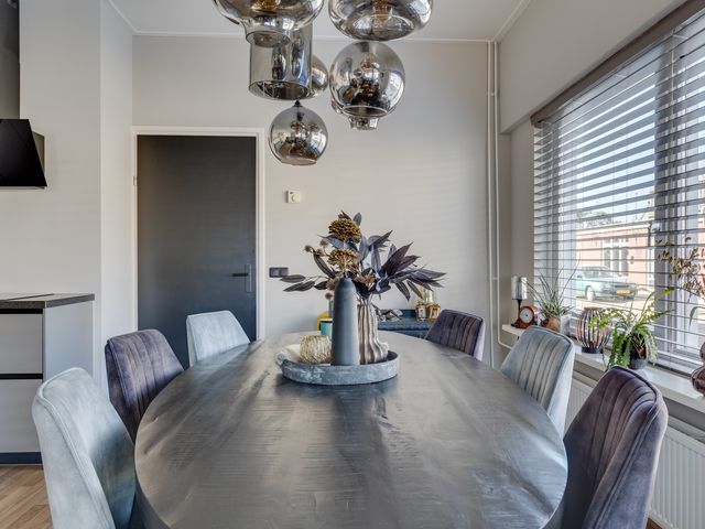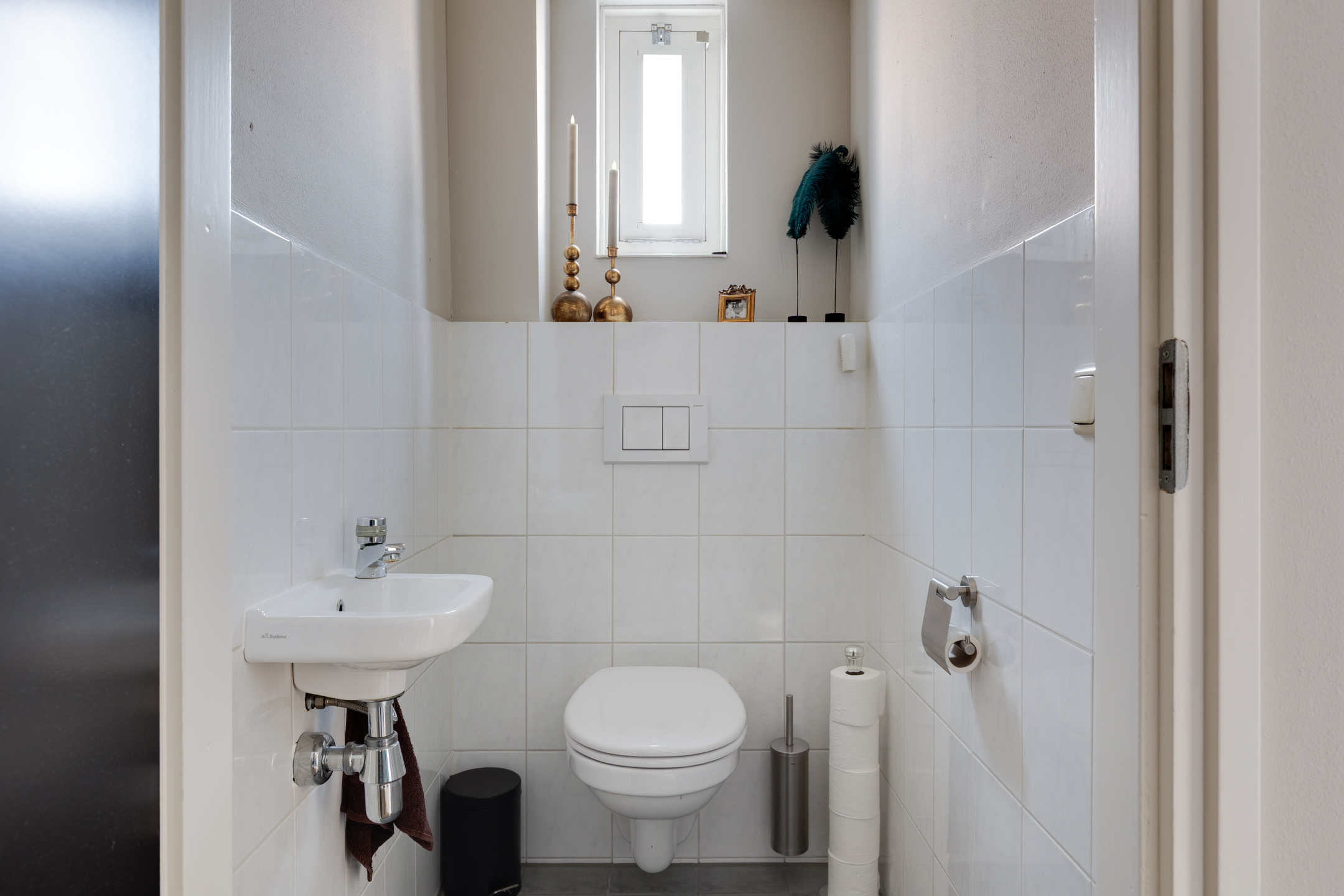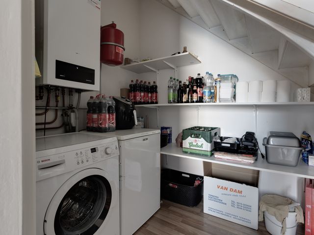 Begane grond: Entree via de voordeur in de hal. De hal is voorzien van een trapopgang naar de eerste verdieping, een toiletruimte met wandcloset en fonteintje, en de meterkast. Vanuit de hal is er toegang tot de (inpandige) berging met cv-opstelling en wasmachine-aansluiting. De hal biedt tevens toegang tot de woonkamer. Dankzij de ligging op de hoek van de straat geniet de woonkamer van veel natuurlijke lichtinval. De ruimte is afgewerkt met een nette parketvloer en biedt voldoende plaats voor een ruime eethoek. De moderne open keuken is voorzien van diverse inbouwapparatuur, waaronder een inductiekookplaat, vaatwasser en koelkast.