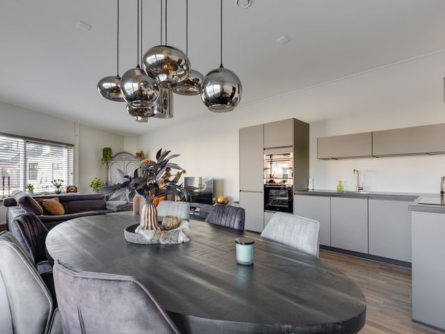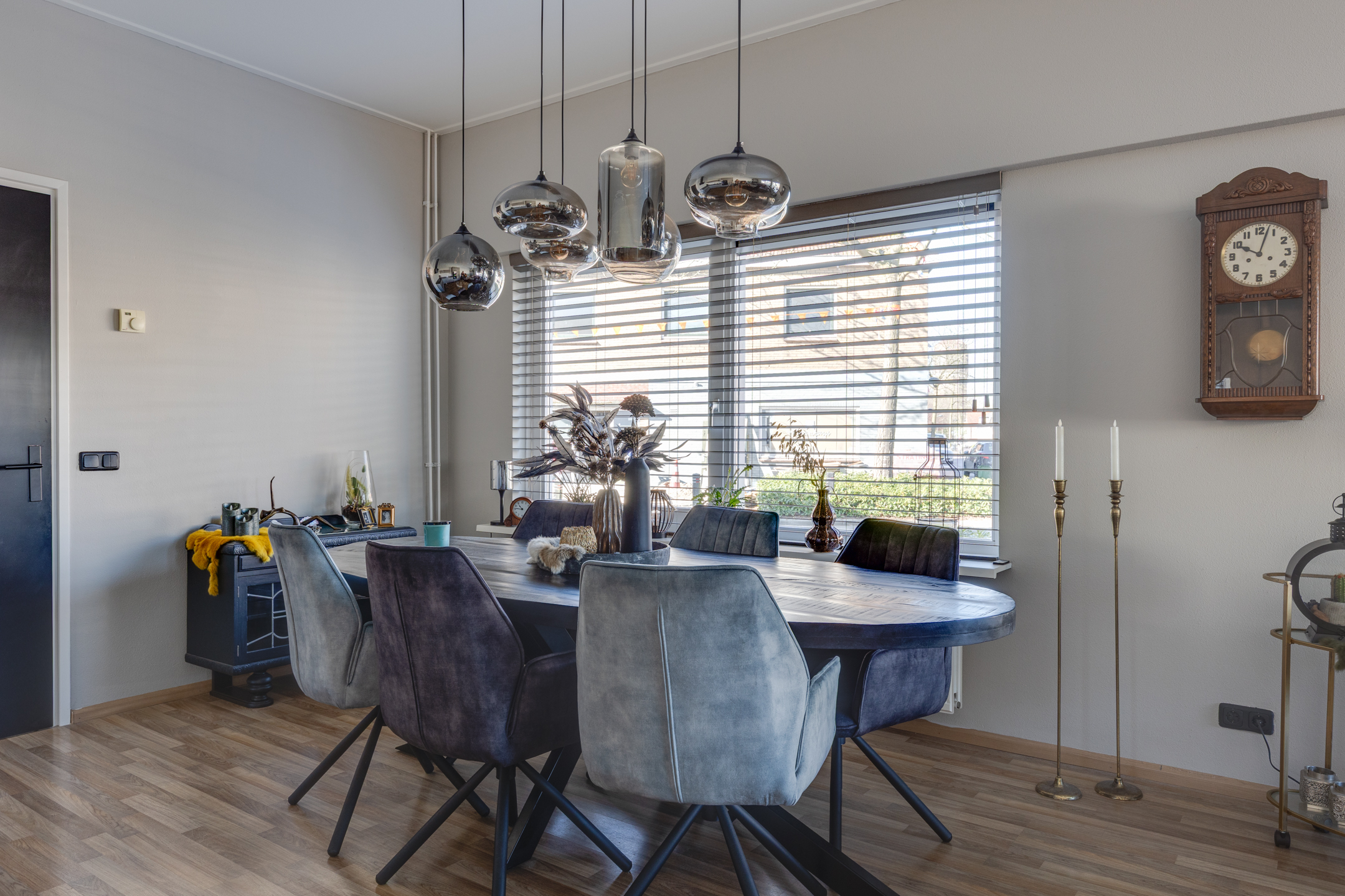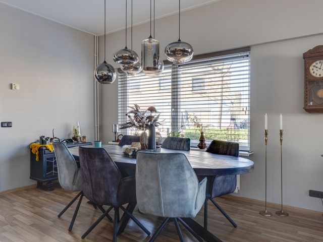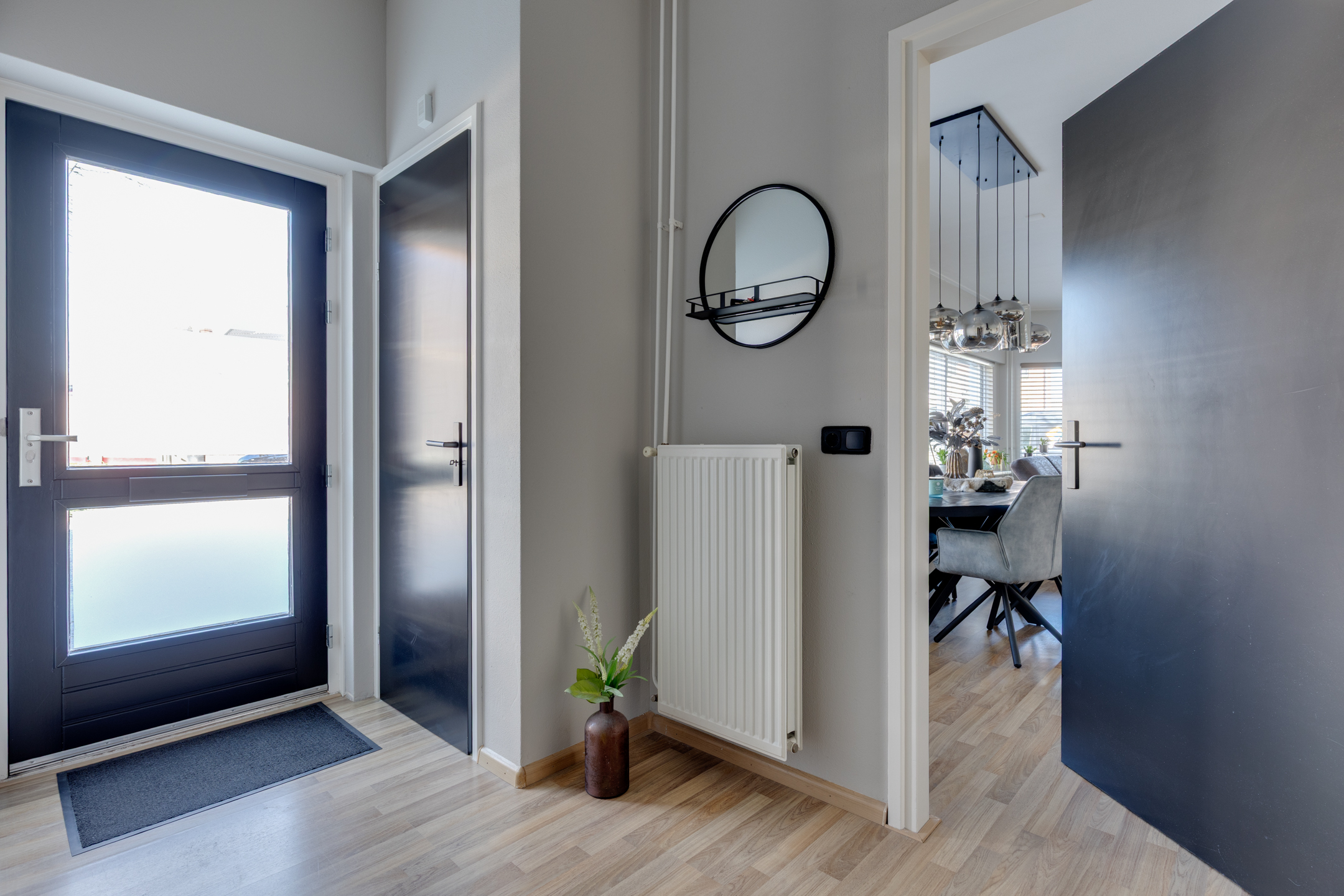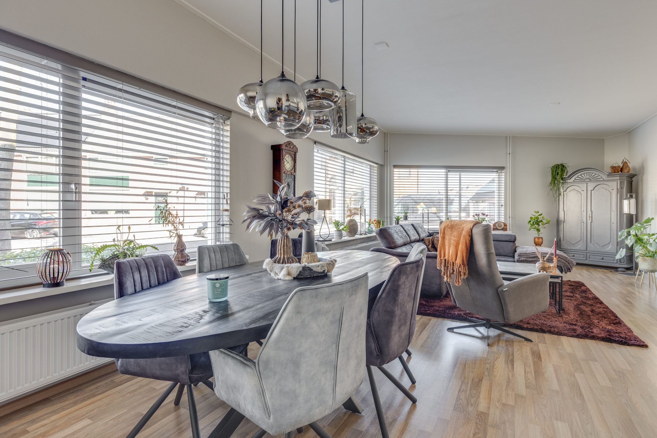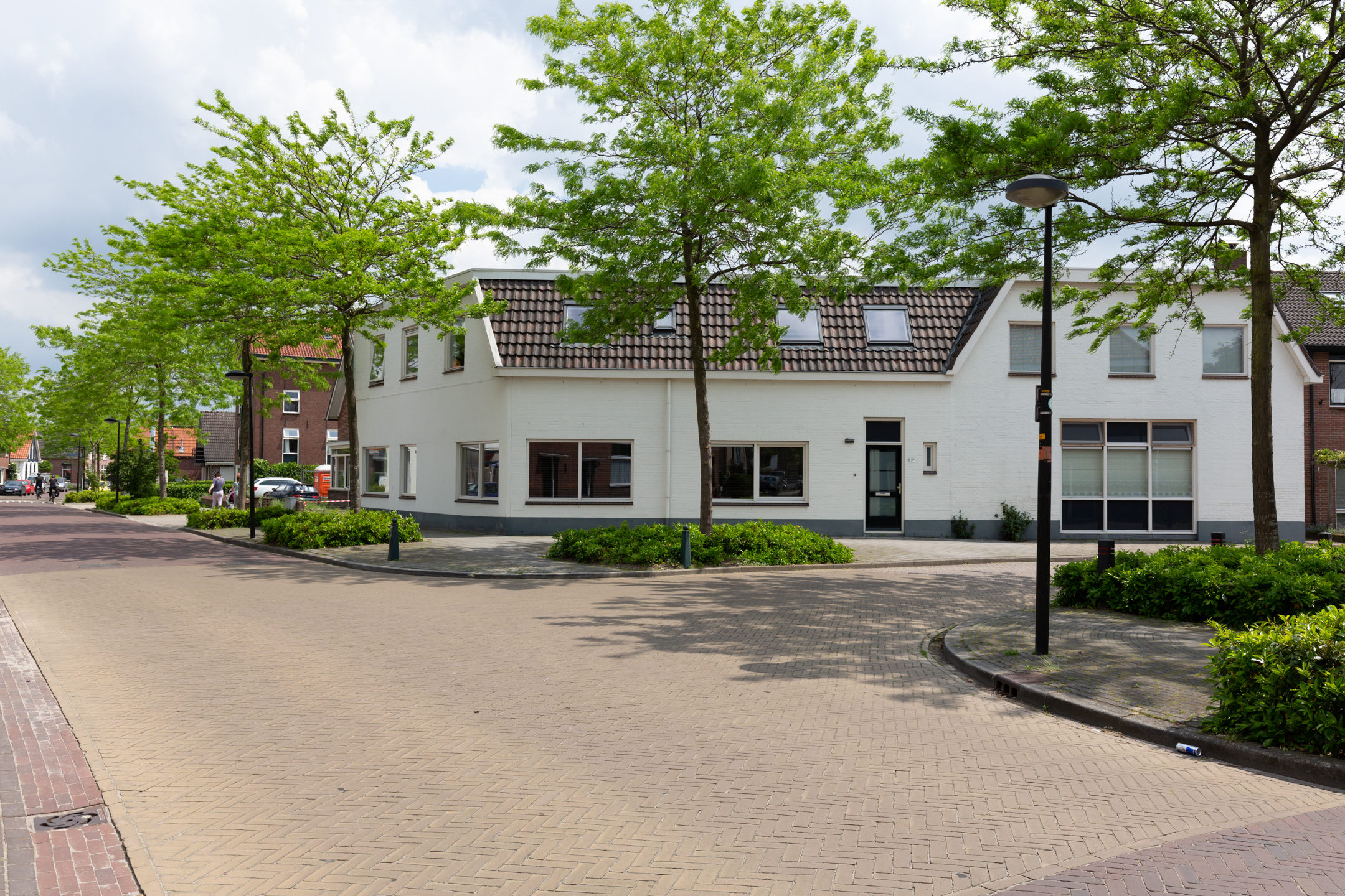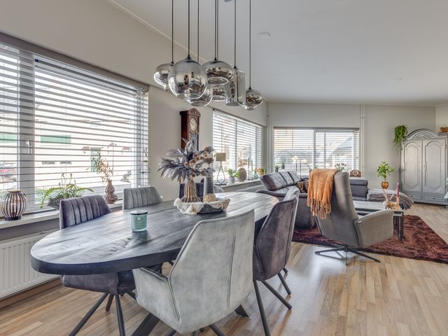 Begane grond: Entree via de voordeur in de hal. De hal is voorzien van een trapopgang naar de eerste verdieping, een toiletruimte met wandcloset en fonteintje, en de meterkast. Vanuit de hal is er toegang tot de (inpandige) berging met cv-opstelling en wasmachine-aansluiting. De hal biedt tevens toegang tot de woonkamer. Dankzij de ligging op de hoek van de straat geniet de woonkamer van veel natuurlijke lichtinval. De ruimte is afgewerkt met een nette parketvloer en biedt voldoende plaats voor een ruime eethoek. De moderne open keuken is voorzien van diverse inbouwapparatuur, waaronder een inductiekookplaat, vaatwasser en koelkast.