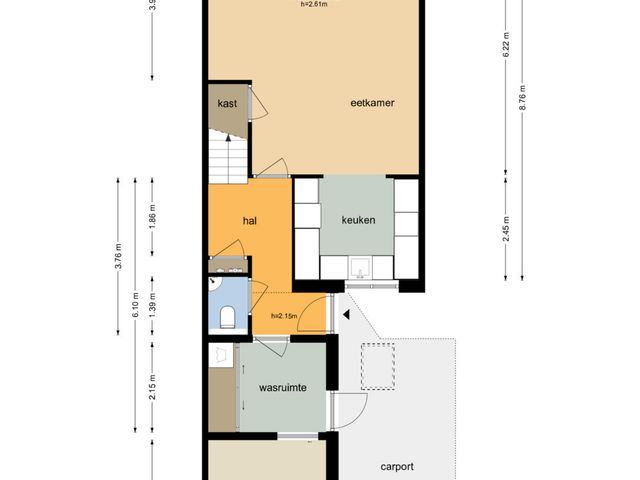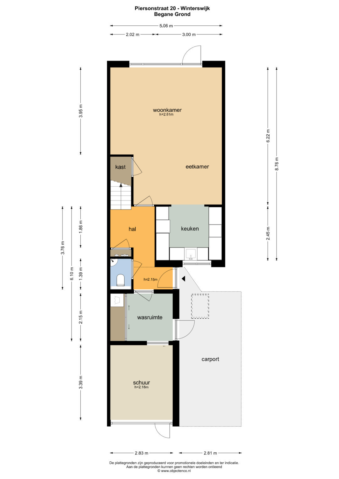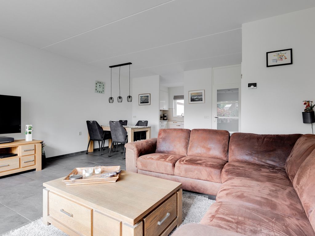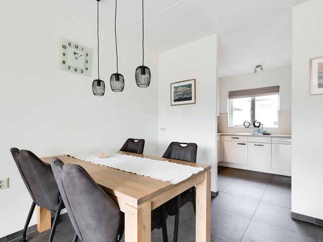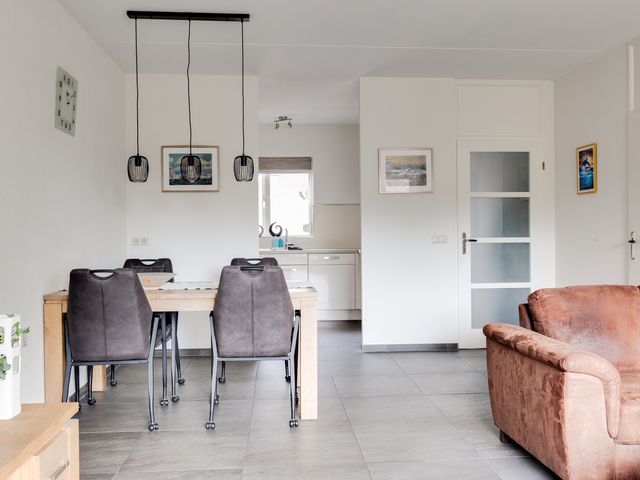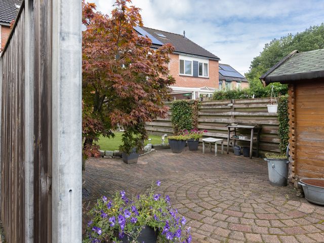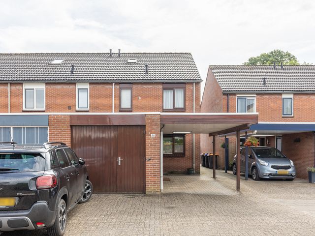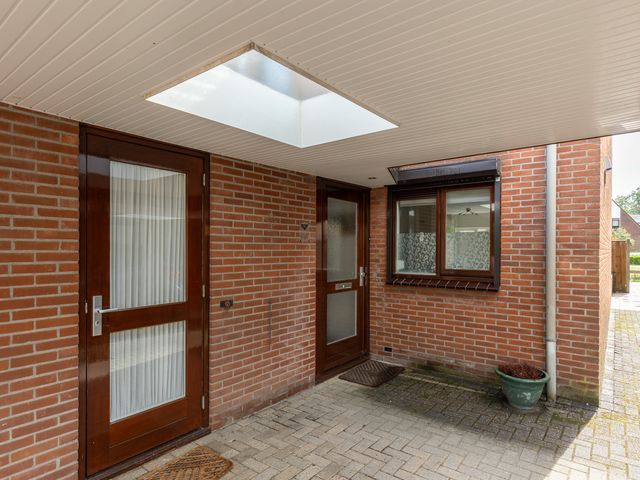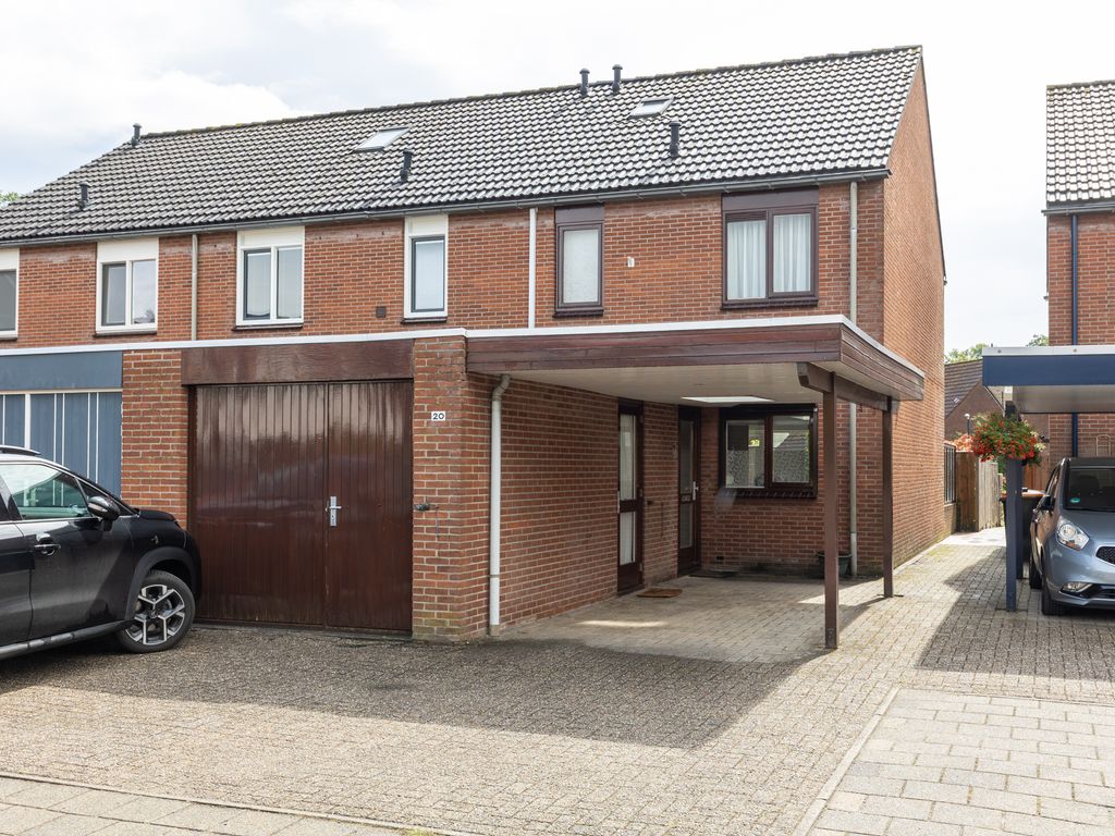 Begane grond: Binnenkomst via de carport (welke is voorzien van een lichtkoepel) aan de voorzijde van de woning. Entree/hal met toegang tot de toiletruimte met wandcloset en fonteintje, meterkast en trapopgang naar de eerste verdieping. Ook de woonkamer is toegankelijk via de centrale hal. De woonkamer met zit- en eethoek is eveneens voorzien van vaste kastruimte onder de trapopgang. Aansluitend aan de woonkamer bevindt zich de moderne open keuken welke voorzien van diverse inbouwapparatuur, waaronder een oven, vaatwasser (uit 2023) en inductiekookplaat. Zowel de keuken, de woon-/eetkamer als de hal zijn voorzien van vloerverwarming. De woon-/eetkamer biedt toegang tot de achtertuin, welke is gelegen op het zuidoosten en beschikt over een vrijstaande houten berging/tuinhuisje.