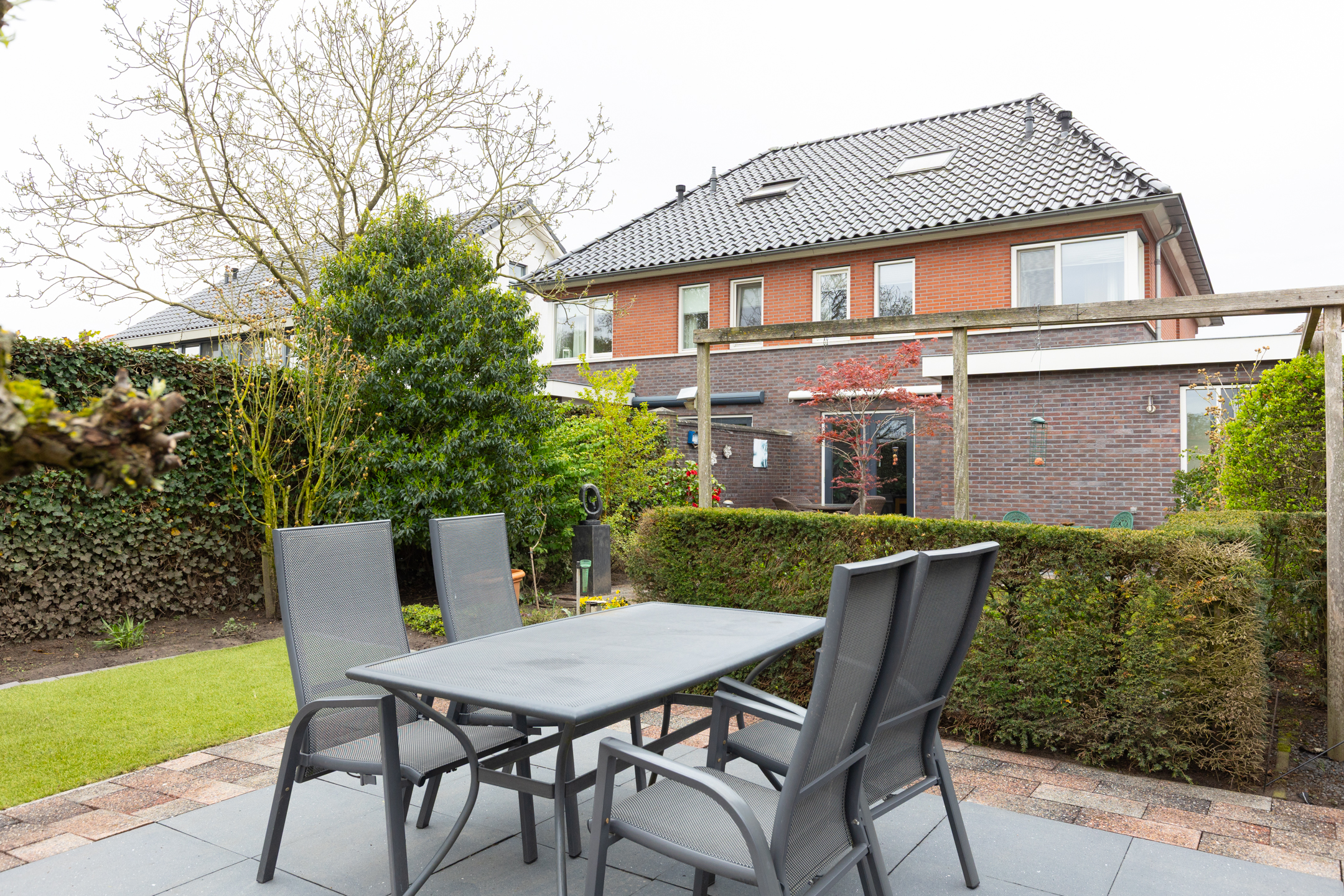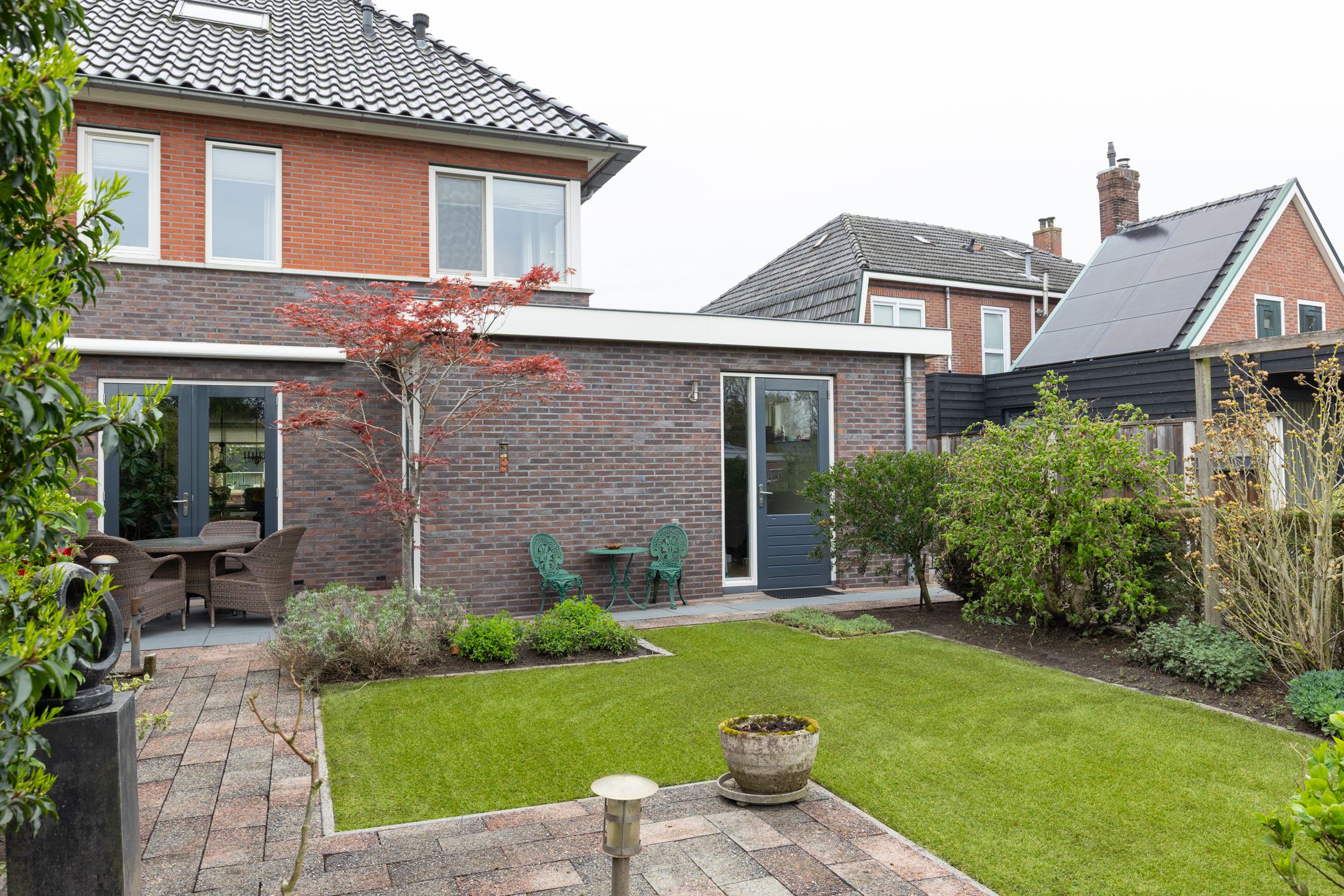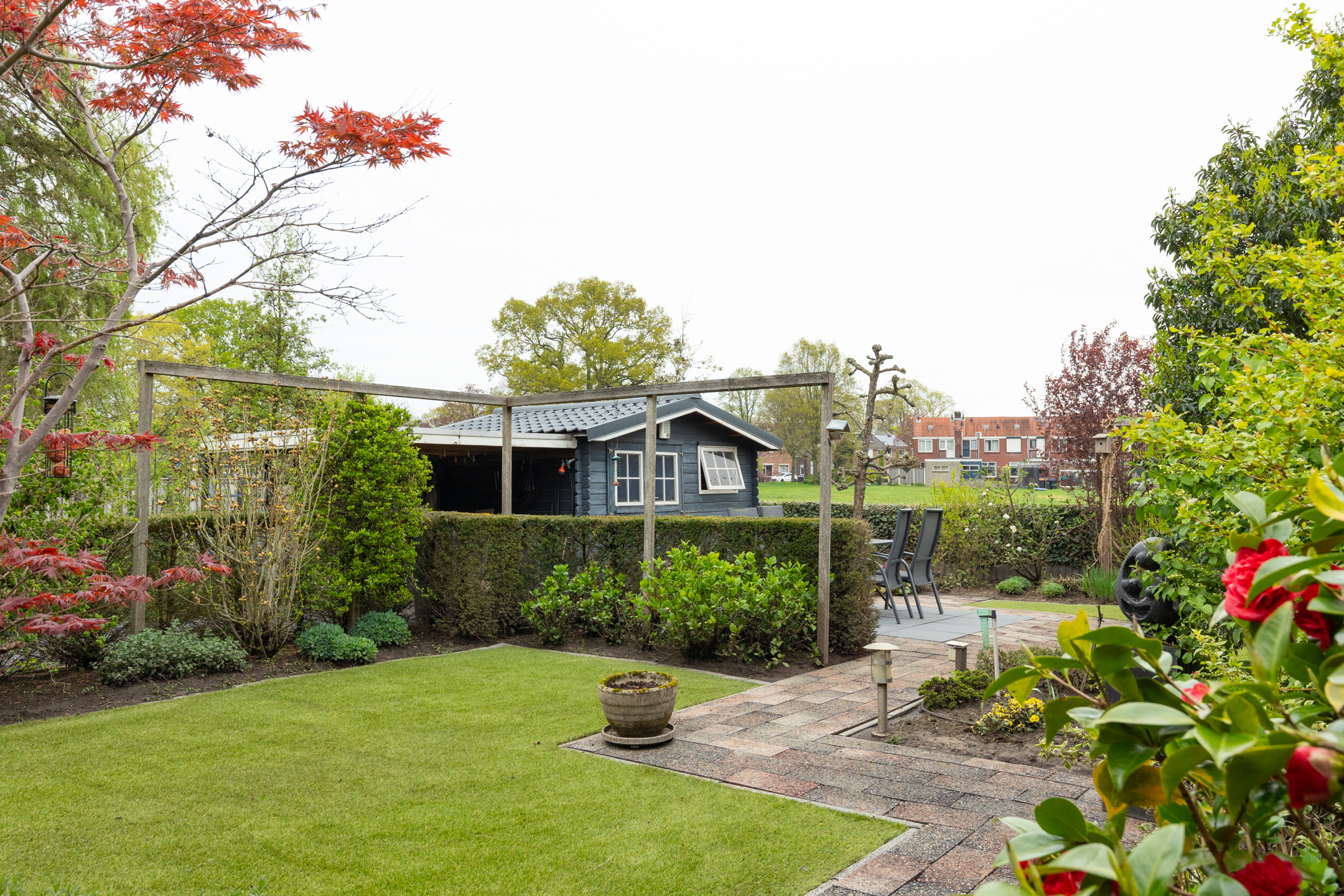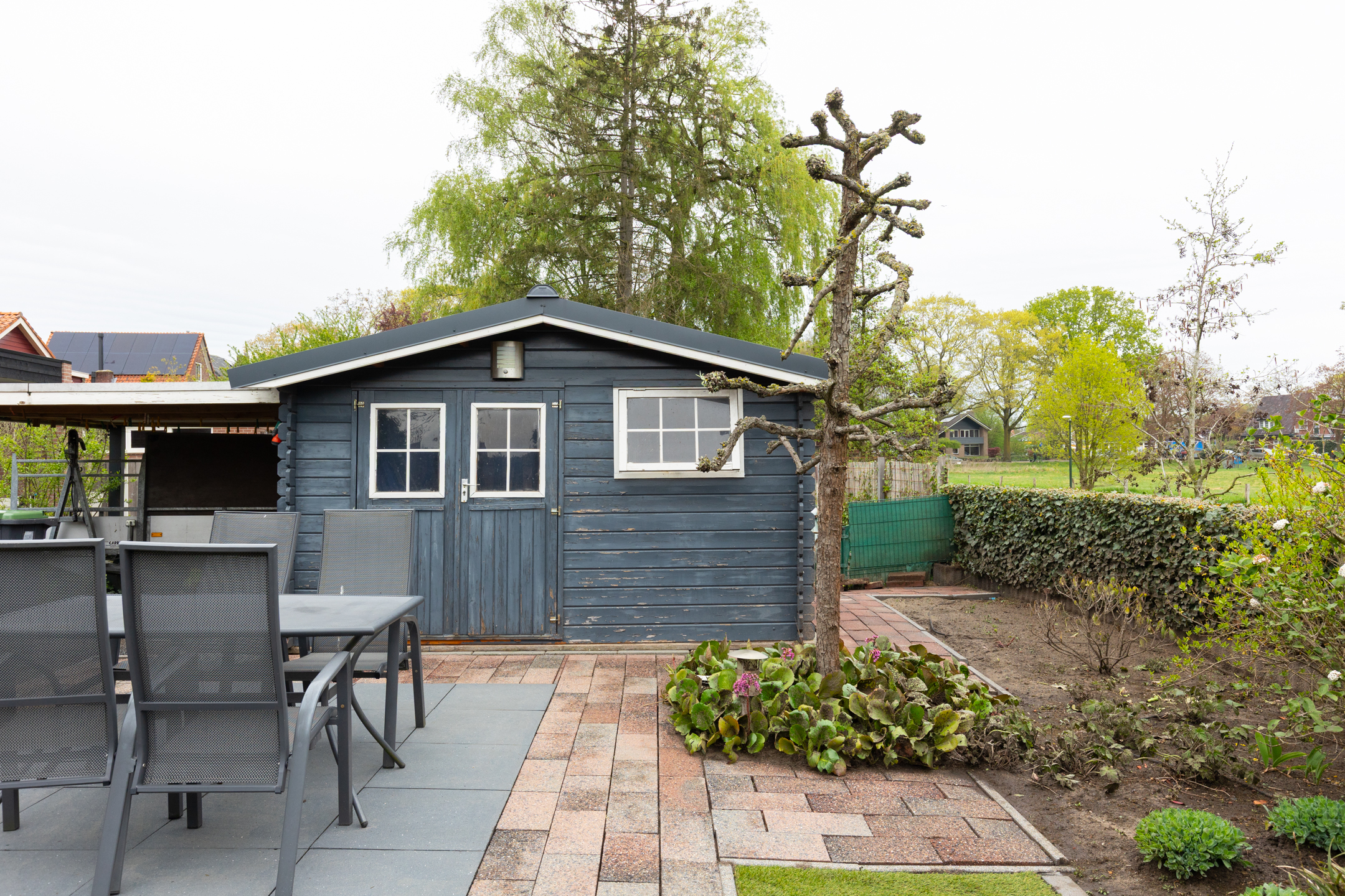 De achtertuin is keurig aangelegd en beschikt over 2 terrassen en een houten tuinhuisje. Aan de voorzijde is er ruimte voor 2 auto’s op eigen terrein.