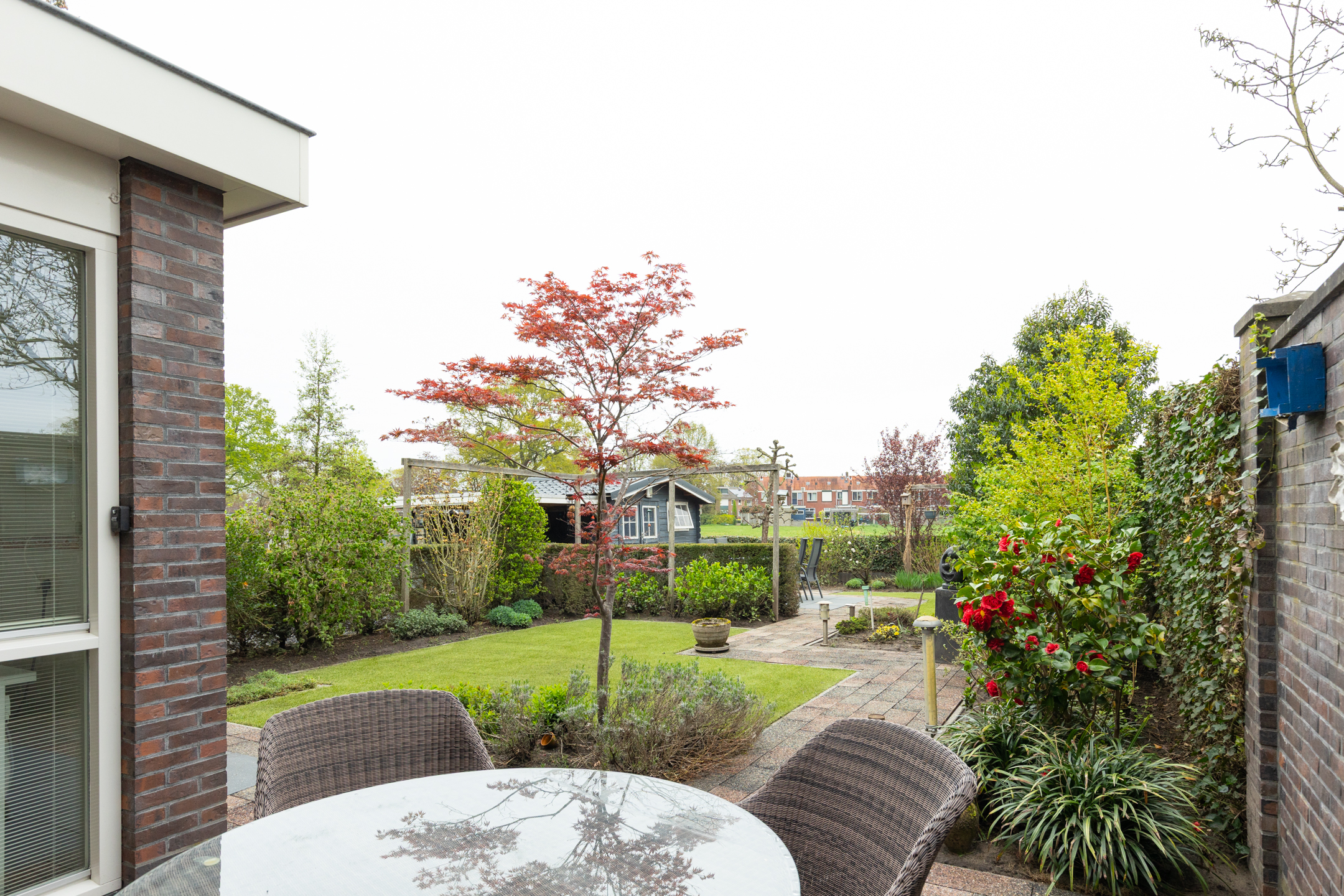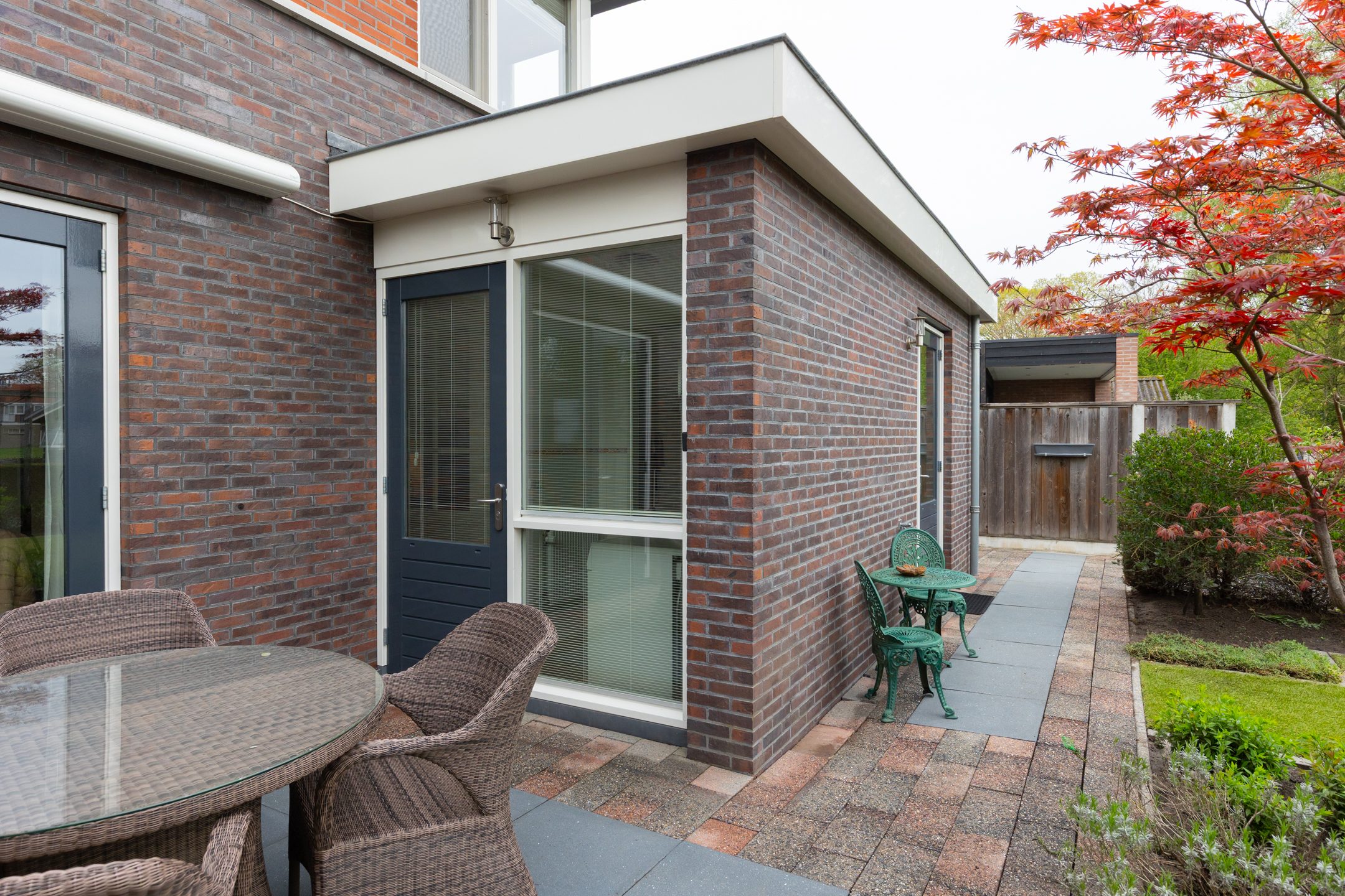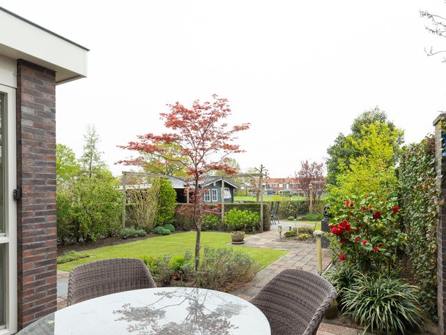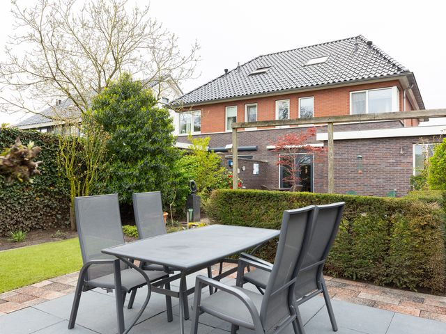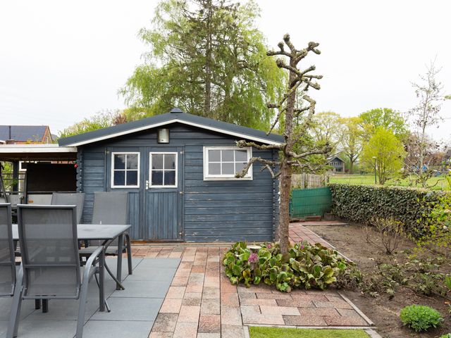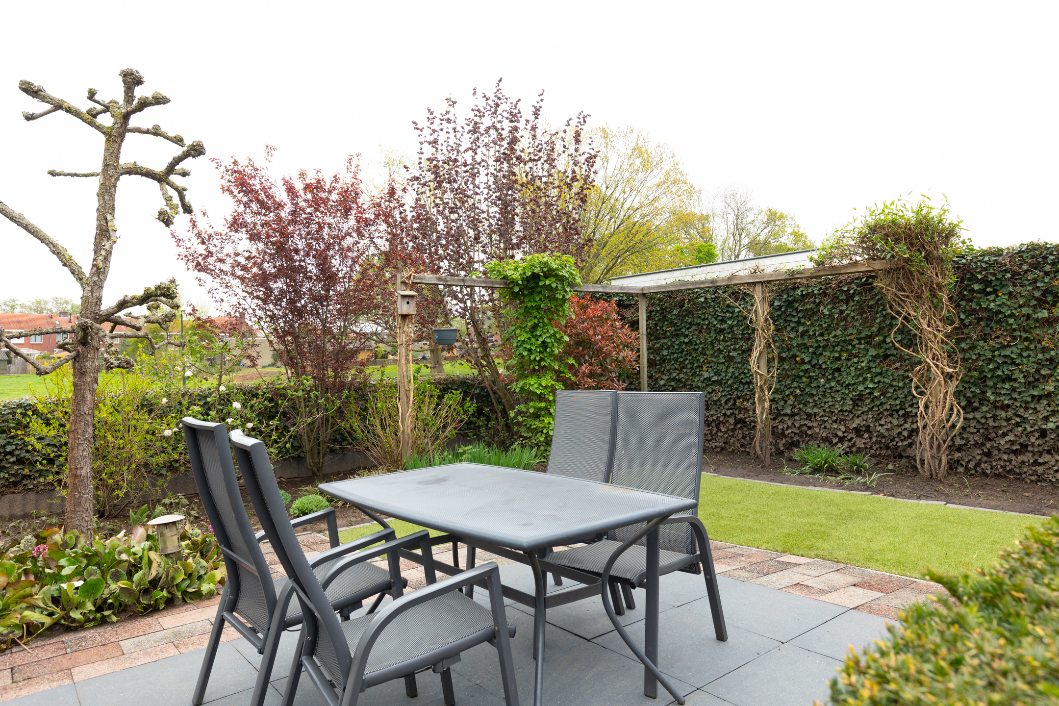 De achtertuin is keurig aangelegd en beschikt over 2 terrassen en een houten tuinhuisje. Aan de voorzijde is er ruimte voor 2 auto’s op eigen terrein.