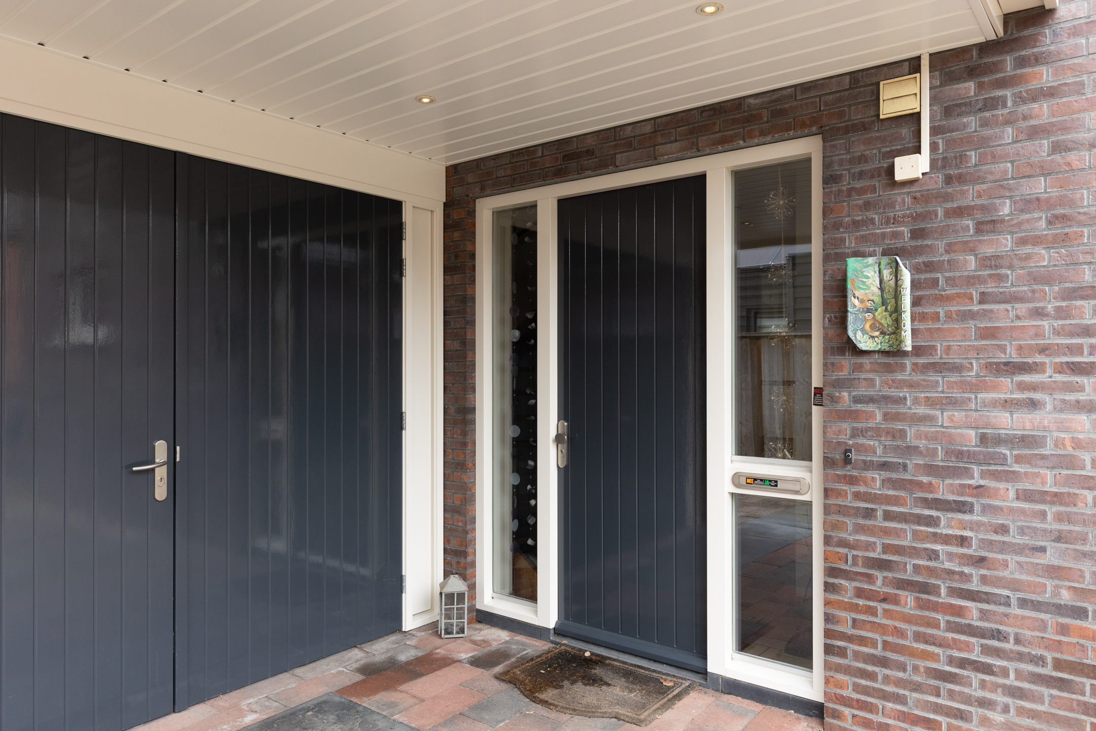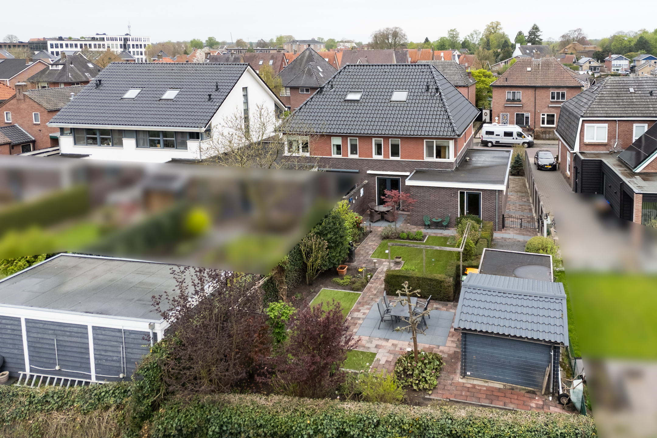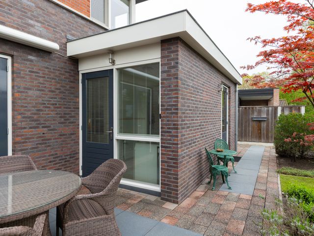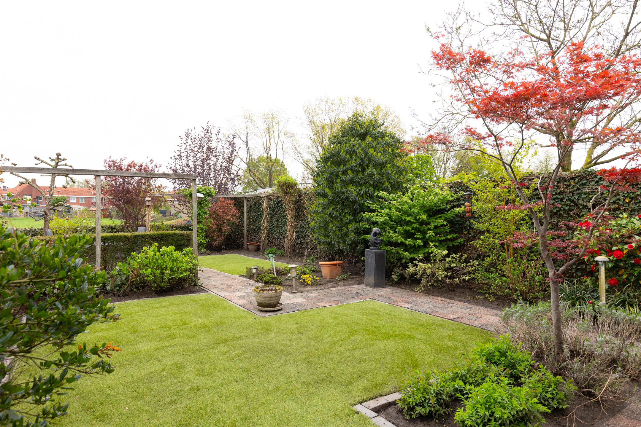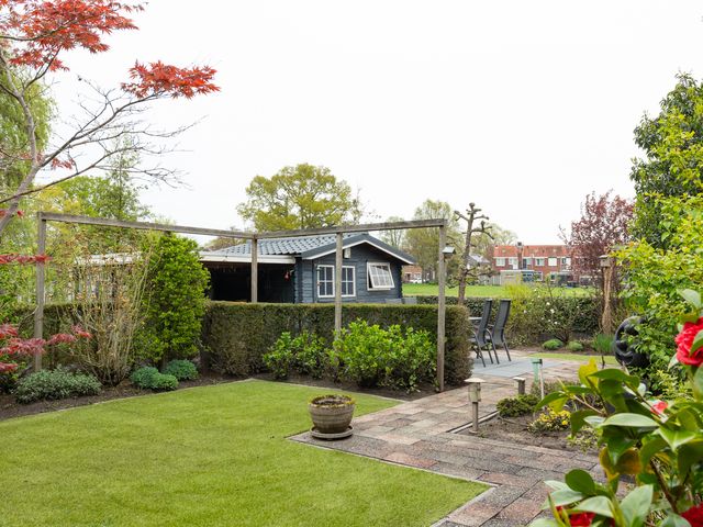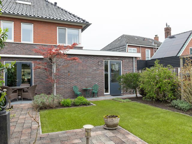 De achtertuin is keurig aangelegd en beschikt over 2 terrassen en een houten tuinhuisje. Aan de voorzijde is er ruimte voor 2 auto’s op eigen terrein.