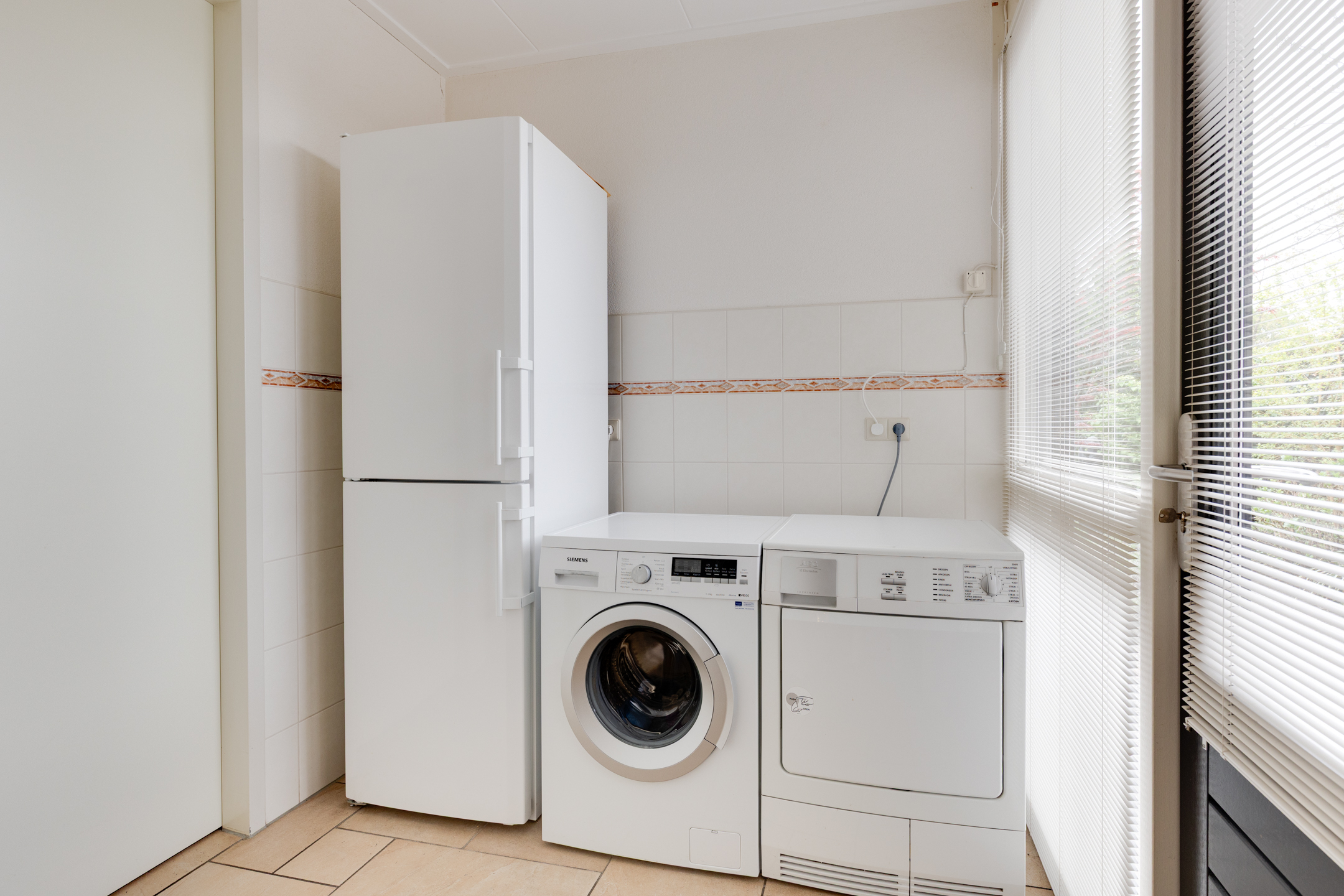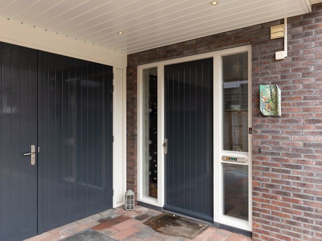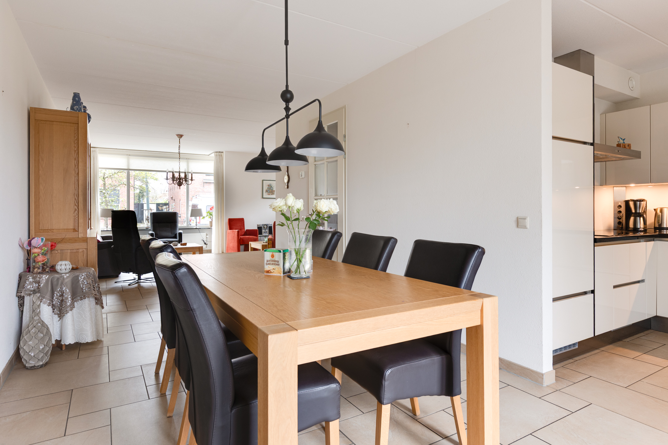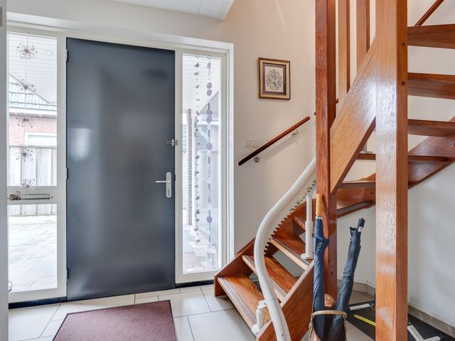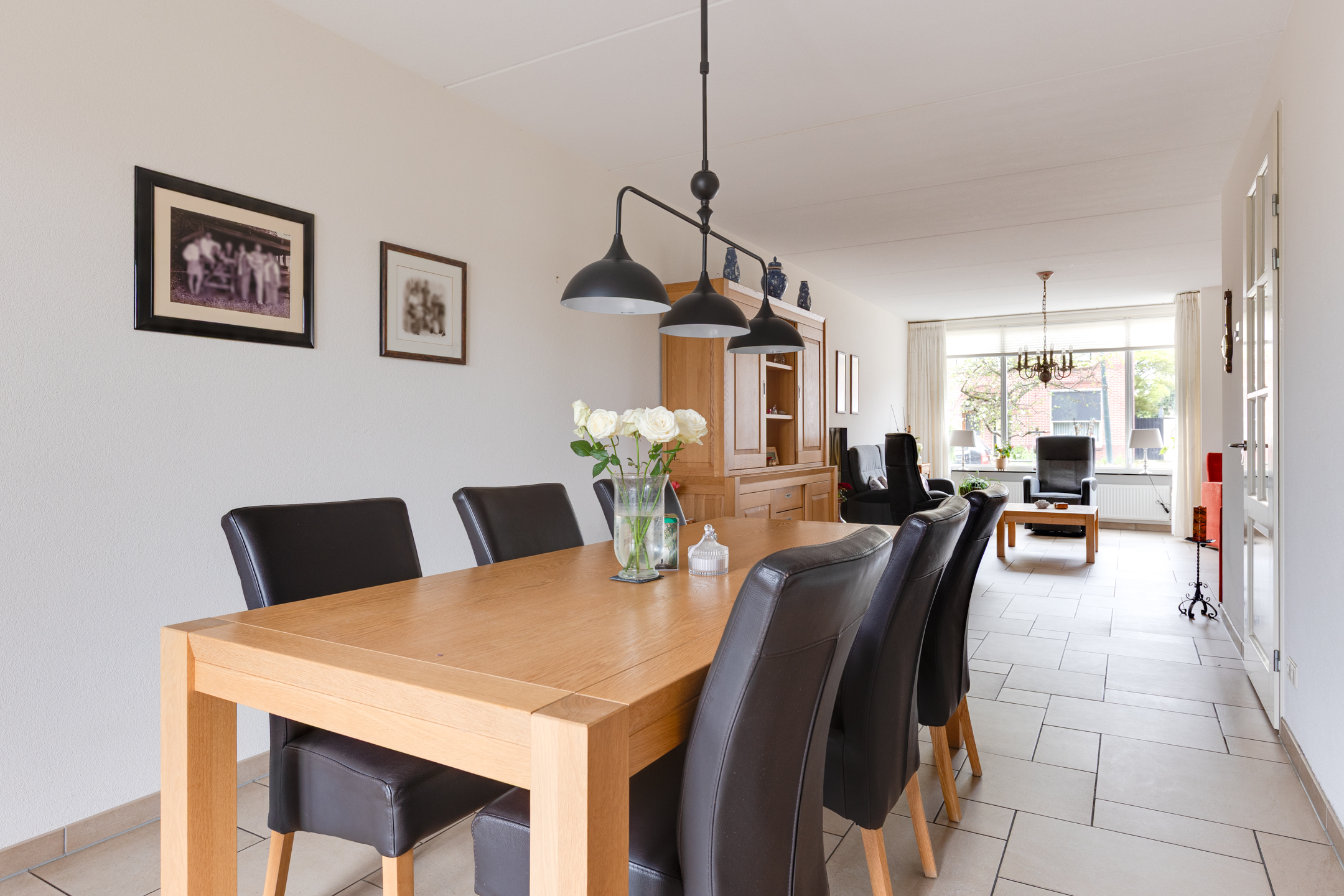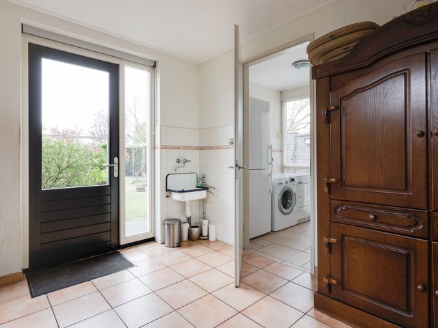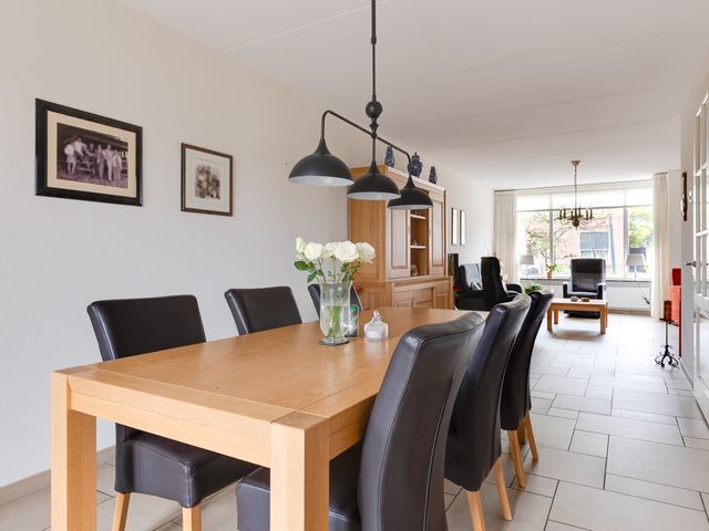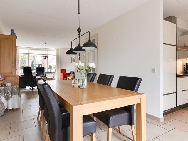 Begane grond: Via een overdekte entree is de woning via de voordeur toegankelijk. In de hal bevinden zich de trapopgang naar de eerste verdieping, de meterkast en de toiletruimte met wandcloset en fonteintje. Vanuit de hal is er toegang tot de ruime, L-vormige woon-/eetkamer. Aan de voorzijde is een sfeervolle erker gerealiseerd, terwijl aan de achterzijde openslaande deuren toegang bieden tot de achtertuin. De open keuken is voorzien van diverse inbouwapparatuur waaronder een vaatwasser, koelkast en oven. De keuken biedt toegang tot de bijkeuken met aansluitingen voor wasmachine en -droger. Vanuit de bijkeuken is er toegang tot zowel de achtertuin als de berging/garage. De berging/garage beschikt over openslaande deuren aan de voorzijde en een extra deur naar de achtertuin.