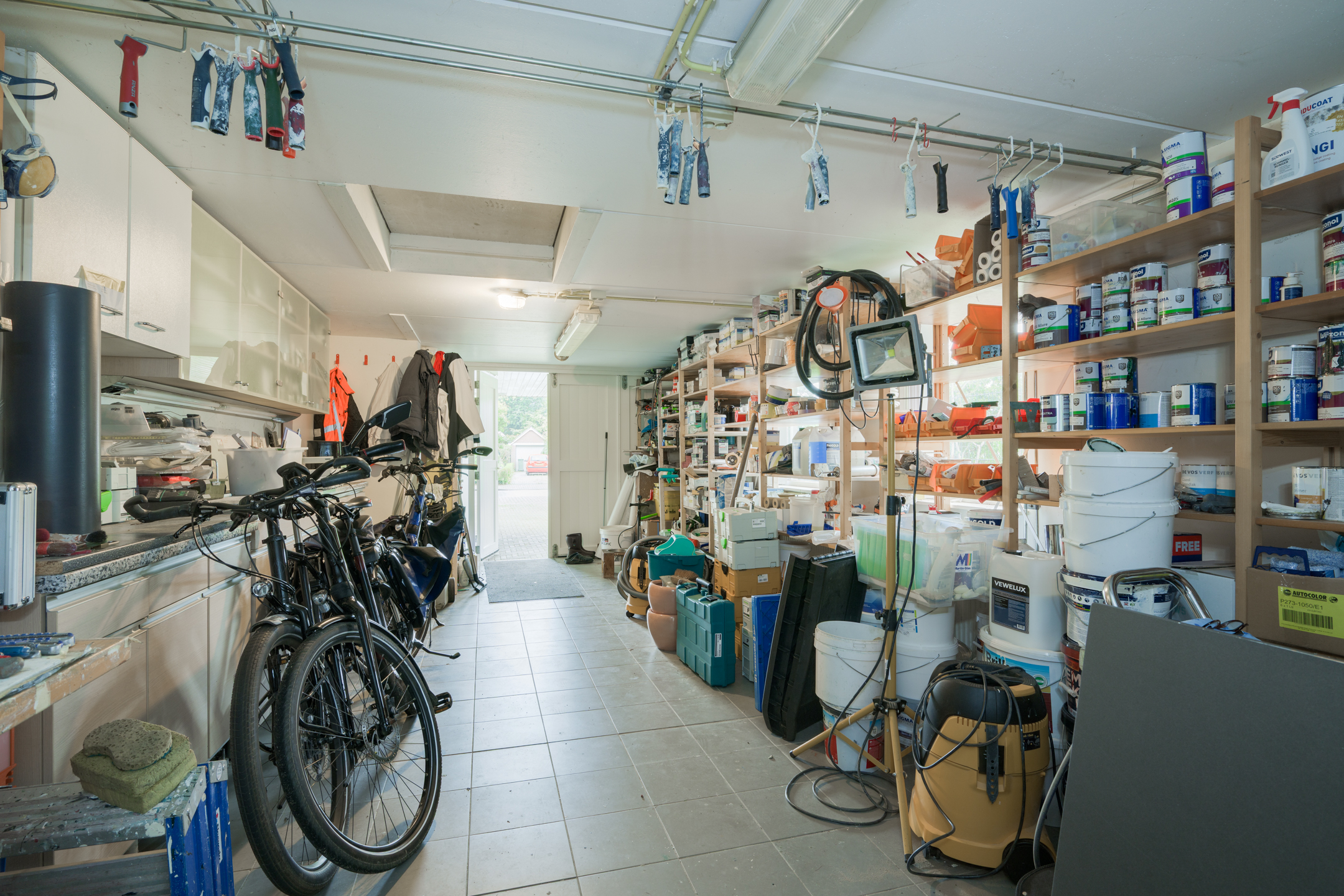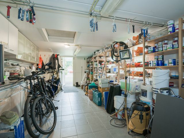De aangebouwde garage is een multifunctionele ruimte met openslaande deuren, een aparte loopdeur, plavuizen vloer en keukenblok. Het achterste gedeelte van deze grote garage/berging biedt veel daglicht door de ramen in de achtergevel en het dakraam. In deze ruimte bevindt zich een luik met vlizotrap naar de bovengelegen vliering. Bovendien beschikt de garage over een eigen kelder, ideaal voor opslag of als wijnkelder.