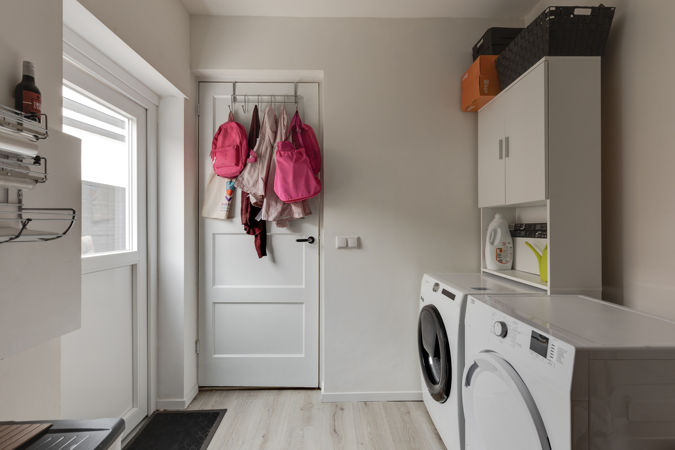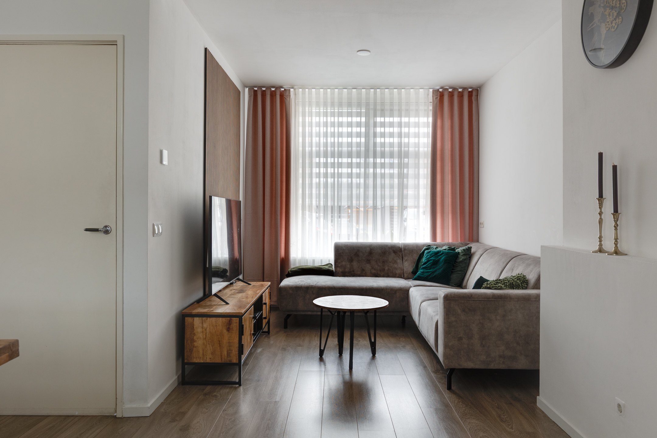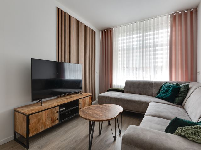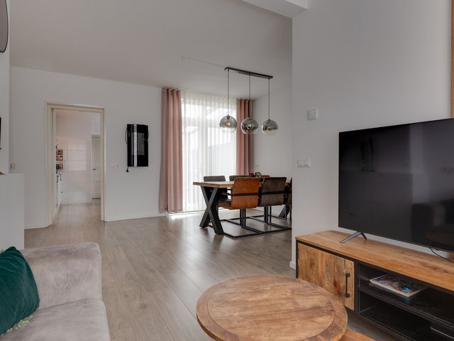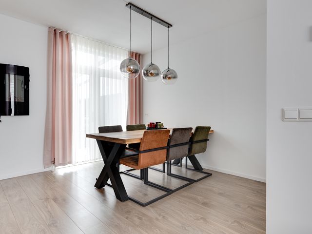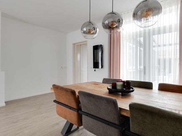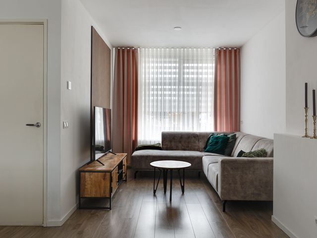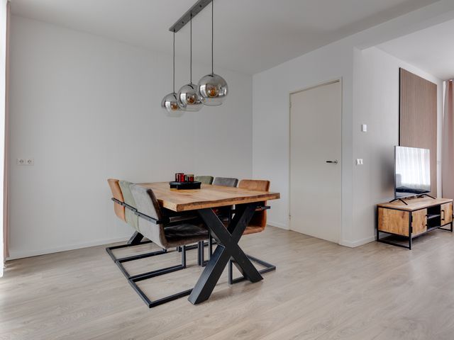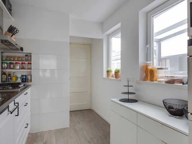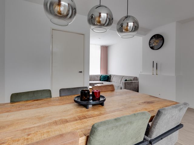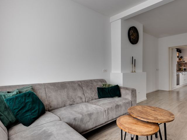 Bij binnenkomst vallen de gestucte wanden en plafonds direct op, wat zorgt voor een frisse en moderne uitstraling. De L-vormige woonkamer is voorzien van openslaande deuren naar het overdekte terras. Een aantal authentieke paneeldeuren in de woning herinnert aan de bouwperiode en geeft de woning extra karakter en sfeer.
