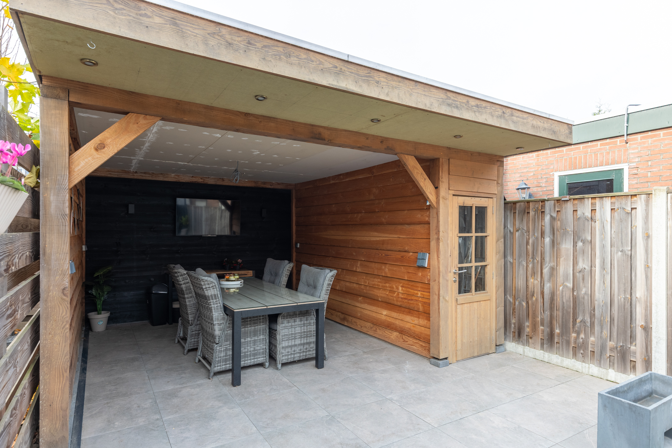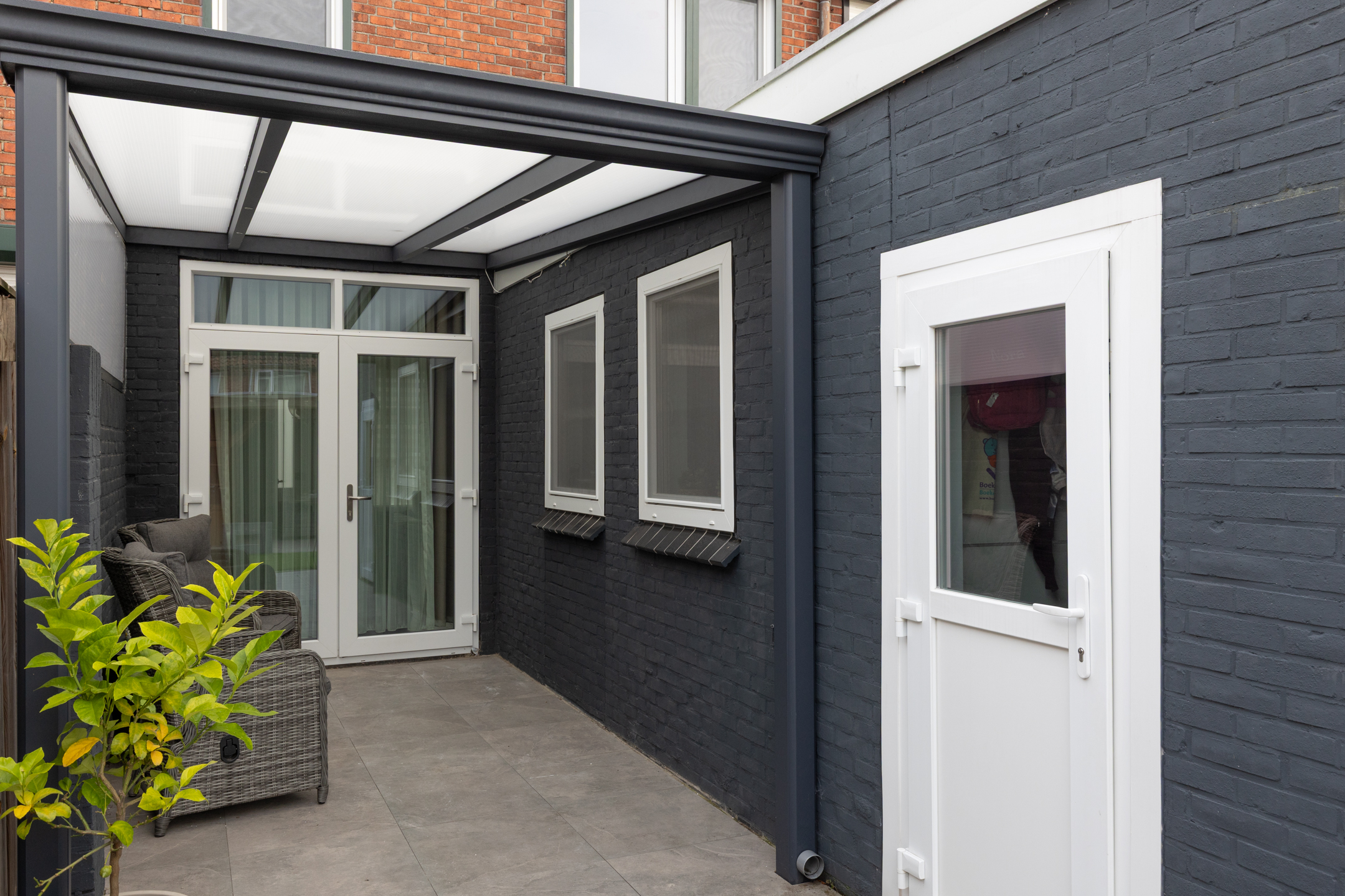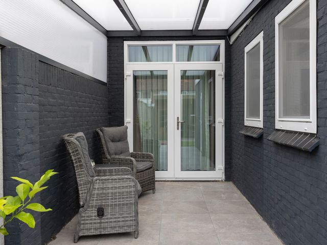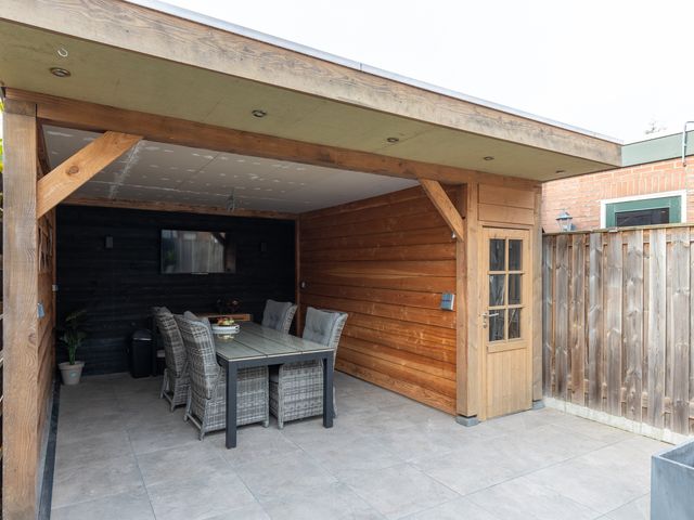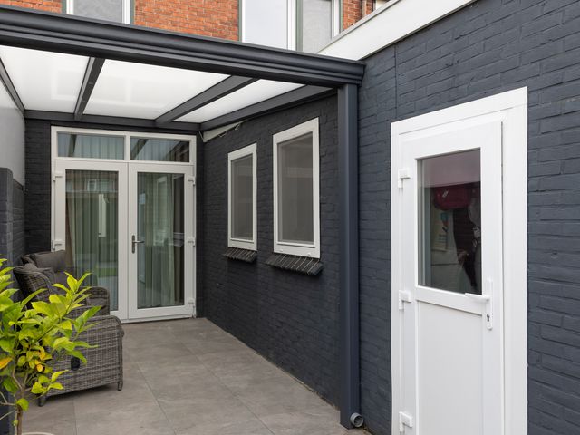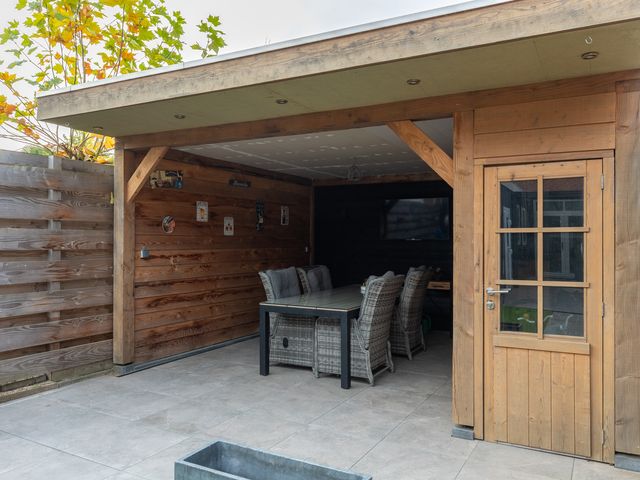 De achtertuin is gelegen op het zonnige zuidwesten. Dankzij het moderne overdekte terras van zwart staal met glas kun je heerlijk beschut, in het verlengde van de woonkamer, ongeacht het weer comfortabel buiten zitten!