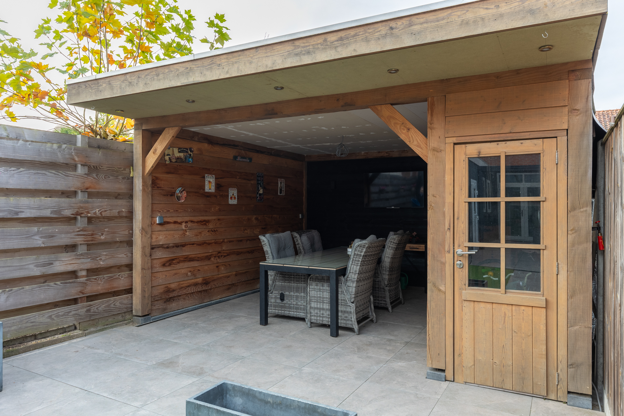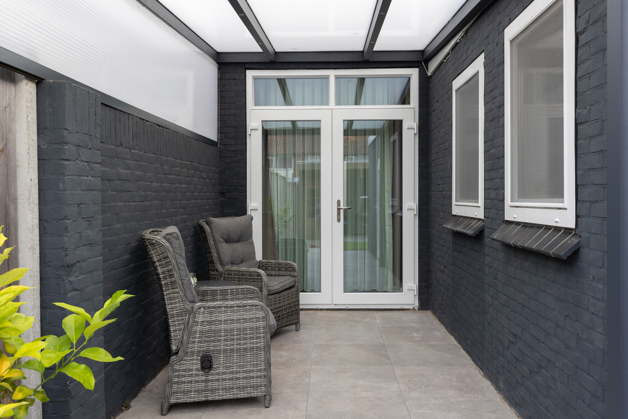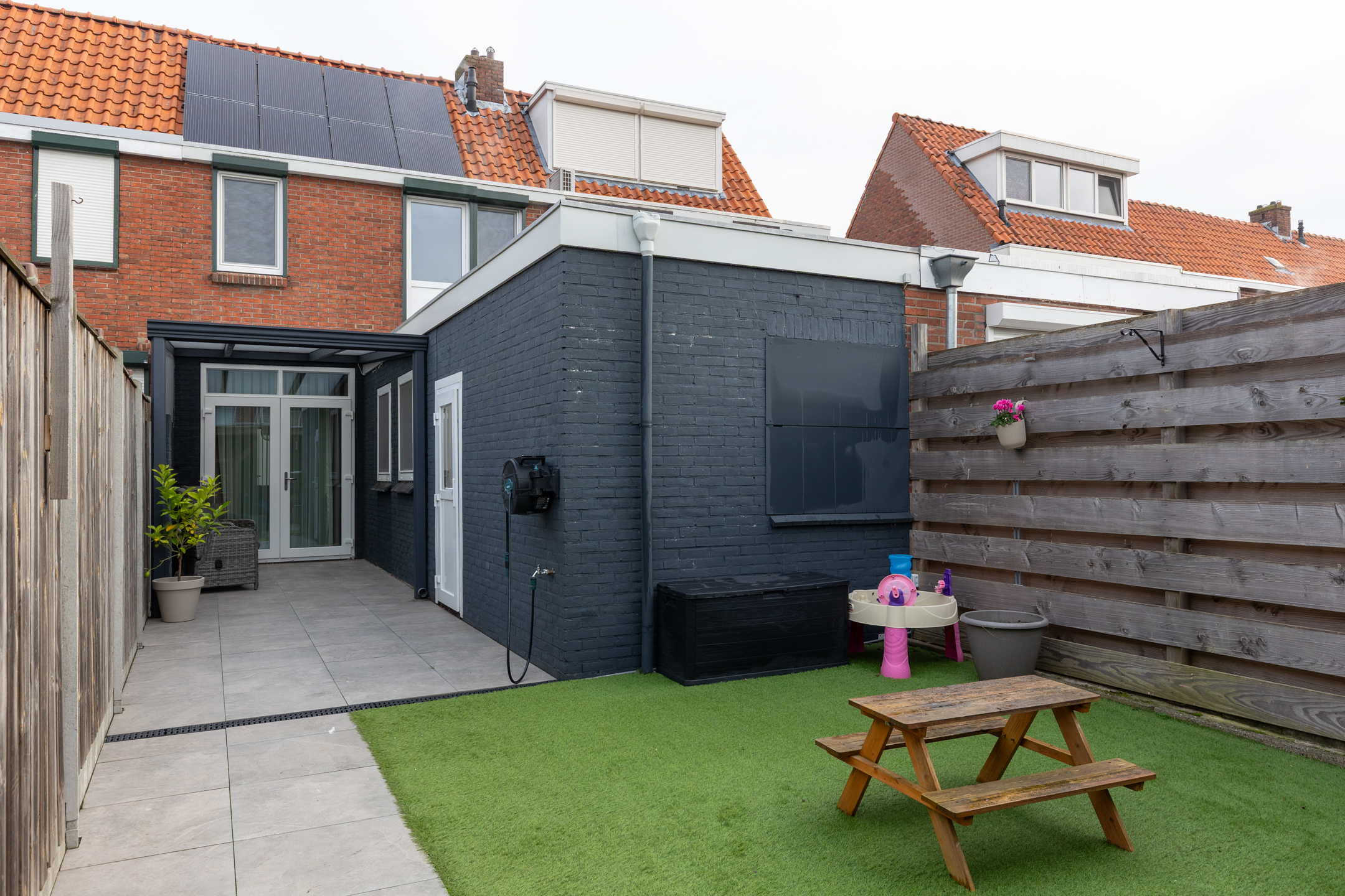 De achtertuin is gelegen op het zonnige zuidwesten. Dankzij het moderne overdekte terras van zwart staal met glas kun je heerlijk beschut, in het verlengde van de woonkamer, ongeacht het weer comfortabel buiten zitten!