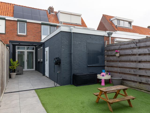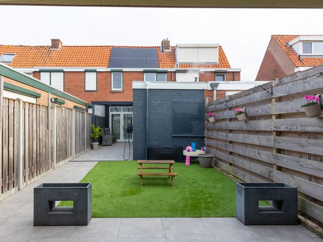 Achterin de tuin is recent een fraaie houten berging met overkapping gerealiseerd. De achtertuin is onderhoudsvrij aangelegd door bestrating met een moderne grote tegel en een stukje kunstgras. Het geheel is omheind middels een degelijke houten schutting.