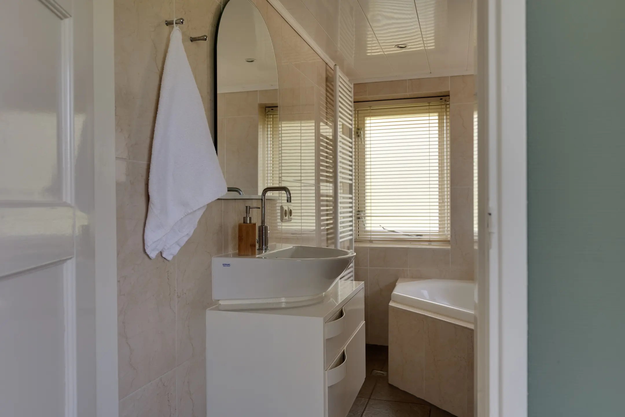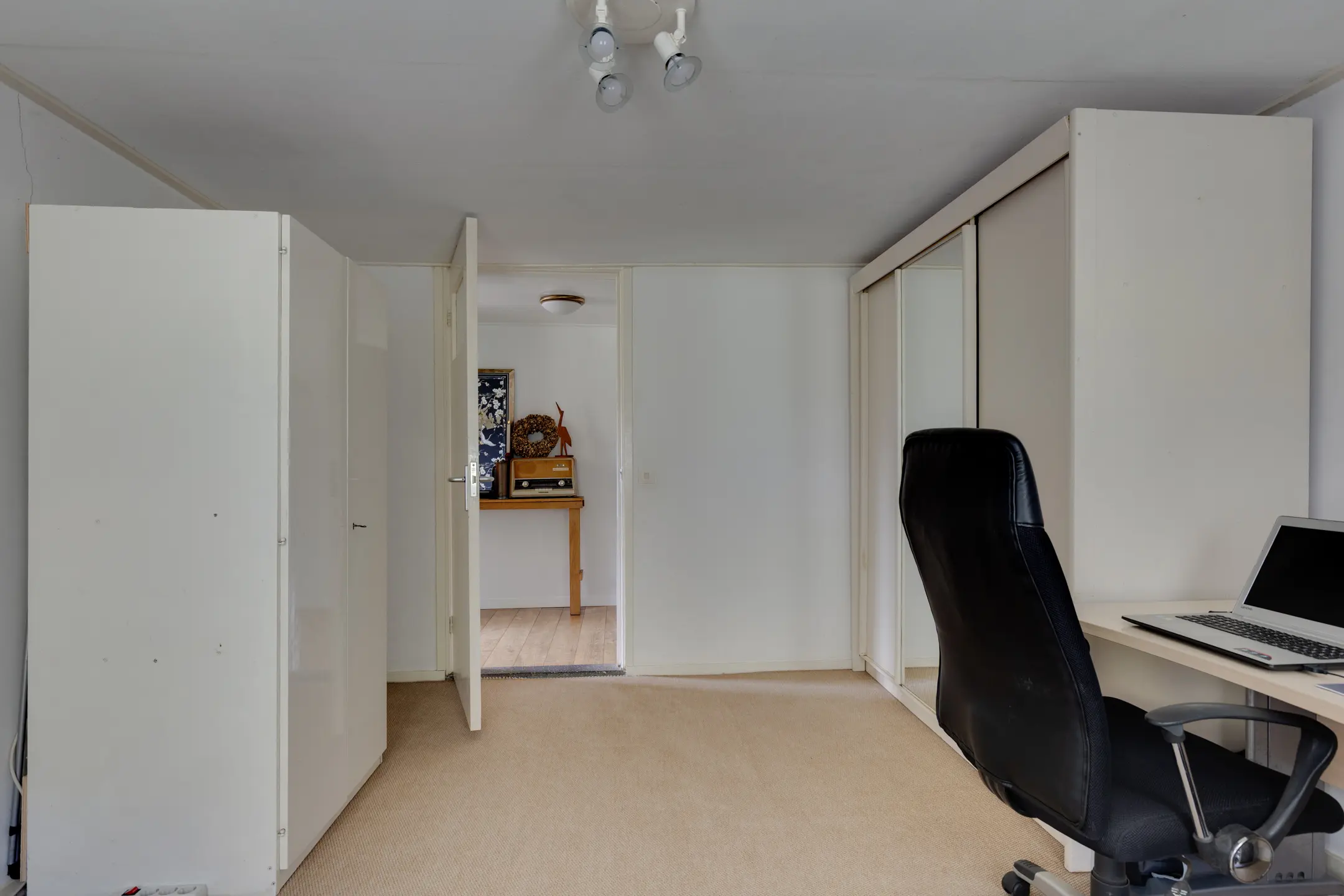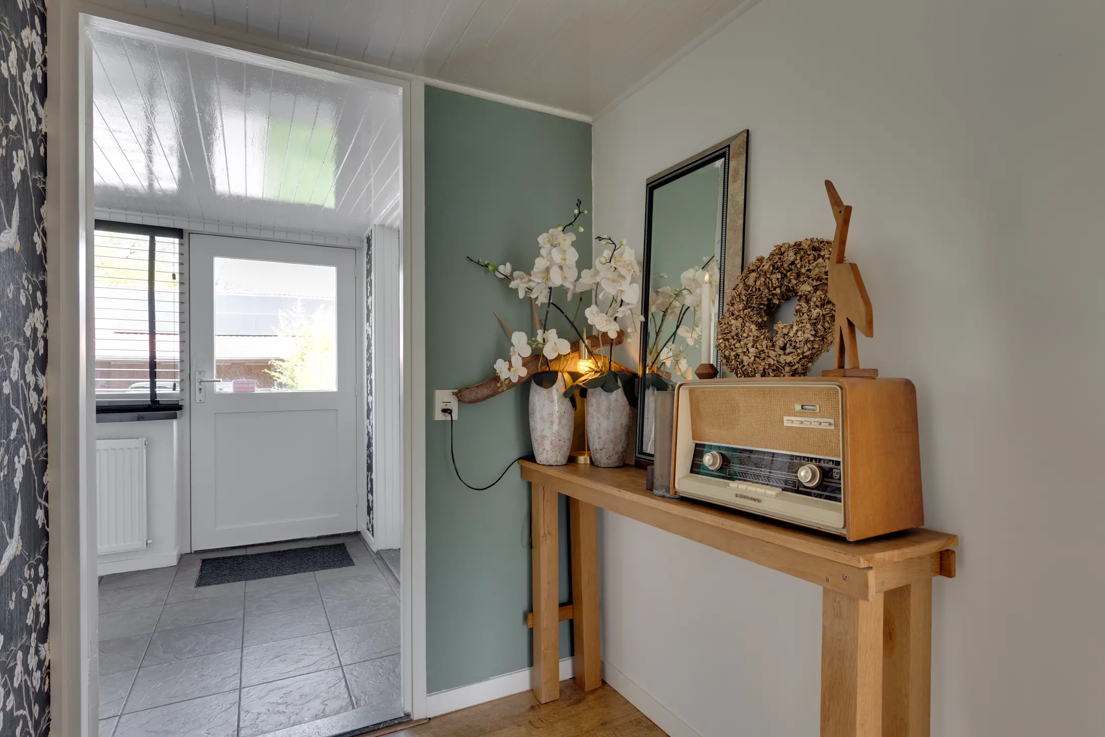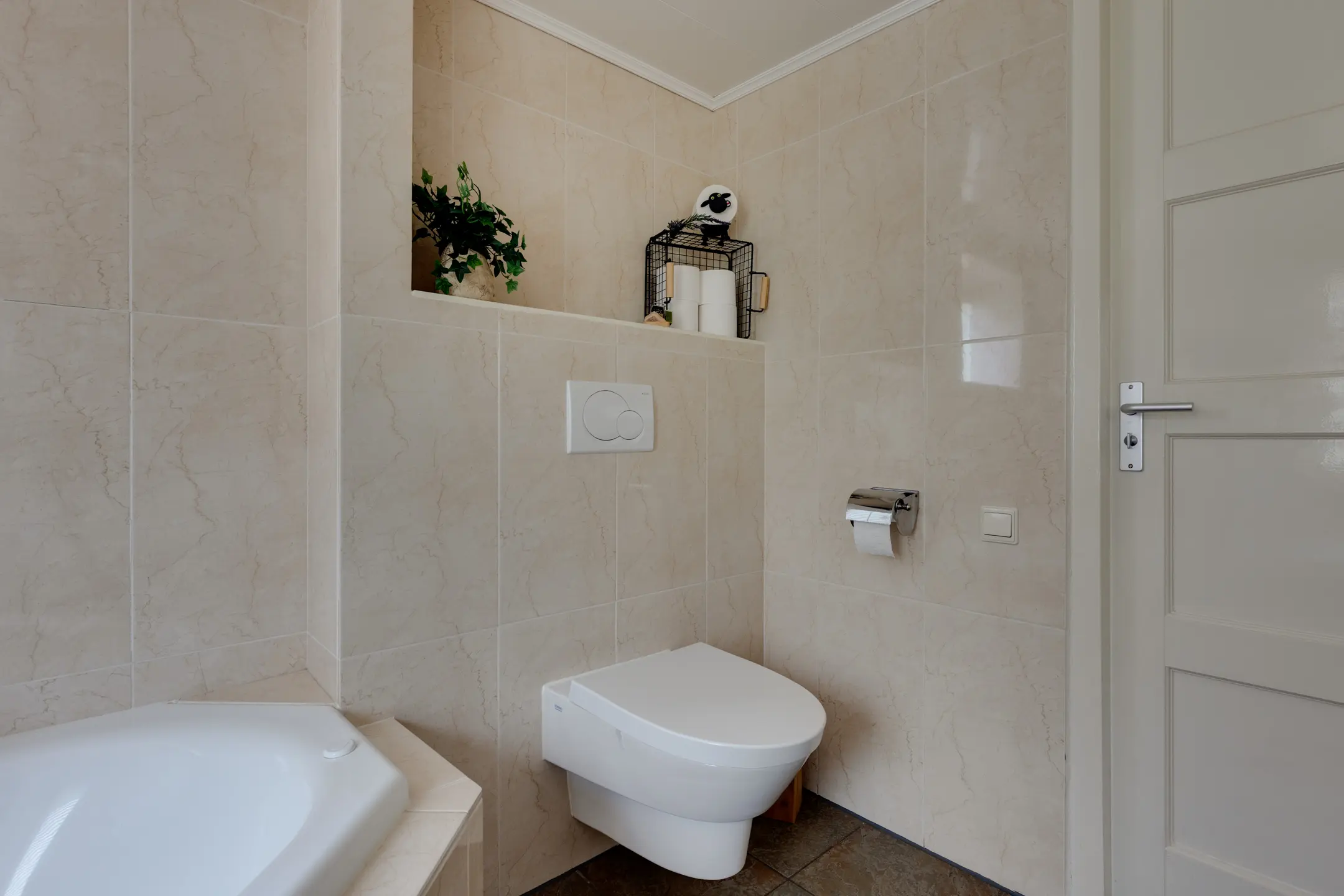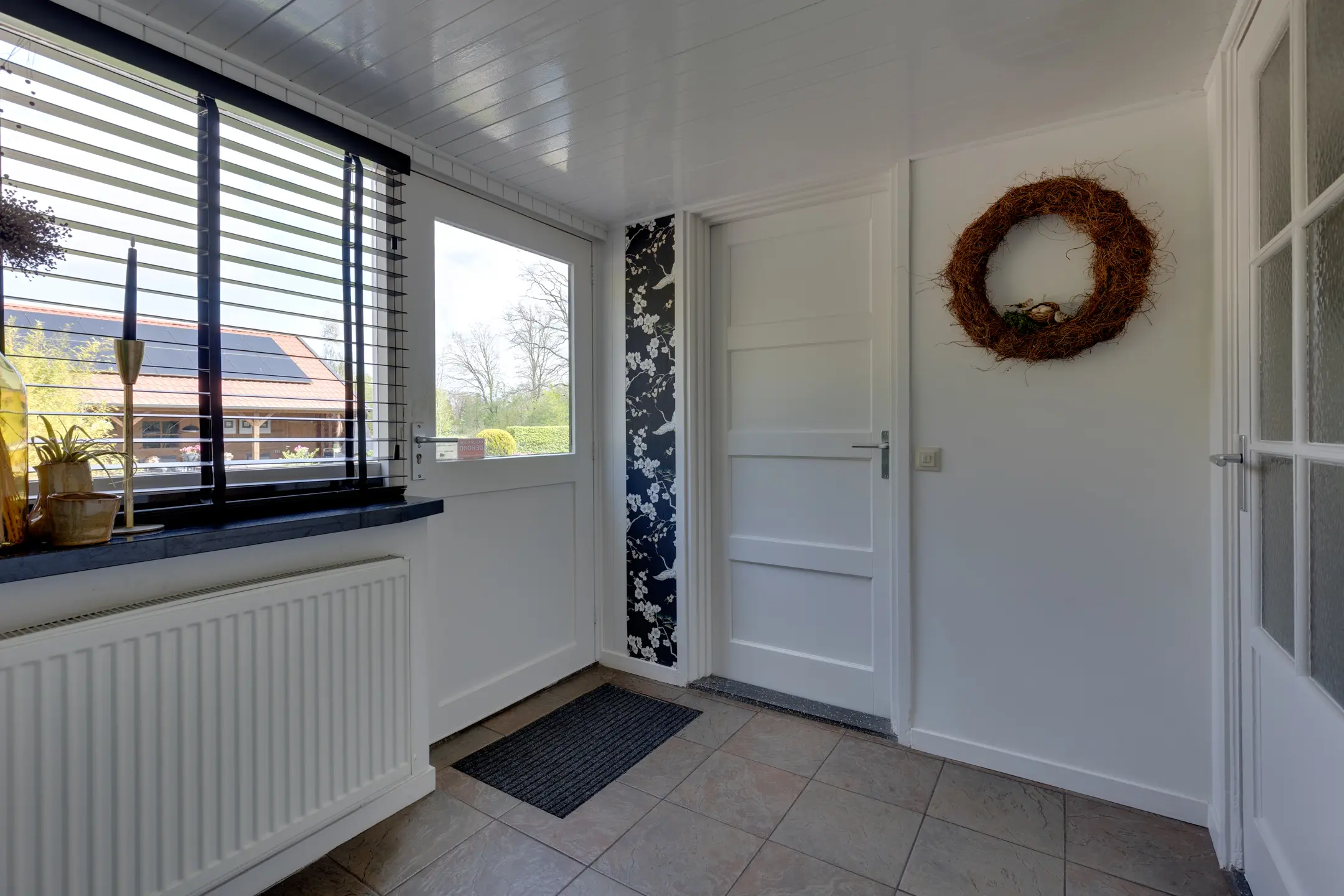 Via een tussendeur bereikt u de tussenhal, die toegang biedt tot een kantoorruimte. Deze ruimte is tevens uitstekend geschikt als slaapkamer op de begane grond. Vanuit de hal bereikt u de goed onderhouden badkamer, voorzien van een ligbad, toilet, handdoekradiator en wastafelmeubel. Aan de andere zijde van de hal bevindt zich de wasruimte met aansluitingen voor wasmachine en droger. Hier zijn tevens de cv-ketel en een praktische wastafel.