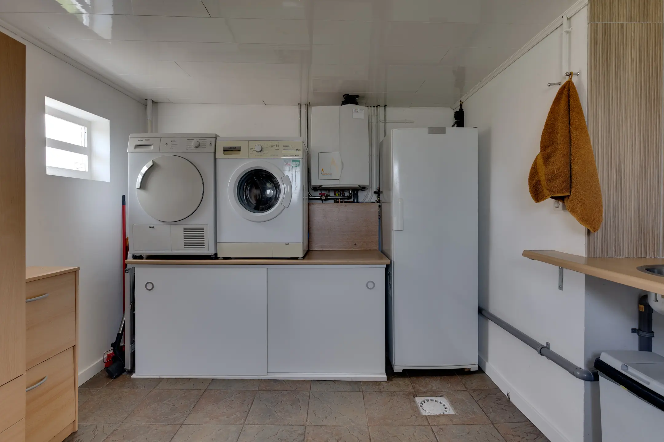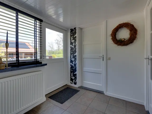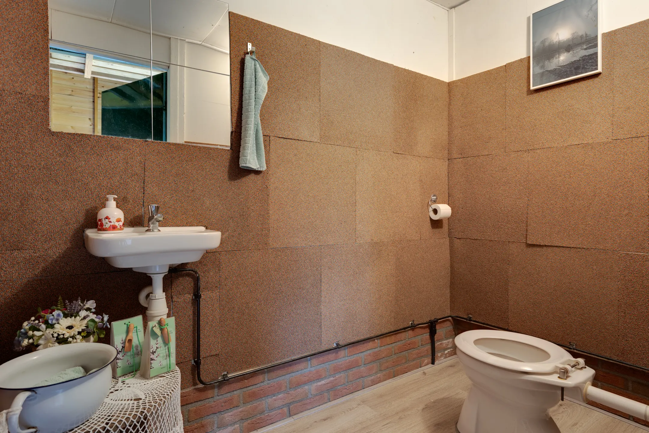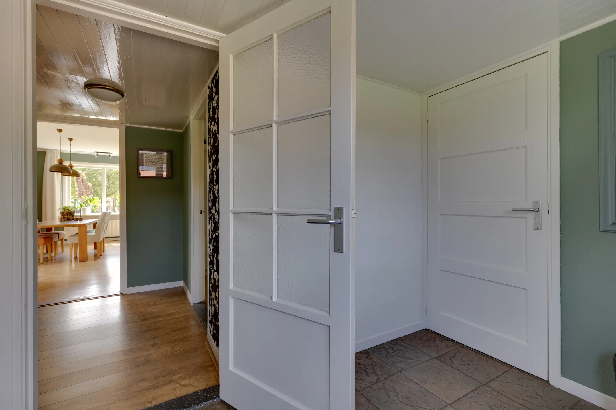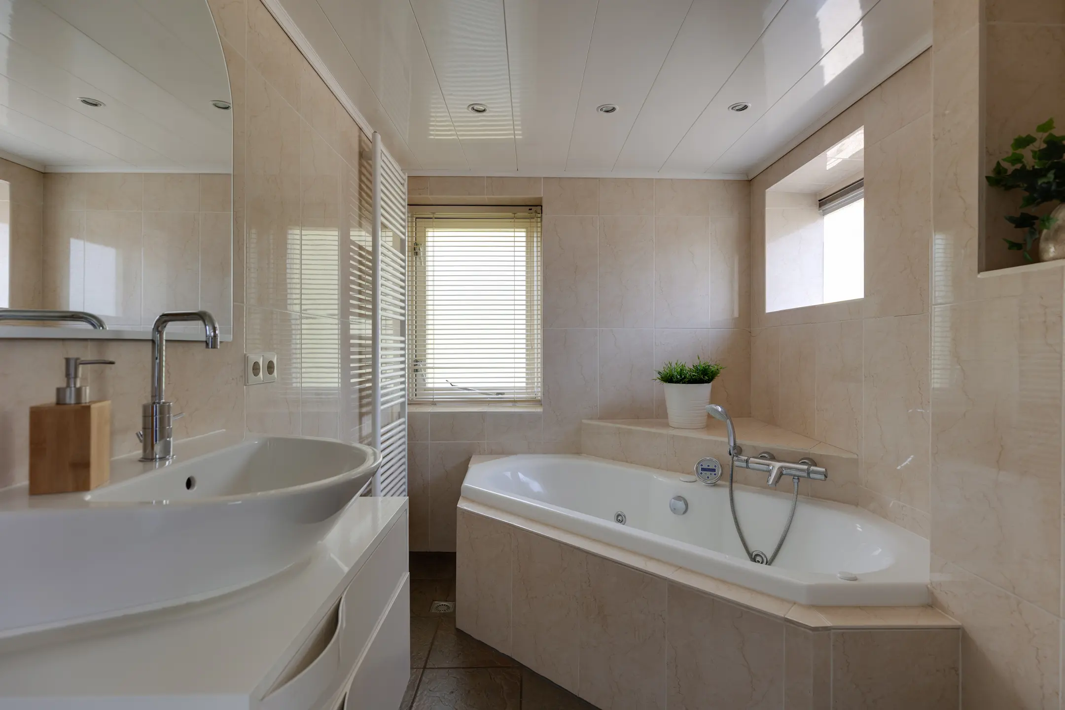 Via een tussendeur bereikt u de tussenhal, die toegang biedt tot een kantoorruimte. Deze ruimte is tevens uitstekend geschikt als slaapkamer op de begane grond. Vanuit de hal bereikt u de goed onderhouden badkamer, voorzien van een ligbad, toilet, handdoekradiator en wastafelmeubel. Aan de andere zijde van de hal bevindt zich de wasruimte met aansluitingen voor wasmachine en droger. Hier zijn tevens de cv-ketel en een praktische wastafel.