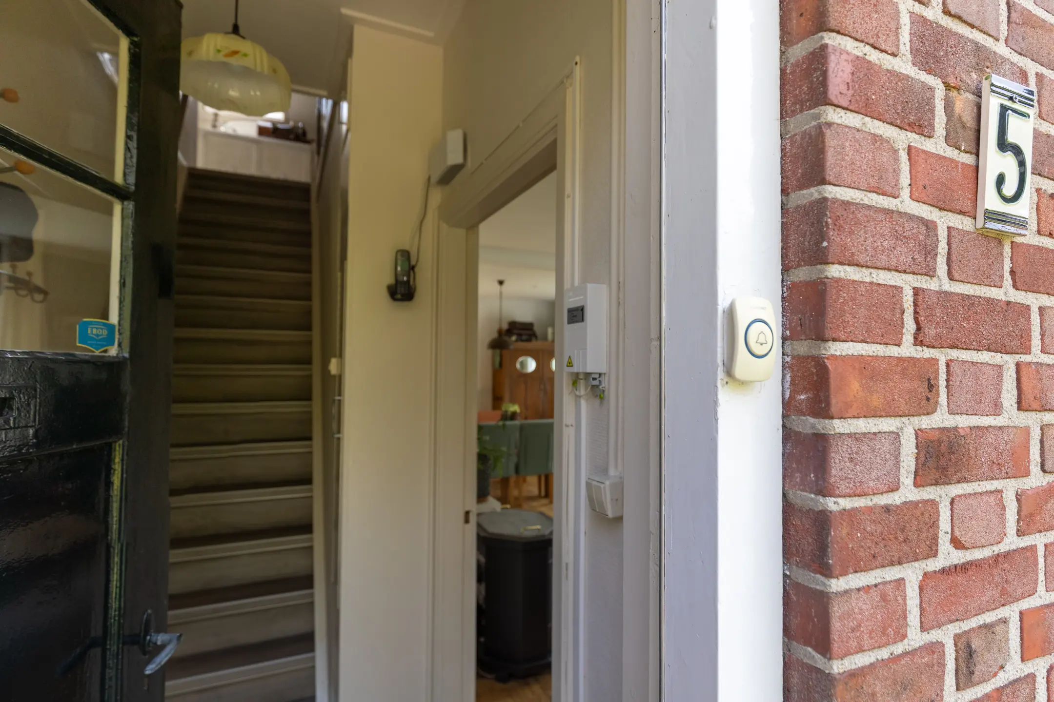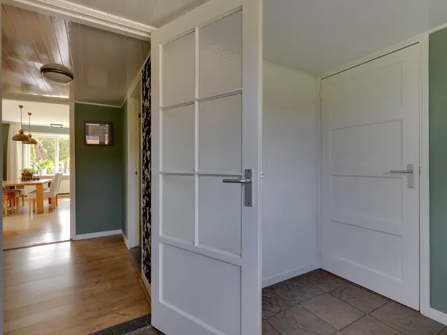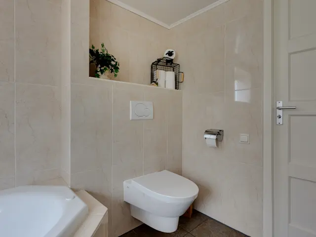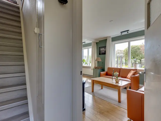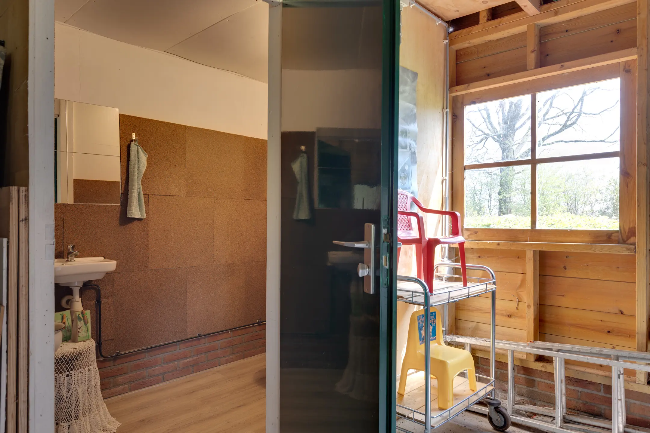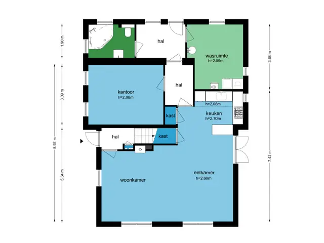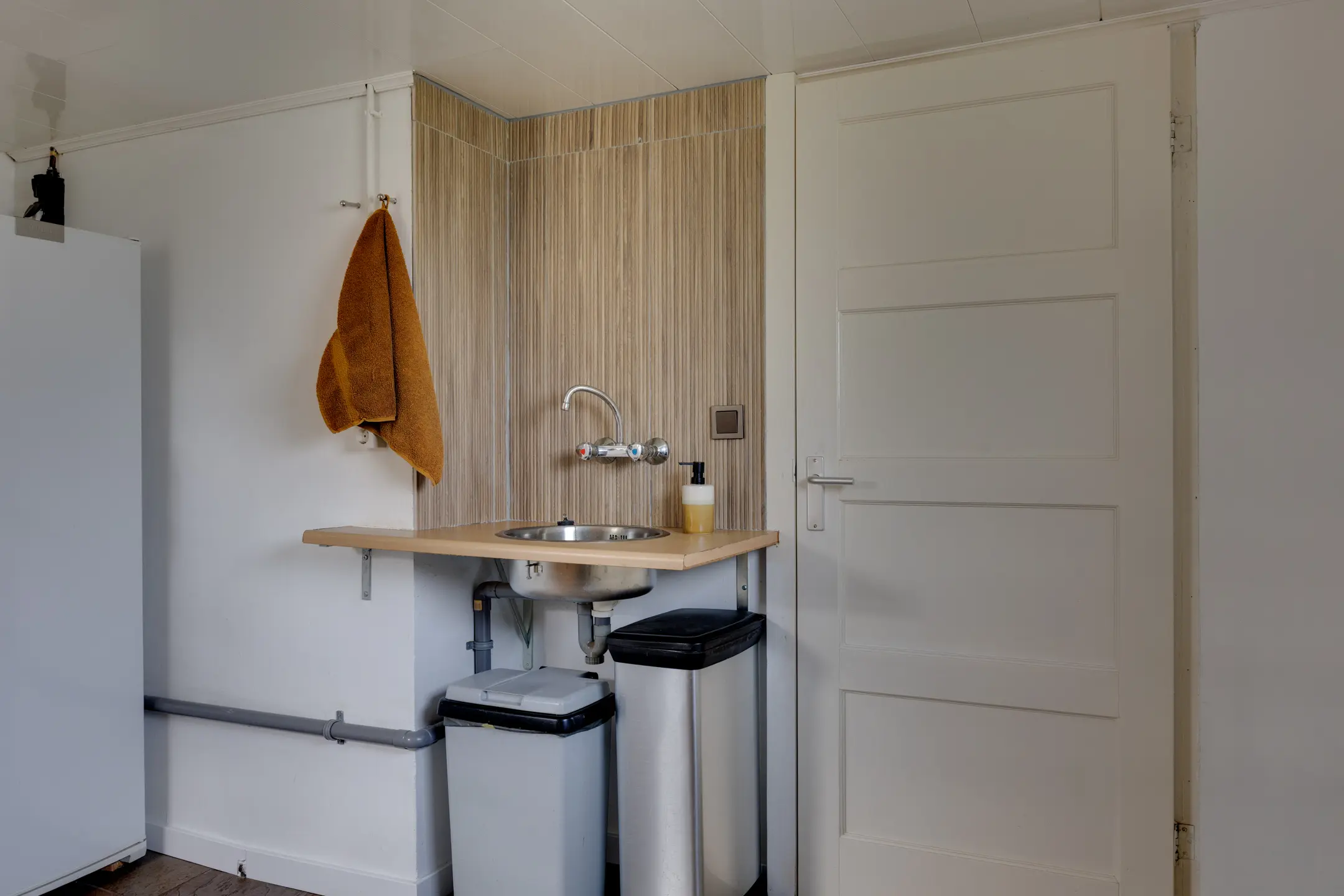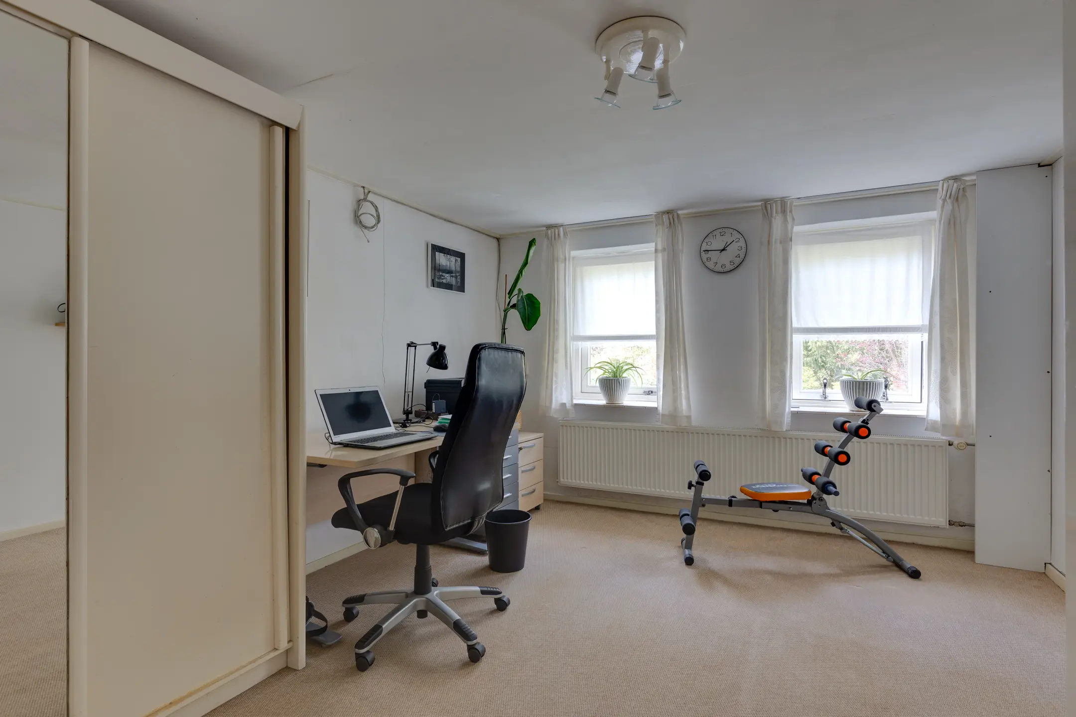 Via een tussendeur bereikt u de tussenhal, die toegang biedt tot een kantoorruimte. Deze ruimte is tevens uitstekend geschikt als slaapkamer op de begane grond. Vanuit de hal bereikt u de goed onderhouden badkamer, voorzien van een ligbad, toilet, handdoekradiator en wastafelmeubel. Aan de andere zijde van de hal bevindt zich de wasruimte met aansluitingen voor wasmachine en droger. Hier zijn tevens de cv-ketel en een praktische wastafel.