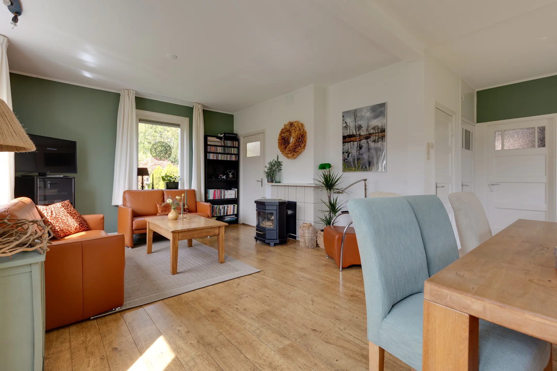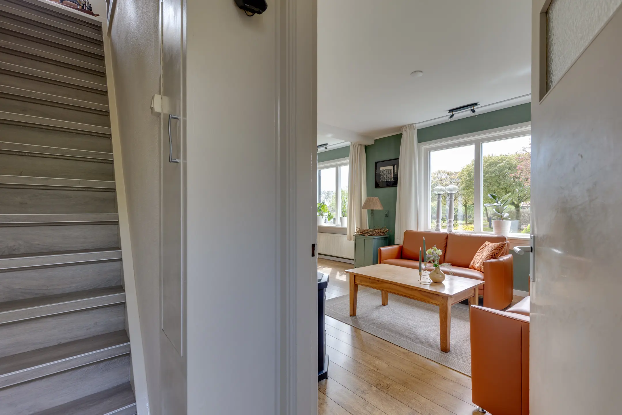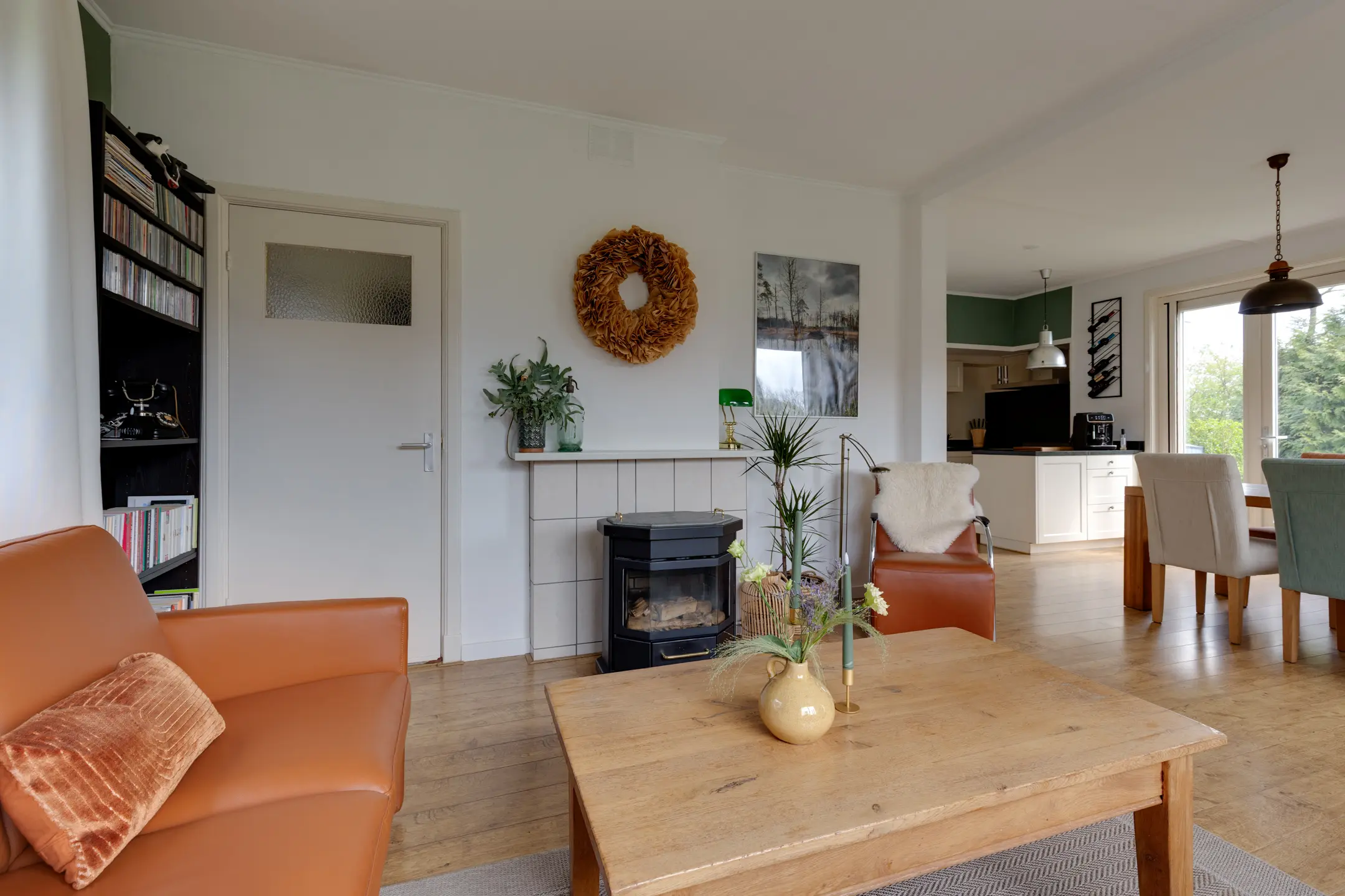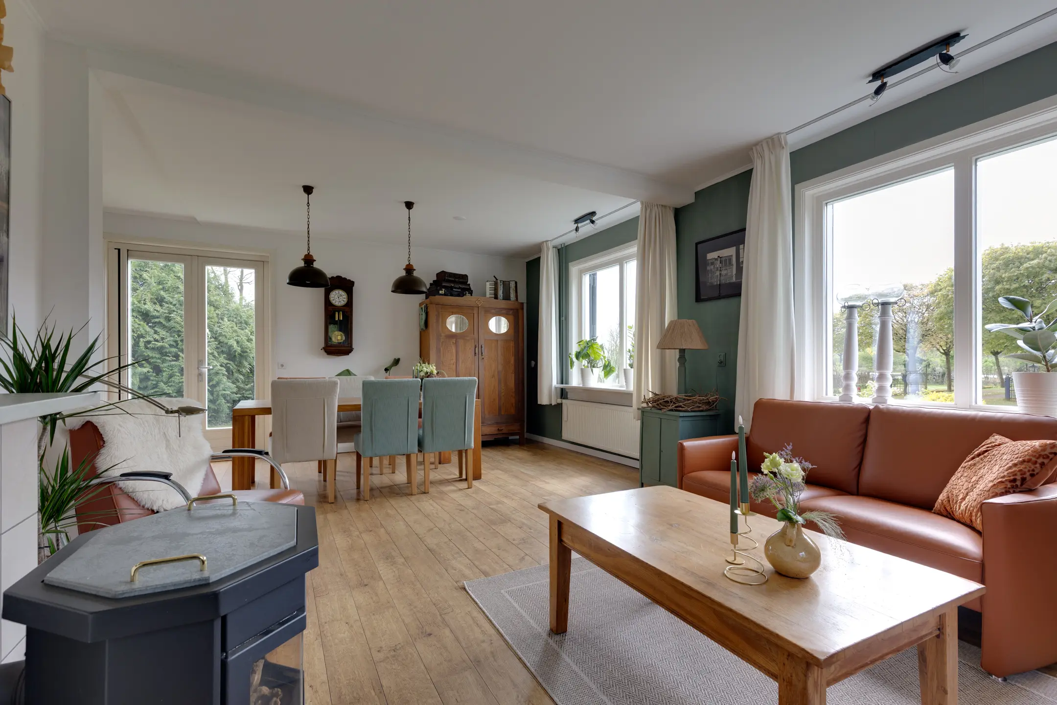 Binnenkomst via de voordeur in de hal met meterkast en trapopgang naar de eerste verdieping. Vanuit de hal is er toegang tot de L-vormige woon- en eetkamer. Dankzij de raampartijen aan meerdere zijden geniet de woonkamer van veel natuurlijk licht. De ruimte is voorzien van een sfeervolle gaskachel en openslaande deuren naar de tuin.