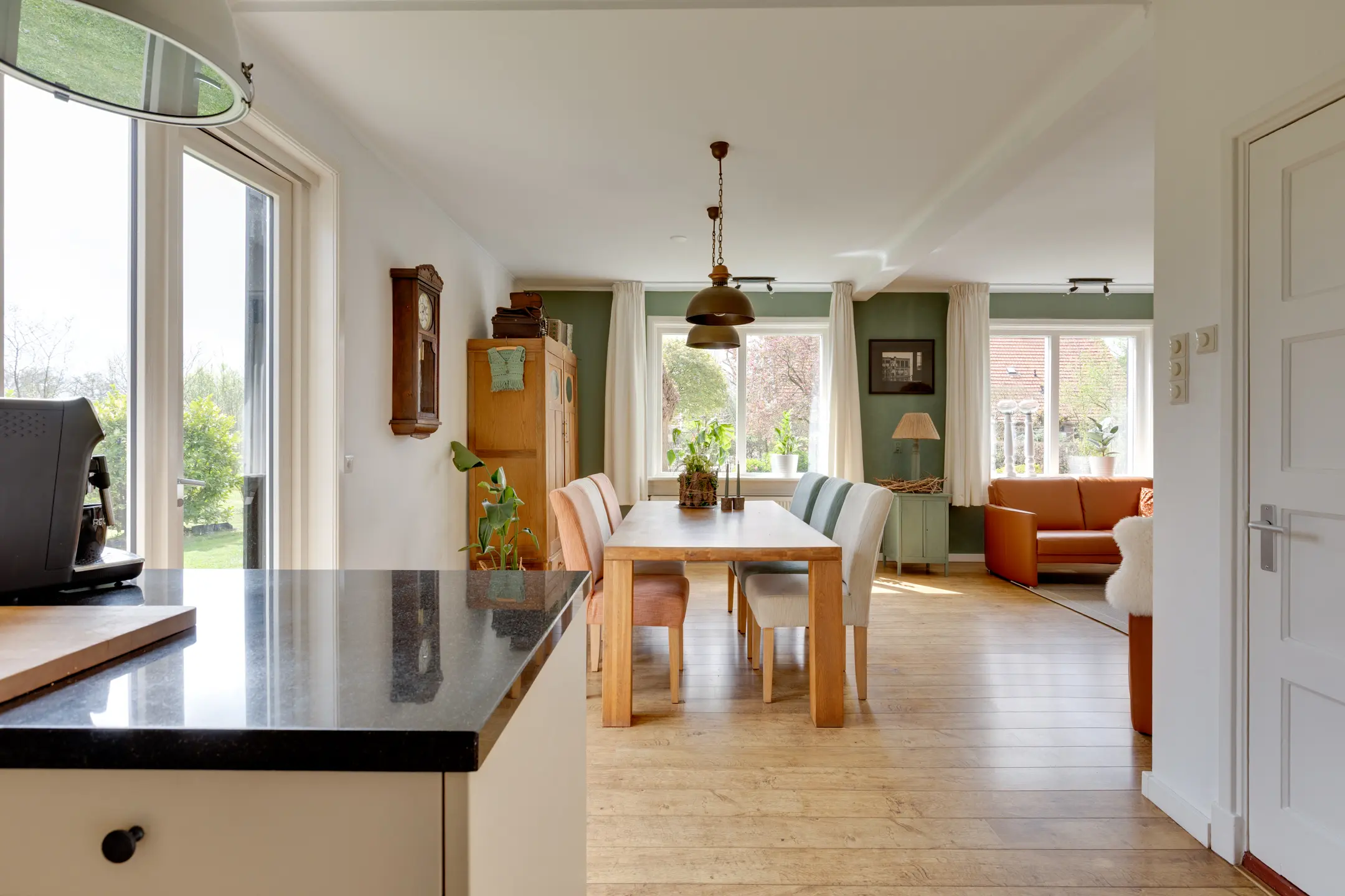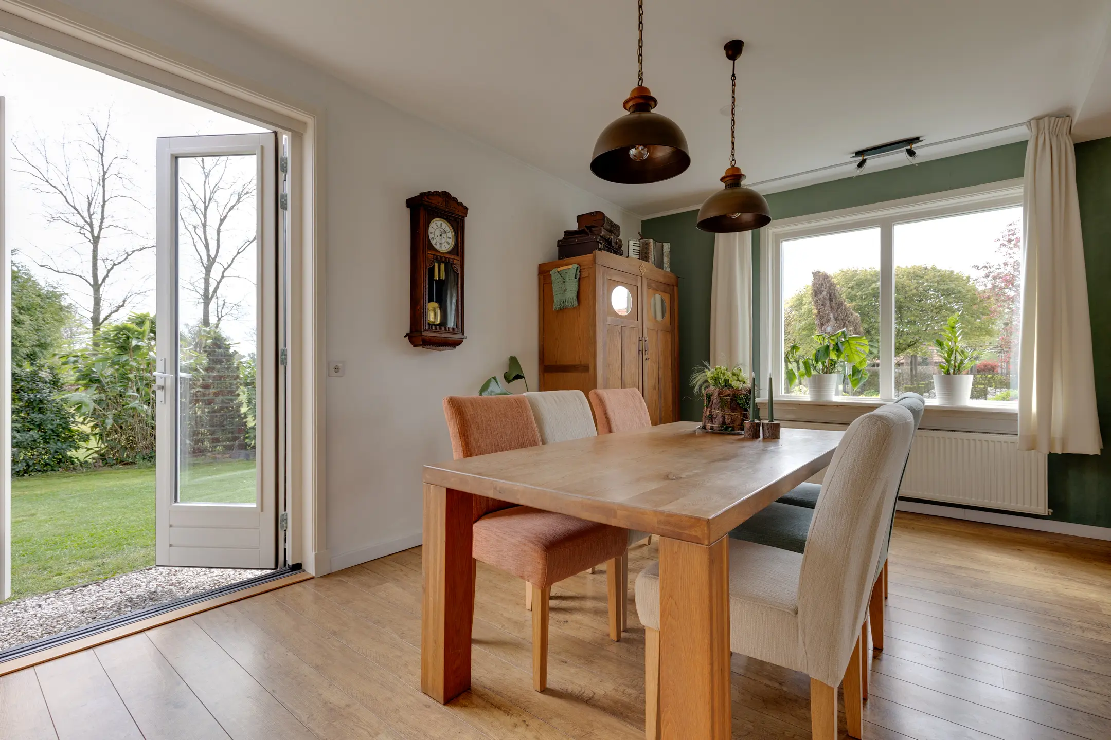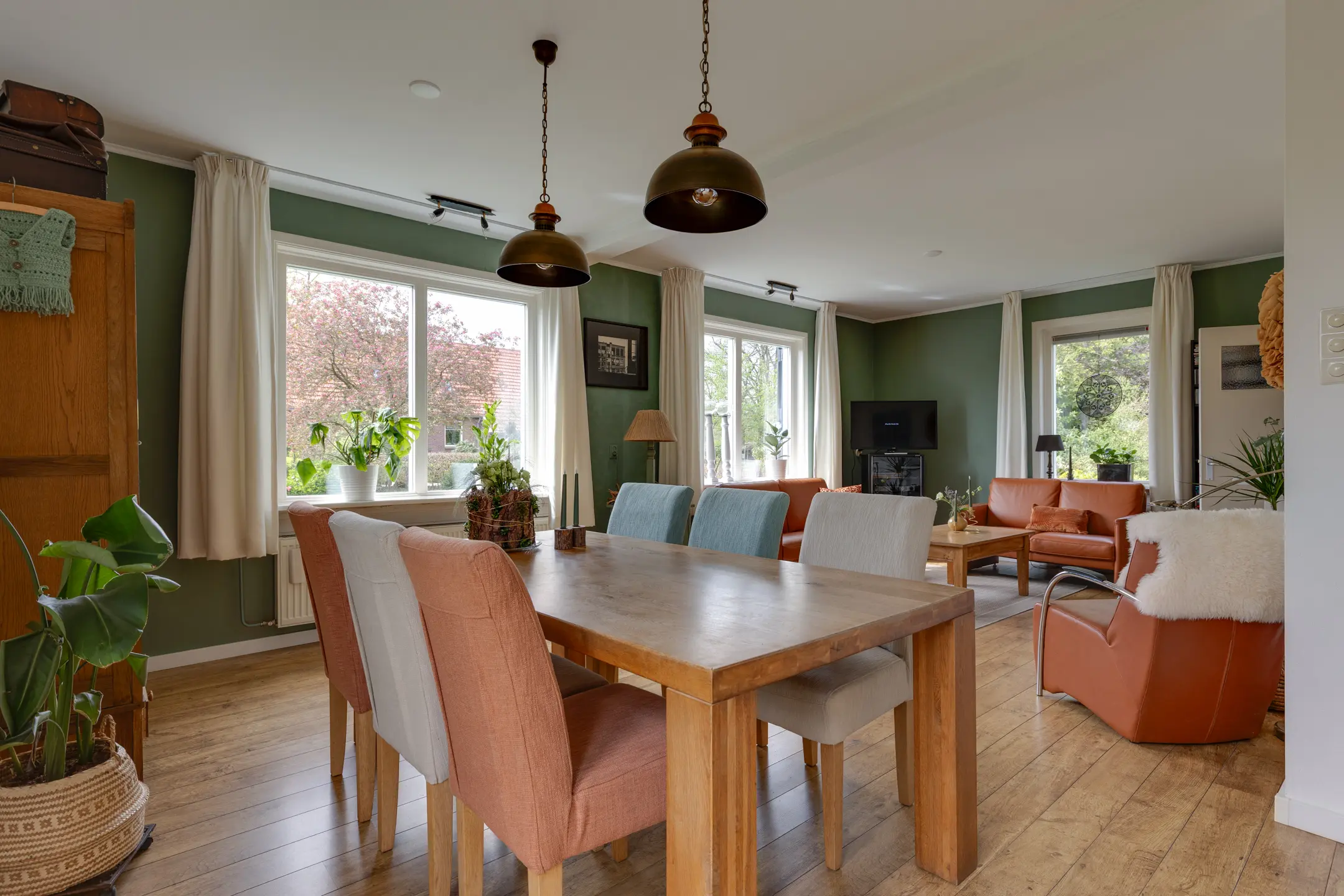 Binnenkomst via de voordeur in de hal met meterkast en trapopgang naar de eerste verdieping. Vanuit de hal is er toegang tot de L-vormige woon- en eetkamer. Dankzij de raampartijen aan meerdere zijden geniet de woonkamer van veel natuurlijk licht. De ruimte is voorzien van een sfeervolle gaskachel en openslaande deuren naar de tuin.