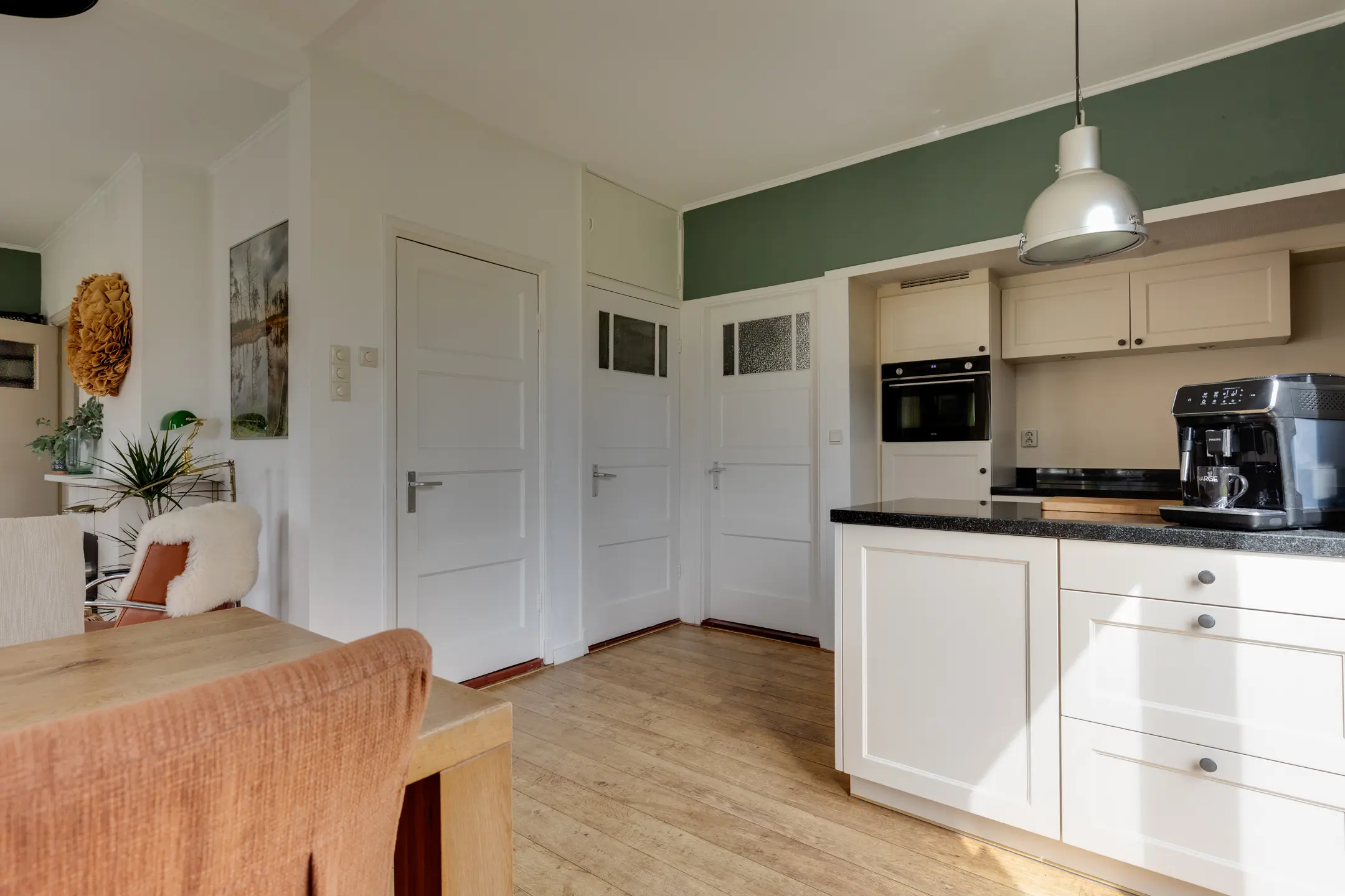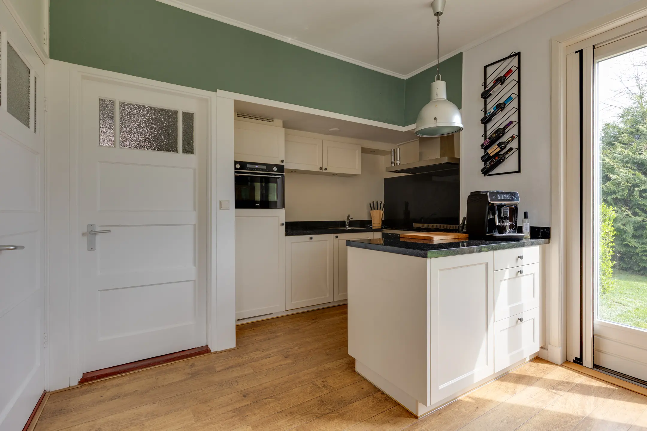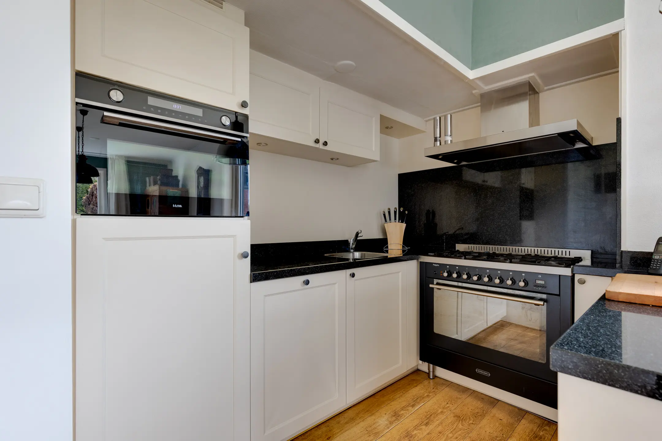 De woonkamer loopt naadloos over in de open keuken, welke is uitgerust met diverse inbouwapparatuur, waaronder een 6-pits gasfornuis met oven, vaatwasser en koelkast. Nabij de keuken bevinden zich een inbouwkast en een trapkast.