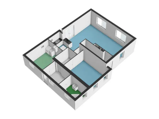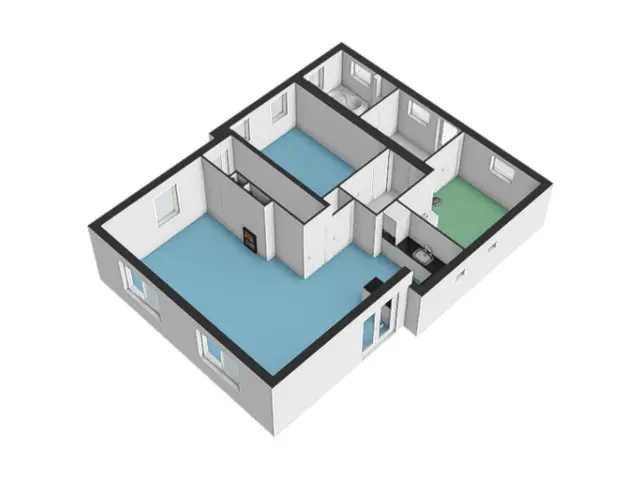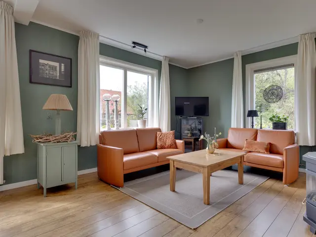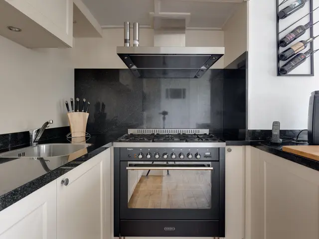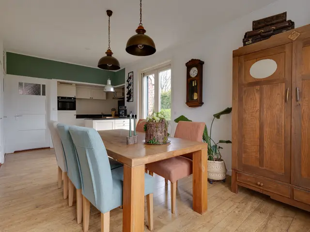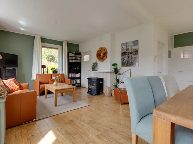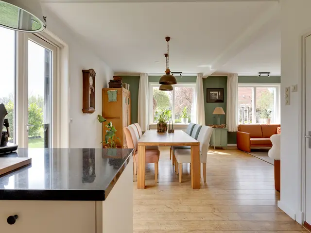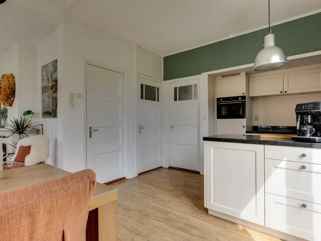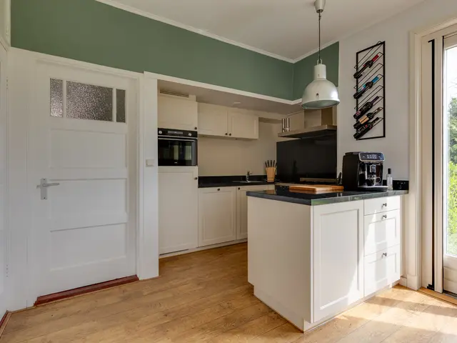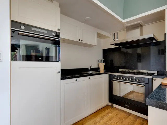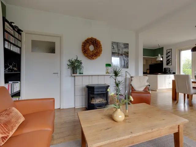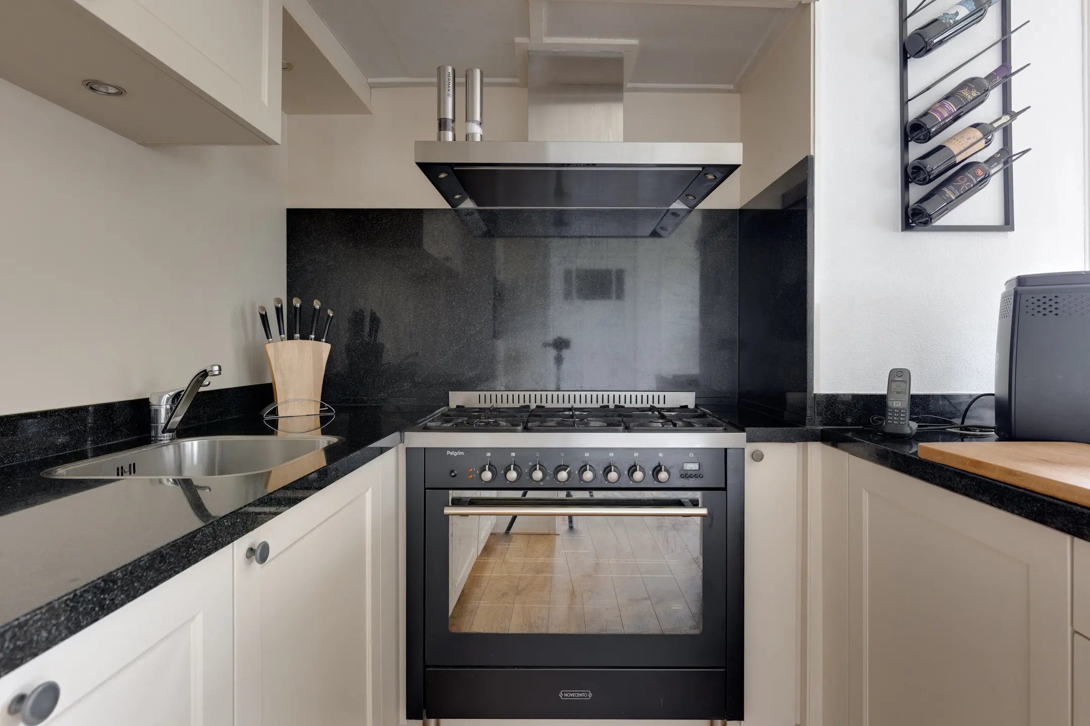 De woonkamer loopt naadloos over in de open keuken, welke is uitgerust met diverse inbouwapparatuur, waaronder een 6-pits gasfornuis met oven, vaatwasser en koelkast. Nabij de keuken bevinden zich een inbouwkast en een trapkast.