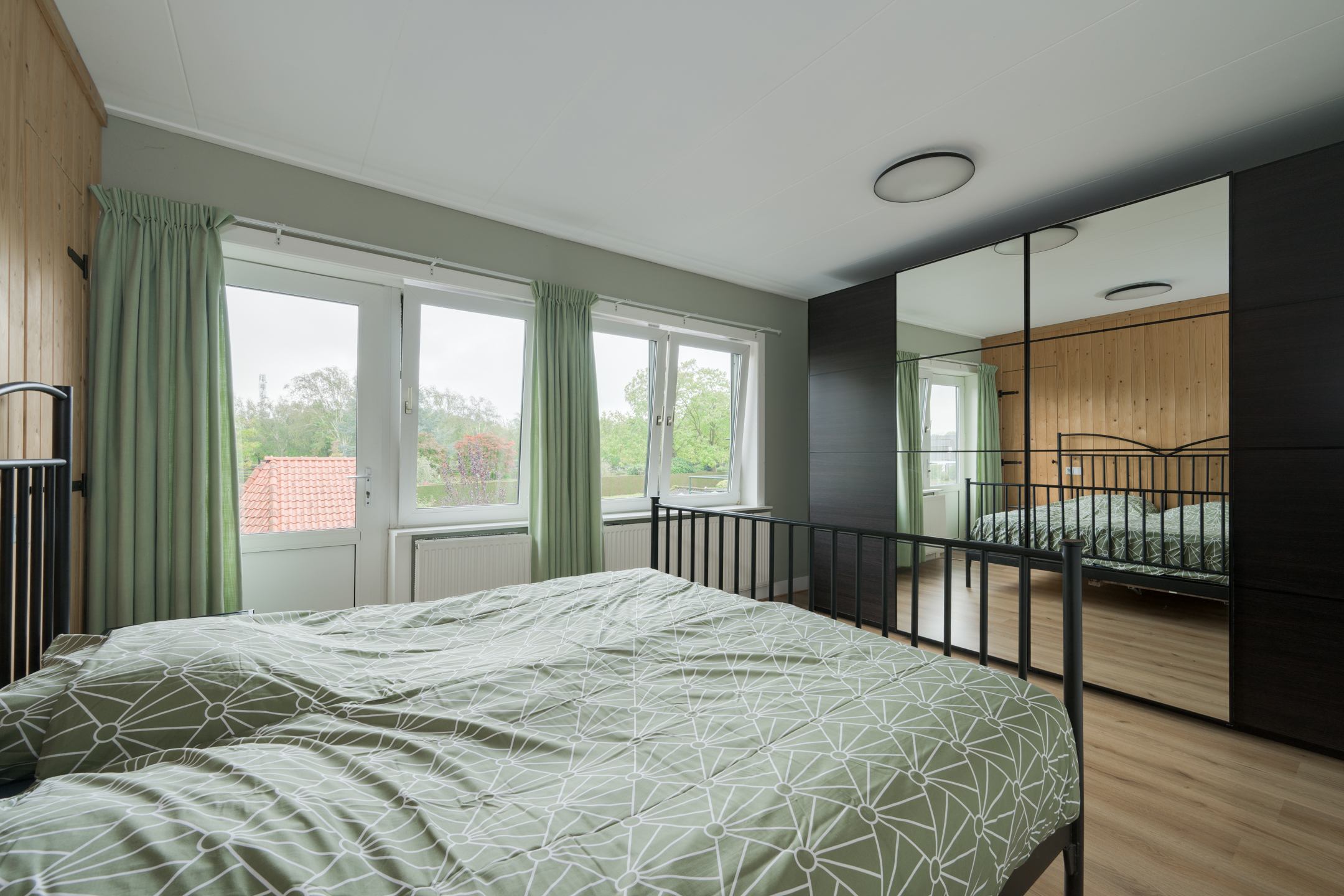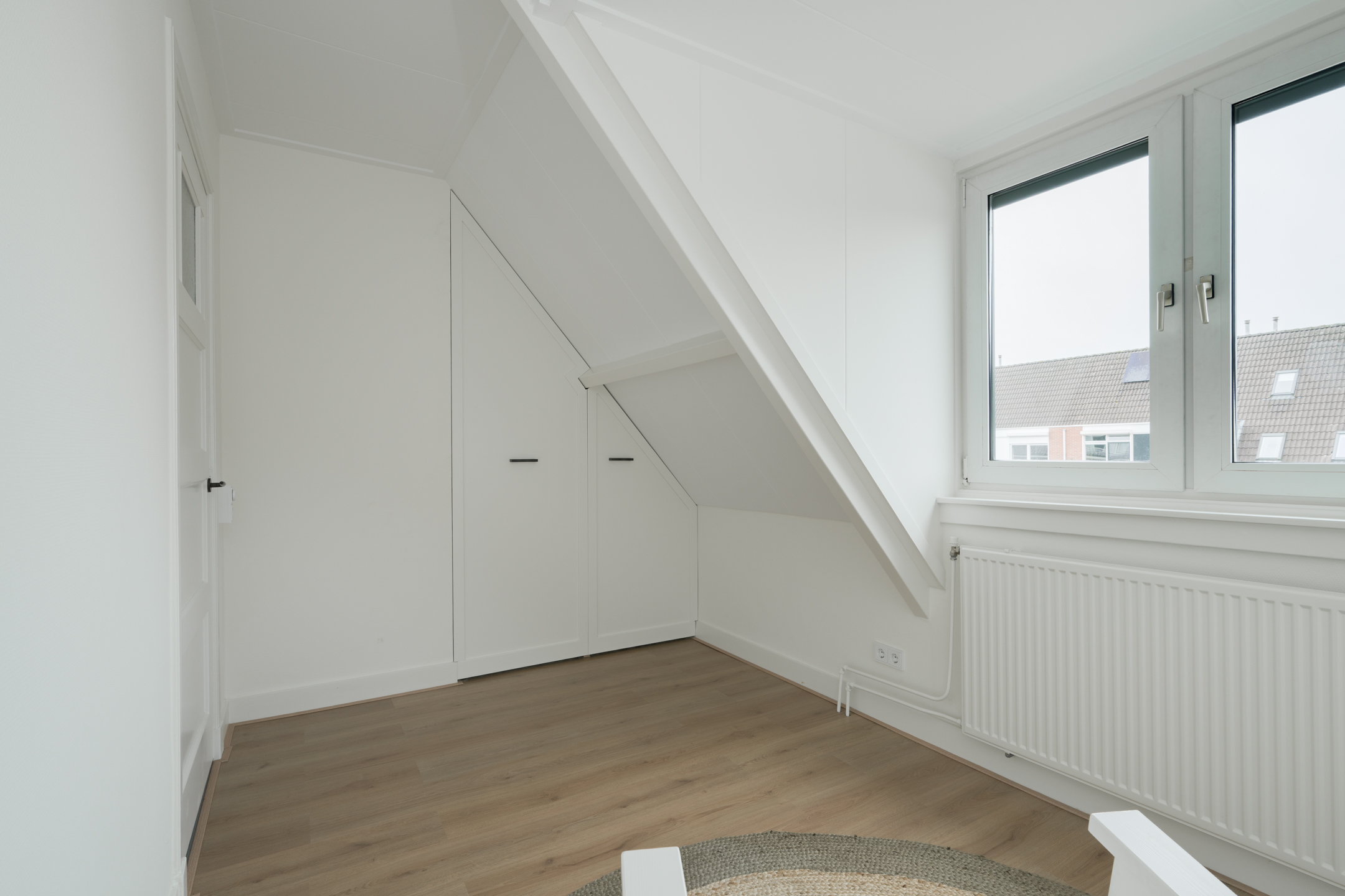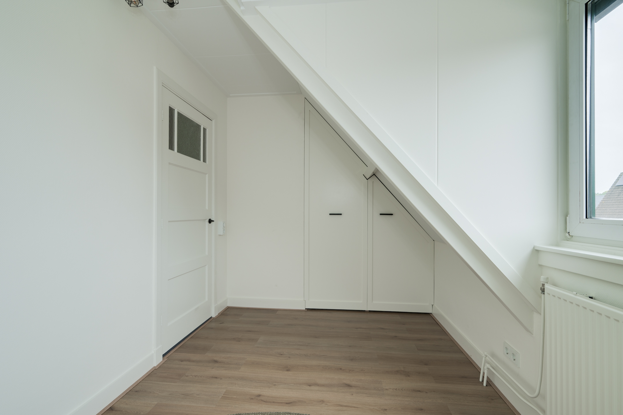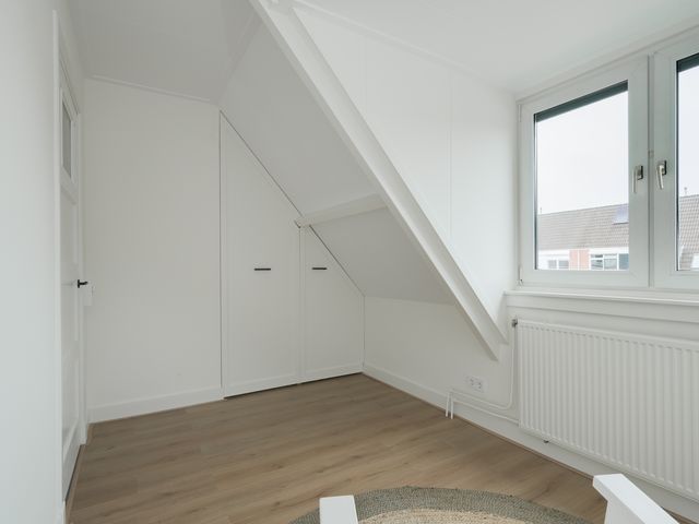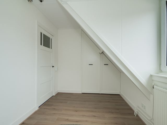 Eerste verdieping: Via de overloop, voorzien van een kastruimte (waar mogelijkerwijs een tweede toilet gerealiseerd kan worden), zijn twee slaapkamers bereikbaar. Beide kamers beschikken over praktische inbouwkasten en genieten van een prettige lichtinval. Indien gewenst kan er met een eenvoudige aanpassing, bijvoorbeeld door het plaatsen van een tussenwand, een derde slaapkamer worden gecreëerd.