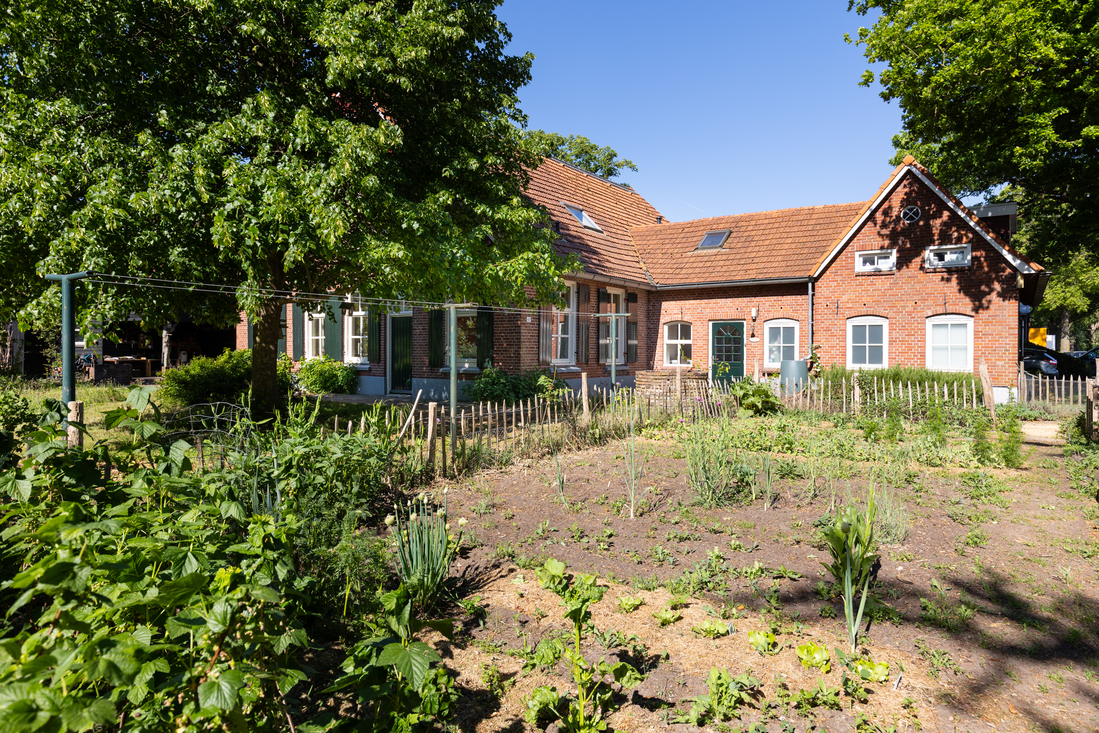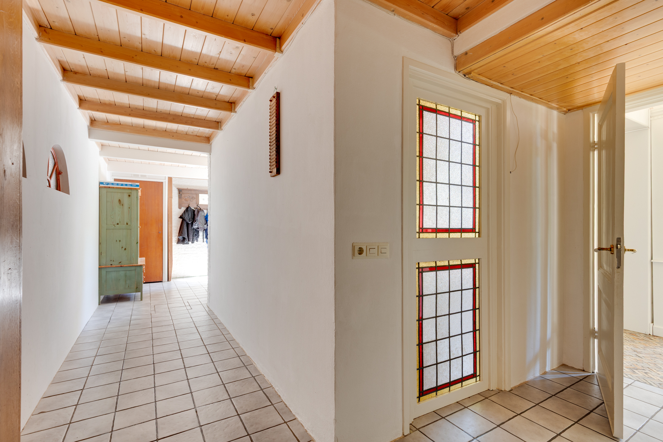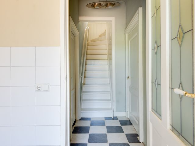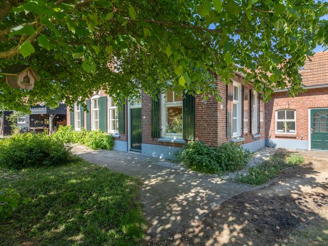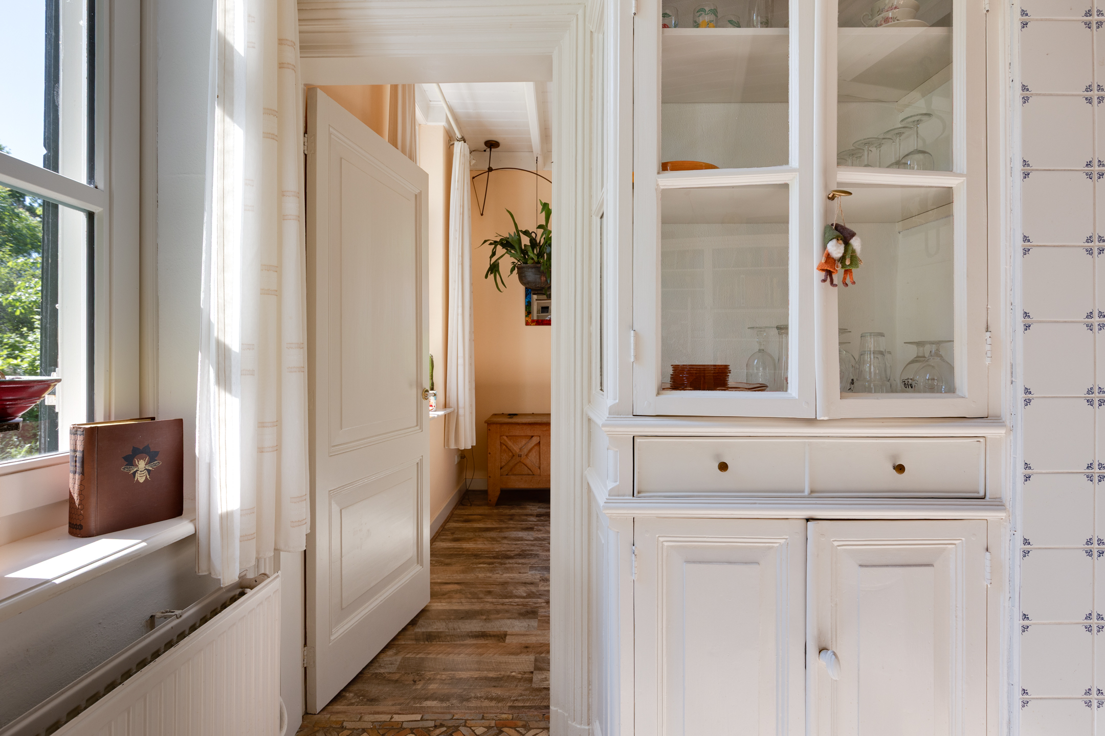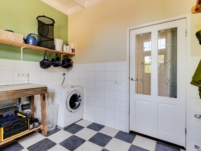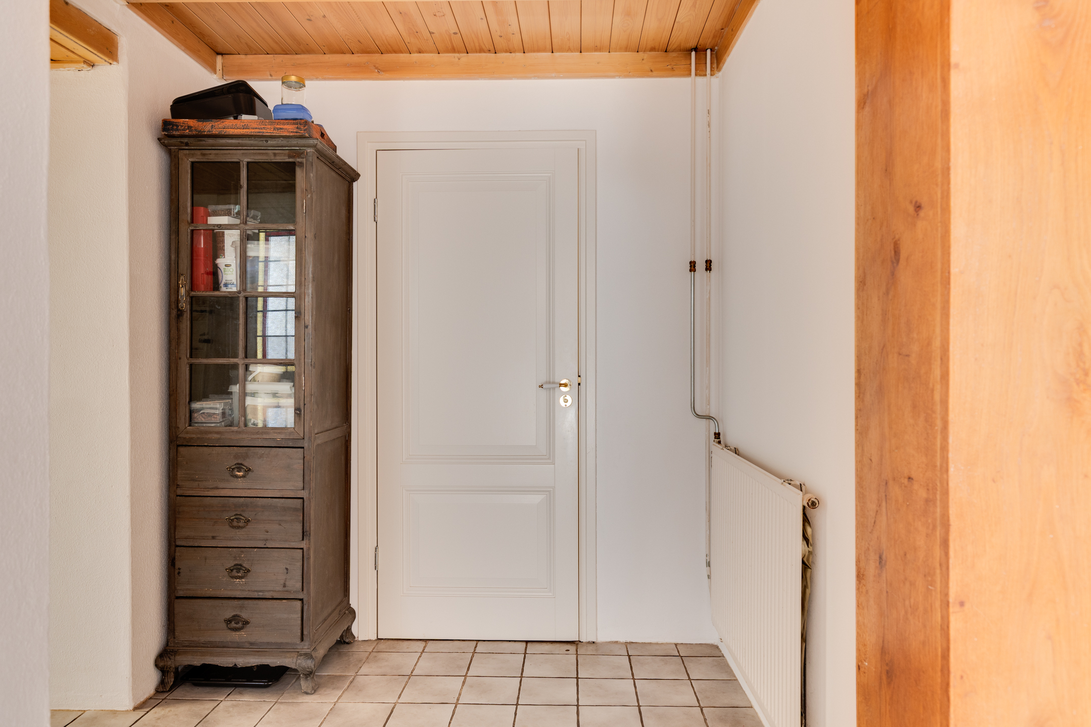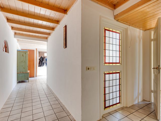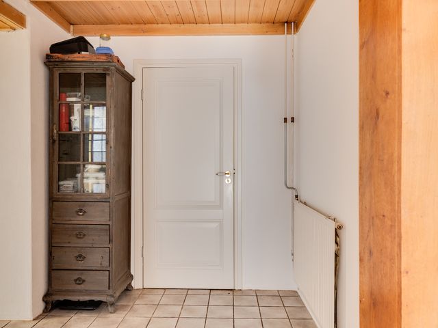 Begane grond: De entree bevindt zich in de aanbouw; hier kom je binnen in de grote hal die toegang biedt tot de toiletruimte en de centraal gelegen woon-/eetkamer. De toiletruimte is modern en voorzien van een wandcloset en fonteintje. De woon-/eetkamer heeft een authentieke look door potscheuren-vloer, de paneeldeuren, inbouwkast en schouw met speksteen houtkachel. De aangrenzende keuken beschikt over een inbouwkeuken in L-opstelling met een kookeiland in het midden. Aan de andere kant van de eetkamer is er toegang tot de knusse zit-/tv-kamer. De bijkeuken met achteruitgang grenst aan de zitkamer en is bereikbaar vanuit de hal. De hal biedt ook toegang tot de trapopgang en provisieruimte en heeft ook een deur naar de centrale eetkamer. De vaste kastruimte achter de fraaie paneeldeuren in de eetkamer, bevindt zich onder de trapopgang.