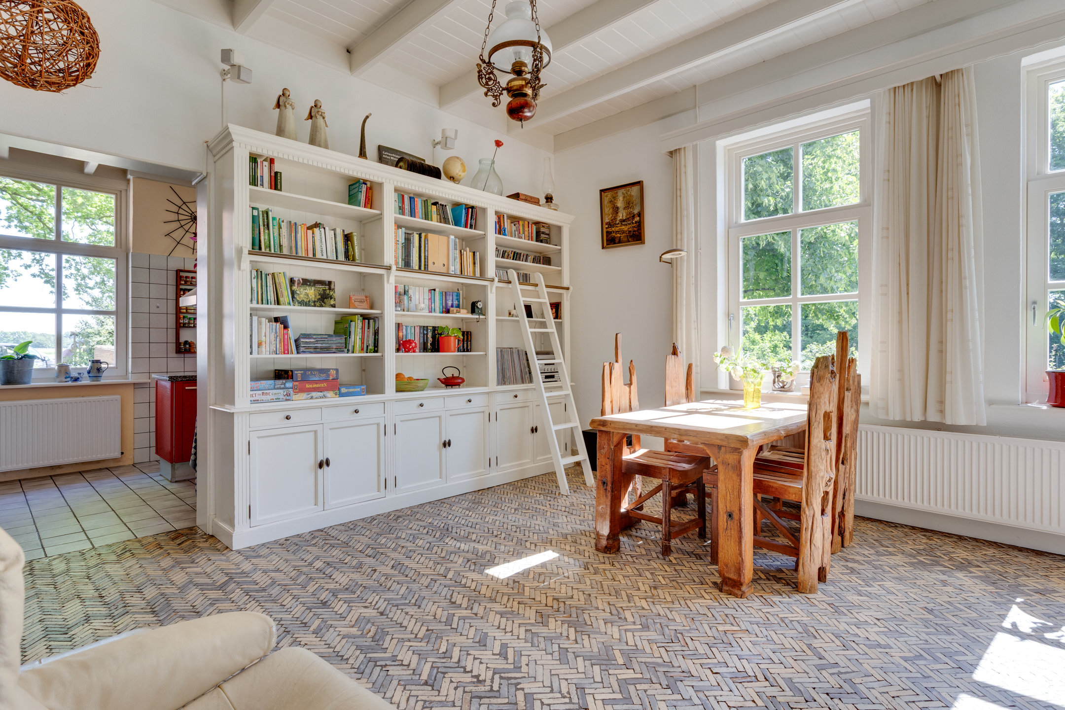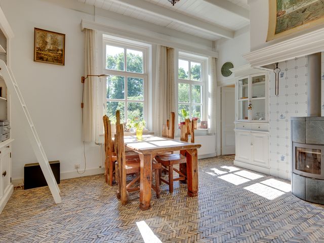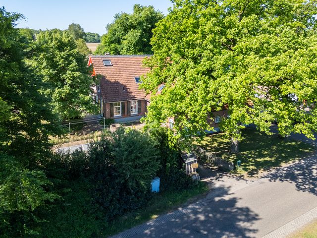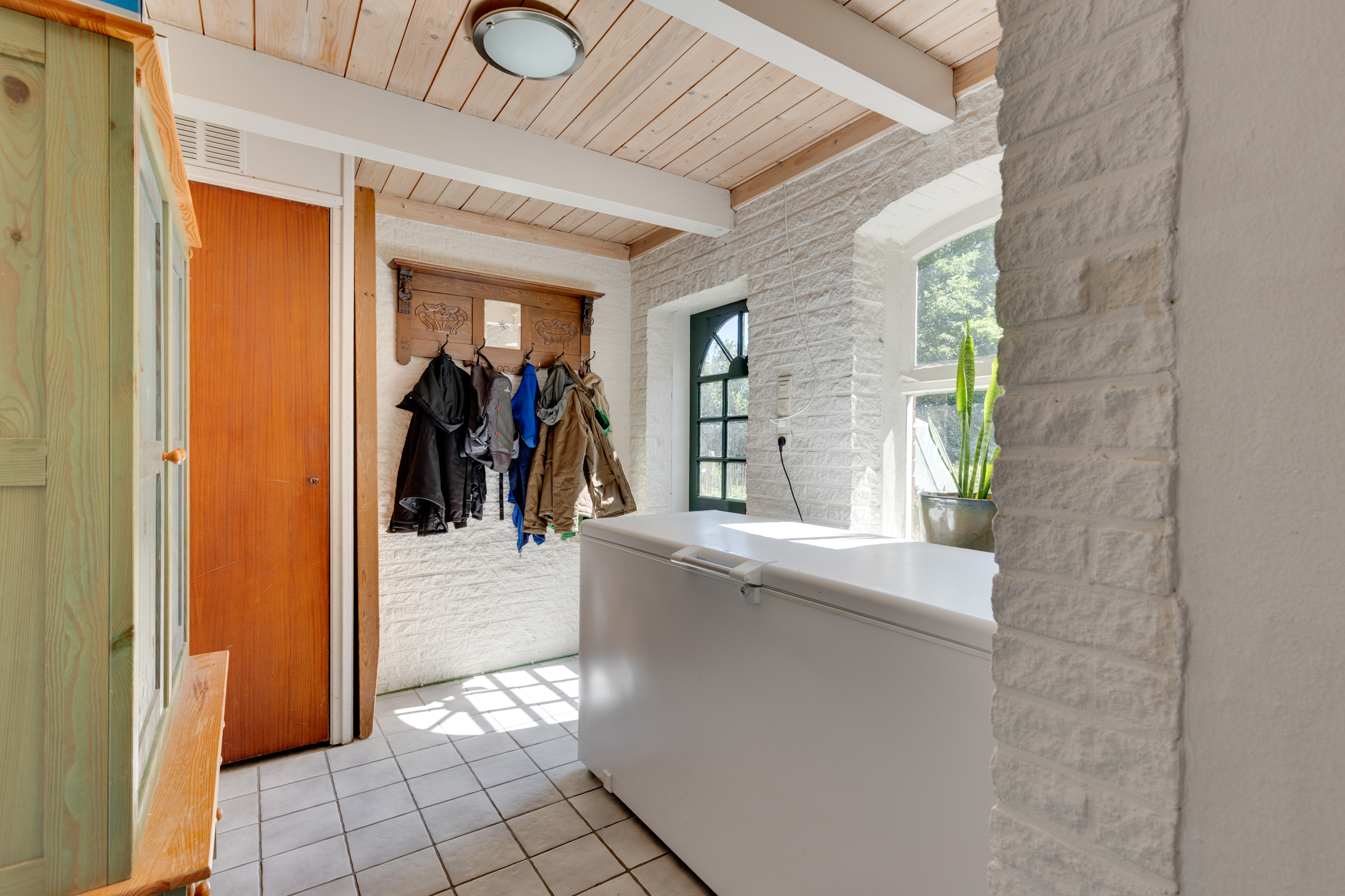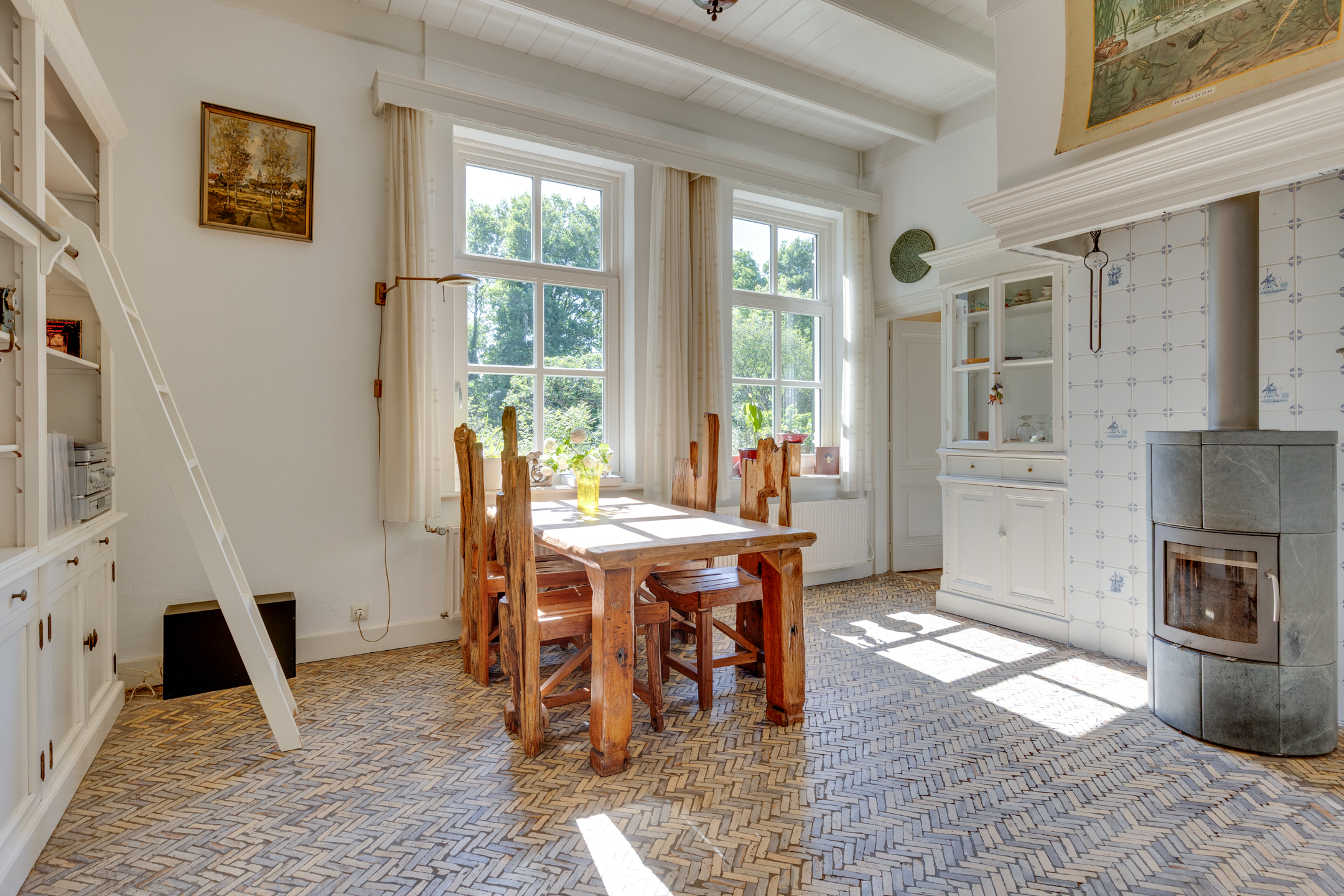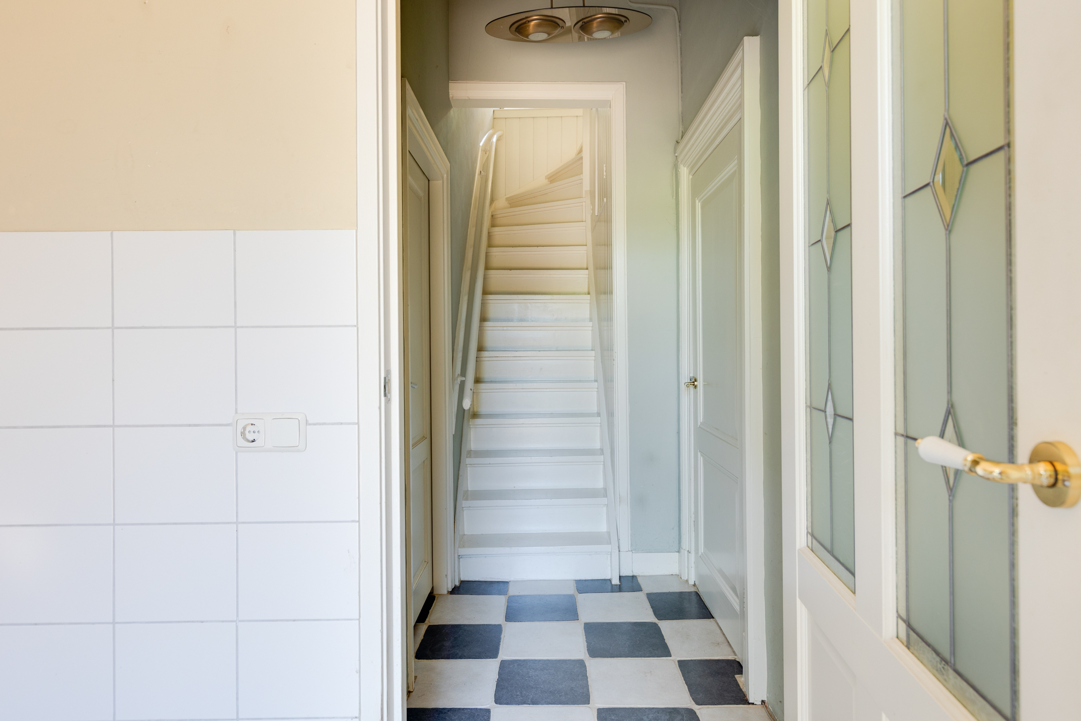 Begane grond: De entree bevindt zich in de aanbouw; hier kom je binnen in de grote hal die toegang biedt tot de toiletruimte en de centraal gelegen woon-/eetkamer. De toiletruimte is modern en voorzien van een wandcloset en fonteintje. De woon-/eetkamer heeft een authentieke look door potscheuren-vloer, de paneeldeuren, inbouwkast en schouw met speksteen houtkachel. De aangrenzende keuken beschikt over een inbouwkeuken in L-opstelling met een kookeiland in het midden. Aan de andere kant van de eetkamer is er toegang tot de knusse zit-/tv-kamer. De bijkeuken met achteruitgang grenst aan de zitkamer en is bereikbaar vanuit de hal. De hal biedt ook toegang tot de trapopgang en provisieruimte en heeft ook een deur naar de centrale eetkamer. De vaste kastruimte achter de fraaie paneeldeuren in de eetkamer, bevindt zich onder de trapopgang.