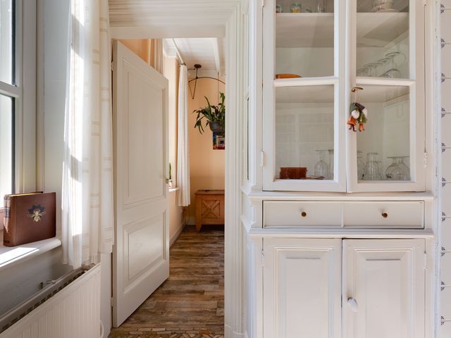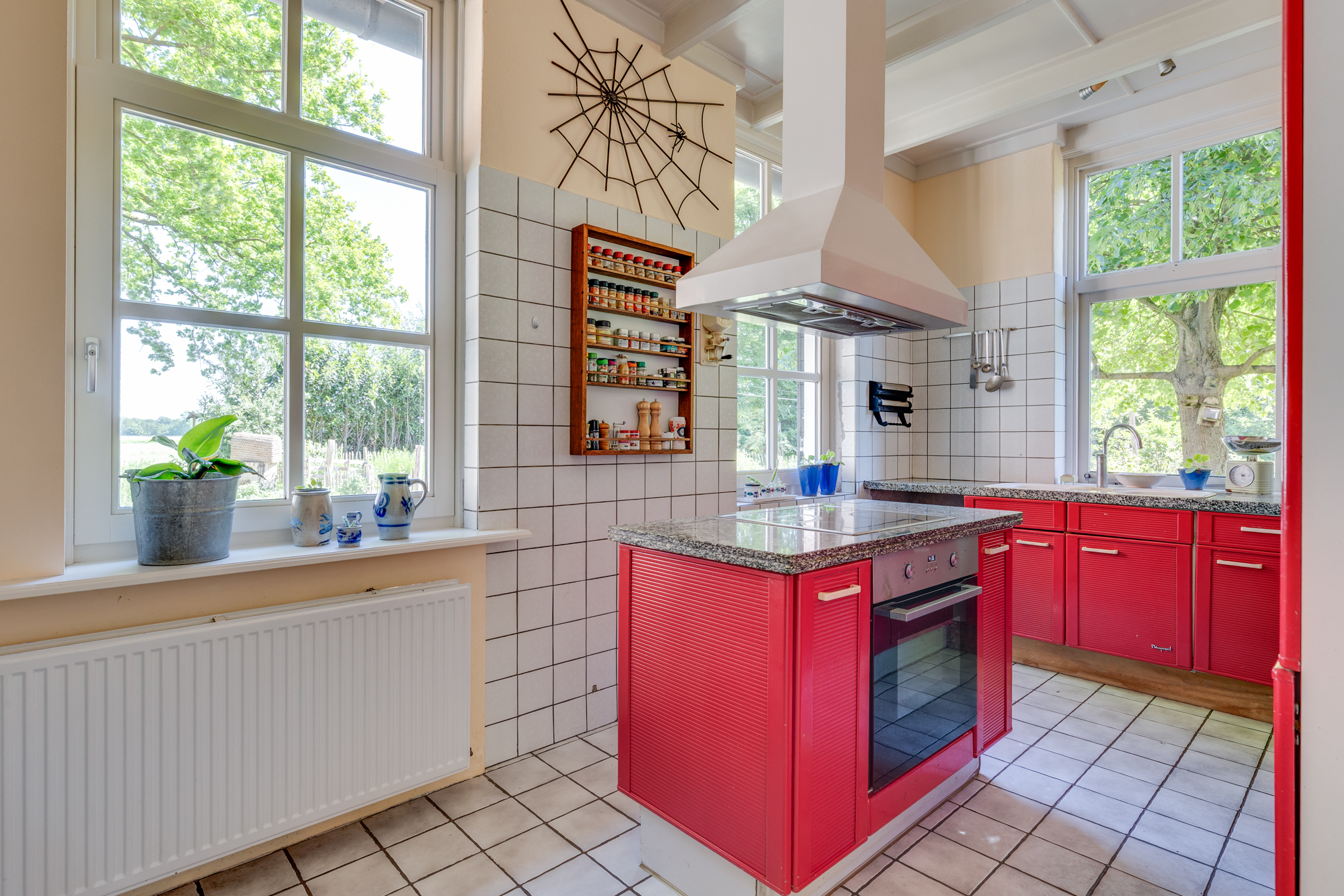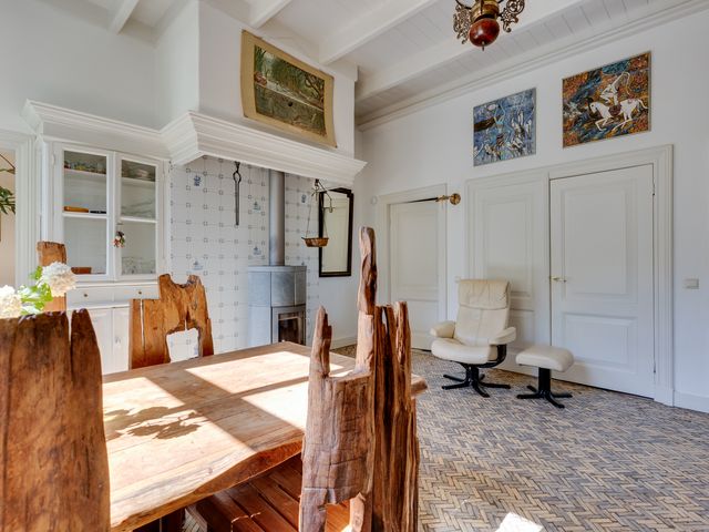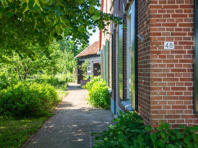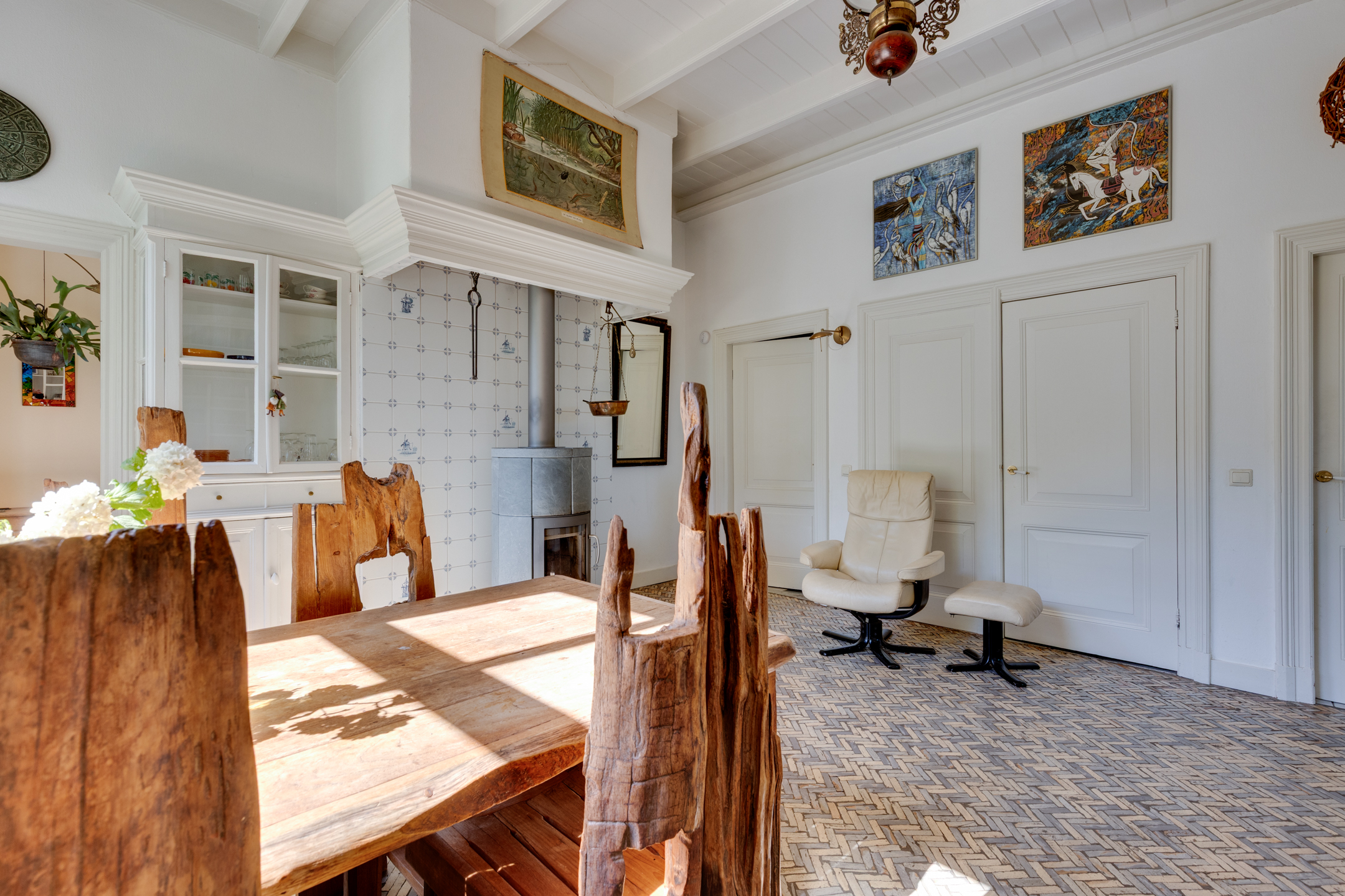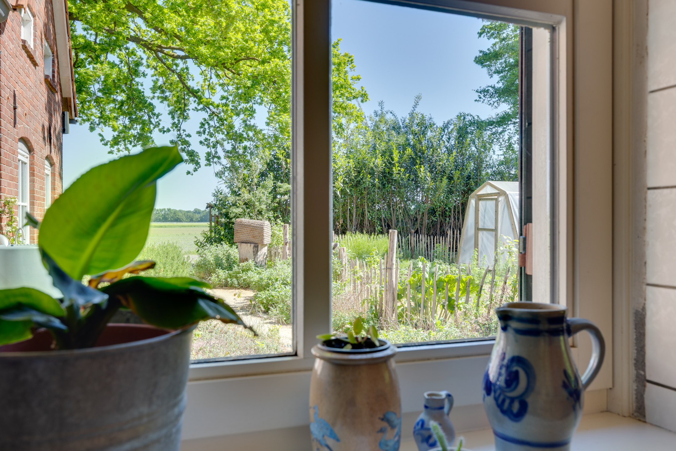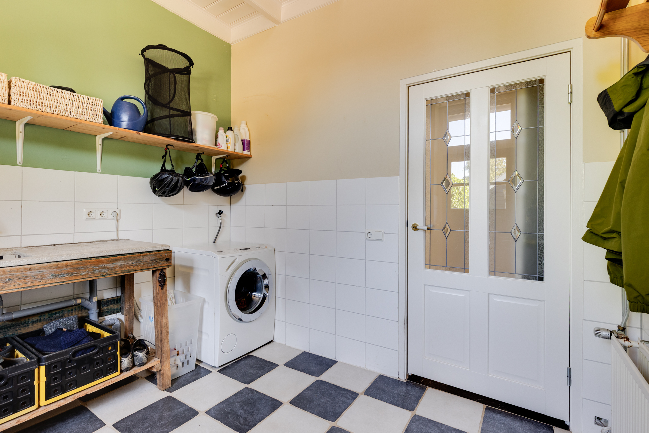 Begane grond: De entree bevindt zich in de aanbouw; hier kom je binnen in de grote hal die toegang biedt tot de toiletruimte en de centraal gelegen woon-/eetkamer. De toiletruimte is modern en voorzien van een wandcloset en fonteintje. De woon-/eetkamer heeft een authentieke look door potscheuren-vloer, de paneeldeuren, inbouwkast en schouw met speksteen houtkachel. De aangrenzende keuken beschikt over een inbouwkeuken in L-opstelling met een kookeiland in het midden. Aan de andere kant van de eetkamer is er toegang tot de knusse zit-/tv-kamer. De bijkeuken met achteruitgang grenst aan de zitkamer en is bereikbaar vanuit de hal. De hal biedt ook toegang tot de trapopgang en provisieruimte en heeft ook een deur naar de centrale eetkamer. De vaste kastruimte achter de fraaie paneeldeuren in de eetkamer, bevindt zich onder de trapopgang.