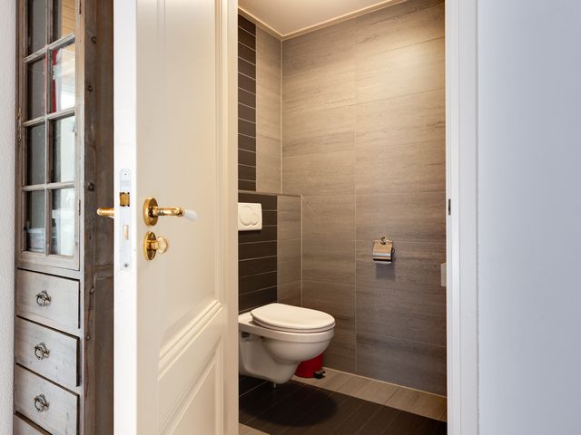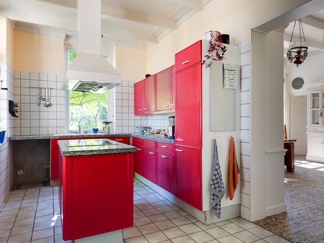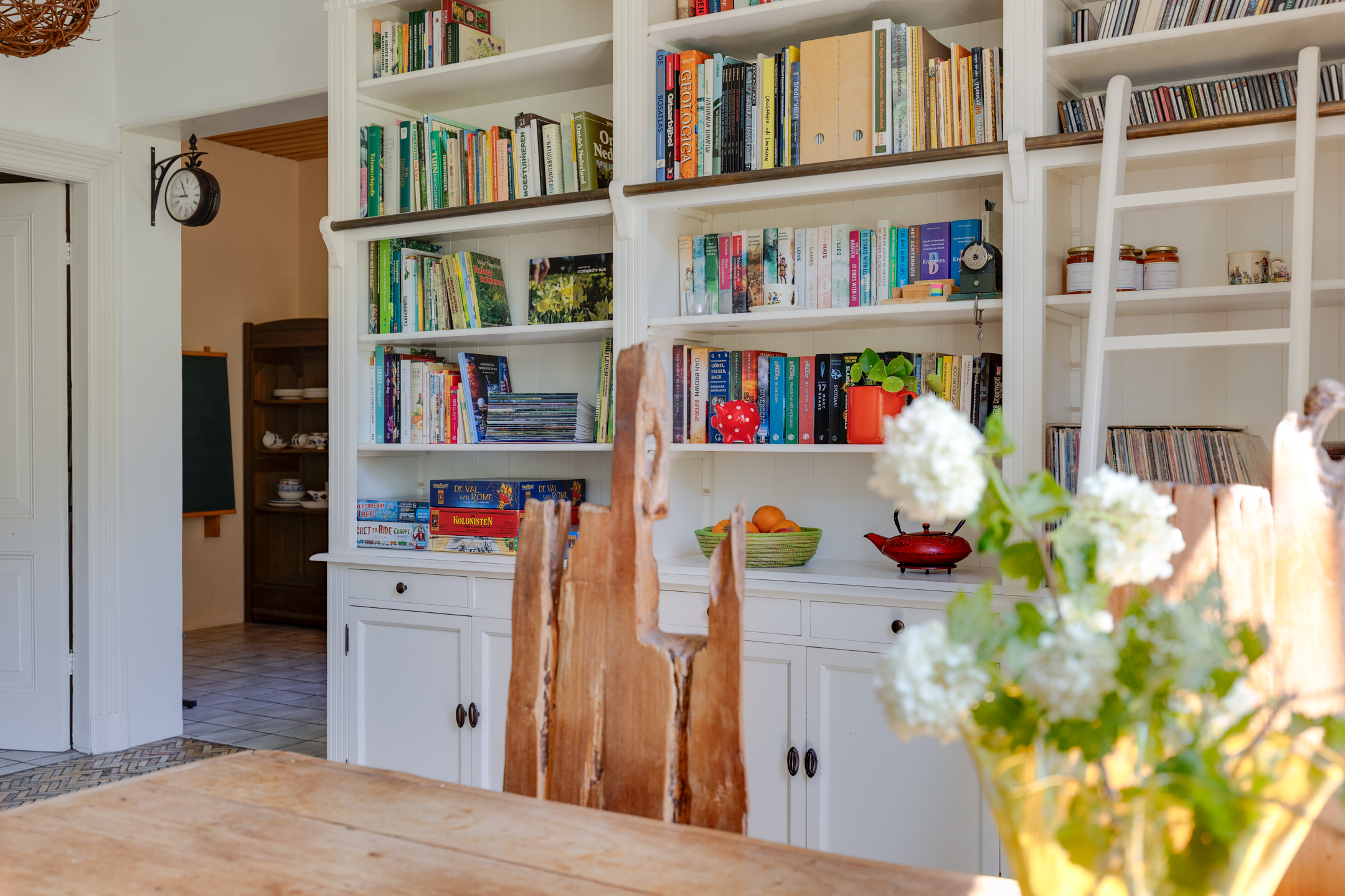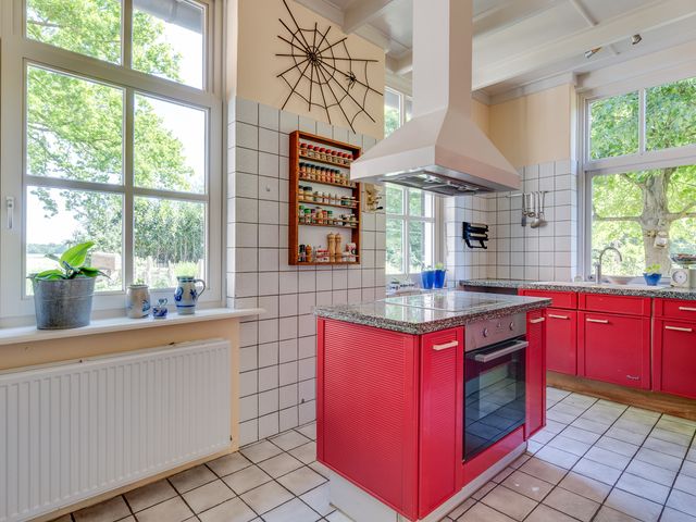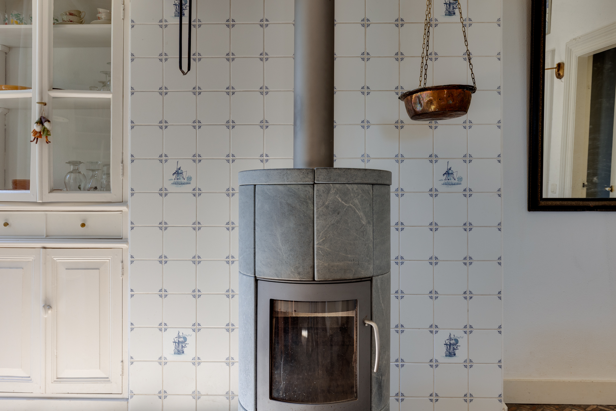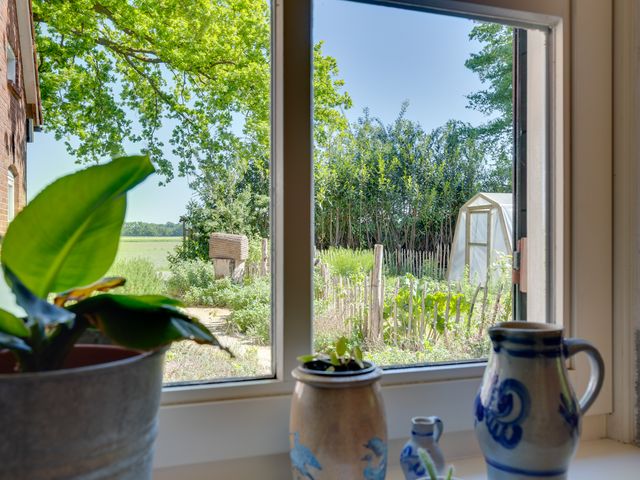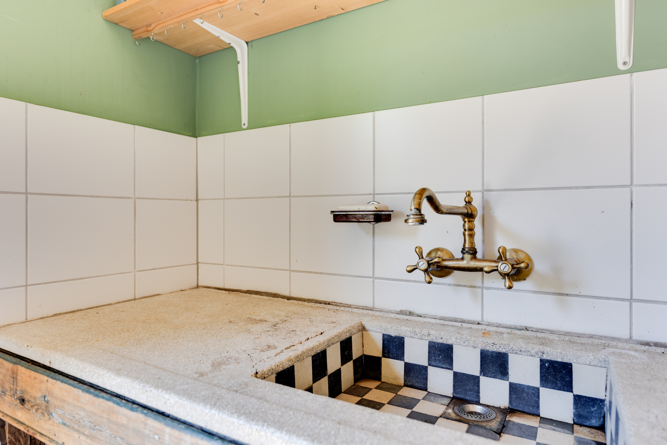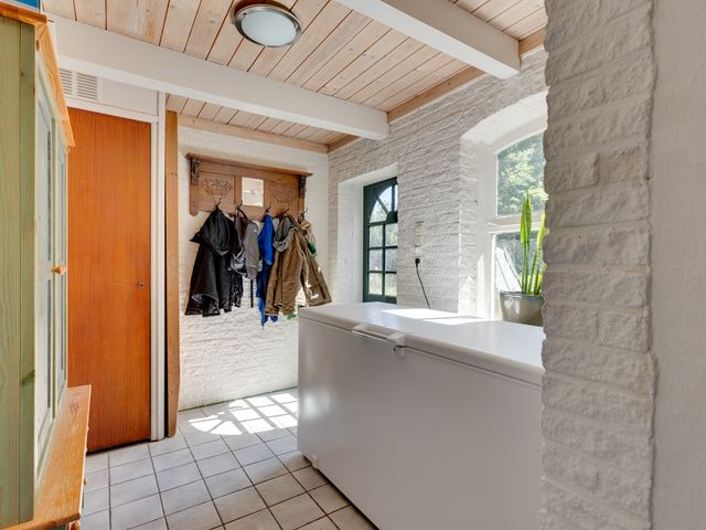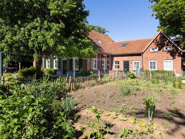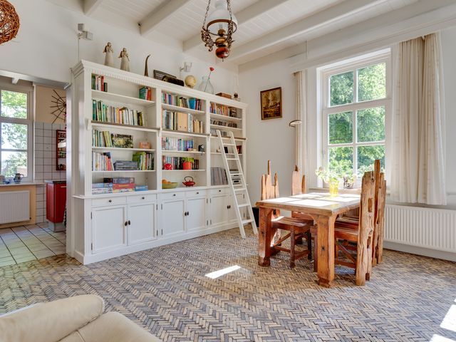Begane grond: De entree bevindt zich in de aanbouw; hier kom je binnen in de grote hal die toegang biedt tot de toiletruimte en de centraal gelegen woon-/eetkamer. De toiletruimte is modern en voorzien van een wandcloset en fonteintje. De woon-/eetkamer heeft een authentieke look door potscheuren-vloer, de paneeldeuren, inbouwkast en schouw met speksteen houtkachel. De aangrenzende keuken beschikt over een inbouwkeuken in L-opstelling met een kookeiland in het midden. Aan de andere kant van de eetkamer is er toegang tot de knusse zit-/tv-kamer. De bijkeuken met achteruitgang grenst aan de zitkamer en is bereikbaar vanuit de hal. De hal biedt ook toegang tot de trapopgang en provisieruimte en heeft ook een deur naar de centrale eetkamer. De vaste kastruimte achter de fraaie paneeldeuren in de eetkamer, bevindt zich onder de trapopgang.