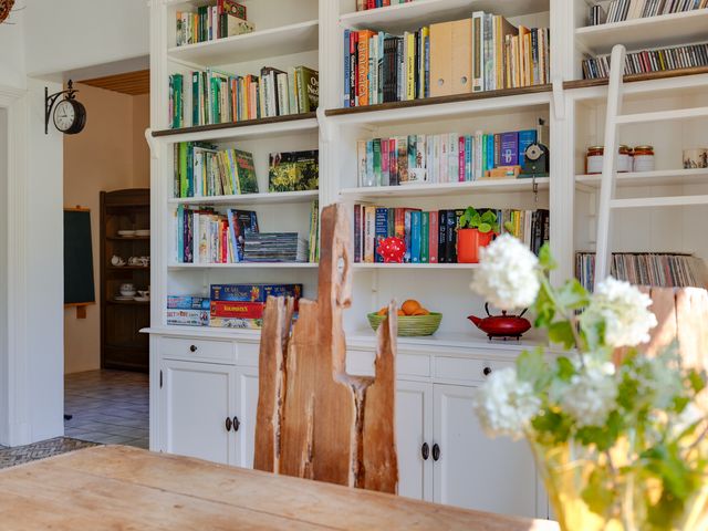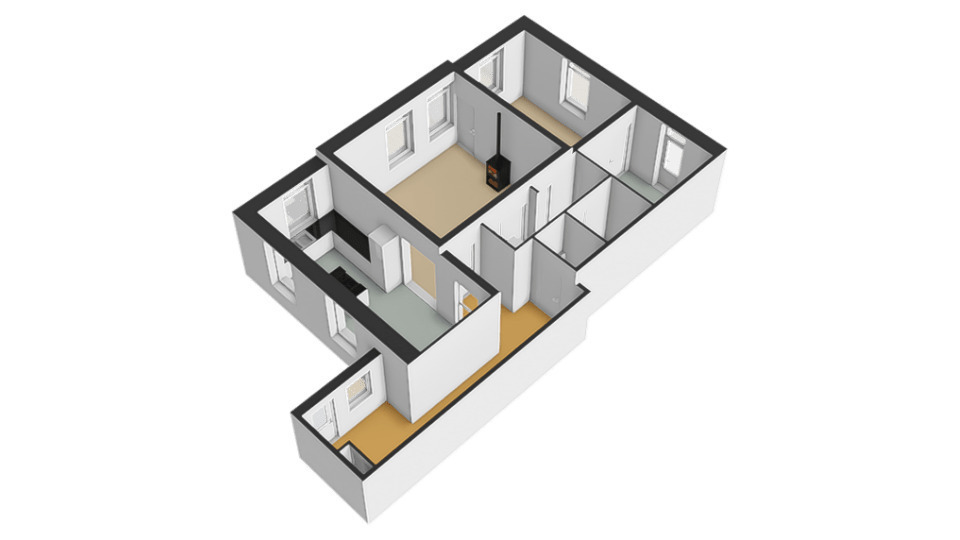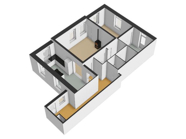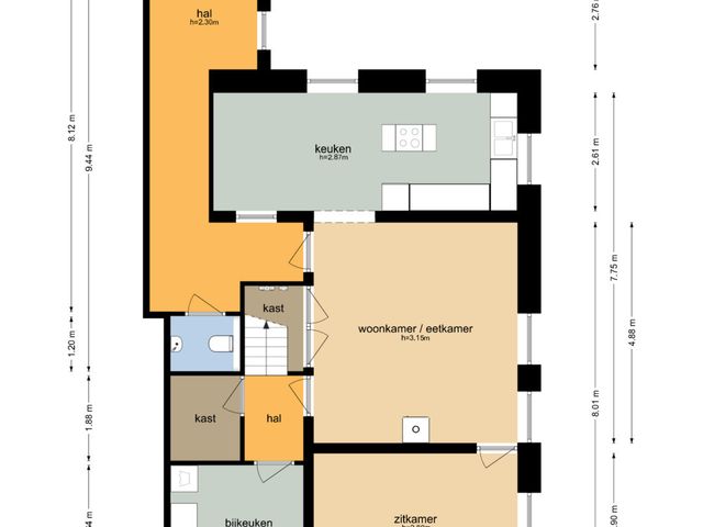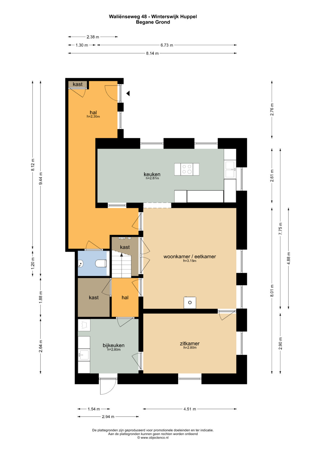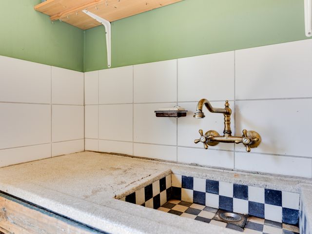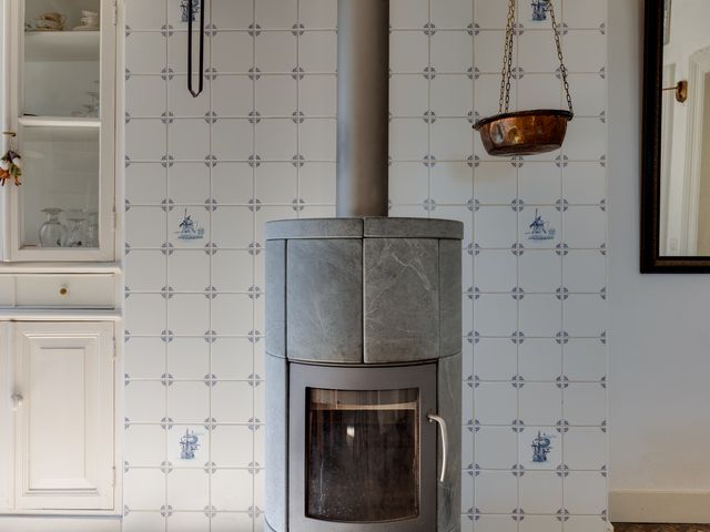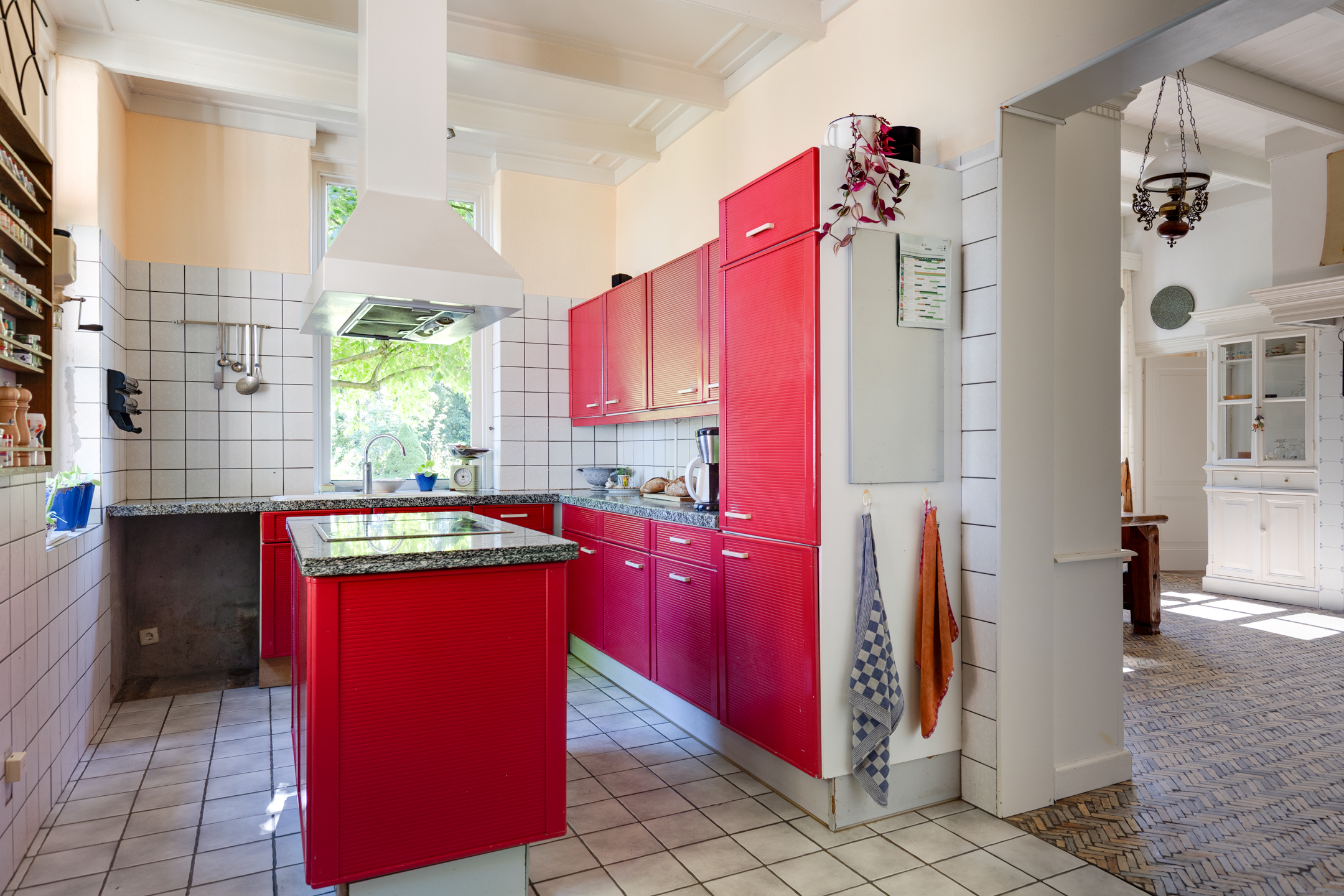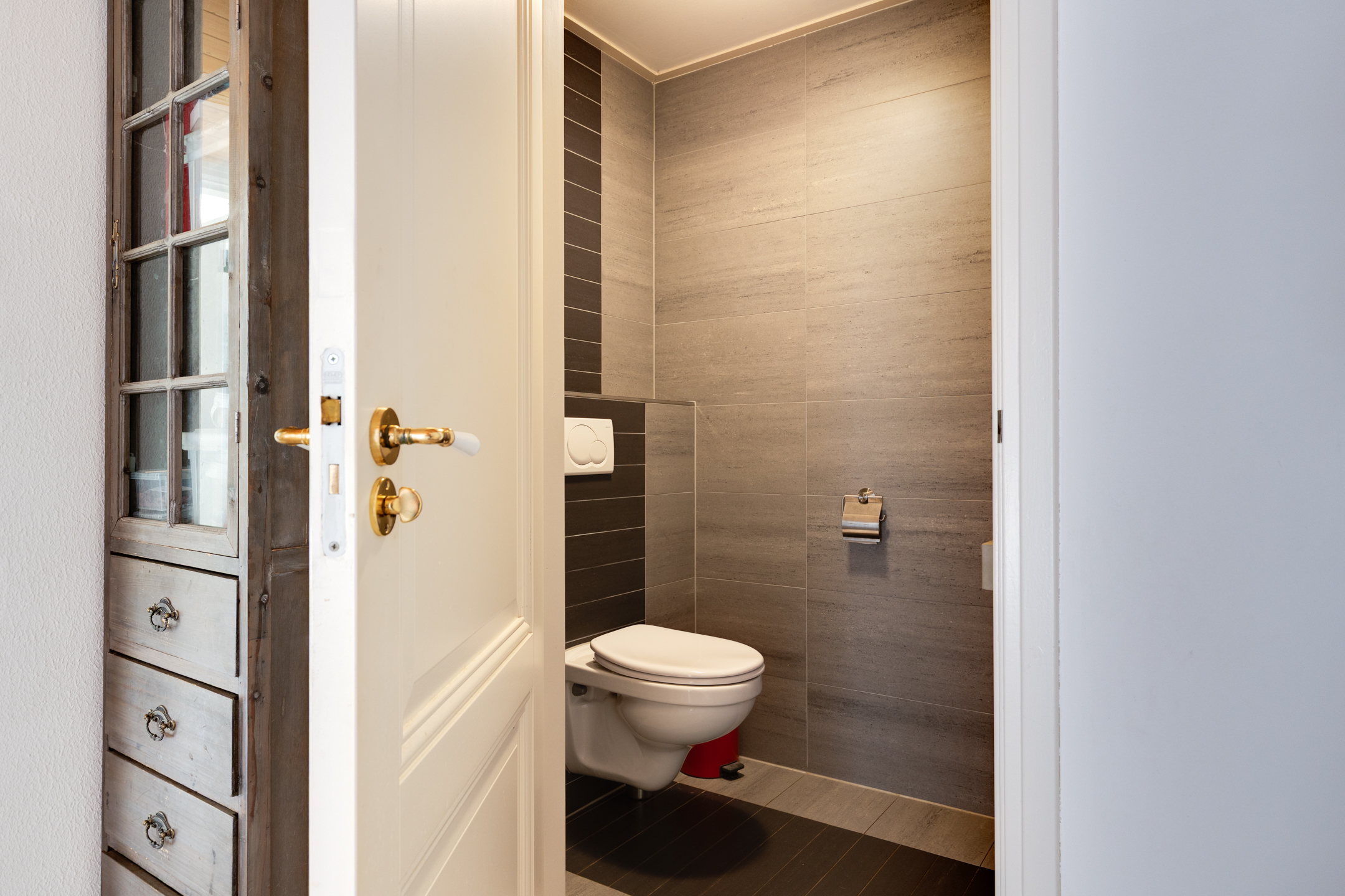 Begane grond: De entree bevindt zich in de aanbouw; hier kom je binnen in de grote hal die toegang biedt tot de toiletruimte en de centraal gelegen woon-/eetkamer. De toiletruimte is modern en voorzien van een wandcloset en fonteintje. De woon-/eetkamer heeft een authentieke look door potscheuren-vloer, de paneeldeuren, inbouwkast en schouw met speksteen houtkachel. De aangrenzende keuken beschikt over een inbouwkeuken in L-opstelling met een kookeiland in het midden. Aan de andere kant van de eetkamer is er toegang tot de knusse zit-/tv-kamer. De bijkeuken met achteruitgang grenst aan de zitkamer en is bereikbaar vanuit de hal. De hal biedt ook toegang tot de trapopgang en provisieruimte en heeft ook een deur naar de centrale eetkamer. De vaste kastruimte achter de fraaie paneeldeuren in de eetkamer, bevindt zich onder de trapopgang.
