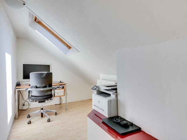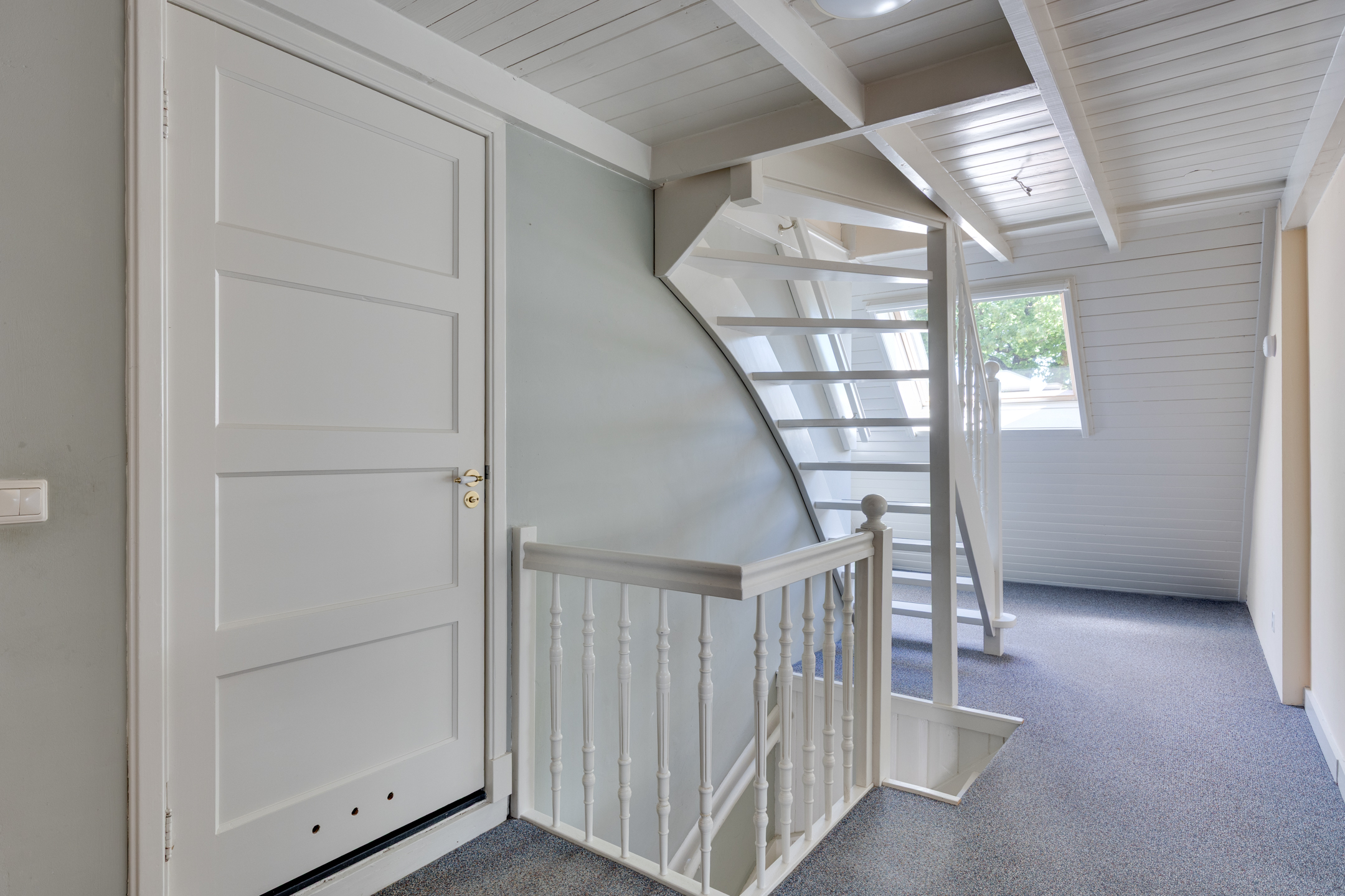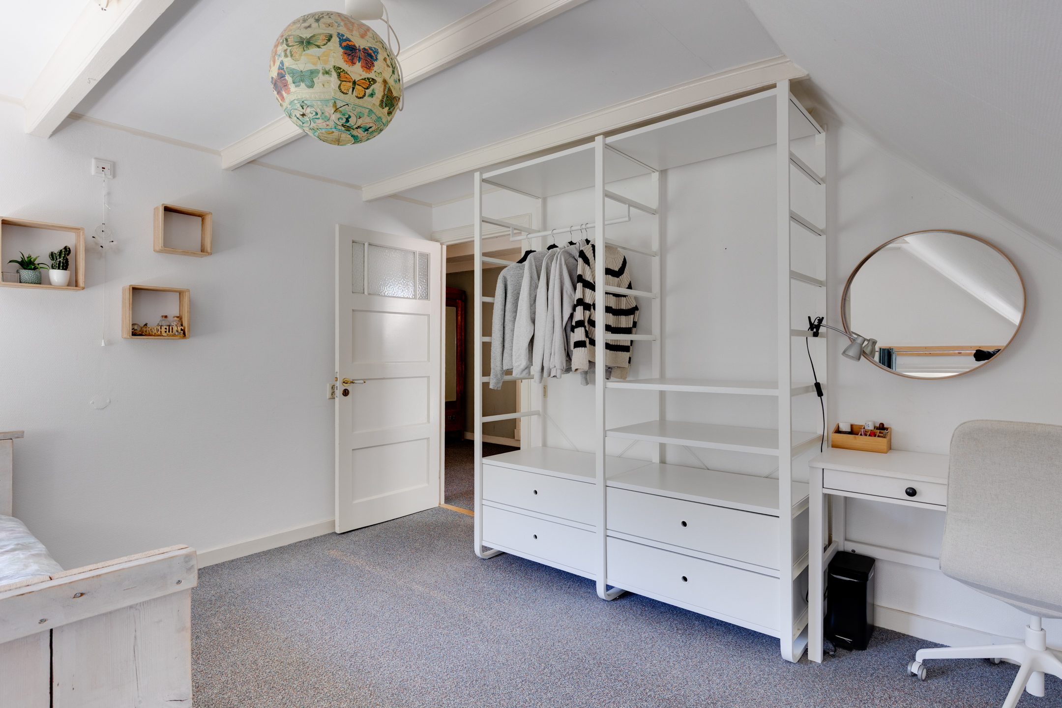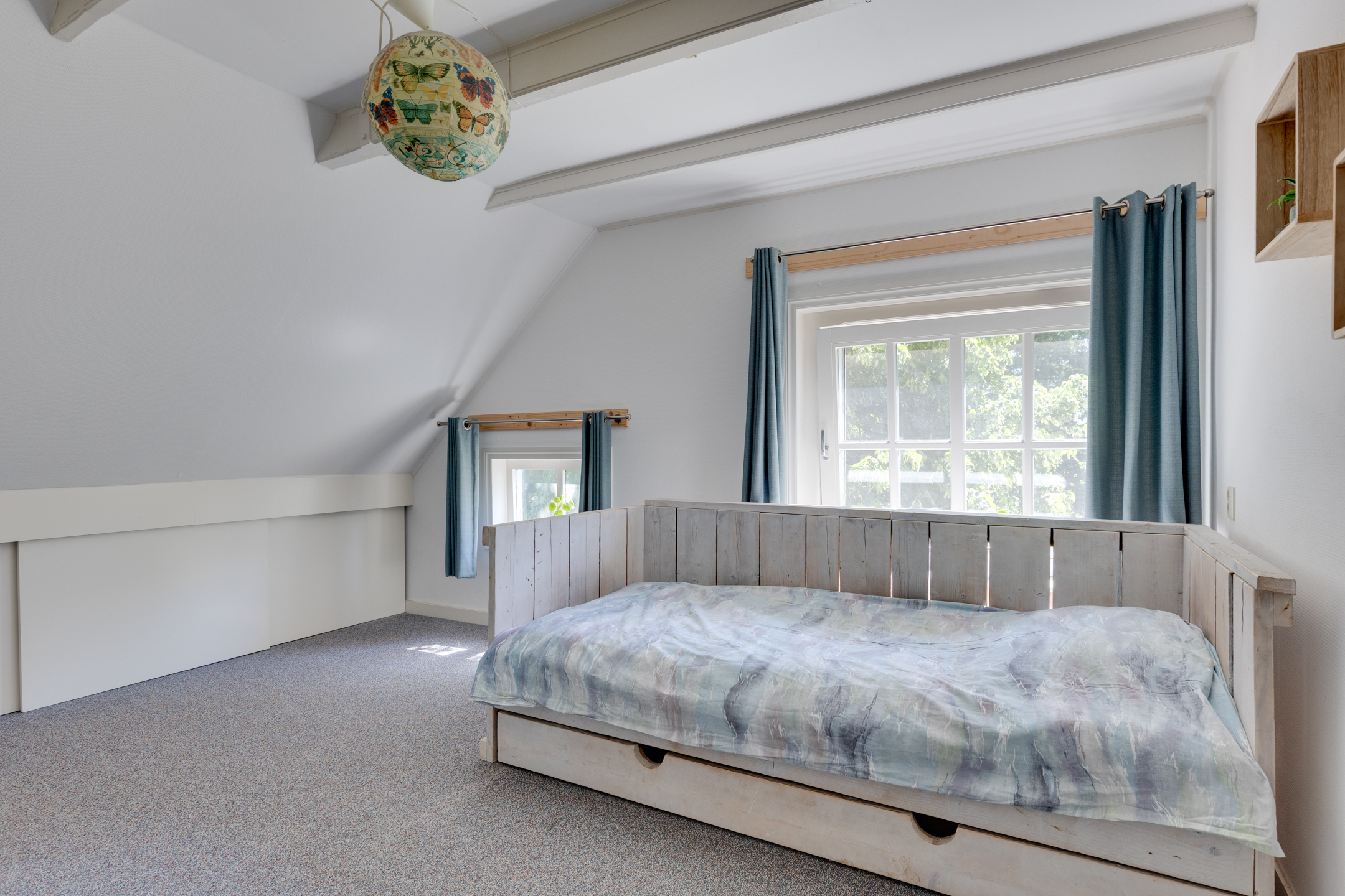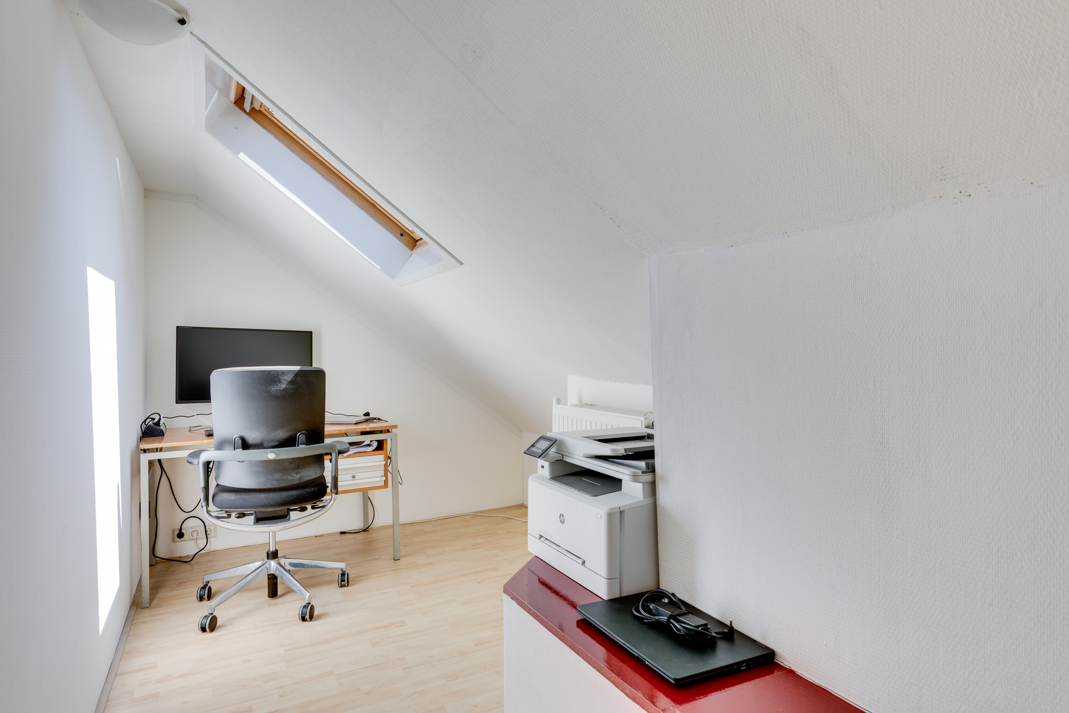 Eerste verdieping: Vanuit de overloop is er toegang tot 2 slaapkamers, de badkamer, de kantoorruimte en de grote zolderruimte. De beide ruimtes die als slaapkamer in gebruik zijn liggen aan de voorzijde. Beide zijn voorzien van een groot draai-/kiepraam. De badkamer is modern en voorzien van een ruime inloopdouche met dubbele regendouche, wastafel/-kom, hoekligbad en wandcloset. De kantoorruimte bevindt zich boven de aanbouw en is net als de overloop voorzien van een dakraam. De cv-ketel hangt op de grote zolderruimte op deze verdieping.