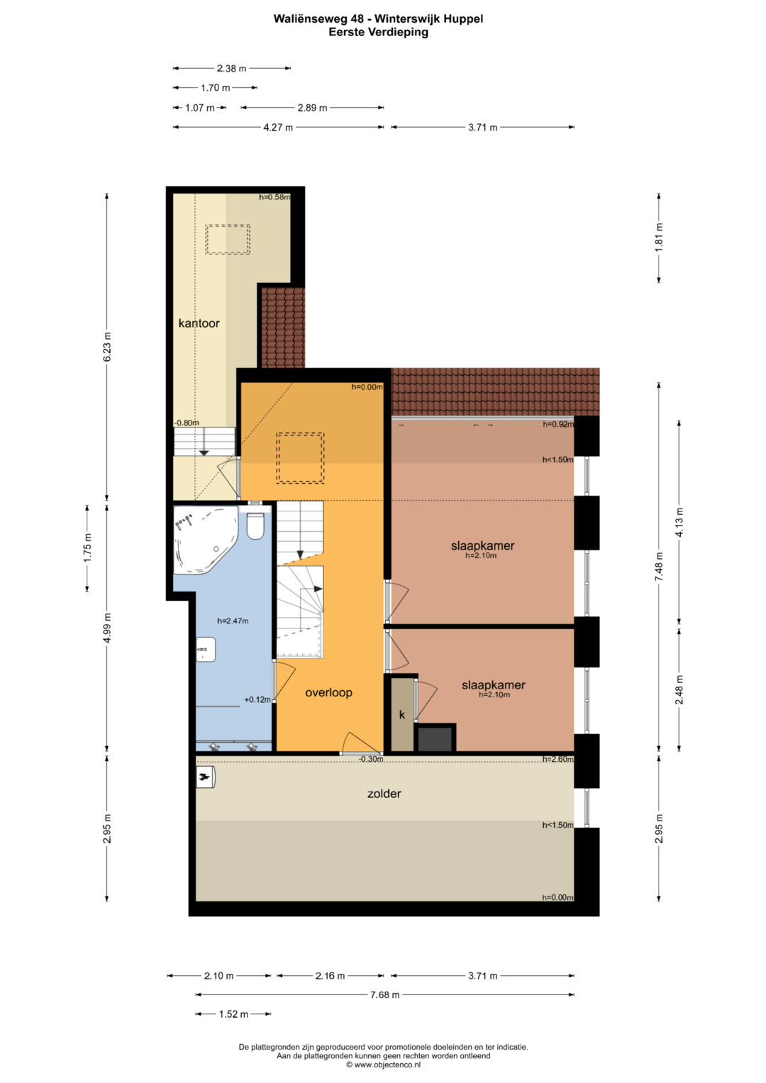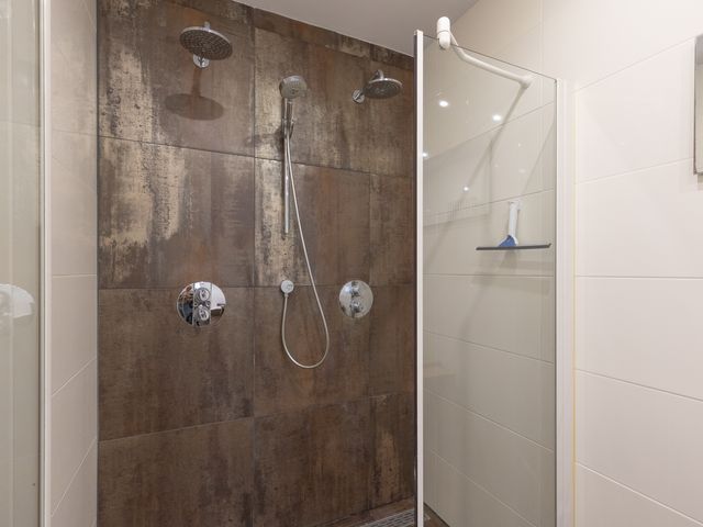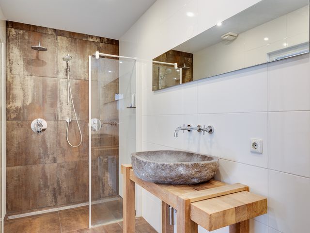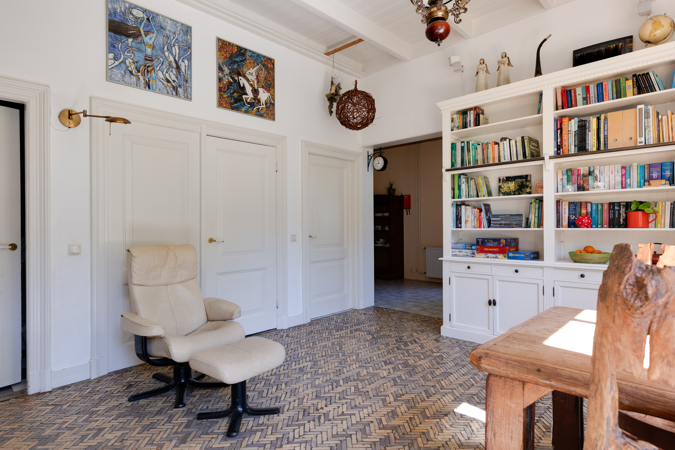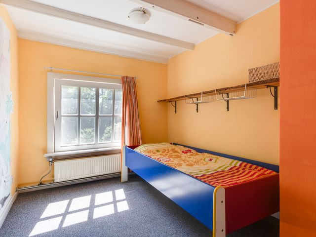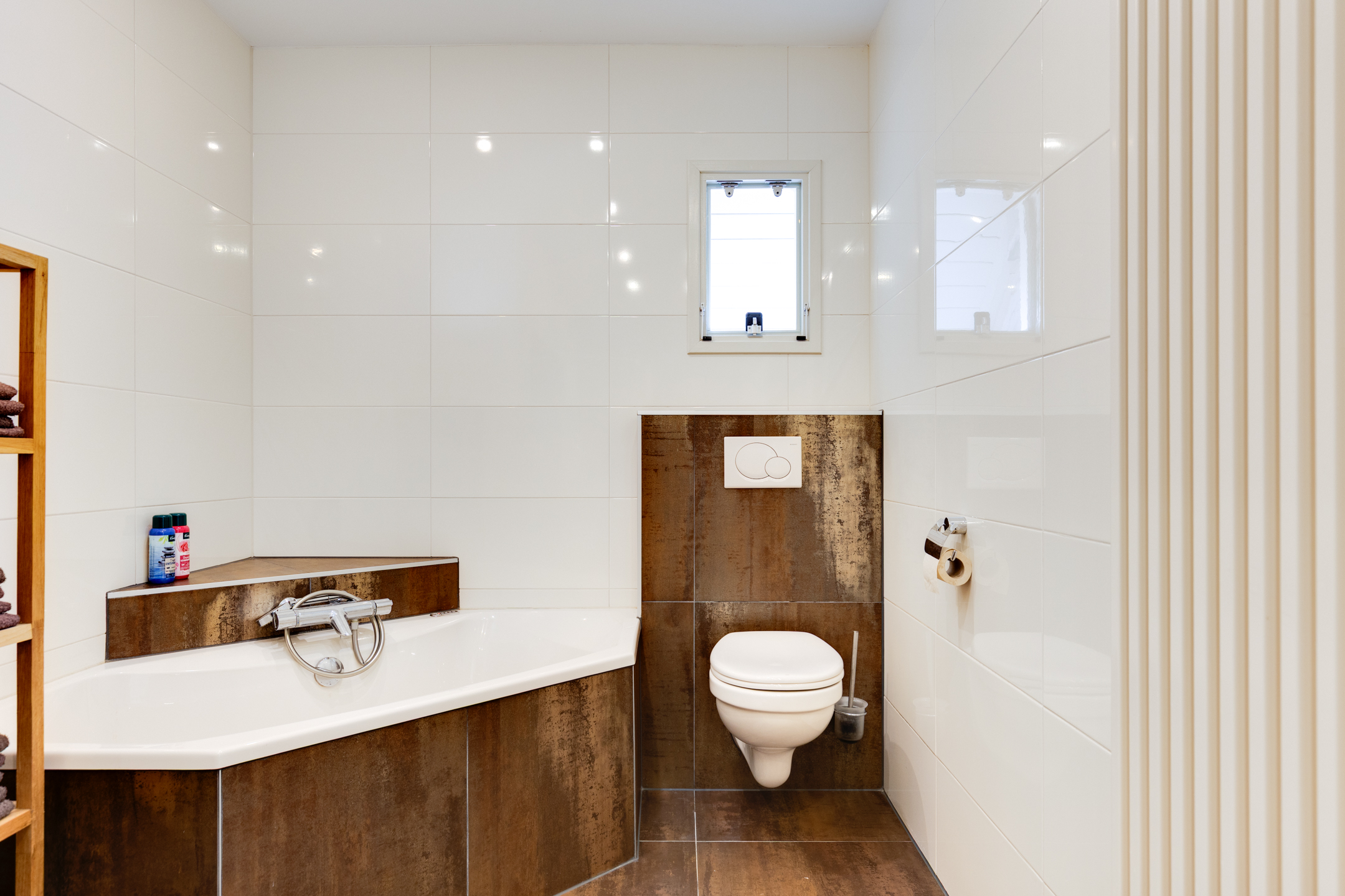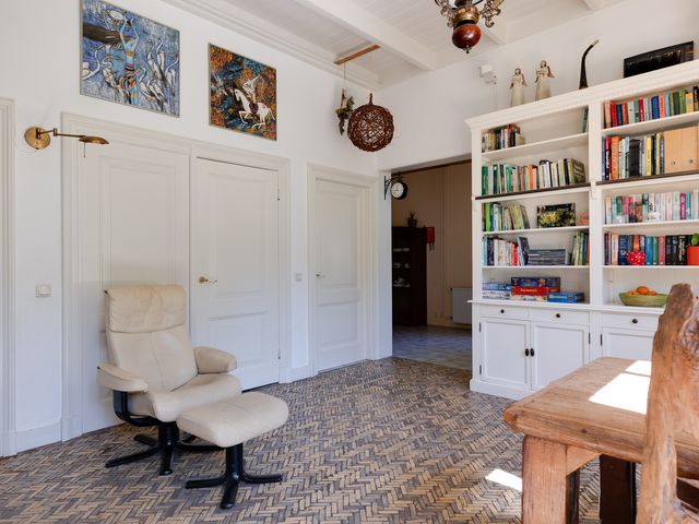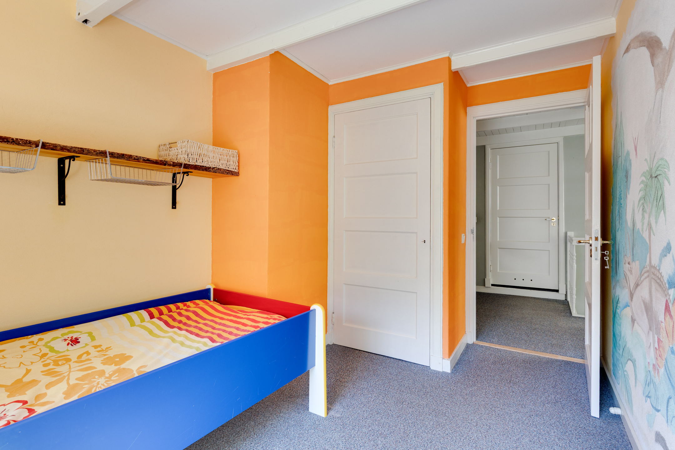 Eerste verdieping: Vanuit de overloop is er toegang tot 2 slaapkamers, de badkamer, de kantoorruimte en de grote zolderruimte. De beide ruimtes die als slaapkamer in gebruik zijn liggen aan de voorzijde. Beide zijn voorzien van een groot draai-/kiepraam. De badkamer is modern en voorzien van een ruime inloopdouche met dubbele regendouche, wastafel/-kom, hoekligbad en wandcloset. De kantoorruimte bevindt zich boven de aanbouw en is net als de overloop voorzien van een dakraam. De cv-ketel hangt op de grote zolderruimte op deze verdieping.