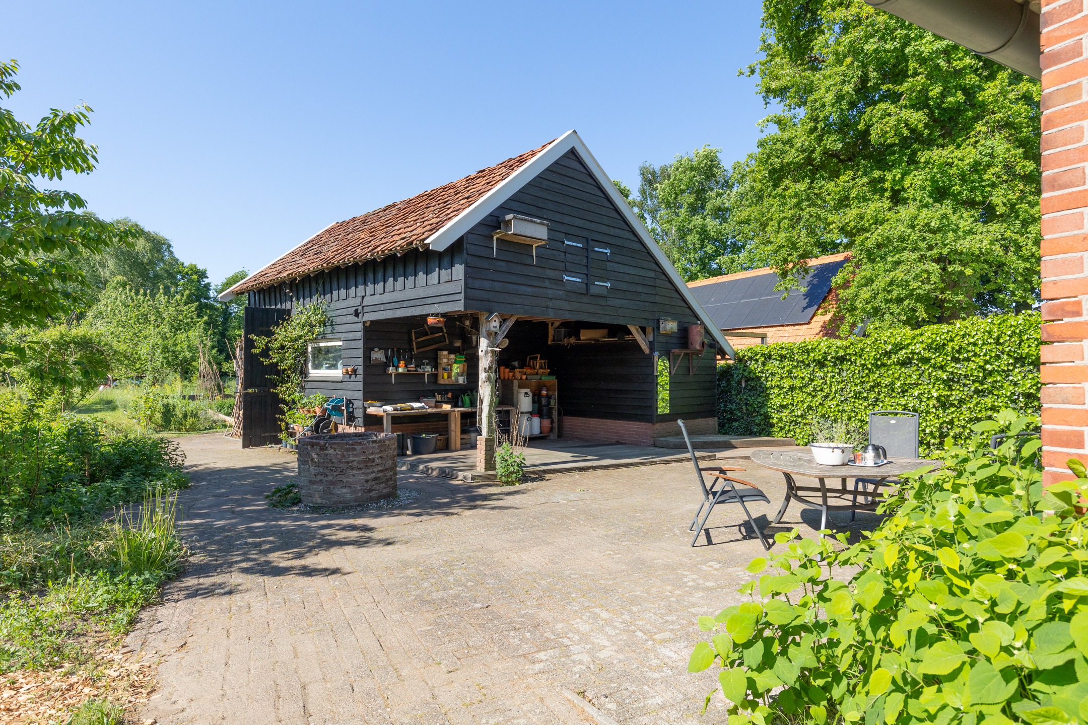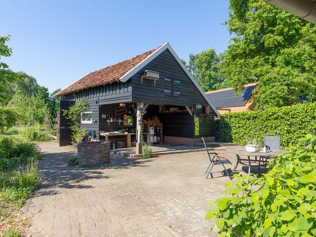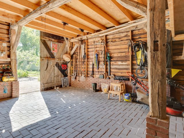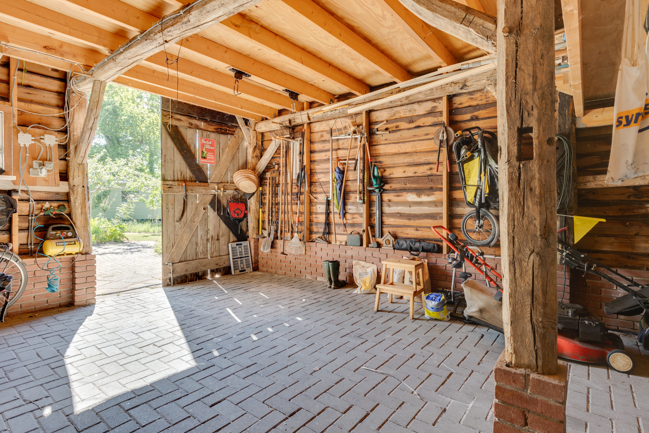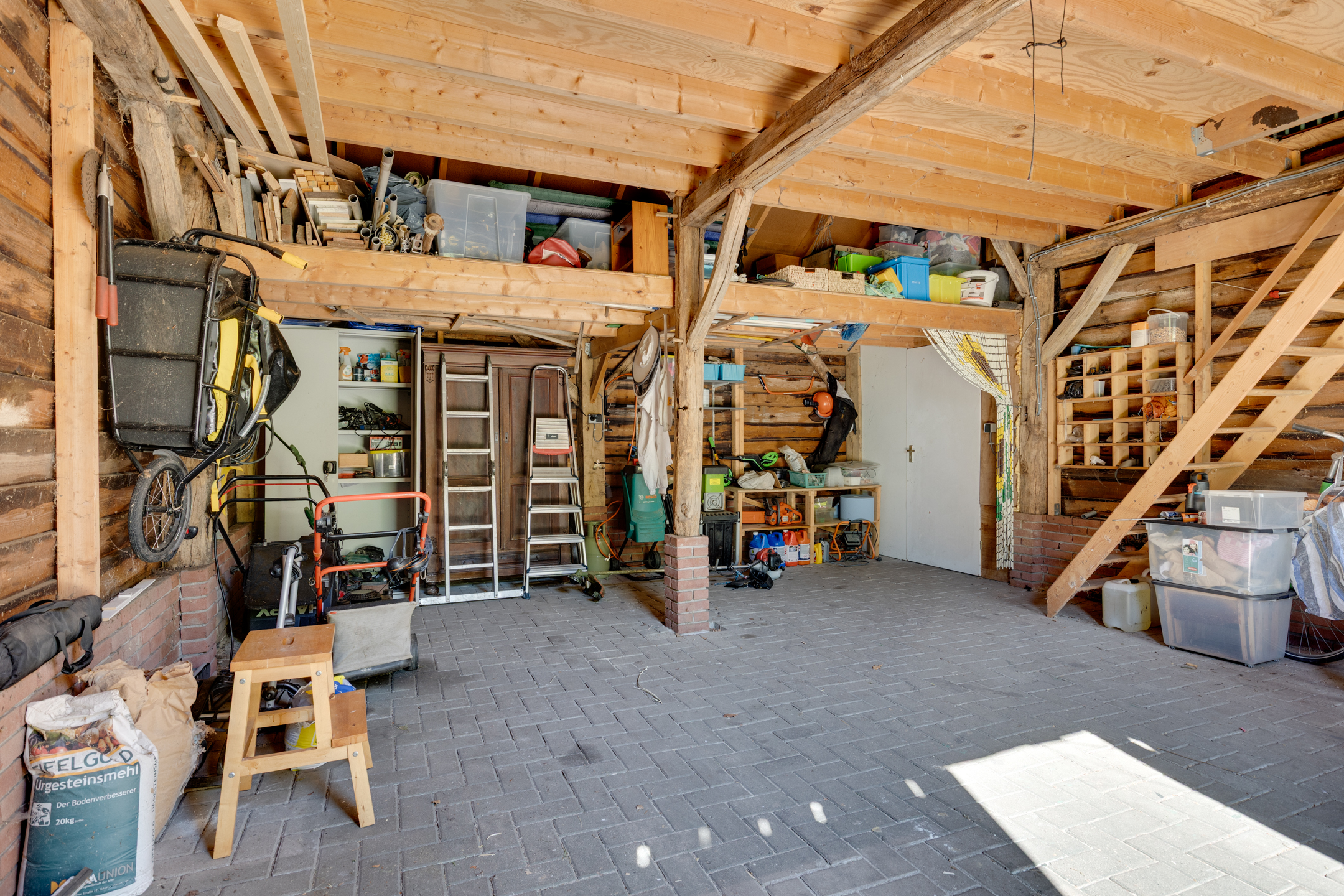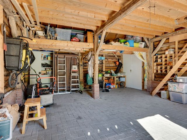 De grote houten schuur/werkplaats biedt ruimte voor voertuigen en gereedschappen en heeft een vaste trap naar de zolderruimte/vliering. Aan de voorzijde van deze grote schuur bevindt zich een overdekt terras.