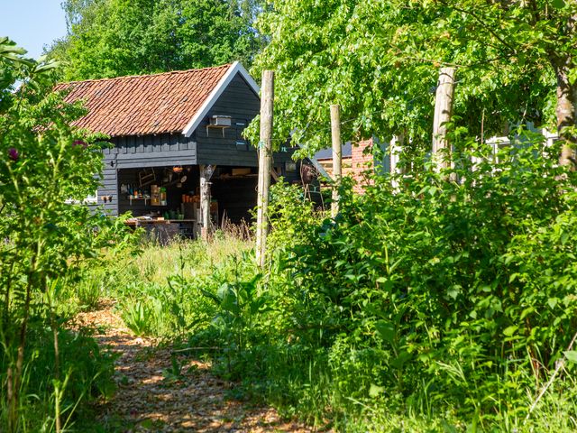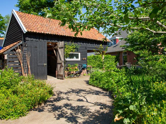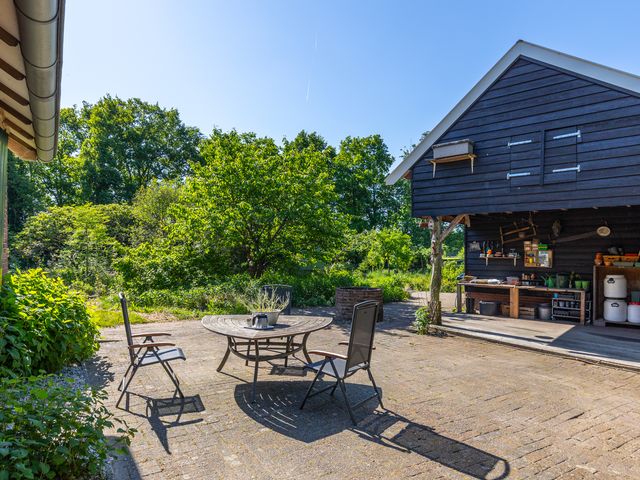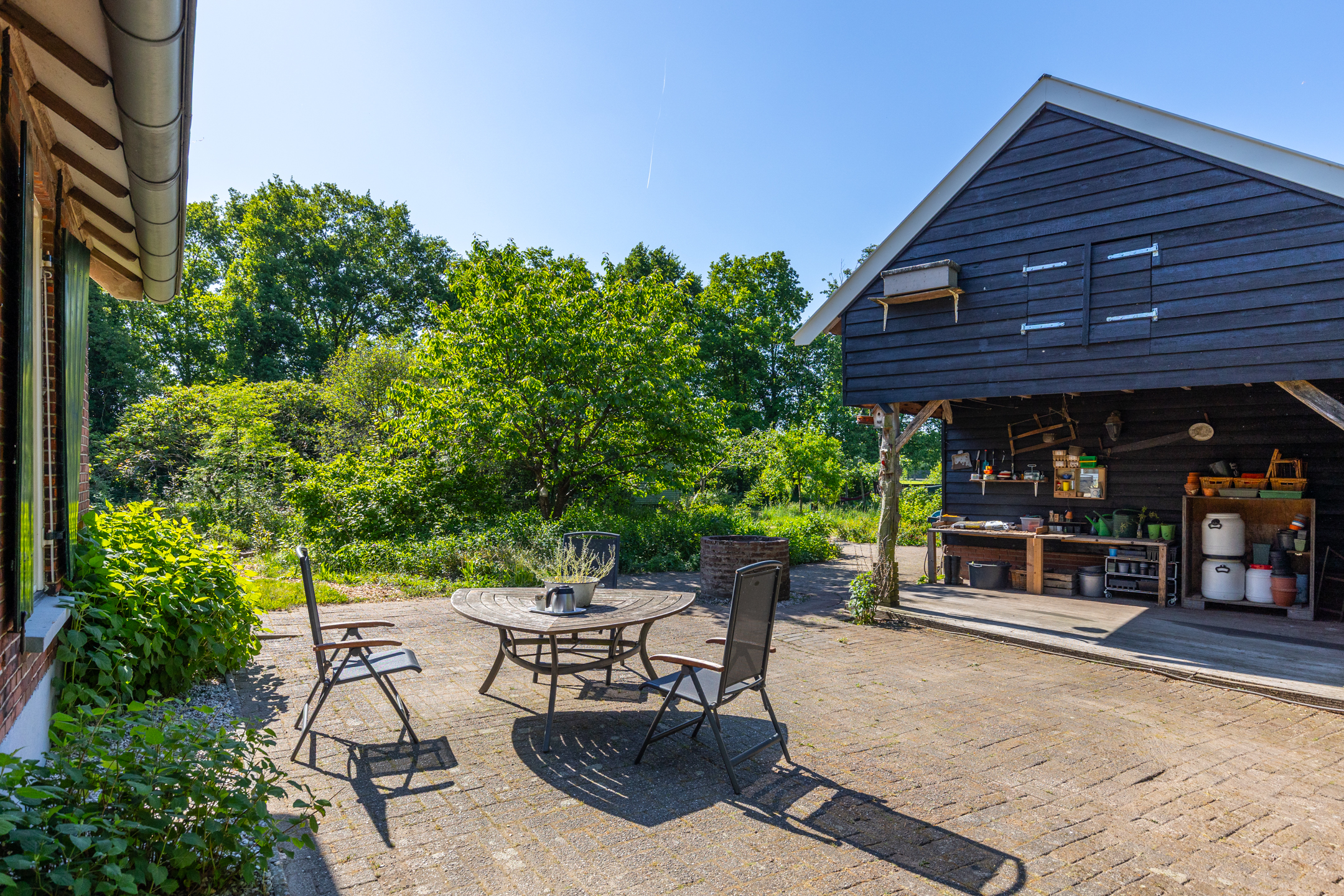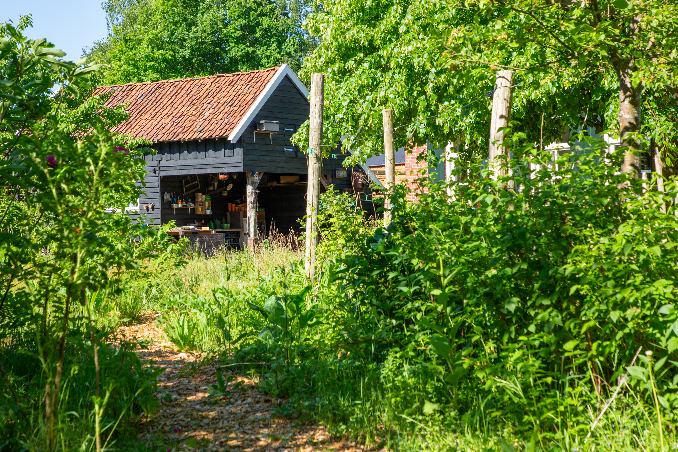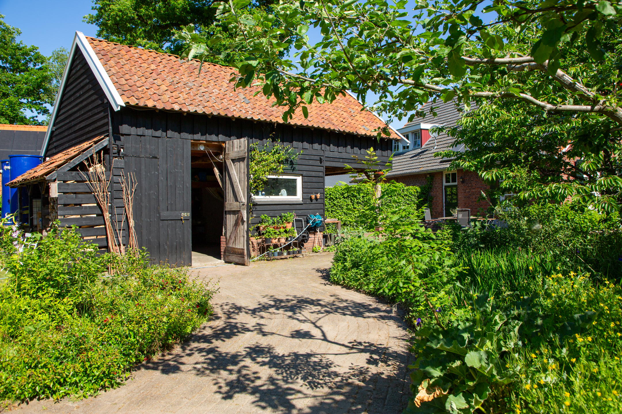 De grote houten schuur/werkplaats biedt ruimte voor voertuigen en gereedschappen en heeft een vaste trap naar de zolderruimte/vliering. Aan de voorzijde van deze grote schuur bevindt zich een overdekt terras.