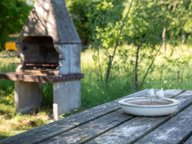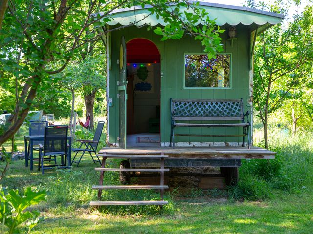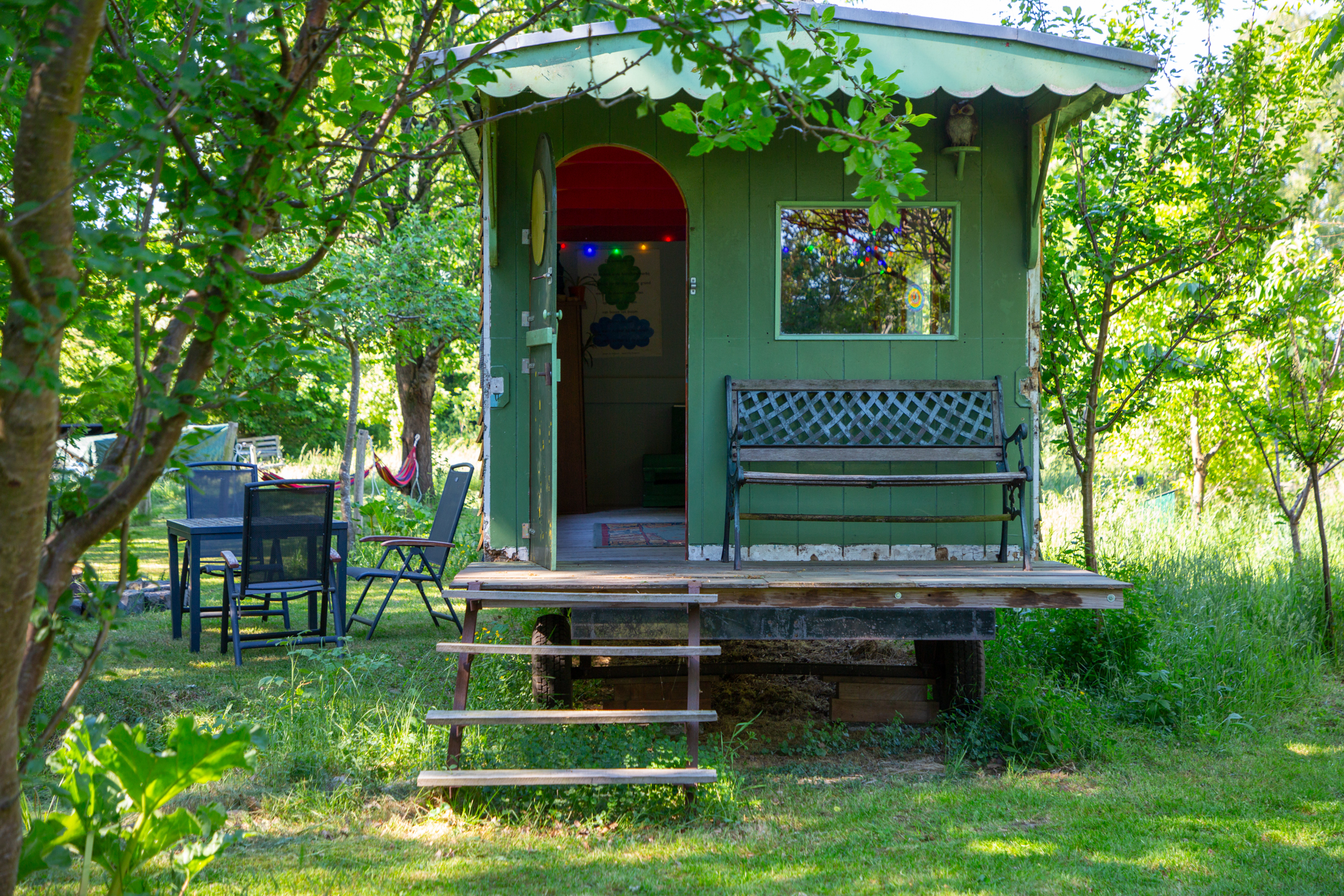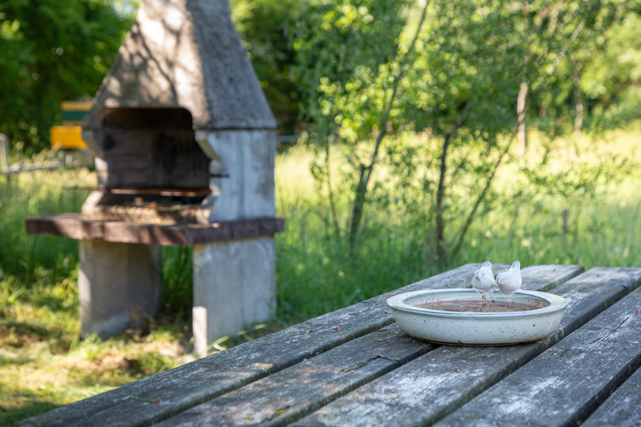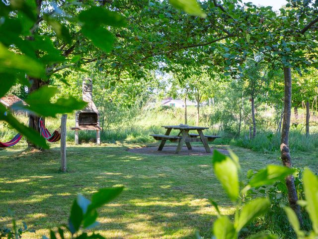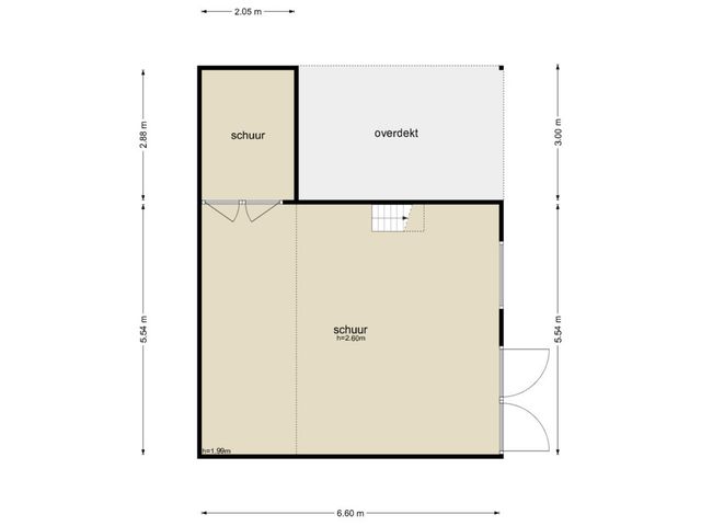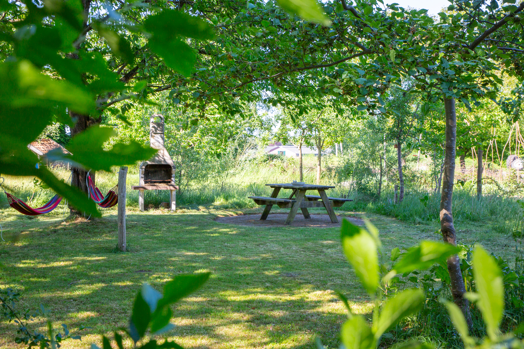 De grote houten schuur/werkplaats biedt ruimte voor voertuigen en gereedschappen en heeft een vaste trap naar de zolderruimte/vliering. Aan de voorzijde van deze grote schuur bevindt zich een overdekt terras.