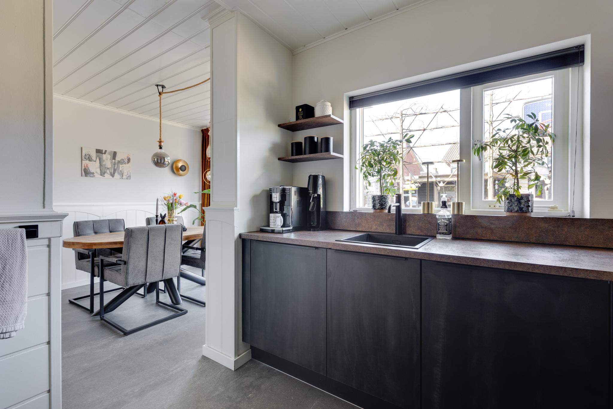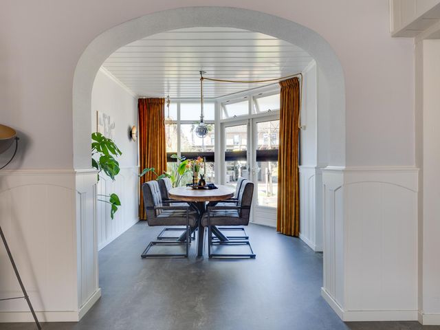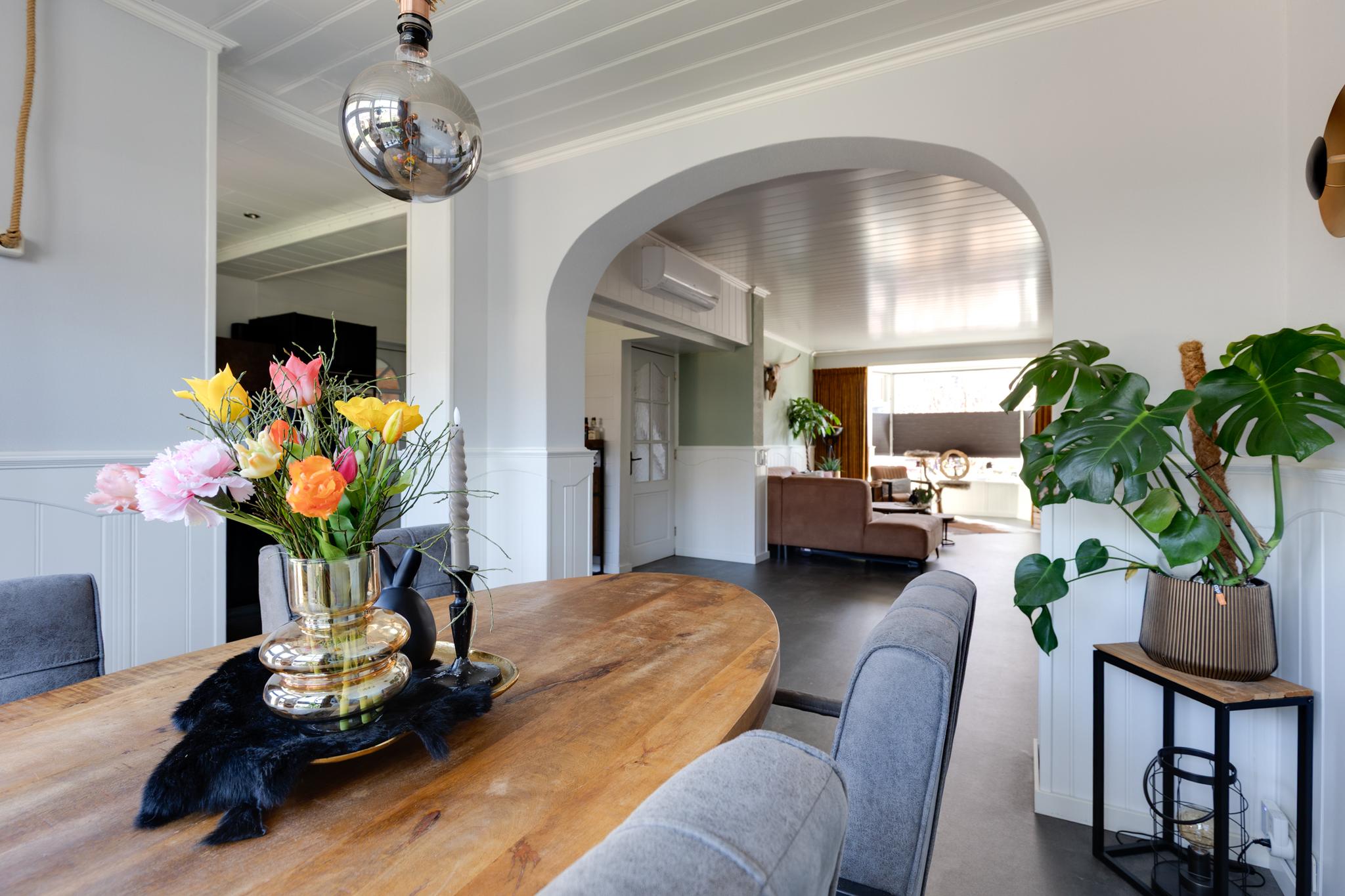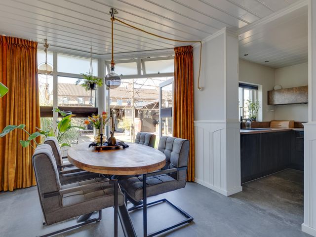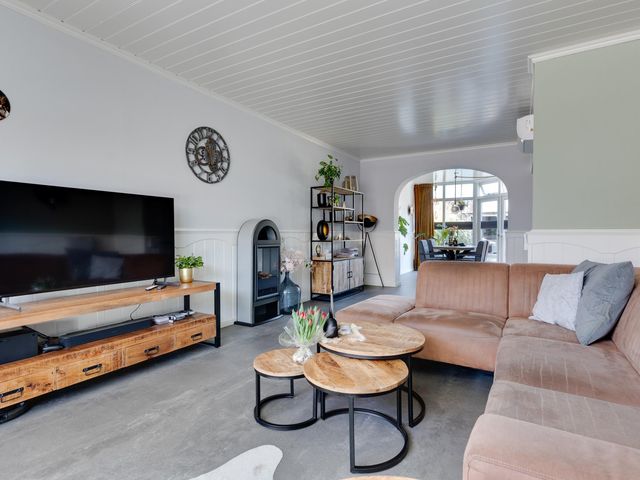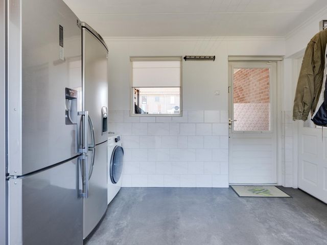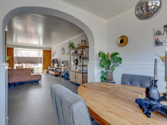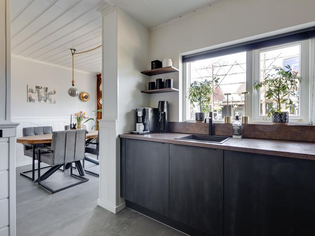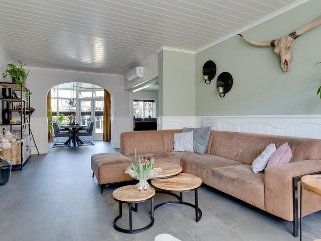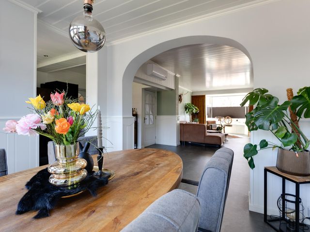 Aan de achterzijde is de woning flink uitgebouwd met een grote bijkeuken, keuken en eetkamer.