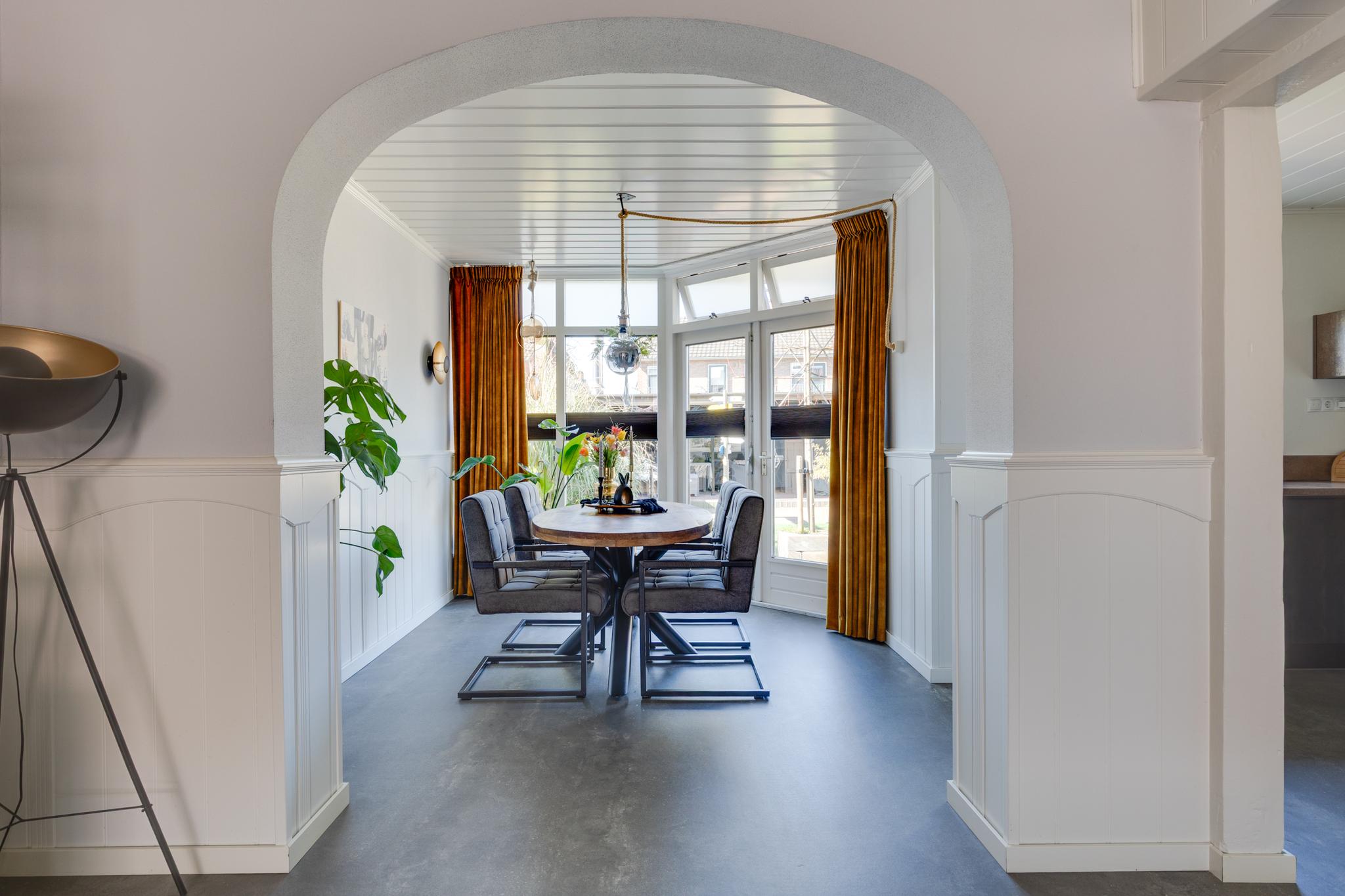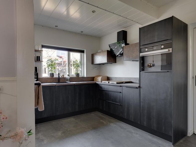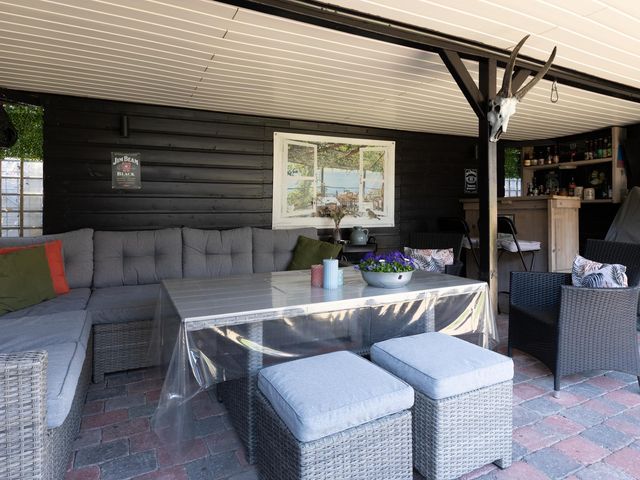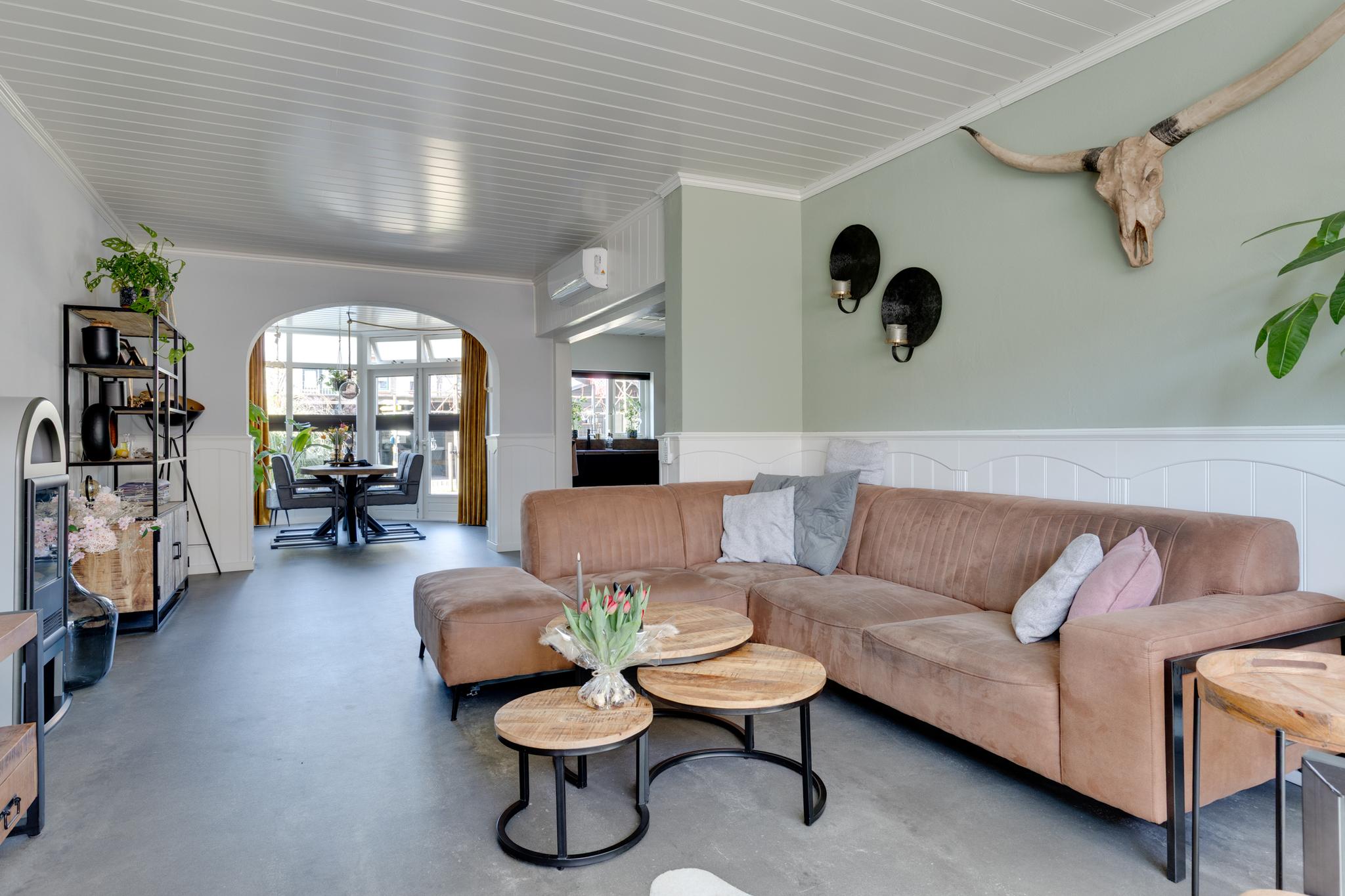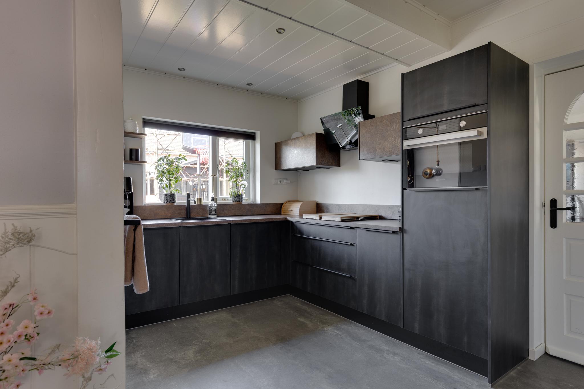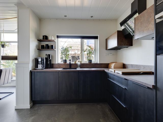 Aan de achterzijde is de woning flink uitgebouwd met een grote bijkeuken, keuken en eetkamer.