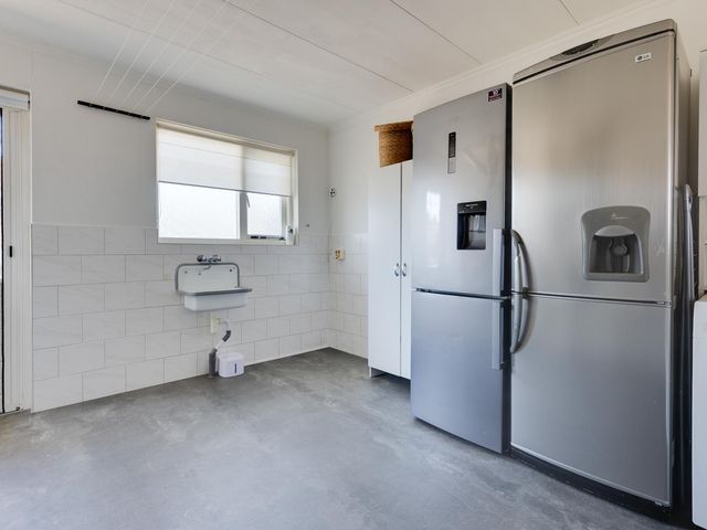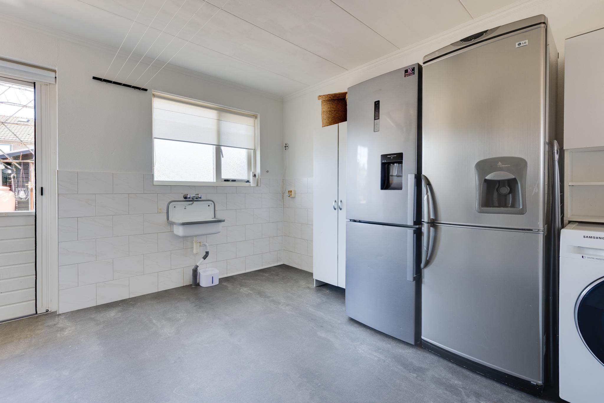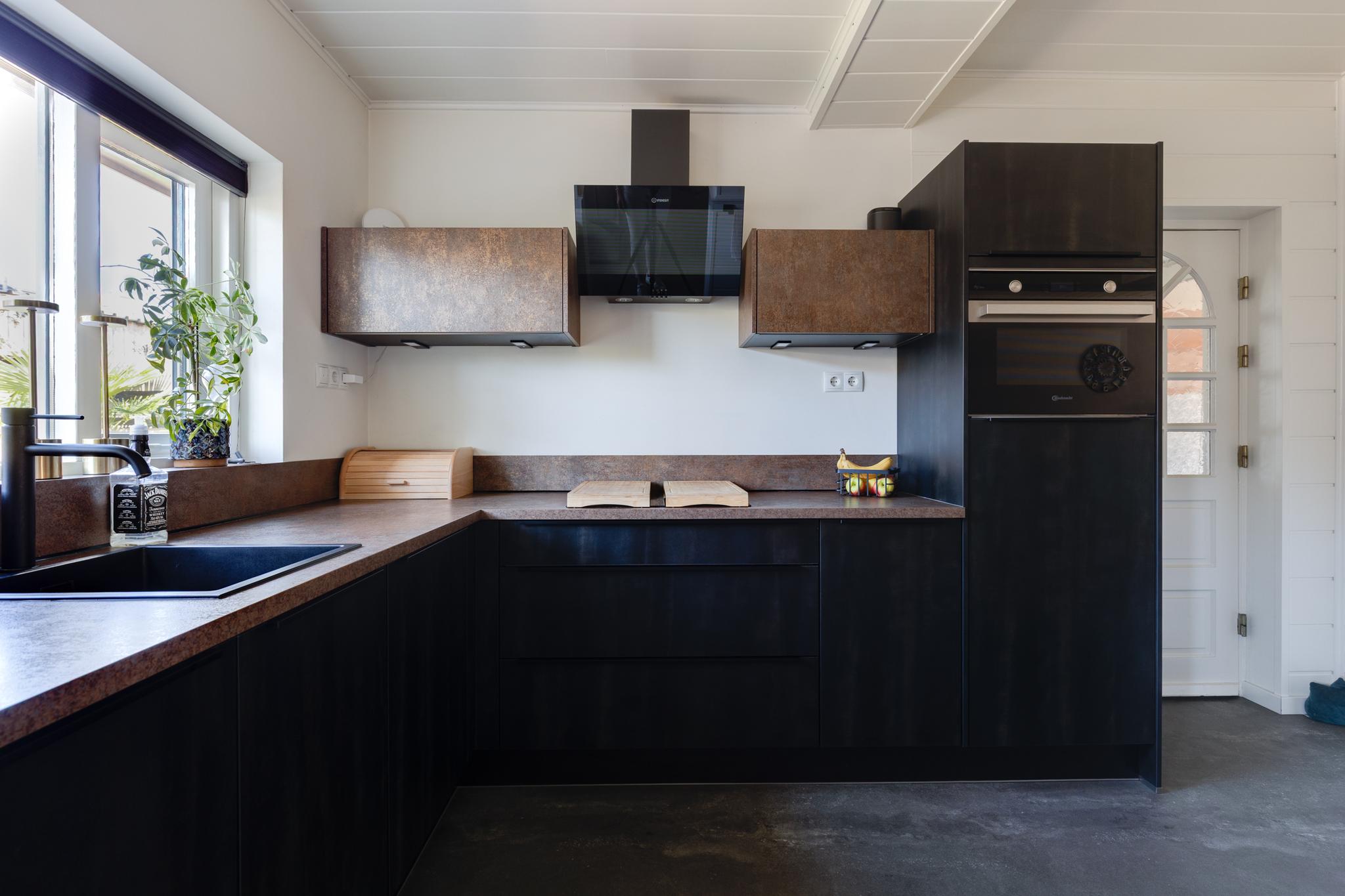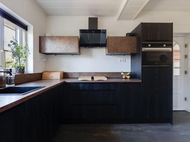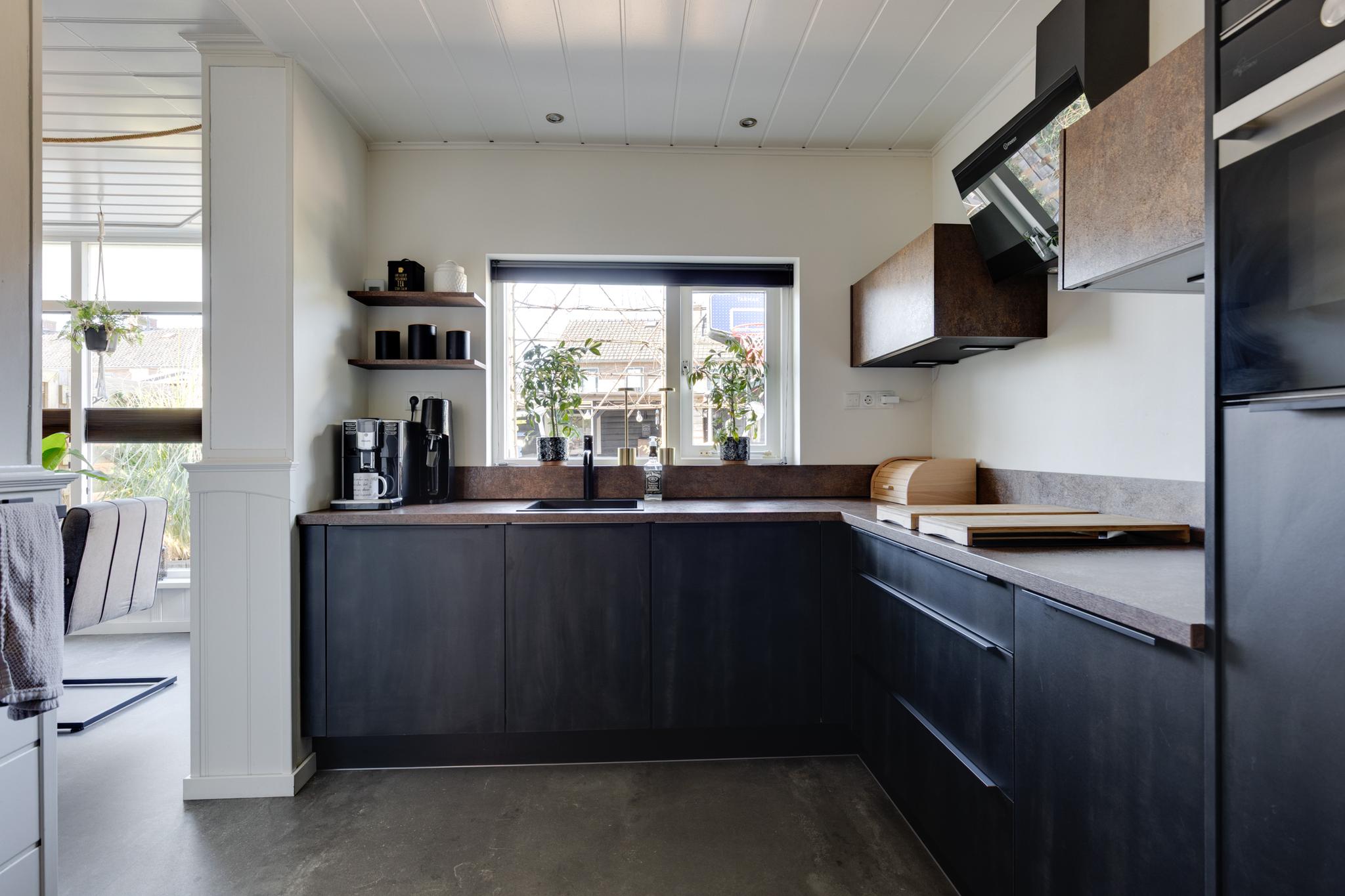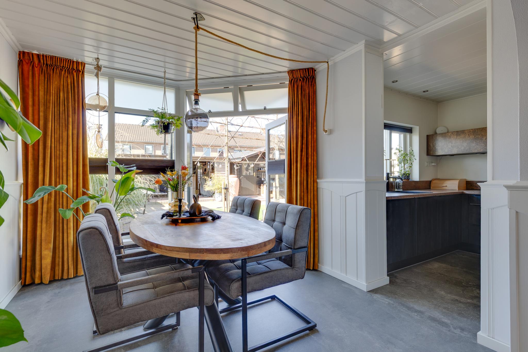 Aan de achterzijde is de woning flink uitgebouwd met een grote bijkeuken, keuken en eetkamer.