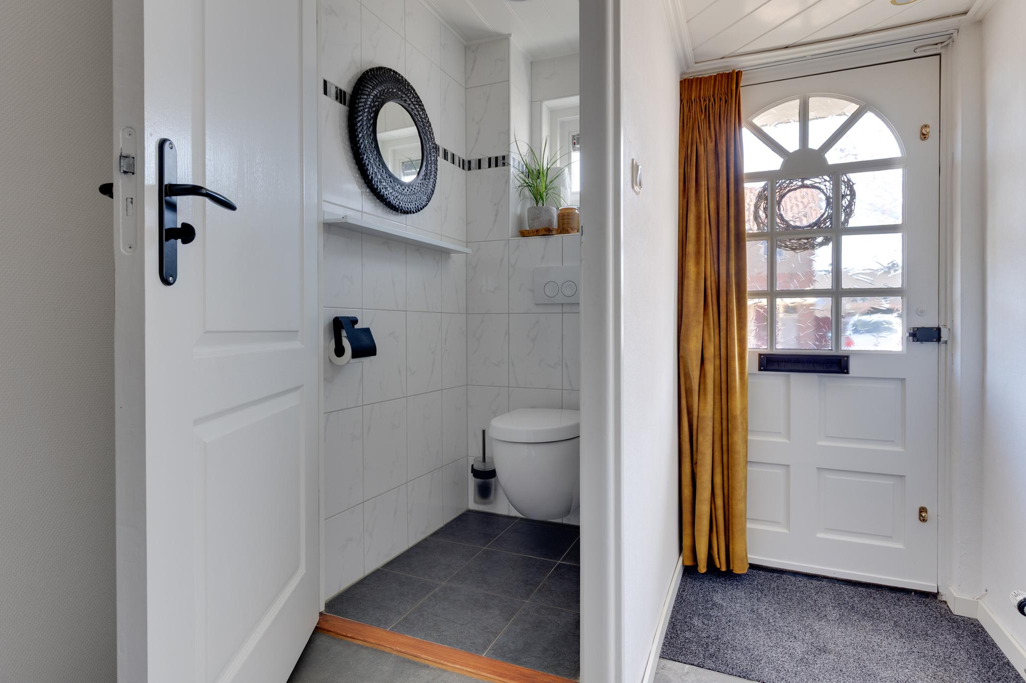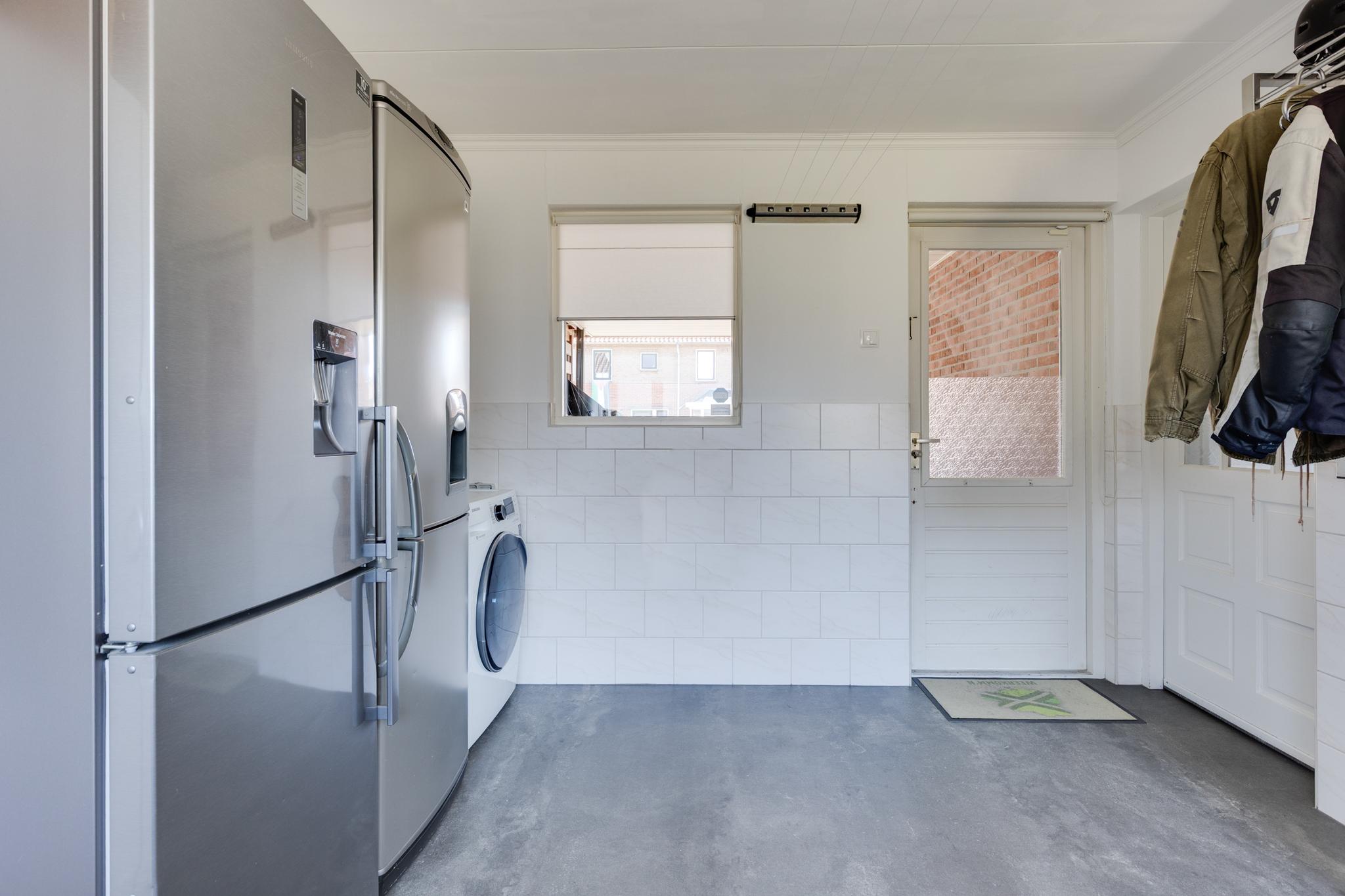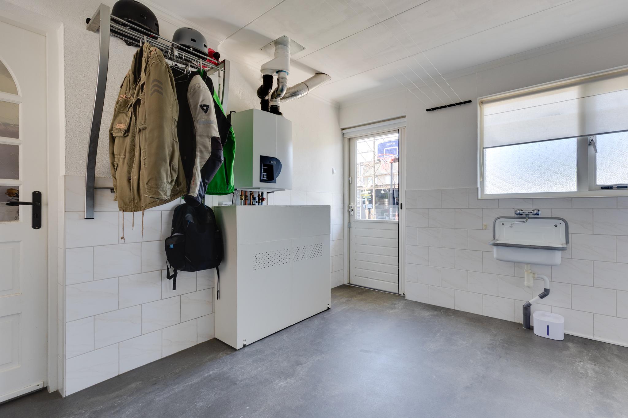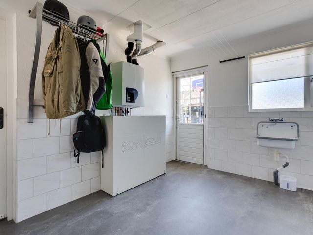 Via de overdekte entree en de voordeur komt u in de hal. De hal biedt toegang tot de toiletruimte met wandcloset, de trapopgang waaronder trapkast, de meterkast en woonkamer. De ruime woonkamer bestaat uit een zit- en eetkamer welke is voorzien van airconditioning. Aan de voorzijde is de woning uitgebouwd met een erker. De eetkamer bevindt zich in de aanbouw, welke is is voorzien van openslaande tuindeuren. Tussen deze beide leefruimtes, eveneens in de aanbouw, is een moderne inbouwkeuken geplaatst. Deze inbouwkeuken staat opgesteld in een L-vorm en is voorzien van diverse apparatuur. De royale bijkeuken/berging is toegankelijk via de keuken en beschikt over aansluitingen voor wasmachine en -droger. De bijkeuken/berging is eveneens bereikbaar via de carport en aan de achterzijde is er een deur naar achtertuin.