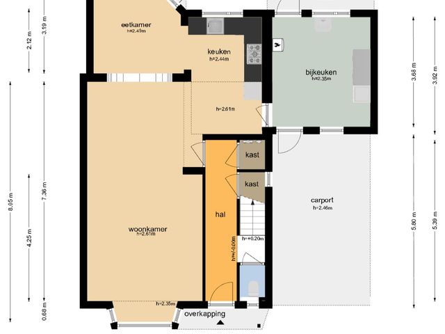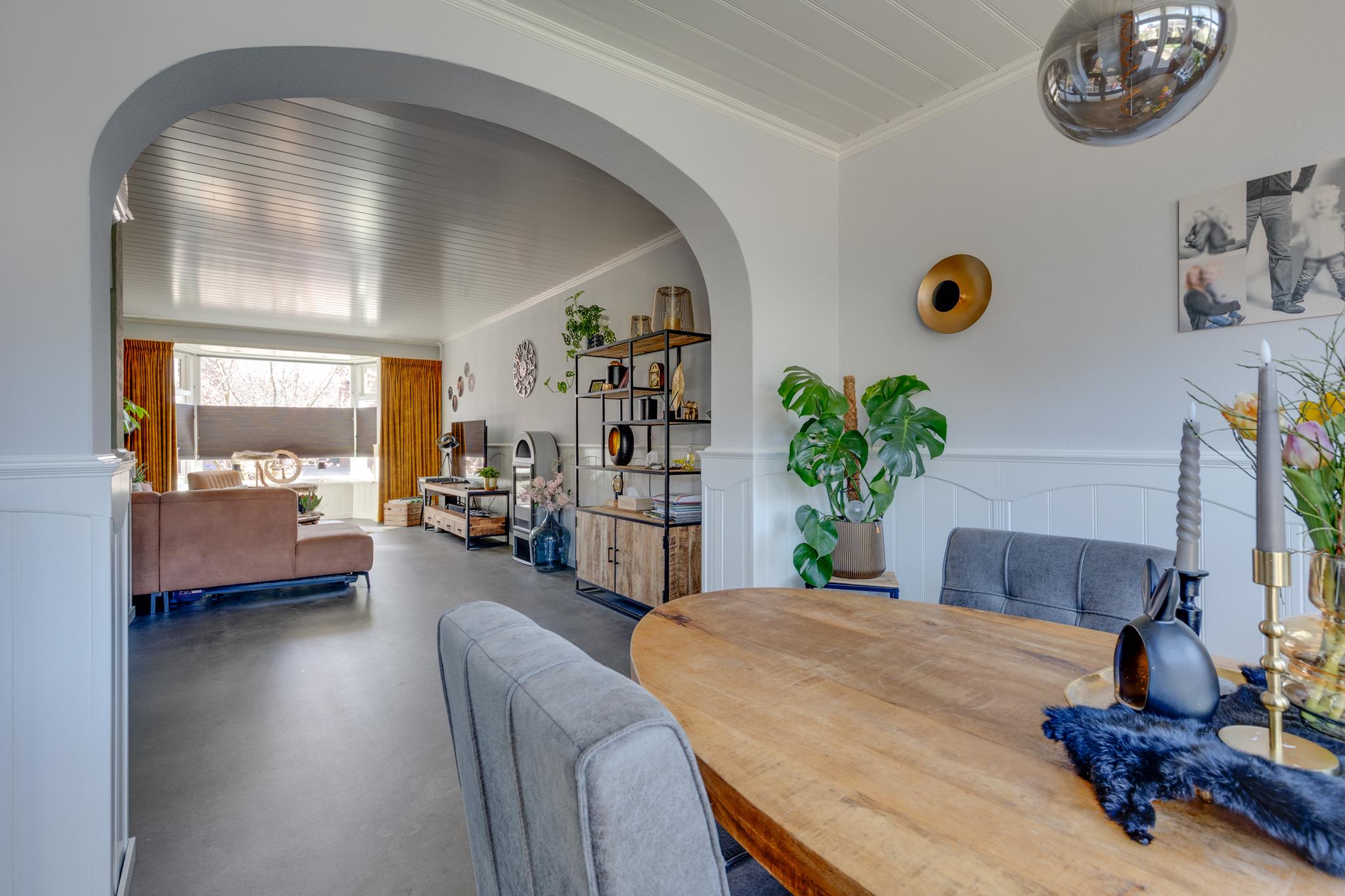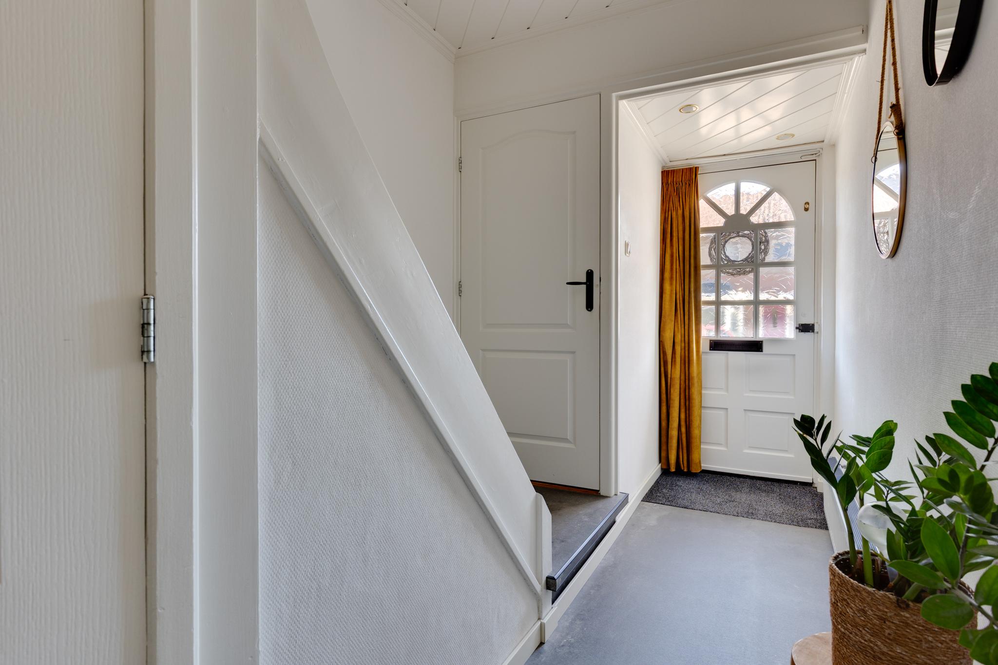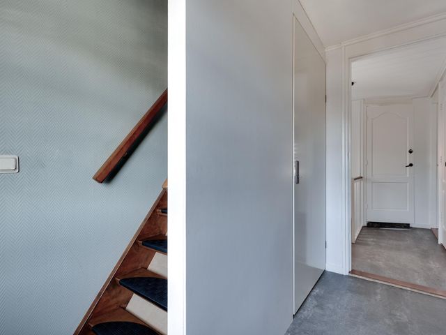 Via de overdekte entree en de voordeur komt u in de hal. De hal biedt toegang tot de toiletruimte met wandcloset, de trapopgang waaronder trapkast, de meterkast en woonkamer. De ruime woonkamer bestaat uit een zit- en eetkamer welke is voorzien van airconditioning. Aan de voorzijde is de woning uitgebouwd met een erker. De eetkamer bevindt zich in de aanbouw, welke is is voorzien van openslaande tuindeuren. Tussen deze beide leefruimtes, eveneens in de aanbouw, is een moderne inbouwkeuken geplaatst. Deze inbouwkeuken staat opgesteld in een L-vorm en is voorzien van diverse apparatuur. De royale bijkeuken/berging is toegankelijk via de keuken en beschikt over aansluitingen voor wasmachine en -droger. De bijkeuken/berging is eveneens bereikbaar via de carport en aan de achterzijde is er een deur naar achtertuin.